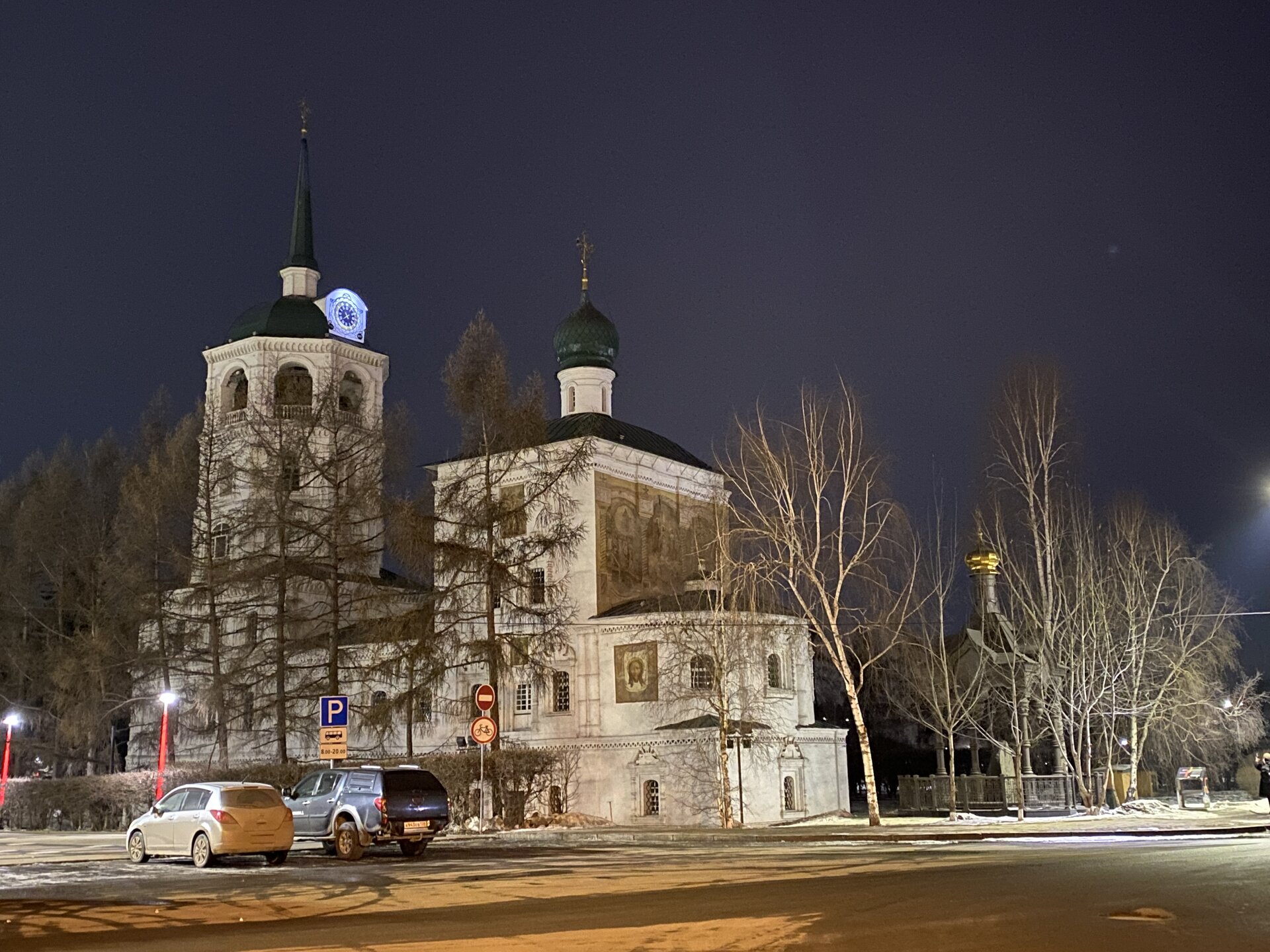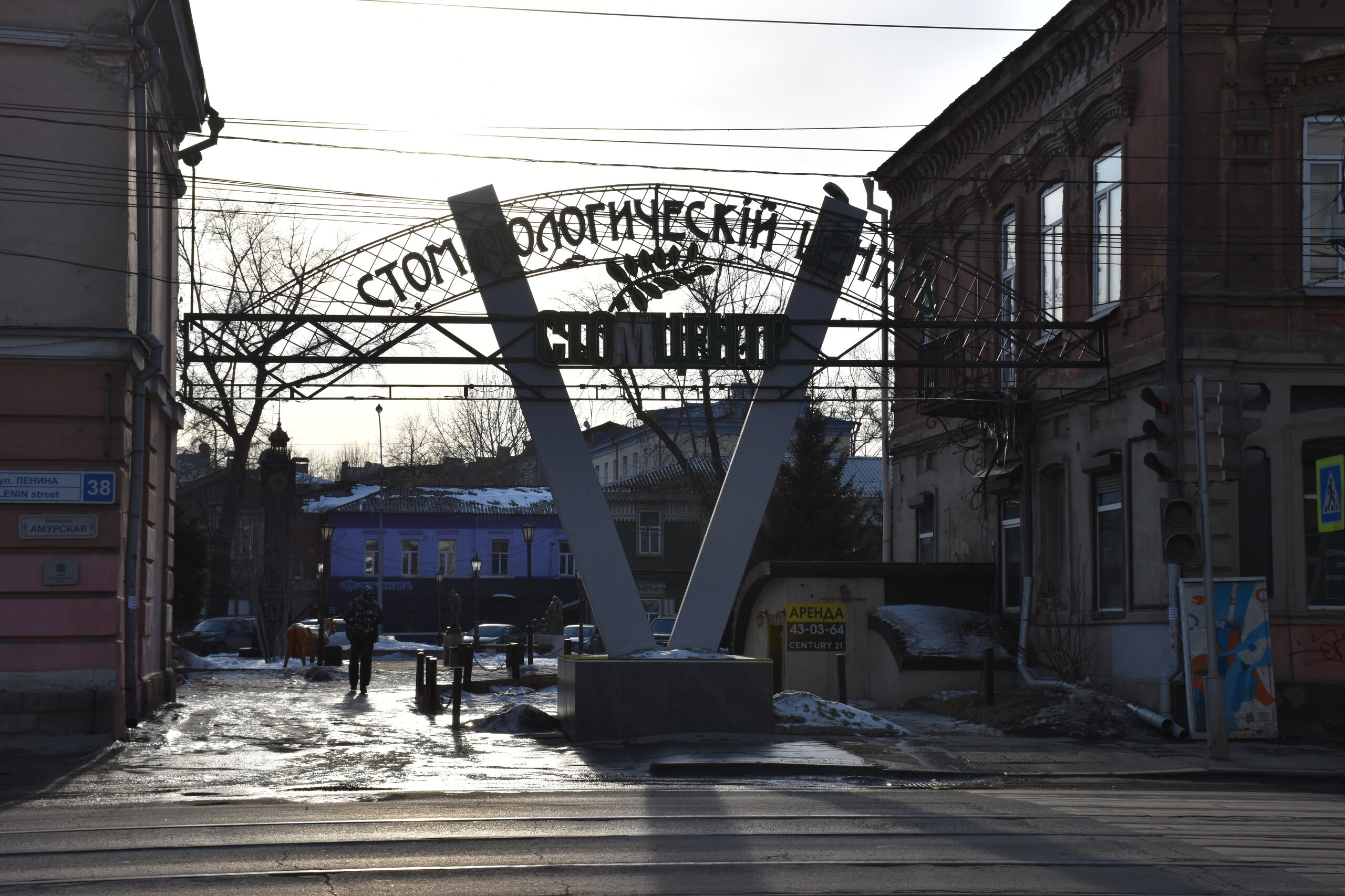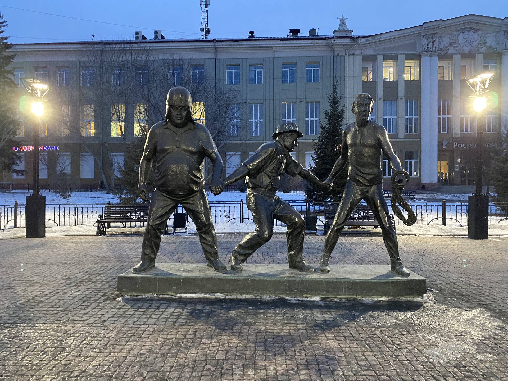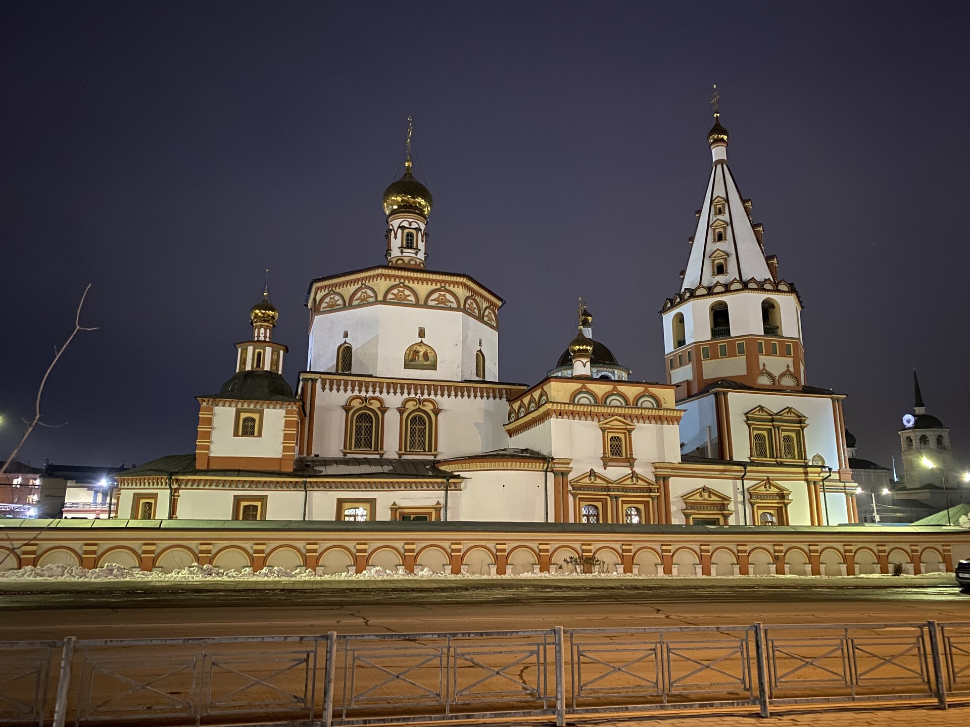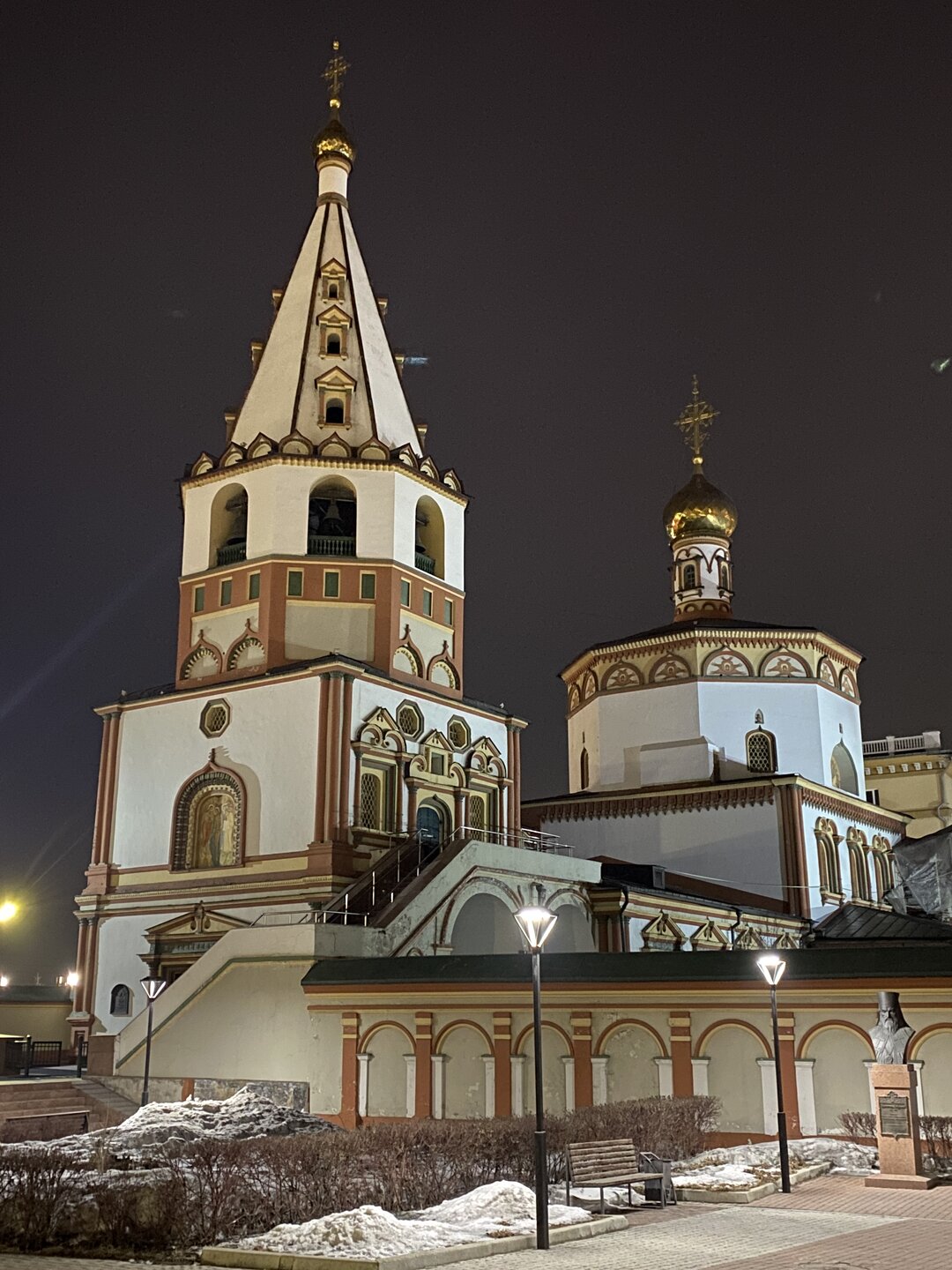 Напротив кафе "Тайга", где я ужинала, красивый собор. Крестовоздвиженский храм является одним из наиболее ярких примеров сибирского зодчества. Его уникальность в том, что он представляет сочетание русских, украинских и даже буддийских мотивов. Начало строительства церкви датируется 1747 годом, а продолжалось оно в течение 13-ти лет. Главной особенностью храма является интересный и сложный орнамент, который украшает стены постройки. Ему характерна нетипичная для православных храмов восточная стилистика, а многие исследователи полагают, что в узоре зашифровано некое послание. Внутреннее убранство церкви очень богато – в ней содержится более 600 икон, большая часть которых уникальна в своем роде и обладает высочайшей художественной ценностью. Примечателен Иконостас церкви – он создан еще в XVIII веке, а его резной орнамент создает необычный эффект «золотой кожи». Некоторые иконы в храме редкие настолько, что их настоящее значение до сих пор остается неизвестным и требует детального изучения. После ужина я отправилась по улице Ленина в сторону делового центра города. Улица Ленина. Старейшая в городе улица Ленина сформировалась в XVIII веке и получила название Морской — через неё шёл путь от Спасской площади к Байкалу. В XIX веке она становится центральной и застраивается административными зданиями, магазинами, учебными заведениями, богатыми особняками. Это была первая городская магистраль, где появились тротуары и масляные фонари. После сильного пожара 1879 года на Амурской (название, которое носила улица с середины XIX века) разрешили строить только каменные дома. На современной улице Ленина сосредоточены архитектурные и культурные достопримечательностей города — площадь Графа Сперанского, Художественный музей им. Сукачёва, Геологический и Художественный музеи, Театр юного зрителя, особняки XIX века. По традиции, на главной улице расположены рестораны, кафе, крупные магазины, сувенирные лавочки. В тёплое время года, благодаря благоустроенным скверам, здесь очень зелено и уютно. С улицы Ленина я свернула в переулок в поисках красивого мурала. Любители уличного искусства оценят мурал на стене Центра гигиены и эпидемиологии (ул. Горького, 24). Немного сбилась со своего маршрута и вышла к улице Карла Маркса. В подсветке эта улица тоже хороша, но в моем плане совсем другой маршрут. Довольно быстро вышла к запланированной площаде Труда. Главное на этой площади — Иркутский государственный цирк. А еще на площади находится популярный у туристов и местных жителей памятник Леониду Гайдаю, установленный в 2012 году. Скульптурная группа изображает момент съемок кинофильма: с одной стороны — известный режиссер, а с другой — известные герои его кинофильмов. Скульпторы: А. Миронов, Л. Сериков. Архитектор: С. Демков.