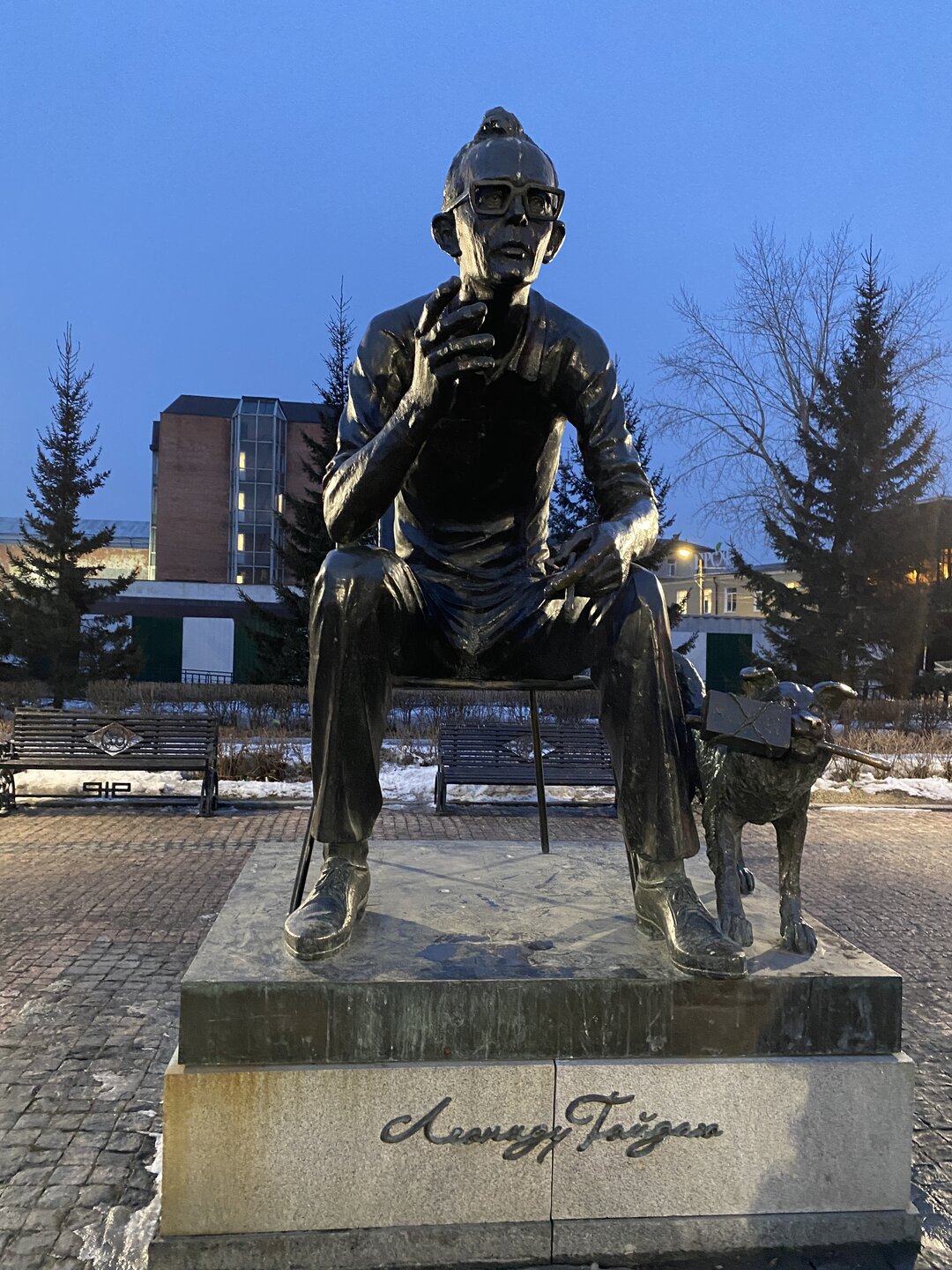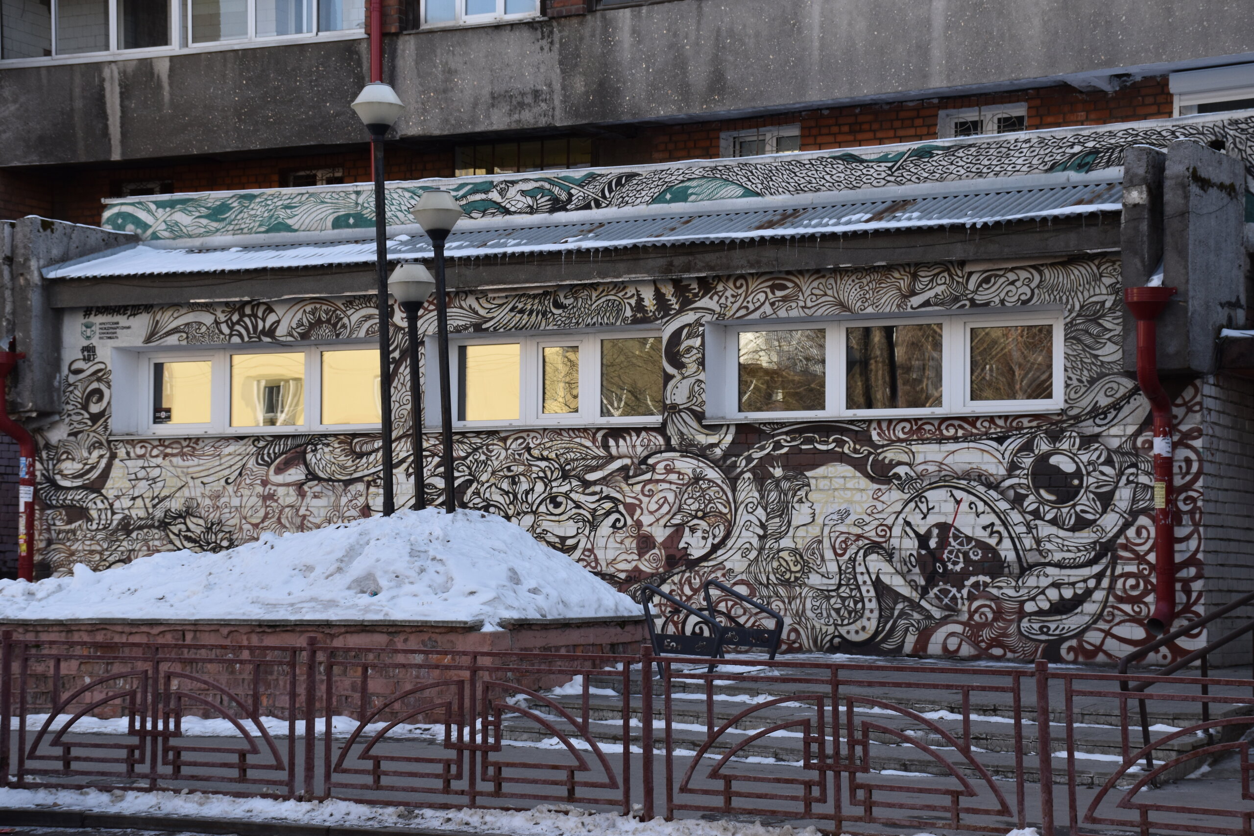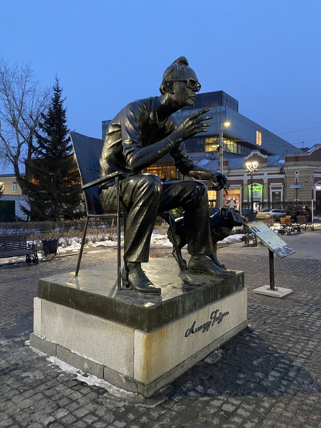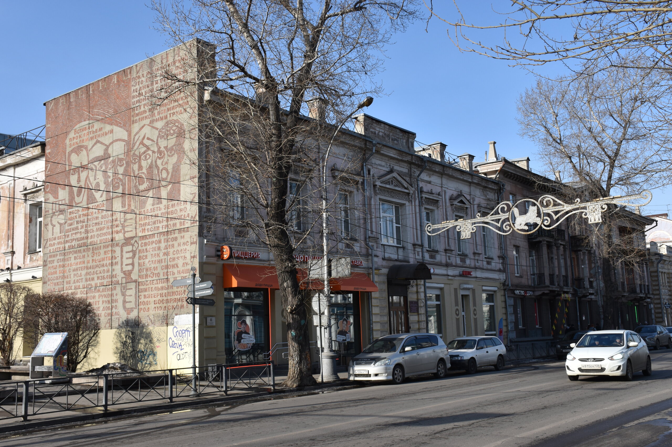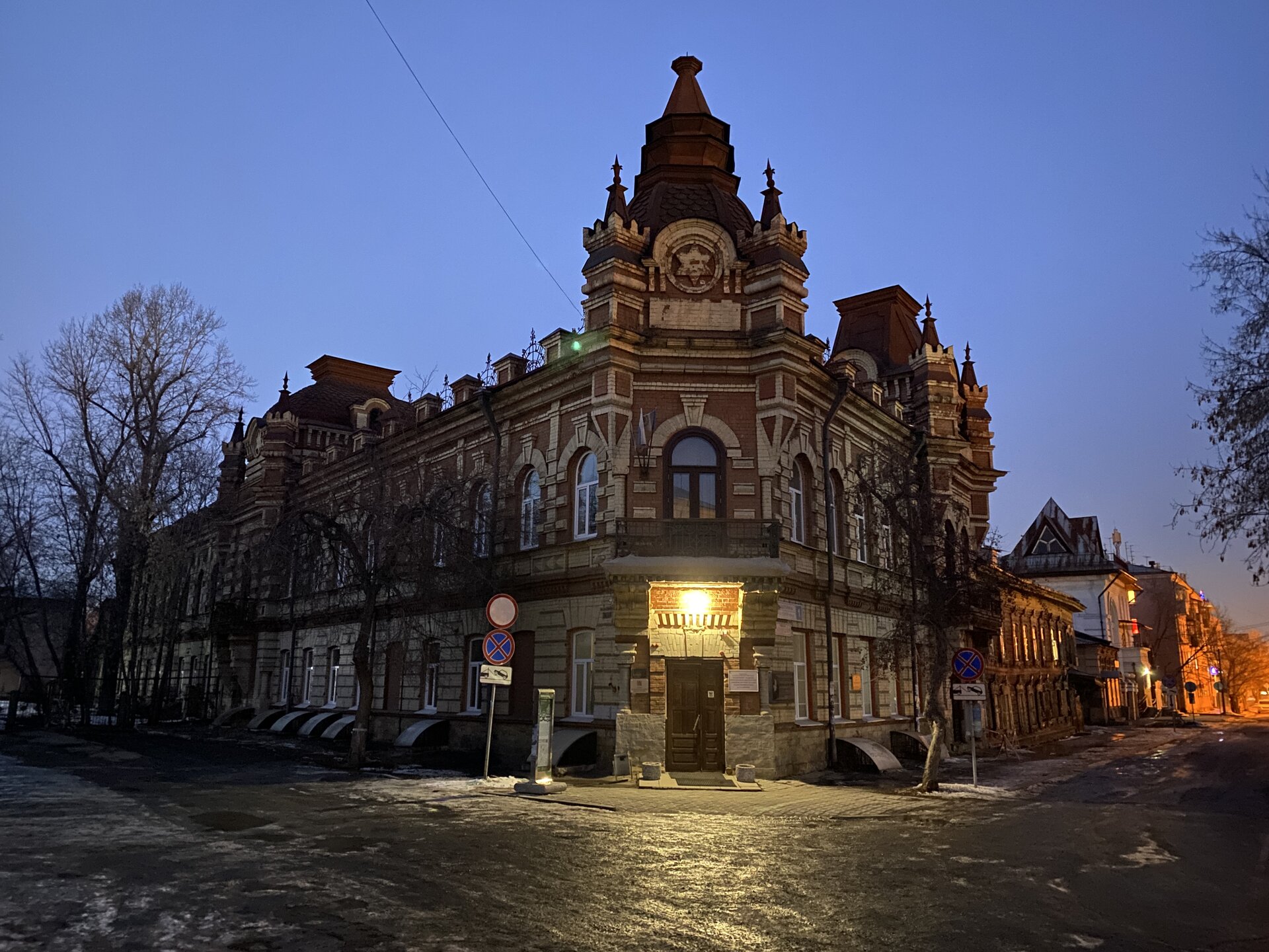 Напротив кафе "Тайга", где я ужинала, красивый собор. Крестовоздвиженский храм является одним из наиболее ярких примеров сибирского зодчества. Его уникальность в том, что он представляет сочетание русских, украинских и даже буддийских мотивов. Начало строительства церкви датируется 1747 годом, а продолжалось оно в течение 13-ти лет. Главной особенностью храма является интересный и сложный орнамент, который украшает стены постройки. Ему характерна нетипичная для православных храмов восточная стилистика, а многие исследователи полагают, что в узоре зашифровано некое послание. Внутреннее убранство церкви очень богато – в ней содержится более 600 икон, большая часть которых уникальна в своем роде и обладает высочайшей художественной ценностью. Примечателен Иконостас церкви – он создан еще в XVIII веке, а его резной орнамент создает необычный эффект «золотой кожи». Некоторые иконы в храме редкие настолько, что их настоящее значение до сих пор остается неизвестным и требует детального изучения. После ужина я отправилась по улице Ленина в сторону делового центра города. Улица Ленина. Старейшая в городе улица Ленина сформировалась в XVIII веке и получила название Морской — через неё шёл путь от Спасской площади к Байкалу. В XIX веке она становится центральной и застраивается административными зданиями, магазинами, учебными заведениями, богатыми особняками. Это была первая городская магистраль, где появились тротуары и масляные фонари. После сильного пожара 1879 года на Амурской (название, которое носила улица с середины XIX века) разрешили строить только каменные дома. На современной улице Ленина сосредоточены архитектурные и культурные достопримечательностей города — площадь Графа Сперанского, Художественный музей им. Сукачёва, Геологический и Художественный музеи, Театр юного зрителя, особняки XIX века. По традиции, на главной улице расположены рестораны, кафе, крупные магазины, сувенирные лавочки. В тёплое время года, благодаря благоустроенным скверам, здесь очень зелено и уютно. С улицы Ленина я свернула в переулок в поисках красивого мурала. Любители уличного искусства оценят мурал на стене Центра гигиены и эпидемиологии (ул. Горького, 24). Немного сбилась со своего маршрута и вышла к улице Карла Маркса. В подсветке эта улица тоже хороша, но в моем плане совсем другой маршрут. Довольно быстро вышла к запланированной площаде Труда. Главное на этой площади — Иркутский государственный цирк. А еще на площади находится популярный у туристов и местных жителей памятник Леониду Гайдаю, установленный в 2012 году. Скульптурная группа изображает момент съемок кинофильма: с одной стороны — известный режиссер, а с другой — известные герои его кинофильмов. Скульпторы: А. Миронов, Л. Сериков. Архитектор: С. Демков.