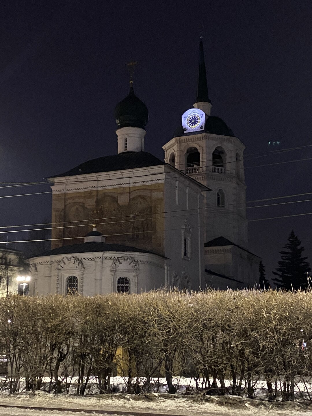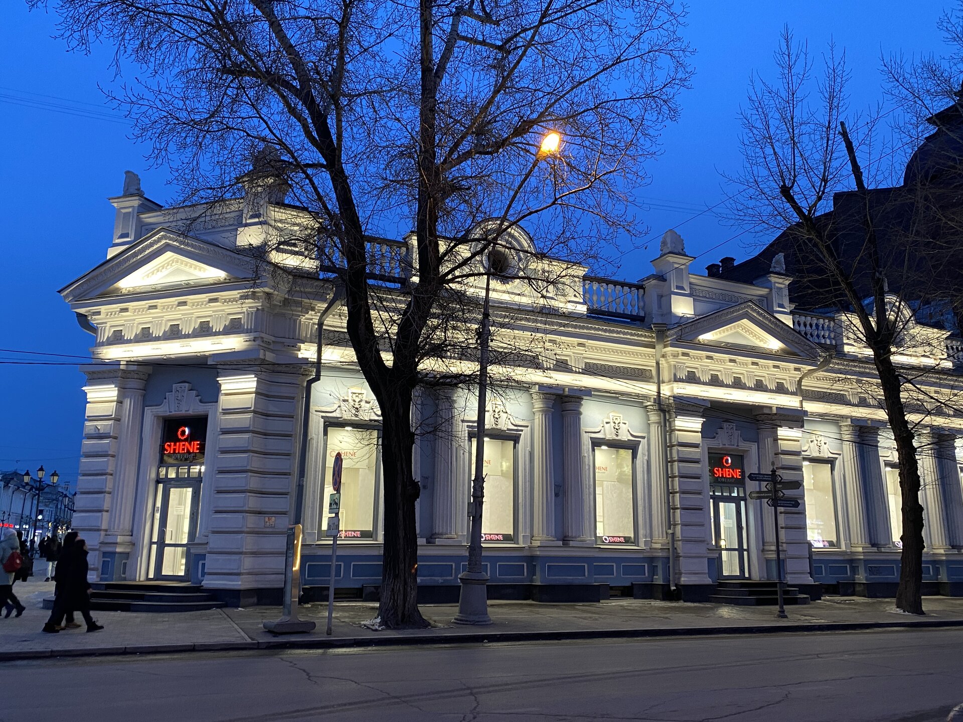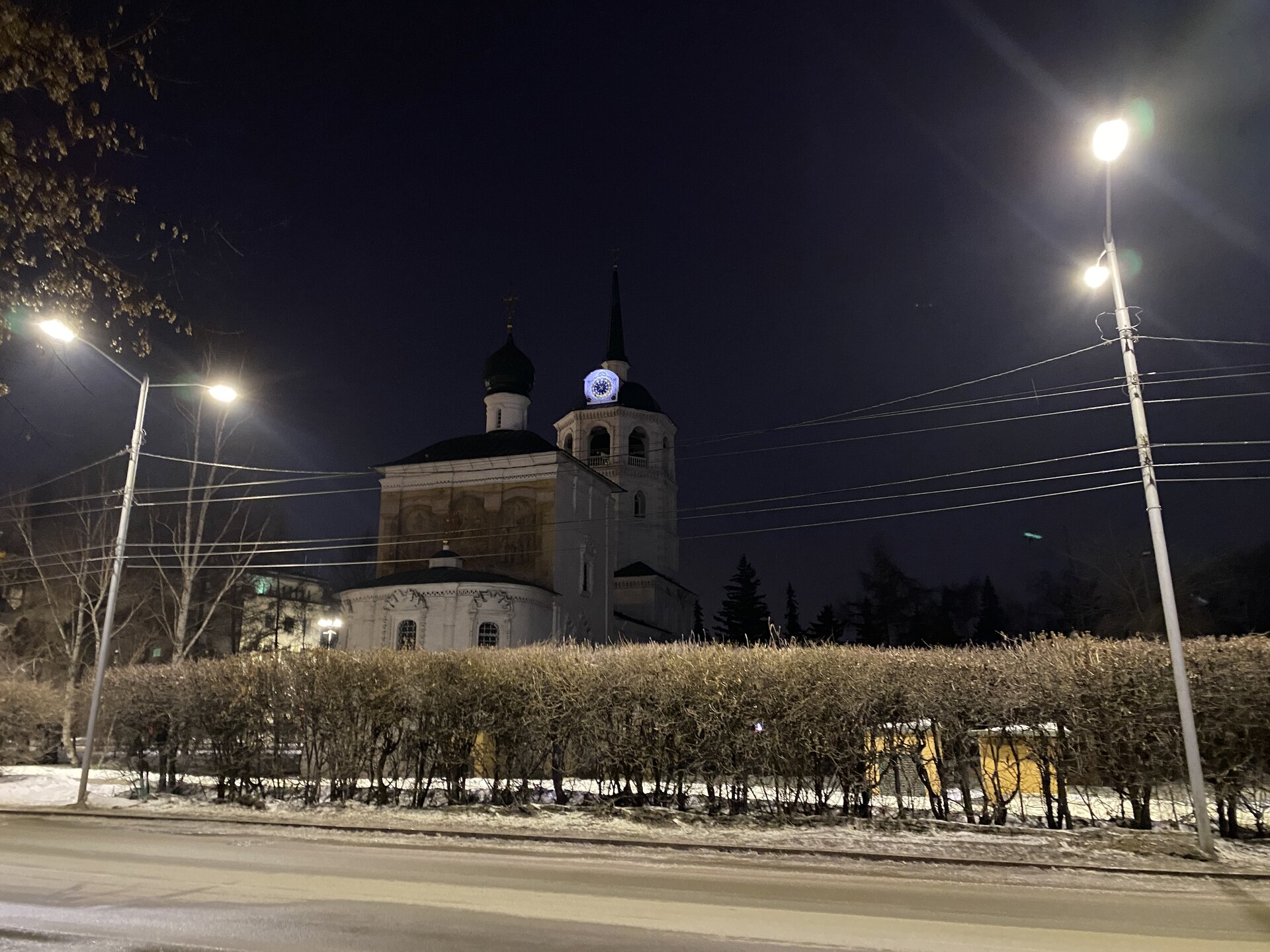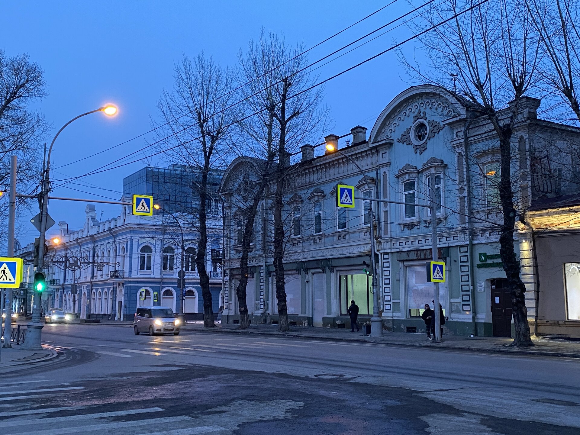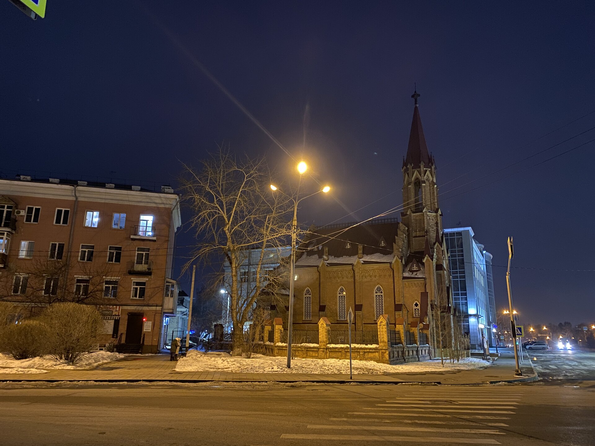Напротив кафе "Тайга", где я ужинала, красивый собор. Крестовоздвиженский храм является одним из наиболее ярких примеров сибирского зодчества. Его уникальность в том, что он представляет сочетание русских, украинских и даже буддийских мотивов. Начало строительства церкви датируется 1747 годом, а продолжалось оно в течение 13-ти лет. Главной особенностью храма является интересный и сложный орнамент, который украшает стены постройки. Ему характерна нетипичная для православных храмов восточная стилистика, а многие исследователи полагают, что в узоре зашифровано некое послание. Внутреннее убранство церкви очень богато – в ней содержится более 600 икон, большая часть которых уникальна в своем роде и обладает высочайшей художественной ценностью. Примечателен Иконостас церкви – он создан еще в XVIII веке, а его резной орнамент создает необычный эффект «золотой кожи». Некоторые иконы в храме редкие настолько, что их настоящее значение до сих пор остается неизвестным и требует детального изучения. После ужина я отправилась по улице Ленина в сторону делового центра города. Улица Ленина. Старейшая в городе улица Ленина сформировалась в XVIII веке и получила название Морской — через неё шёл путь от Спасской площади к Байкалу. В XIX веке она становится центральной и застраивается административными зданиями, магазинами, учебными заведениями, богатыми особняками. Это была первая городская магистраль, где появились тротуары и масляные фонари. После сильного пожара 1879 года на Амурской (название, которое носила улица с середины XIX века) разрешили строить только каменные дома. На современной улице Ленина сосредоточены архитектурные и культурные достопримечательностей города — площадь Графа Сперанского, Художественный музей им. Сукачёва, Геологический и Художественный музеи, Театр юного зрителя, особняки XIX века. По традиции, на главной улице расположены рестораны, кафе, крупные магазины, сувенирные лавочки. В тёплое время года, благодаря благоустроенным скверам, здесь очень зелено и уютно. С улицы Ленина я свернула в переулок в поисках красивого мурала. Любители уличного искусства оценят мурал на стене Центра гигиены и эпидемиологии (ул. Горького, 24). Немного сбилась со своего маршрута и вышла к улице Карла Маркса. В подсветке эта улица тоже хороша, но в моем плане совсем другой маршрут. Довольно быстро вышла к запланированной площаде Труда. Главное на этой площади — Иркутский государственный цирк. А еще на площади находится популярный у туристов и местных жителей памятник Леониду Гайдаю, установленный в 2012 году. Скульптурная группа изображает момент съемок кинофильма: с одной стороны — известный режиссер, а с другой — известные герои его кинофильмов. Скульпторы: А. Миронов, Л. Сериков. Архитектор: С. Демков.
