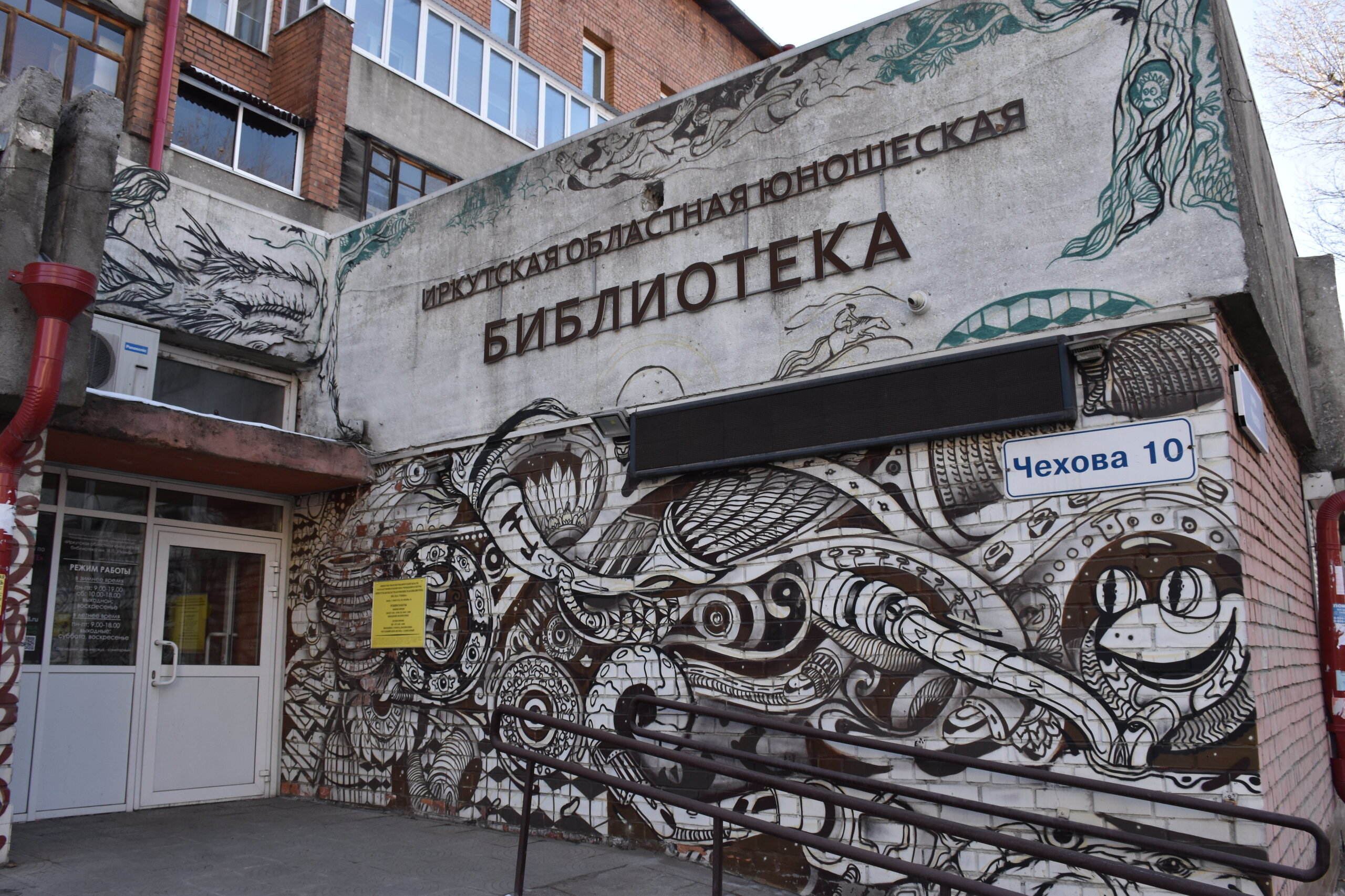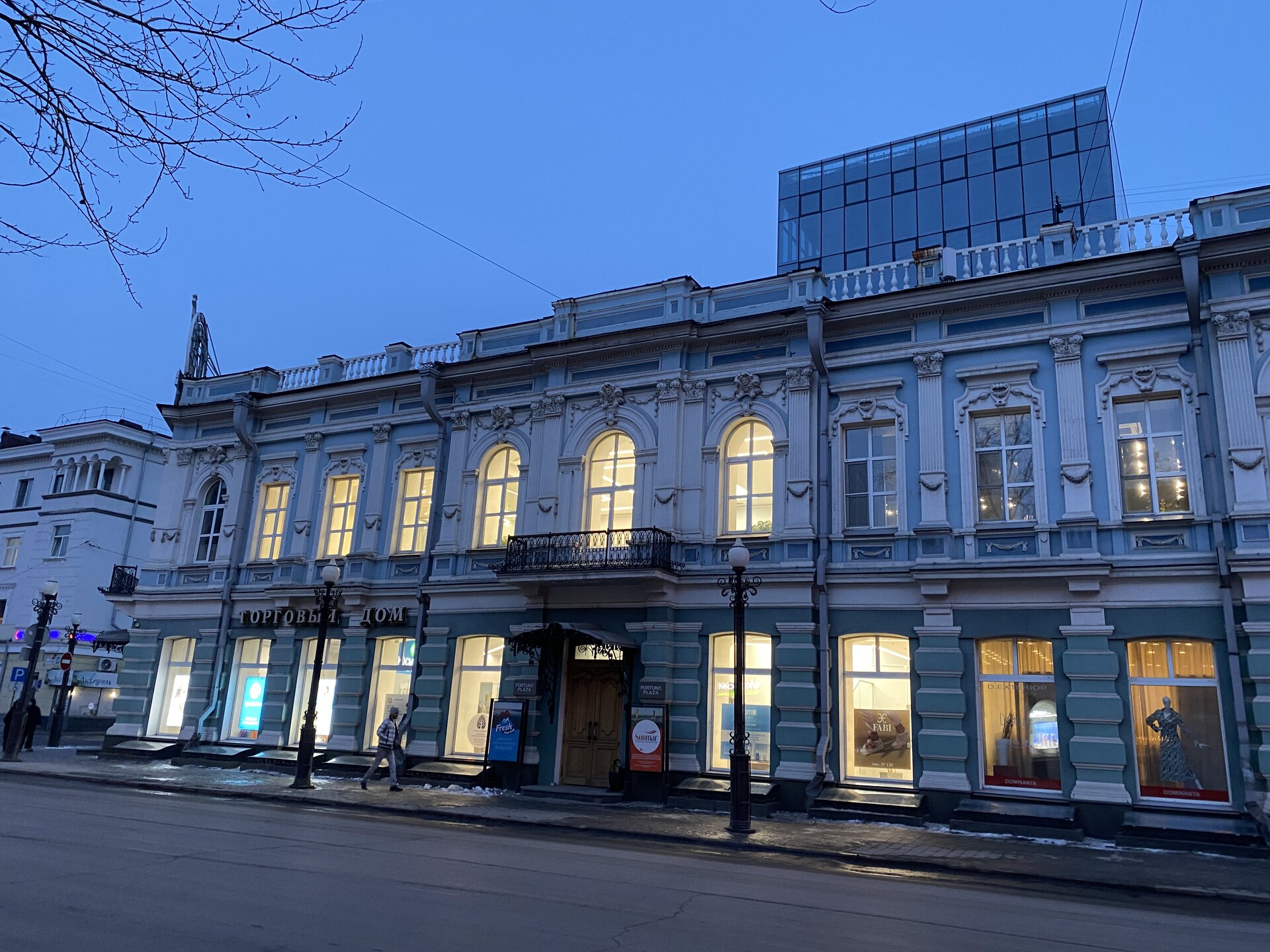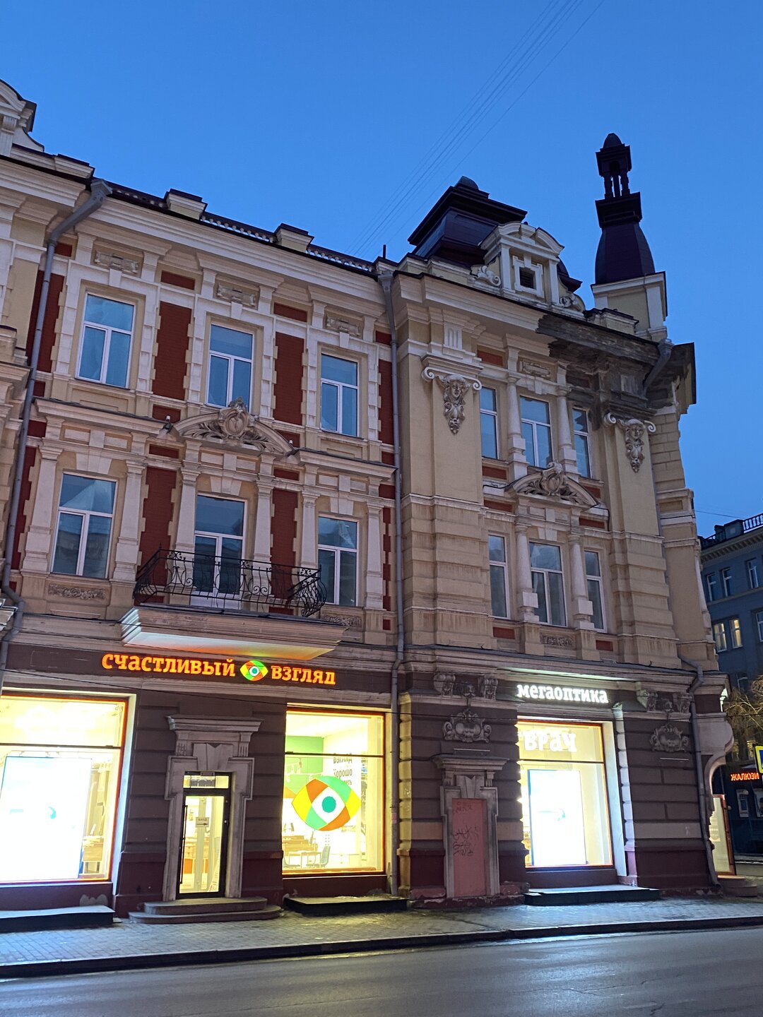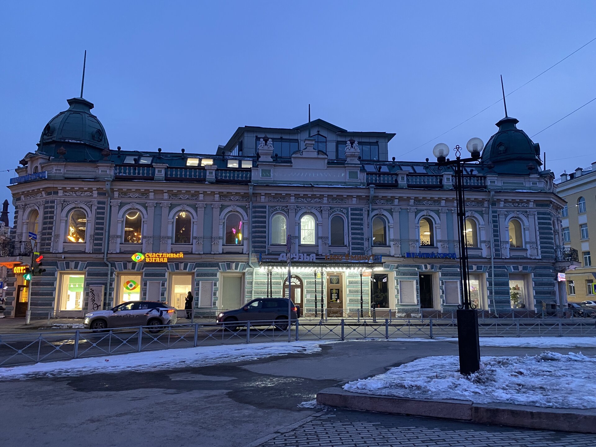 Напротив кафе "Тайга", где я ужинала, красивый собор. Крестовоздвиженский храм является одним из наиболее ярких примеров сибирского зодчества. Его уникальность в том, что он представляет сочетание русских, украинских и даже буддийских мотивов. Начало строительства церкви датируется 1747 годом, а продолжалось оно в течение 13-ти лет. Главной особенностью храма является интересный и сложный орнамент, который украшает стены постройки. Ему характерна нетипичная для православных храмов восточная стилистика, а многие исследователи полагают, что в узоре зашифровано некое послание. Внутреннее убранство церкви очень богато – в ней содержится более 600 икон, большая часть которых уникальна в своем роде и обладает высочайшей художественной ценностью. Примечателен Иконостас церкви – он создан еще в XVIII веке, а его резной орнамент создает необычный эффект «золотой кожи». Некоторые иконы в храме редкие настолько, что их настоящее значение до сих пор остается неизвестным и требует детального изучения. После ужина я отправилась по улице Ленина в сторону делового центра города. Улица Ленина. Старейшая в городе улица Ленина сформировалась в XVIII веке и получила название Морской — через неё шёл путь от Спасской площади к Байкалу. В XIX веке она становится центральной и застраивается административными зданиями, магазинами, учебными заведениями, богатыми особняками. Это была первая городская магистраль, где появились тротуары и масляные фонари. После сильного пожара 1879 года на Амурской (название, которое носила улица с середины XIX века) разрешили строить только каменные дома. На современной улице Ленина сосредоточены архитектурные и культурные достопримечательностей города — площадь Графа Сперанского, Художественный музей им. Сукачёва, Геологический и Художественный музеи, Театр юного зрителя, особняки XIX века. По традиции, на главной улице расположены рестораны, кафе, крупные магазины, сувенирные лавочки. В тёплое время года, благодаря благоустроенным скверам, здесь очень зелено и уютно. С улицы Ленина я свернула в переулок в поисках красивого мурала. Любители уличного искусства оценят мурал на стене Центра гигиены и эпидемиологии (ул. Горького, 24). Немного сбилась со своего маршрута и вышла к улице Карла Маркса. В подсветке эта улица тоже хороша, но в моем плане совсем другой маршрут. Довольно быстро вышла к запланированной площаде Труда. Главное на этой площади — Иркутский государственный цирк. А еще на площади находится популярный у туристов и местных жителей памятник Леониду Гайдаю, установленный в 2012 году. Скульптурная группа изображает момент съемок кинофильма: с одной стороны — известный режиссер, а с другой — известные герои его кинофильмов. Скульпторы: А. Миронов, Л. Сериков. Архитектор: С. Демков.