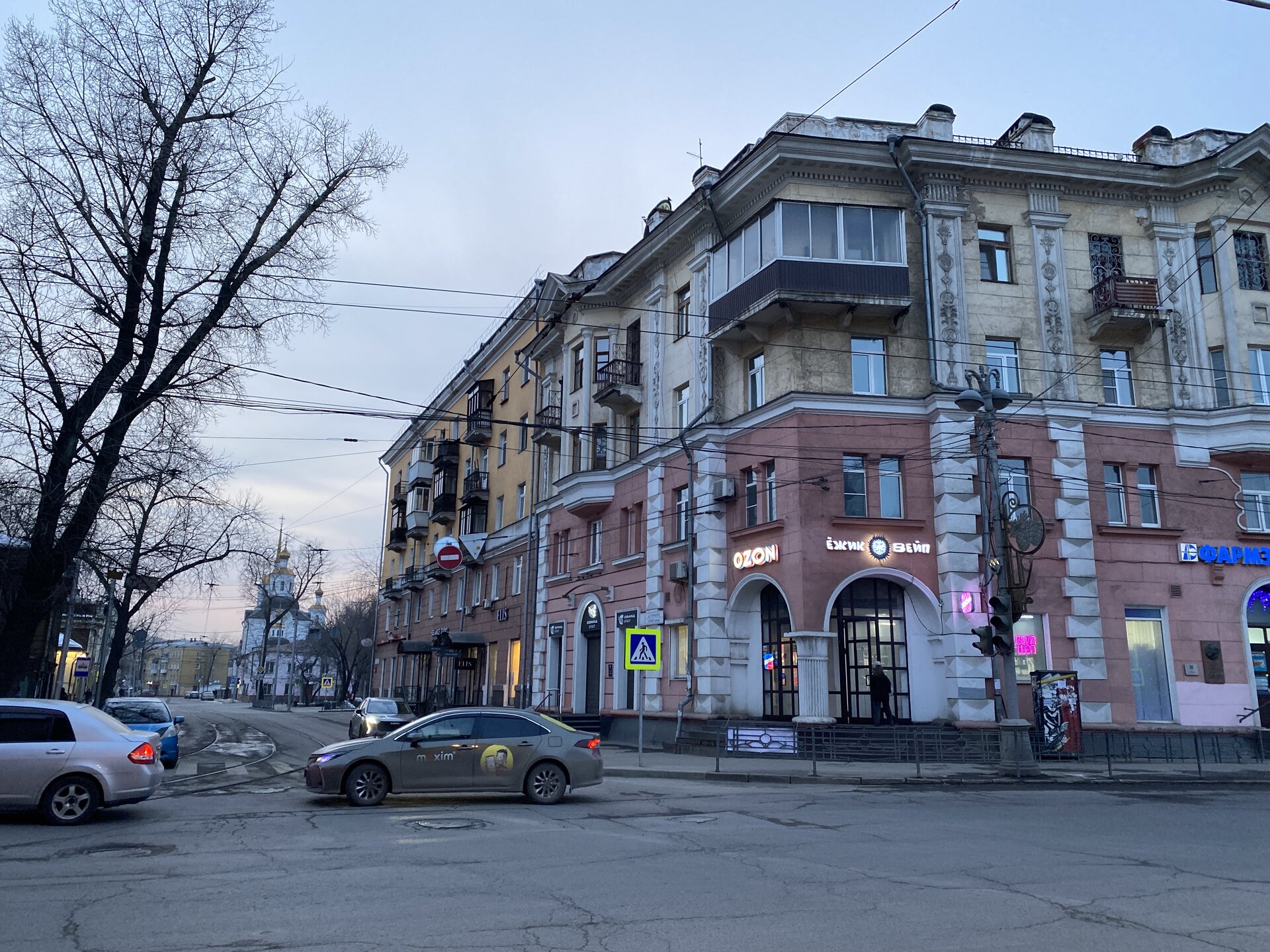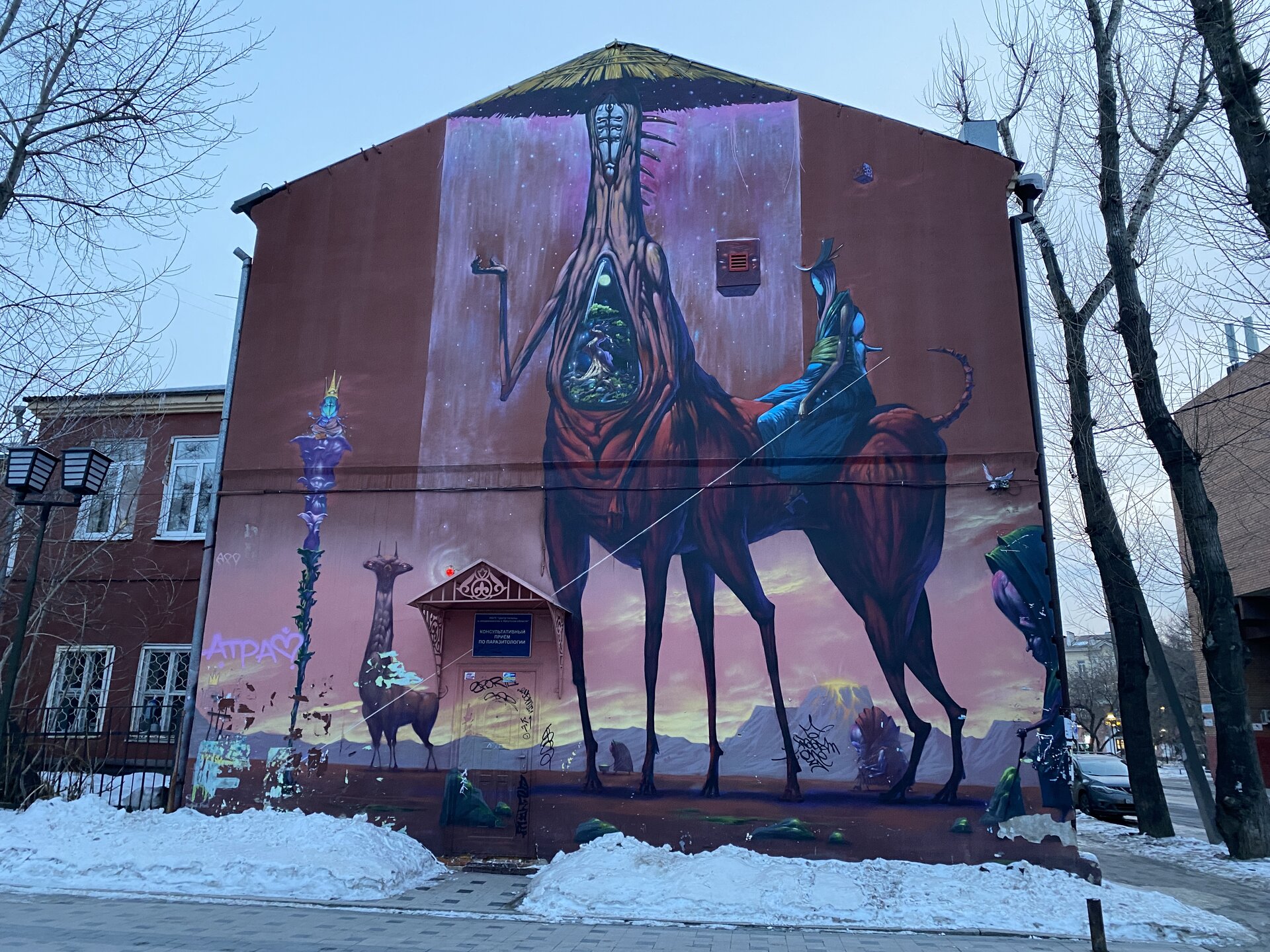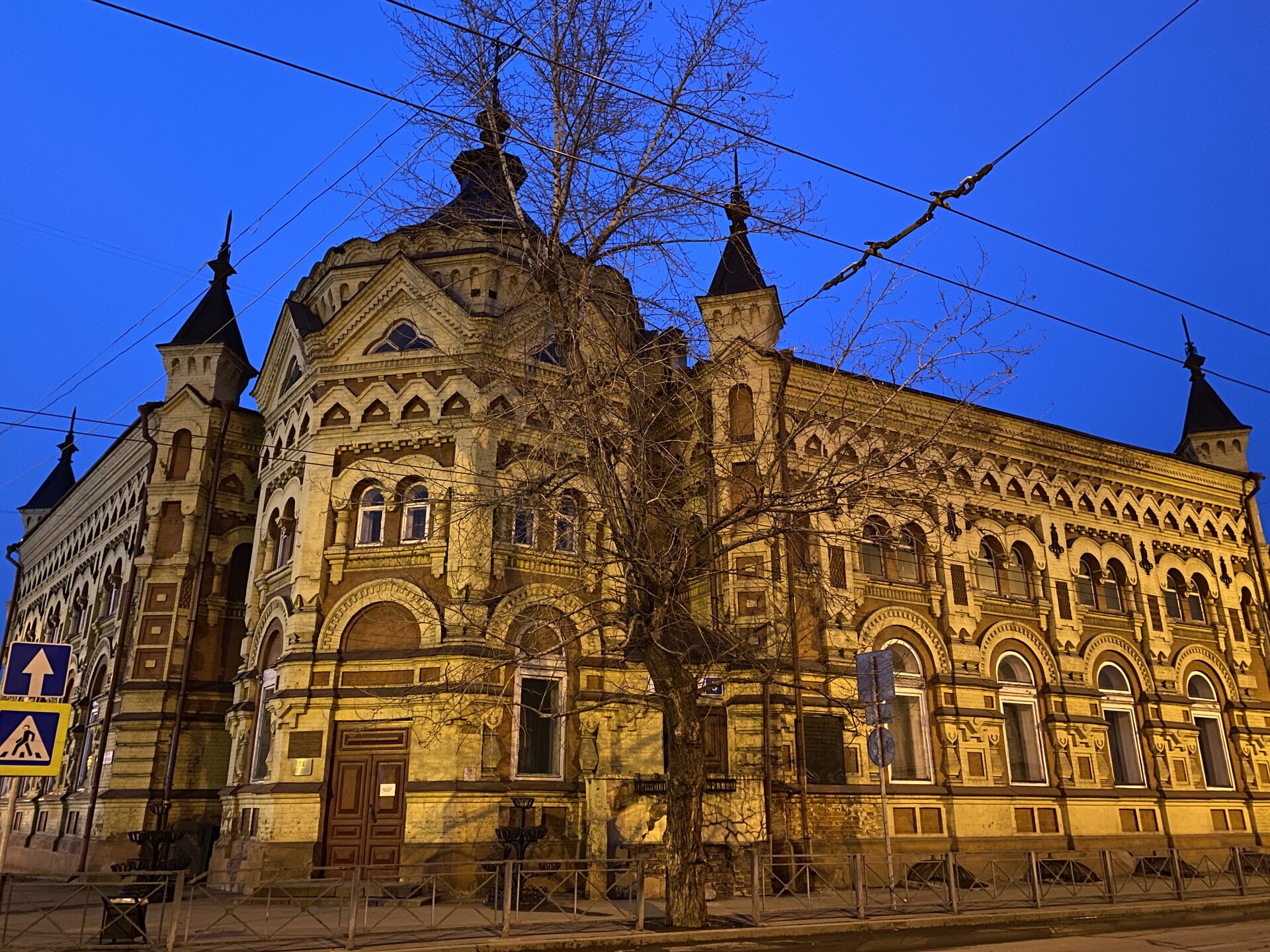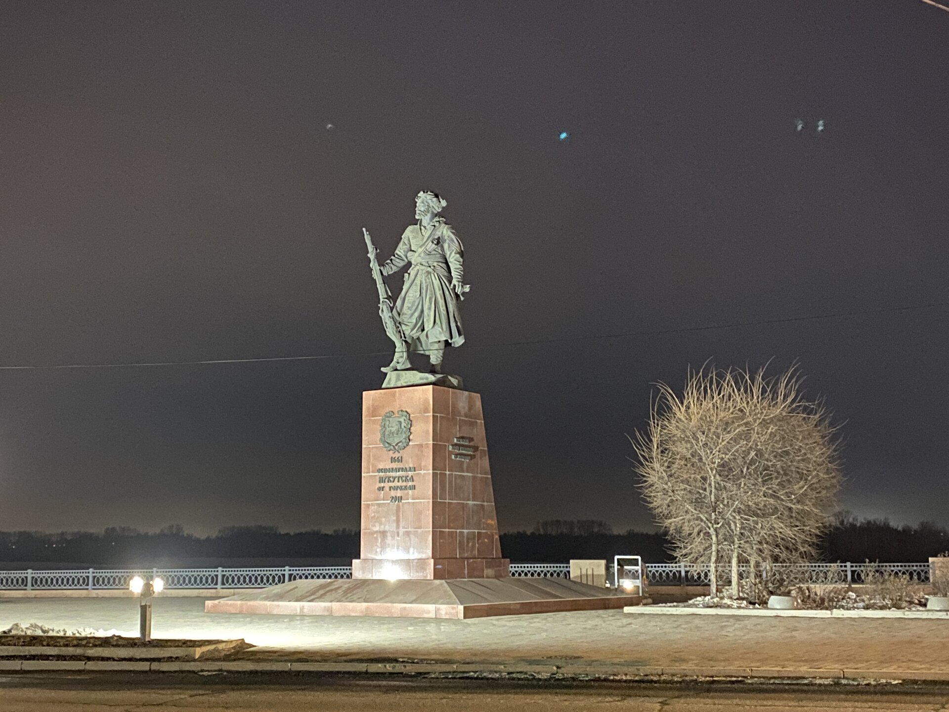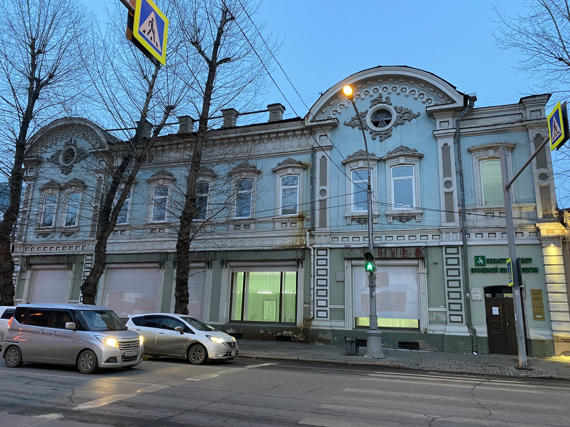 Напротив кафе "Тайга", где я ужинала, красивый собор. Крестовоздвиженский храм является одним из наиболее ярких примеров сибирского зодчества. Его уникальность в том, что он представляет сочетание русских, украинских и даже буддийских мотивов. Начало строительства церкви датируется 1747 годом, а продолжалось оно в течение 13-ти лет. Главной особенностью храма является интересный и сложный орнамент, который украшает стены постройки. Ему характерна нетипичная для православных храмов восточная стилистика, а многие исследователи полагают, что в узоре зашифровано некое послание. Внутреннее убранство церкви очень богато – в ней содержится более 600 икон, большая часть которых уникальна в своем роде и обладает высочайшей художественной ценностью. Примечателен Иконостас церкви – он создан еще в XVIII веке, а его резной орнамент создает необычный эффект «золотой кожи». Некоторые иконы в храме редкие настолько, что их настоящее значение до сих пор остается неизвестным и требует детального изучения. После ужина я отправилась по улице Ленина в сторону делового центра города. Улица Ленина. Старейшая в городе улица Ленина сформировалась в XVIII веке и получила название Морской — через неё шёл путь от Спасской площади к Байкалу. В XIX веке она становится центральной и застраивается административными зданиями, магазинами, учебными заведениями, богатыми особняками. Это была первая городская магистраль, где появились тротуары и масляные фонари. После сильного пожара 1879 года на Амурской (название, которое носила улица с середины XIX века) разрешили строить только каменные дома. На современной улице Ленина сосредоточены архитектурные и культурные достопримечательностей города — площадь Графа Сперанского, Художественный музей им. Сукачёва, Геологический и Художественный музеи, Театр юного зрителя, особняки XIX века. По традиции, на главной улице расположены рестораны, кафе, крупные магазины, сувенирные лавочки. В тёплое время года, благодаря благоустроенным скверам, здесь очень зелено и уютно. С улицы Ленина я свернула в переулок в поисках красивого мурала. Любители уличного искусства оценят мурал на стене Центра гигиены и эпидемиологии (ул. Горького, 24). Немного сбилась со своего маршрута и вышла к улице Карла Маркса. В подсветке эта улица тоже хороша, но в моем плане совсем другой маршрут. Довольно быстро вышла к запланированной площаде Труда. Главное на этой площади — Иркутский государственный цирк. А еще на площади находится популярный у туристов и местных жителей памятник Леониду Гайдаю, установленный в 2012 году. Скульптурная группа изображает момент съемок кинофильма: с одной стороны — известный режиссер, а с другой — известные герои его кинофильмов. Скульпторы: А. Миронов, Л. Сериков. Архитектор: С. Демков.
