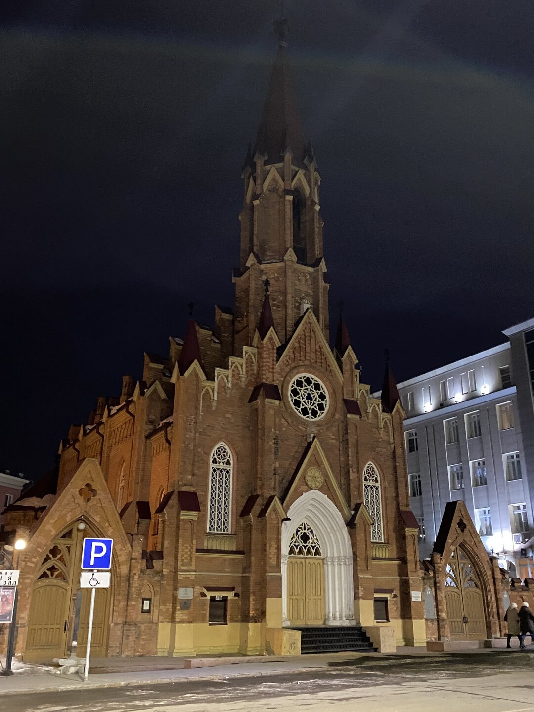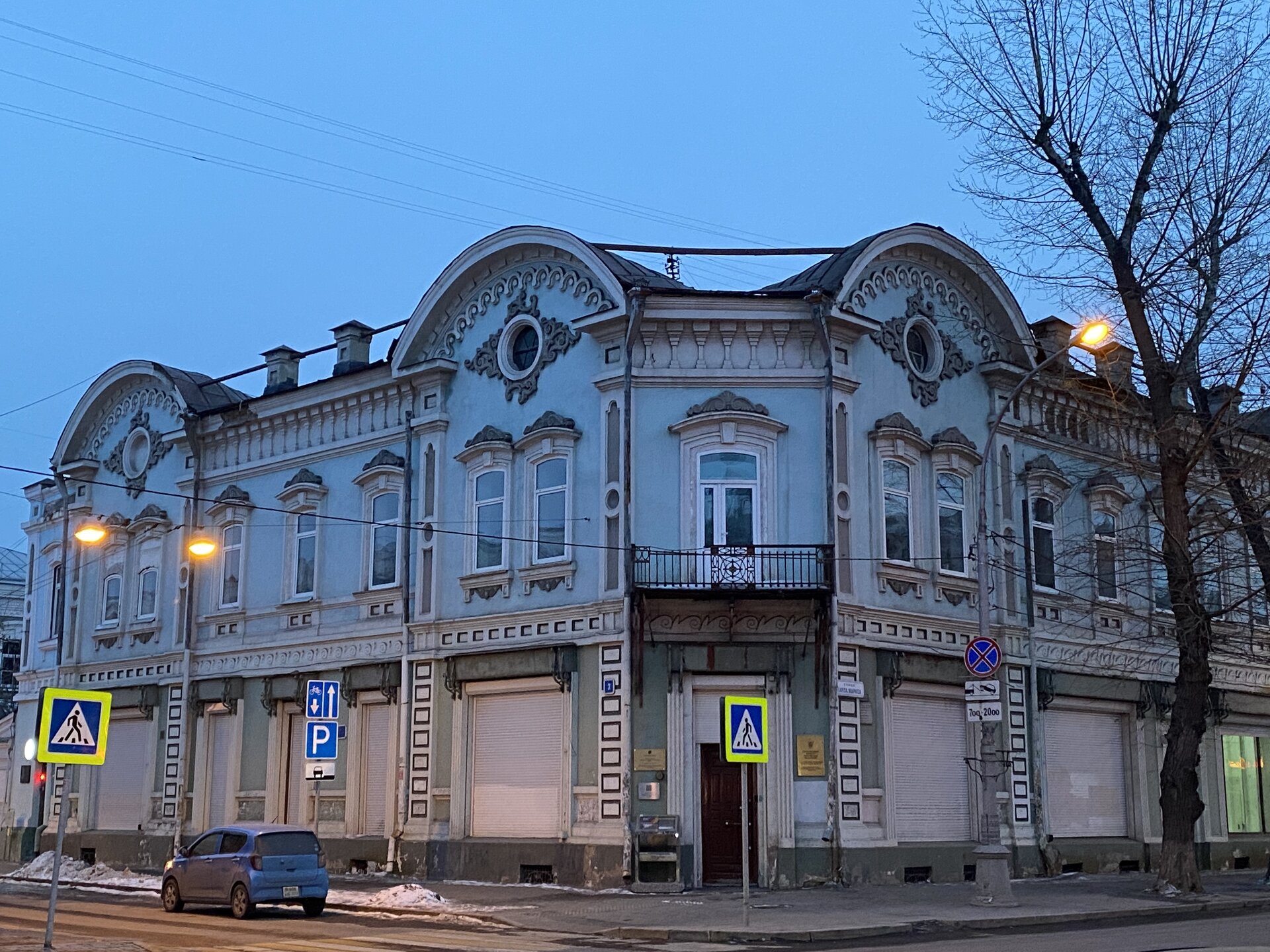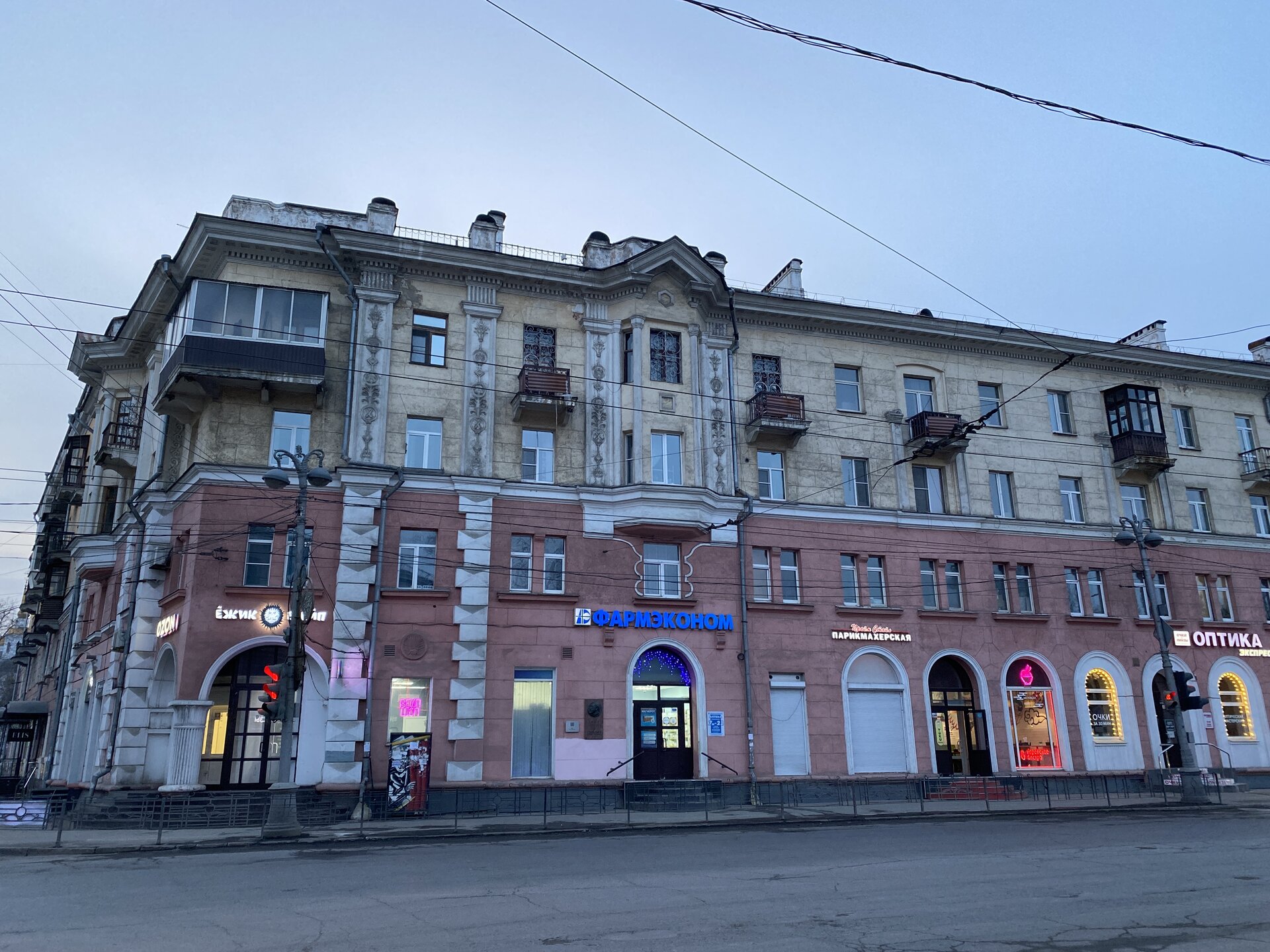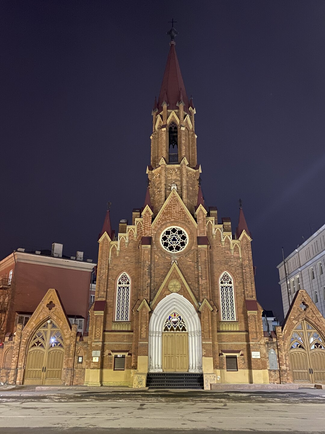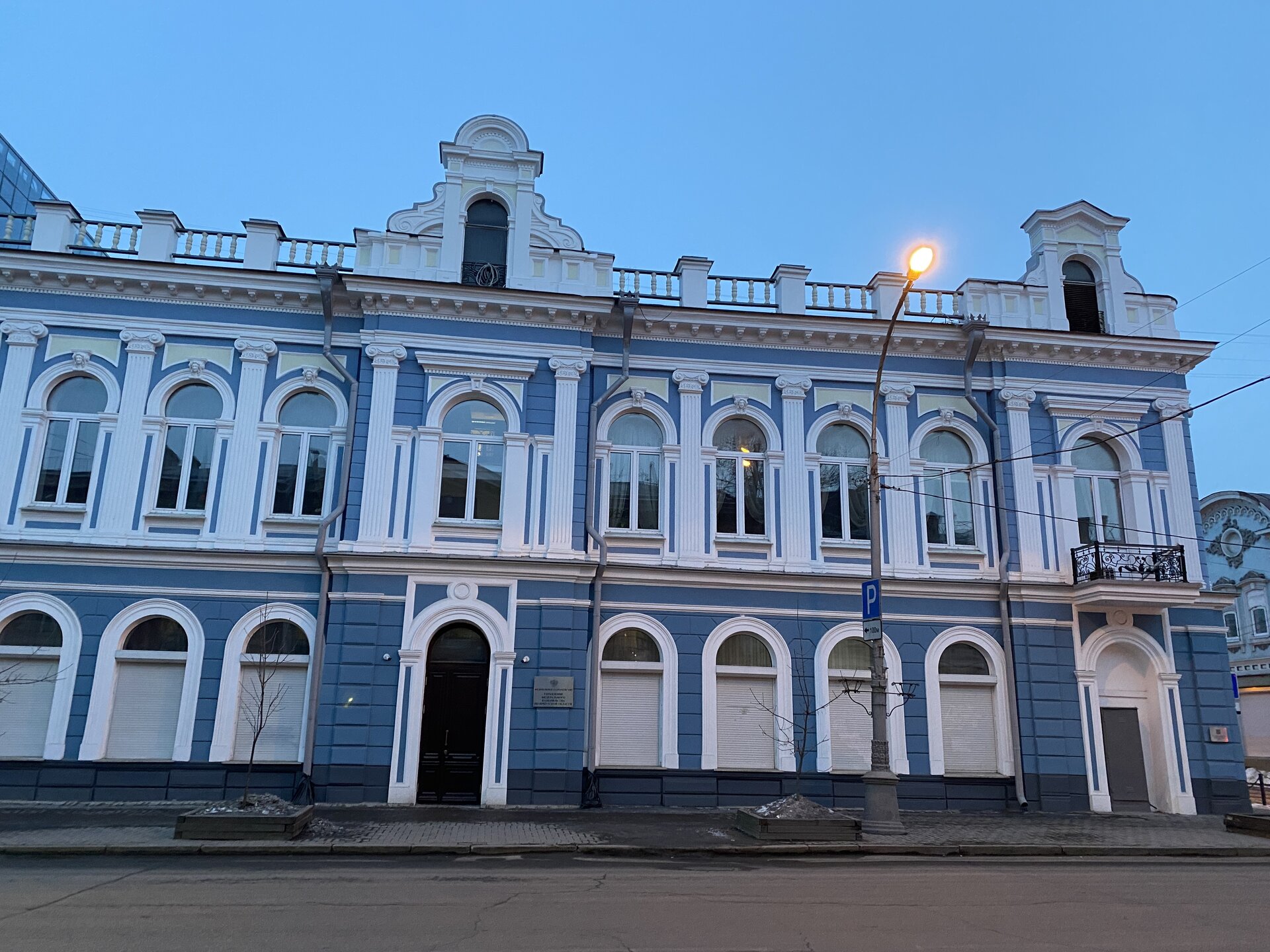 Напротив кафе "Тайга", где я ужинала, красивый собор. Крестовоздвиженский храм является одним из наиболее ярких примеров сибирского зодчества. Его уникальность в том, что он представляет сочетание русских, украинских и даже буддийских мотивов. Начало строительства церкви датируется 1747 годом, а продолжалось оно в течение 13-ти лет. Главной особенностью храма является интересный и сложный орнамент, который украшает стены постройки. Ему характерна нетипичная для православных храмов восточная стилистика, а многие исследователи полагают, что в узоре зашифровано некое послание. Внутреннее убранство церкви очень богато – в ней содержится более 600 икон, большая часть которых уникальна в своем роде и обладает высочайшей художественной ценностью. Примечателен Иконостас церкви – он создан еще в XVIII веке, а его резной орнамент создает необычный эффект «золотой кожи». Некоторые иконы в храме редкие настолько, что их настоящее значение до сих пор остается неизвестным и требует детального изучения. После ужина я отправилась по улице Ленина в сторону делового центра города. Улица Ленина. Старейшая в городе улица Ленина сформировалась в XVIII веке и получила название Морской — через неё шёл путь от Спасской площади к Байкалу. В XIX веке она становится центральной и застраивается административными зданиями, магазинами, учебными заведениями, богатыми особняками. Это была первая городская магистраль, где появились тротуары и масляные фонари. После сильного пожара 1879 года на Амурской (название, которое носила улица с середины XIX века) разрешили строить только каменные дома. На современной улице Ленина сосредоточены архитектурные и культурные достопримечательностей города — площадь Графа Сперанского, Художественный музей им. Сукачёва, Геологический и Художественный музеи, Театр юного зрителя, особняки XIX века. По традиции, на главной улице расположены рестораны, кафе, крупные магазины, сувенирные лавочки. В тёплое время года, благодаря благоустроенным скверам, здесь очень зелено и уютно. С улицы Ленина я свернула в переулок в поисках красивого мурала. Любители уличного искусства оценят мурал на стене Центра гигиены и эпидемиологии (ул. Горького, 24). Немного сбилась со своего маршрута и вышла к улице Карла Маркса. В подсветке эта улица тоже хороша, но в моем плане совсем другой маршрут. Довольно быстро вышла к запланированной площаде Труда. Главное на этой площади — Иркутский государственный цирк. А еще на площади находится популярный у туристов и местных жителей памятник Леониду Гайдаю, установленный в 2012 году. Скульптурная группа изображает момент съемок кинофильма: с одной стороны — известный режиссер, а с другой — известные герои его кинофильмов. Скульпторы: А. Миронов, Л. Сериков. Архитектор: С. Демков.