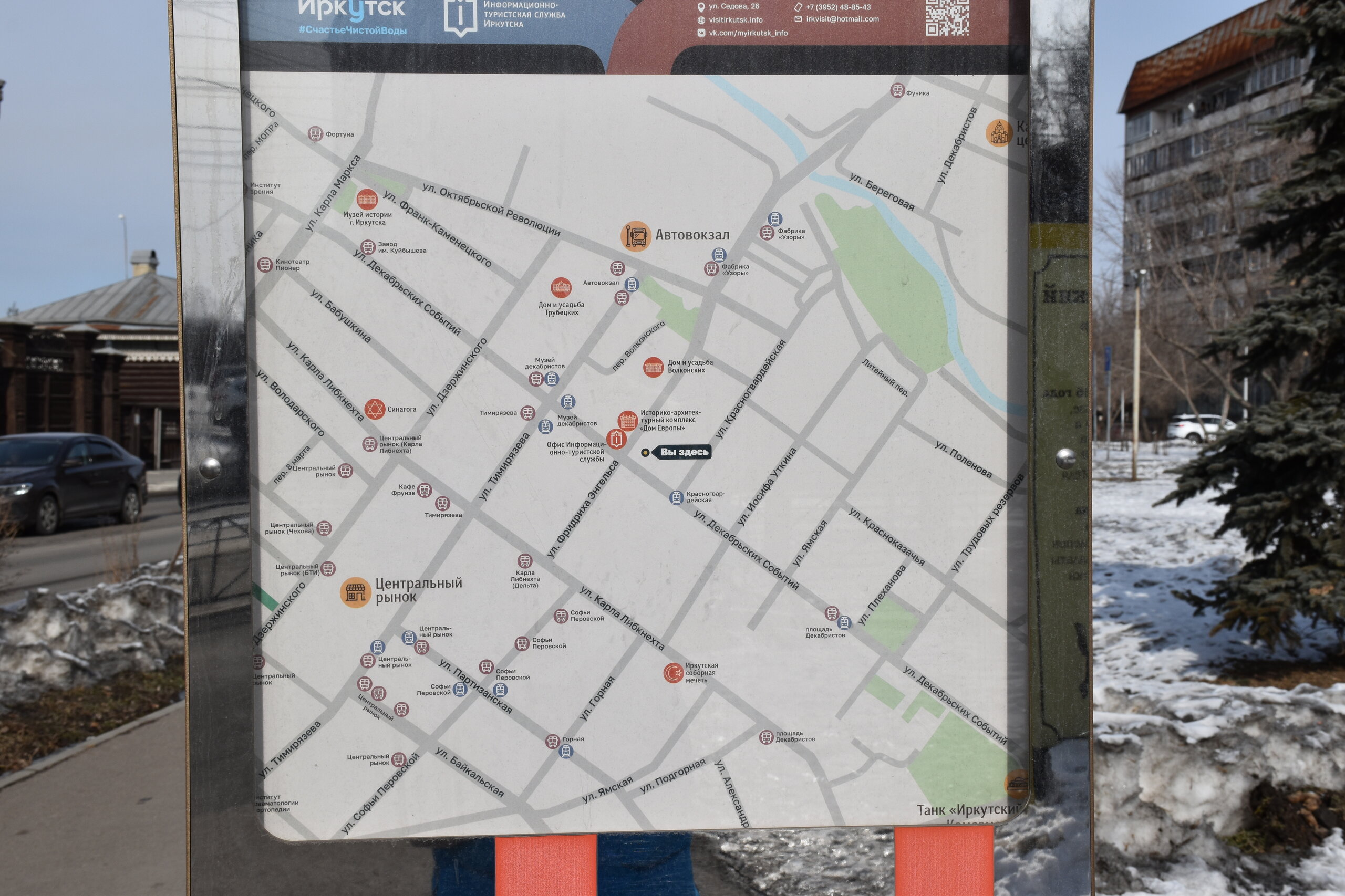 Иду дальше к усадьбе Трубецких, по пути смотрю на деревянные дома и симпатичные каменные особняки. Дом-музей Трубецких — отделение Иркутского областного историко-мемориального музея декабристов. Считается, что в этом доме жила семья Сергея Петровича Трубецкого, хотя исторически этот факт не подтверждается. В 1936 году на здание повесили мемориальную табличку и вскоре в Иркутске его называли не иначе как Дом Трубецких. В 1970 году в отреставрированном здании открылась первая выставка «Декабристы в Иркутске», где были представлены личные вещи, документы, книги. Постоянная экспозиция «Декабристы в Восточной Сибири» была создана позже и тоже разместилась в Доме Трубецких. Постепенно он стал культурным центром — здесь проходили литературные и музыкальные вечера, камерные театральные постановки, творческие встречи. Коллекция музея пополнялась новыми экспонатами. В 2007 году обветшавший до крайности дом был разобран, начался процесс его восстановления. В 2011 году для посетителей открылись жилые комнаты с интерьерами XIX, где размещены вещи, принадлежавшие Трубецким и другим декабристам. В подклете дома появилась новая экспозиция, посвящённая 13-летней каторге и жизни в сибирских поселениях. Музей истории города Иркутска имени А. М. Сибирякова - ул. Франк-Каменецкого, 16а (угол с К.Маркса, 38). Этот музей является одним из самых молодых музеев города – он учрежден в 1996 году. Его стоит посетить для того, чтобы узнать и лучше понять историю Иркутска и его жителей. Здесь можно найти биографии известных горожан, предметы их быта, документы и фотографии. Само здание музея уже является частью истории города. Оно было построено купцом Александром Сибиряковым в конце XIX века в качестве бесплатной школы для детей. Благодаря музейным экспозициям, можно узнать о многонациональности Иркутска, о почетных иркутянах, об истории иркутского купечества, об участии Иркутска в войнах, а также прикоснуться к быту и культуре жителей города в различные эпохи. Напротив, Музея истории Иркутска — сквер с памятником Валериану Куйбышеву, установленный в 1960 году. В. В. Куйбышев — советский государственный и партийный деятель, в 1915—1916 гг. был в ссылке в Иркутской губернии. В 1930 году его именем назвали Иркутский завод тяжелого машиностроения.