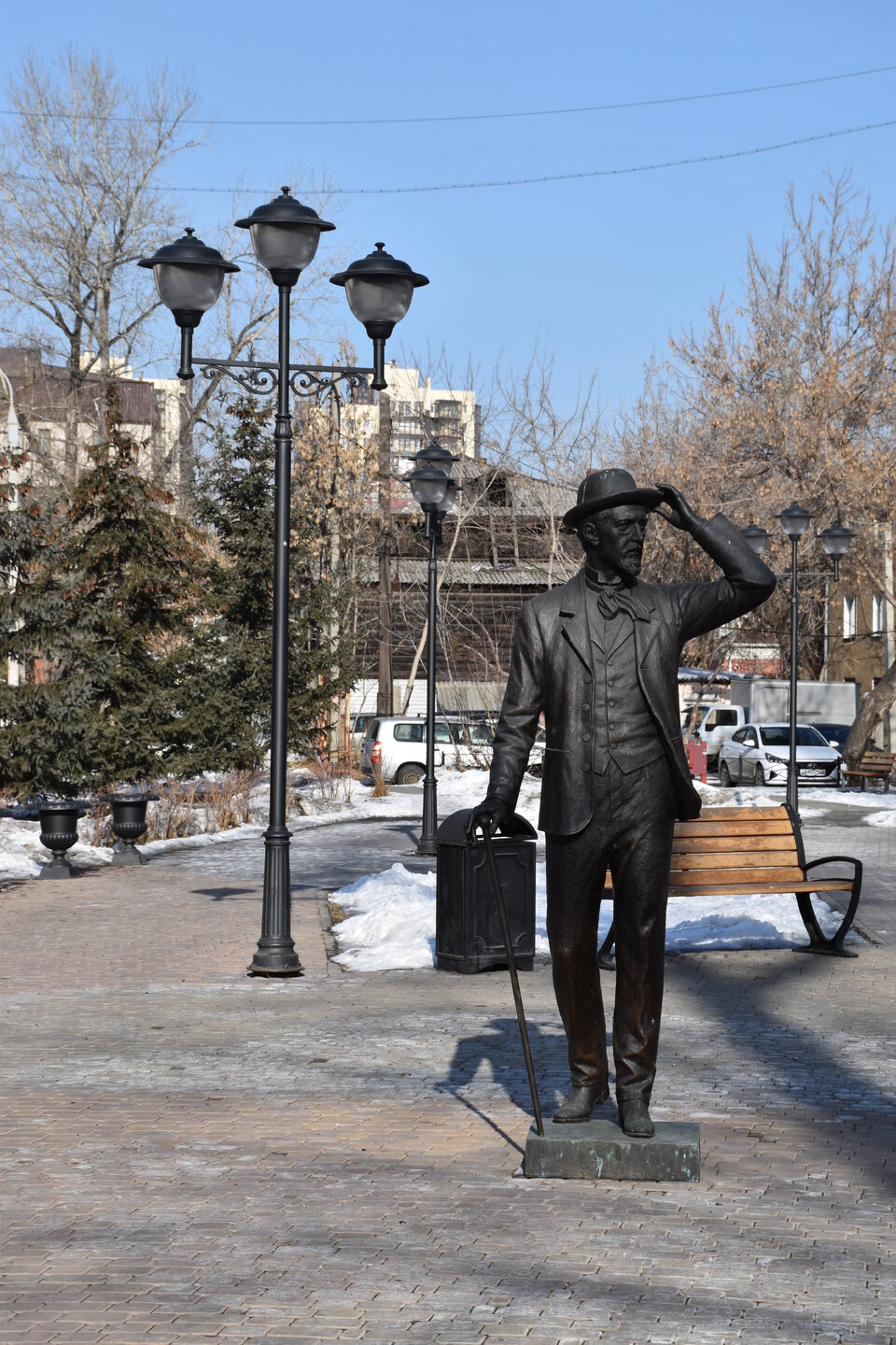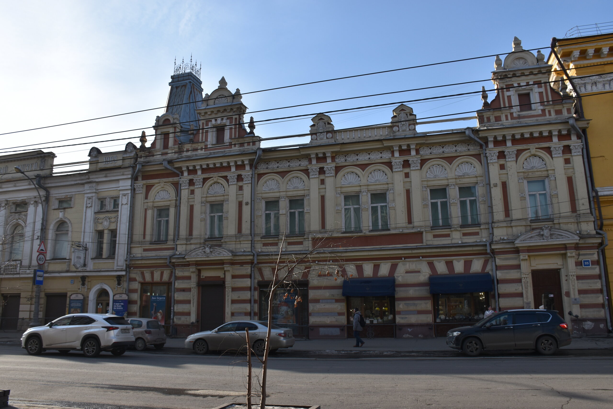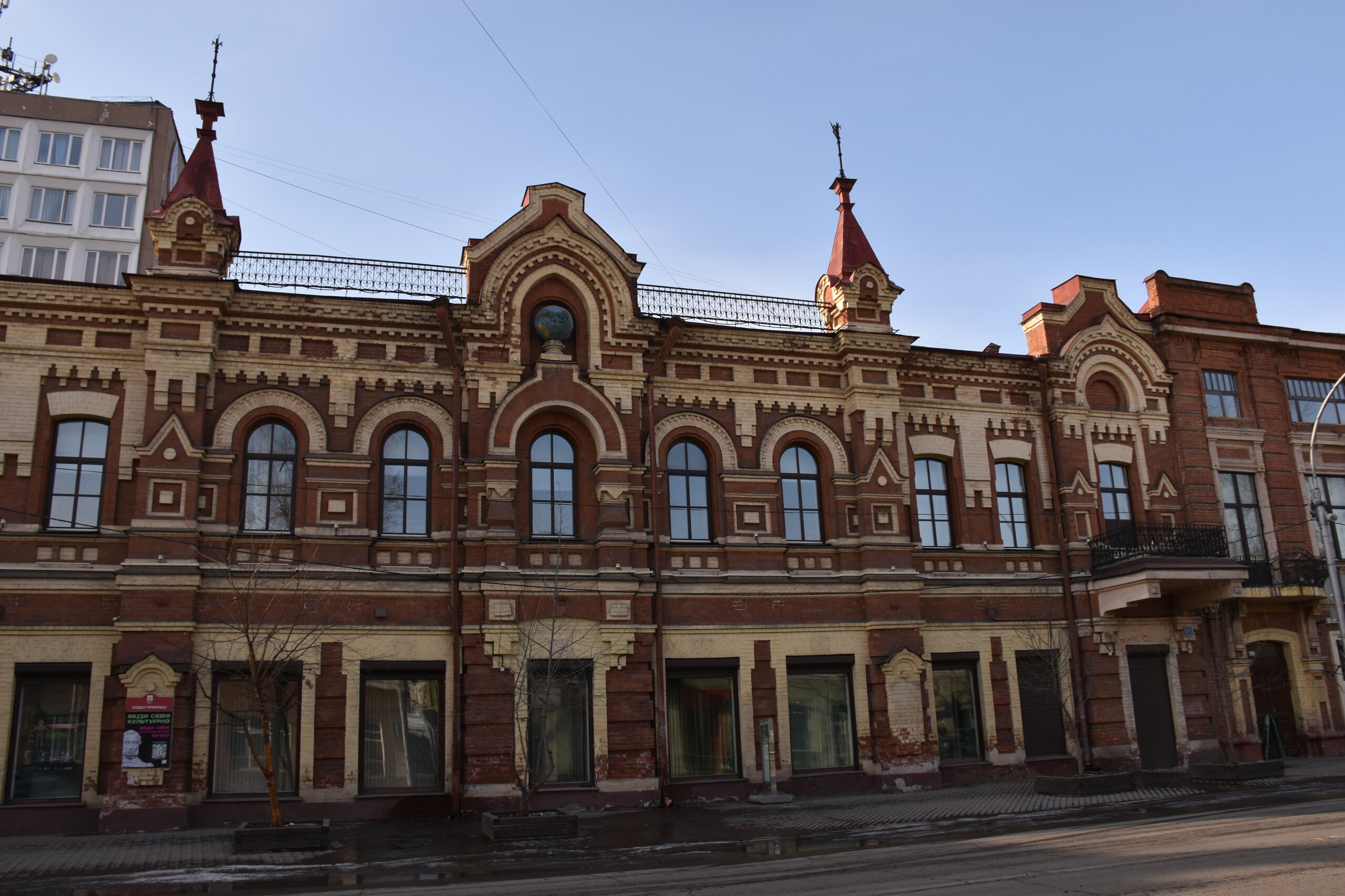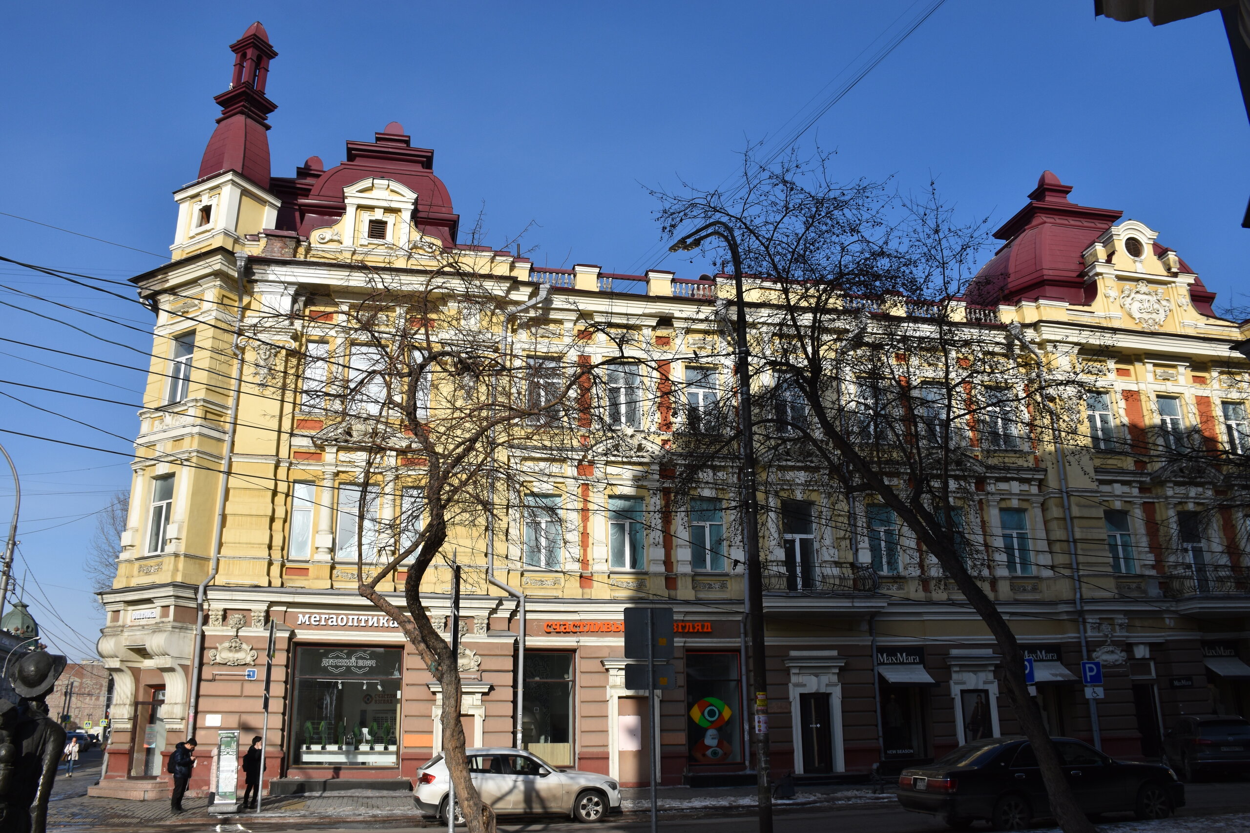 Самая красивая улица в Иркутске — Карла Маркса или, как она называлась до революции, Большая. Она почти полностью состоит из памятников истории и архитектуры, но не деревянных, а каменных. Ведь большинство этих зданий возводились после страшного пожара 1879 года, в котором выгорел почти весь городской центр. В домах расположены административные и жилые дома, магазины, учебные заведения, поликлиники, рестораны, кафе, музеи и театры. На улице установлена скульптура «туриста», разглядывающего крыши, ведь именно вторые этажи зданий здесь украшены самым интересным декором: небольшими скульптурами, вазонами, объёмной лепниной. Также на Карла Маркса есть памятник Ленину и драматургу Александру Вампилову. Эта улица — ещё и одна из двух главных в городе. Причём ближе к её пересечению со второй центральной магистралью — улицей Ленина — расположены наиболее интересные объекты. В их числе бывший Русско-Азиатский банк в стиле модерн, управление ВСЖД — удачный образец сталинского ампира, драмтеатр им. Н.П. Охлопкова в стиле классицизма и Иркутский краеведческий музей, построенный в духе мавританского замка. В здании рядом размещается заочный факультет Восточно-Сибирского института МВД РФ, основной кампус находится в левобережной части города. Если свернуть у ТД «Фортуна Плаза» на улицу Чехова, там есть Чеховский дворик с памятником писателю. На щите — информация о пребывании Антона Павловича в Иркутске. Чехов весной 1890 года проехал через всю Сибирь по пути на Сахалин. В Иркутск он прибыл 4 июня с переправы на Ангаре через Московские ворота и остановился в гостинице «Амурское подворье». Бывшее здание гостиницы находится рядом, во дворе ТЦ «Фортуна Плаза». Иркутск произвел на А. П. Чехова благоприятное впечатление, о чем он писал в письмах к друзьям и родным. В письмах к брату Александру Павловичу он сообщал: «Из всех сибирских городов самый лучший — Иркутск». Потом в письмах к семье: «Иркутск — превосходный город. Совсем интеллигентный. Театр, музей, городской сад с музыкой, хорошие гостиницы… В Иркутске рессорные пролётки. Он лучше Екатеринбурга и Томска. Совсем Европа». 11 июля 1890 года А. П. Чехов по Амурскому тракту выехал из Иркутска. Памятник писателю и драматургу установили в сквере в ноябре 2021 года. Улица Чехова привела меня к Центральному рынку. По адресу ул. Чехова, 23 можно увидеть интересное здание. Этот трехэтажный дома называют «Домом Попова», так как его построили на средства иркутского купца Н. П. Попова в составе его огромной усадьбы в 1876–1880 годах. Во время большого пожара 1879 года усадьба была спасена от огня. Предполагают, что автором проекта здания был губернский архитектор А. Е. Разгильдеев, но документального подтверждения этому нет.