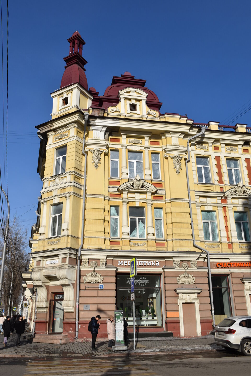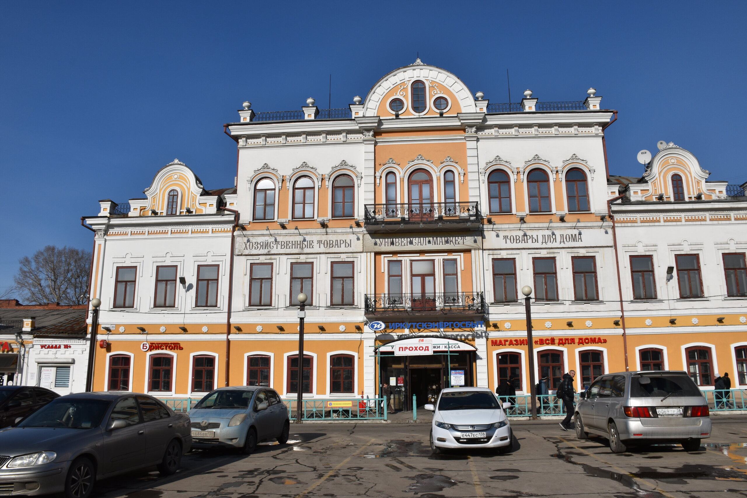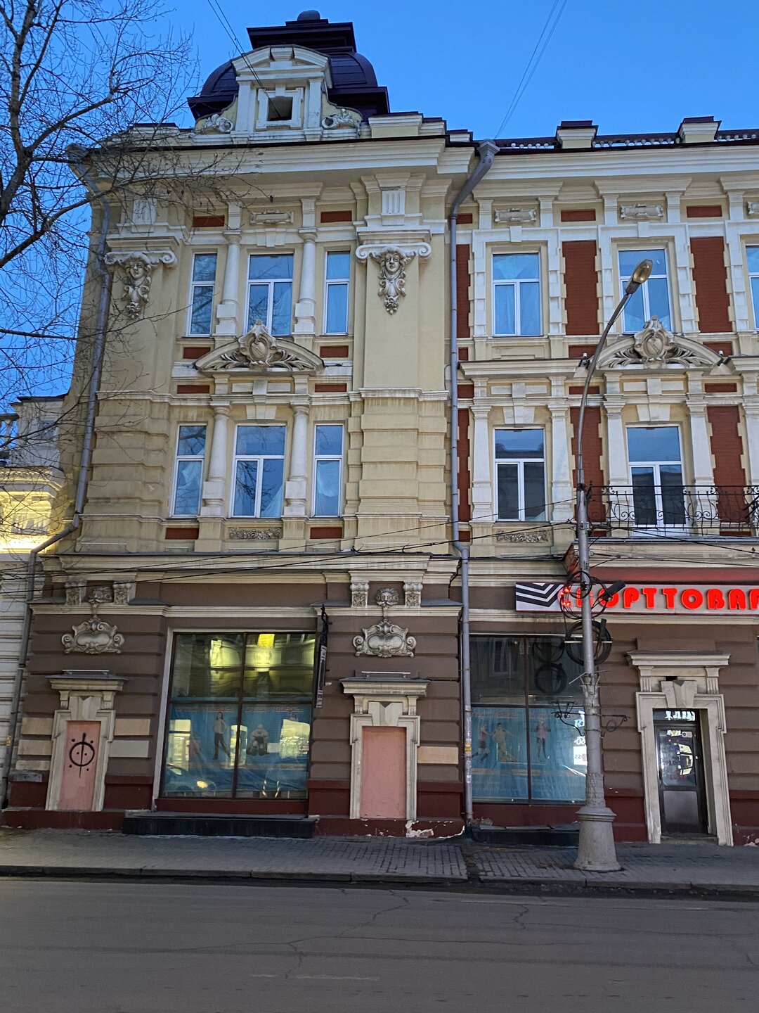 Самая красивая улица в Иркутске — Карла Маркса или, как она называлась до революции, Большая. Она почти полностью состоит из памятников истории и архитектуры, но не деревянных, а каменных. Ведь большинство этих зданий возводились после страшного пожара 1879 года, в котором выгорел почти весь городской центр. В домах расположены административные и жилые дома, магазины, учебные заведения, поликлиники, рестораны, кафе, музеи и театры. На улице установлена скульптура «туриста», разглядывающего крыши, ведь именно вторые этажи зданий здесь украшены самым интересным декором: небольшими скульптурами, вазонами, объёмной лепниной. Также на Карла Маркса есть памятник Ленину и драматургу Александру Вампилову. Эта улица — ещё и одна из двух главных в городе. Причём ближе к её пересечению со второй центральной магистралью — улицей Ленина — расположены наиболее интересные объекты. В их числе бывший Русско-Азиатский банк в стиле модерн, управление ВСЖД — удачный образец сталинского ампира, драмтеатр им. Н.П. Охлопкова в стиле классицизма и Иркутский краеведческий музей, построенный в духе мавританского замка. В здании рядом размещается заочный факультет Восточно-Сибирского института МВД РФ, основной кампус находится в левобережной части города. Если свернуть у ТД «Фортуна Плаза» на улицу Чехова, там есть Чеховский дворик с памятником писателю. На щите — информация о пребывании Антона Павловича в Иркутске. Чехов весной 1890 года проехал через всю Сибирь по пути на Сахалин. В Иркутск он прибыл 4 июня с переправы на Ангаре через Московские ворота и остановился в гостинице «Амурское подворье». Бывшее здание гостиницы находится рядом, во дворе ТЦ «Фортуна Плаза». Иркутск произвел на А. П. Чехова благоприятное впечатление, о чем он писал в письмах к друзьям и родным. В письмах к брату Александру Павловичу он сообщал: «Из всех сибирских городов самый лучший — Иркутск». Потом в письмах к семье: «Иркутск — превосходный город. Совсем интеллигентный. Театр, музей, городской сад с музыкой, хорошие гостиницы… В Иркутске рессорные пролётки. Он лучше Екатеринбурга и Томска. Совсем Европа». 11 июля 1890 года А. П. Чехов по Амурскому тракту выехал из Иркутска. Памятник писателю и драматургу установили в сквере в ноябре 2021 года. Улица Чехова привела меня к Центральному рынку. По адресу ул. Чехова, 23 можно увидеть интересное здание. Этот трехэтажный дома называют «Домом Попова», так как его построили на средства иркутского купца Н. П. Попова в составе его огромной усадьбы в 1876–1880 годах. Во время большого пожара 1879 года усадьба была спасена от огня. Предполагают, что автором проекта здания был губернский архитектор А. Е. Разгильдеев, но документального подтверждения этому нет.