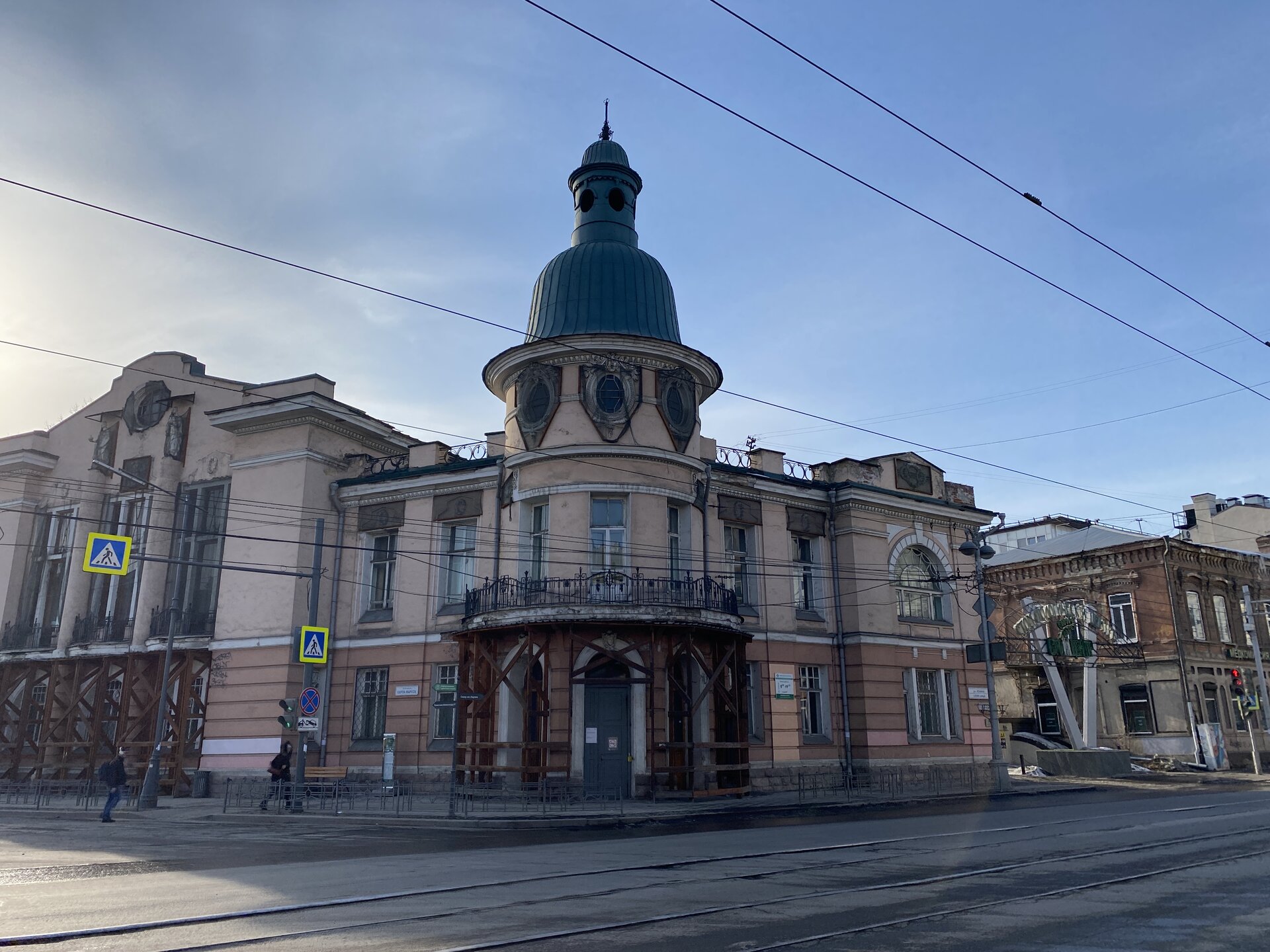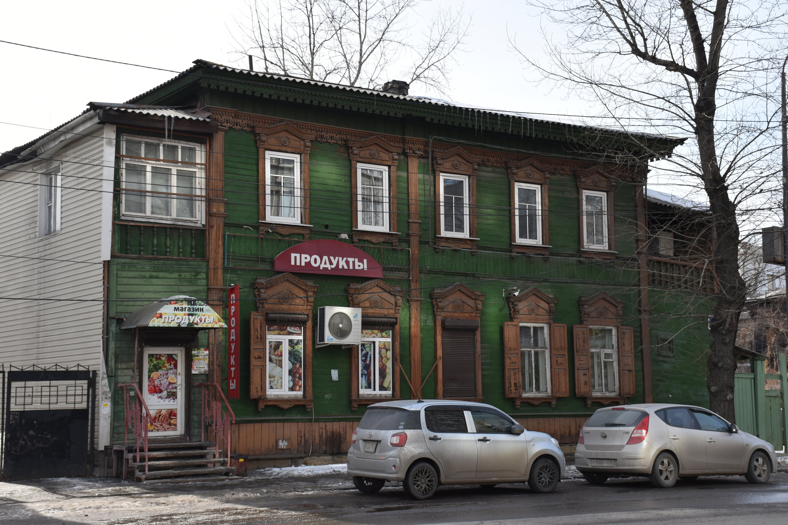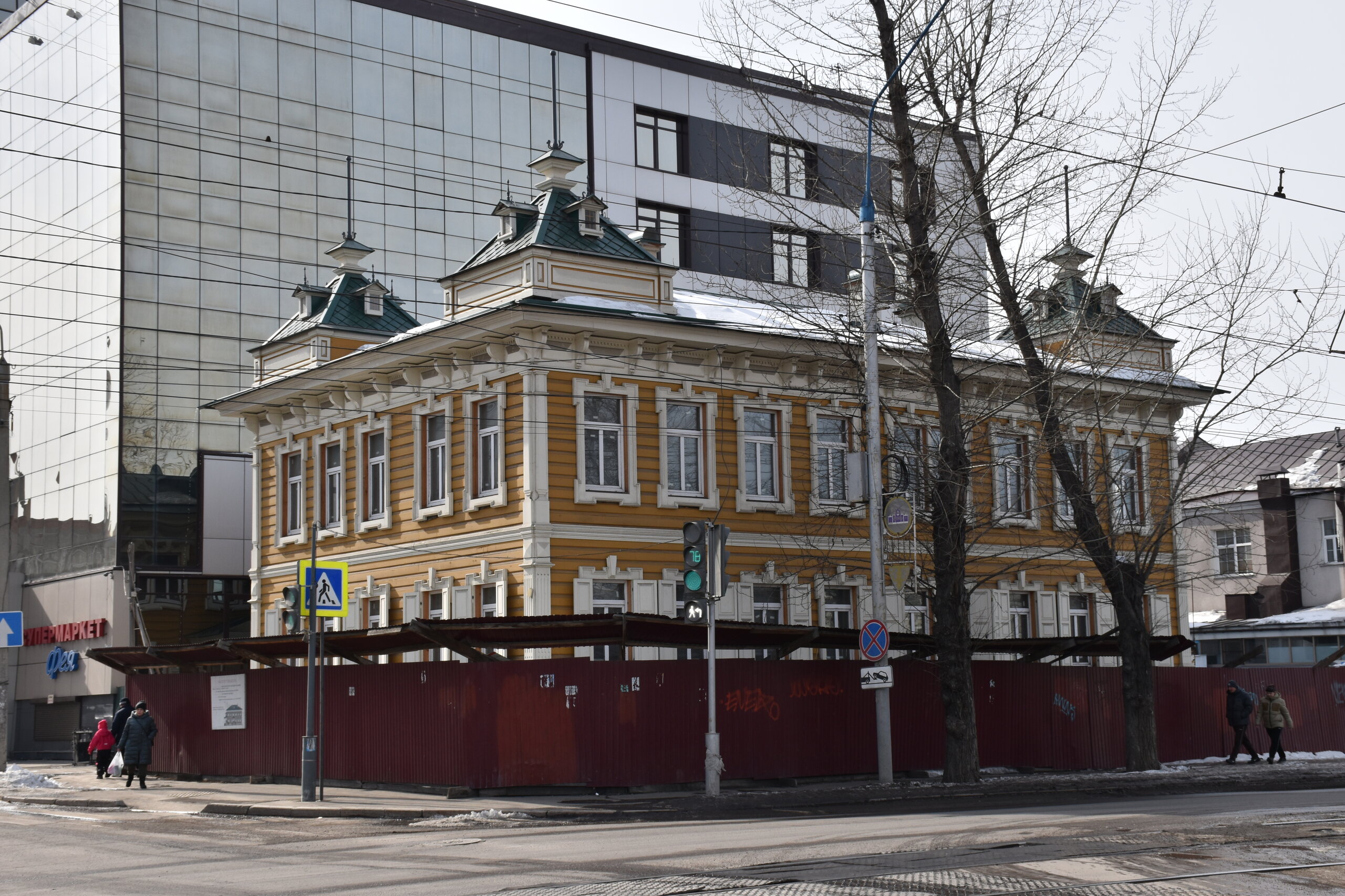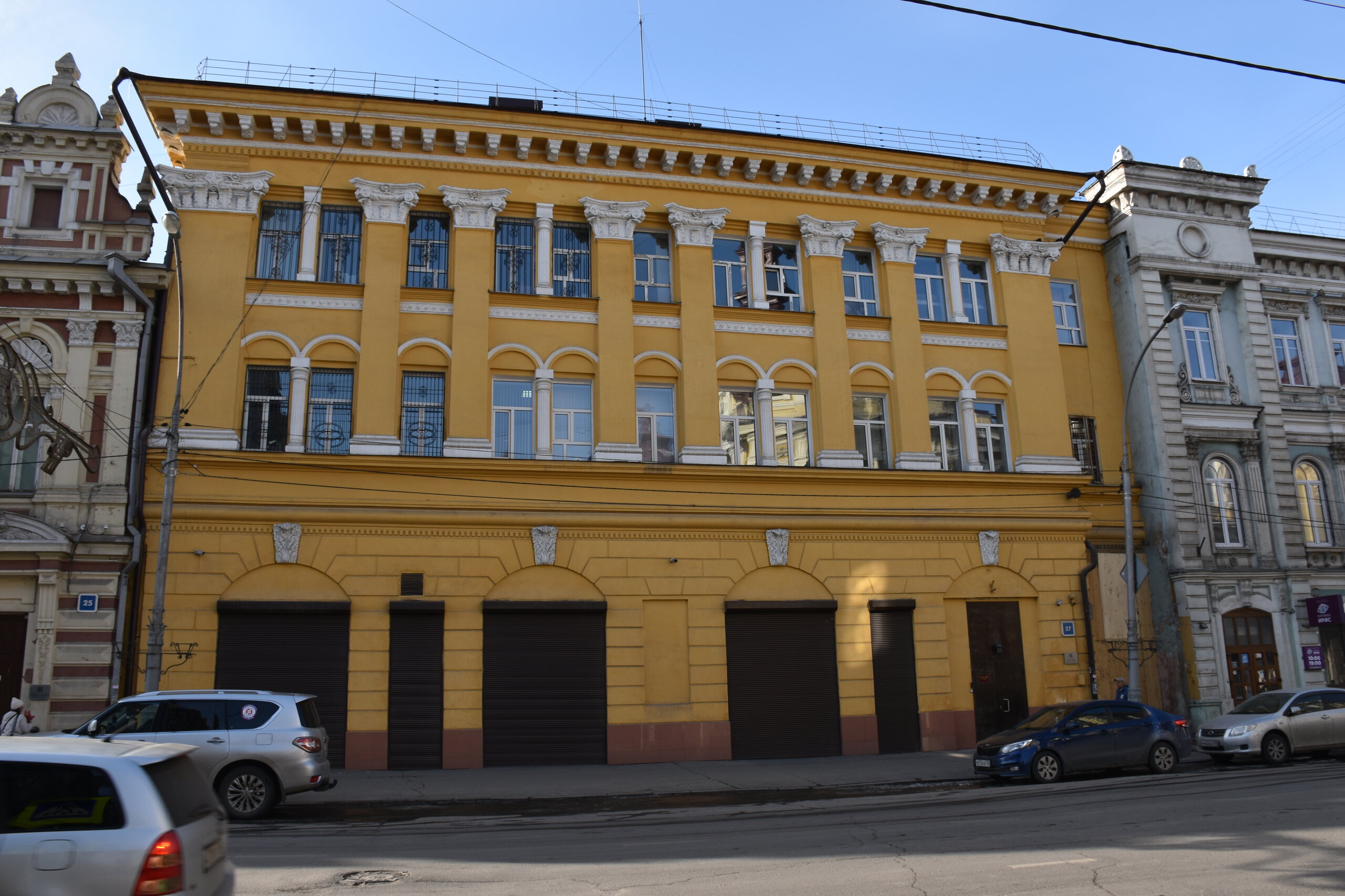 Самая красивая улица в Иркутске — Карла Маркса или, как она называлась до революции, Большая. Она почти полностью состоит из памятников истории и архитектуры, но не деревянных, а каменных. Ведь большинство этих зданий возводились после страшного пожара 1879 года, в котором выгорел почти весь городской центр. В домах расположены административные и жилые дома, магазины, учебные заведения, поликлиники, рестораны, кафе, музеи и театры. На улице установлена скульптура «туриста», разглядывающего крыши, ведь именно вторые этажи зданий здесь украшены самым интересным декором: небольшими скульптурами, вазонами, объёмной лепниной. Также на Карла Маркса есть памятник Ленину и драматургу Александру Вампилову. Эта улица — ещё и одна из двух главных в городе. Причём ближе к её пересечению со второй центральной магистралью — улицей Ленина — расположены наиболее интересные объекты. В их числе бывший Русско-Азиатский банк в стиле модерн, управление ВСЖД — удачный образец сталинского ампира, драмтеатр им. Н.П. Охлопкова в стиле классицизма и Иркутский краеведческий музей, построенный в духе мавританского замка. В здании рядом размещается заочный факультет Восточно-Сибирского института МВД РФ, основной кампус находится в левобережной части города. Если свернуть у ТД «Фортуна Плаза» на улицу Чехова, там есть Чеховский дворик с памятником писателю. На щите — информация о пребывании Антона Павловича в Иркутске. Чехов весной 1890 года проехал через всю Сибирь по пути на Сахалин. В Иркутск он прибыл 4 июня с переправы на Ангаре через Московские ворота и остановился в гостинице «Амурское подворье». Бывшее здание гостиницы находится рядом, во дворе ТЦ «Фортуна Плаза». Иркутск произвел на А. П. Чехова благоприятное впечатление, о чем он писал в письмах к друзьям и родным. В письмах к брату Александру Павловичу он сообщал: «Из всех сибирских городов самый лучший — Иркутск». Потом в письмах к семье: «Иркутск — превосходный город. Совсем интеллигентный. Театр, музей, городской сад с музыкой, хорошие гостиницы… В Иркутске рессорные пролётки. Он лучше Екатеринбурга и Томска. Совсем Европа». 11 июля 1890 года А. П. Чехов по Амурскому тракту выехал из Иркутска. Памятник писателю и драматургу установили в сквере в ноябре 2021 года. Улица Чехова привела меня к Центральному рынку. По адресу ул. Чехова, 23 можно увидеть интересное здание. Этот трехэтажный дома называют «Домом Попова», так как его построили на средства иркутского купца Н. П. Попова в составе его огромной усадьбы в 1876–1880 годах. Во время большого пожара 1879 года усадьба была спасена от огня. Предполагают, что автором проекта здания был губернский архитектор А. Е. Разгильдеев, но документального подтверждения этому нет.