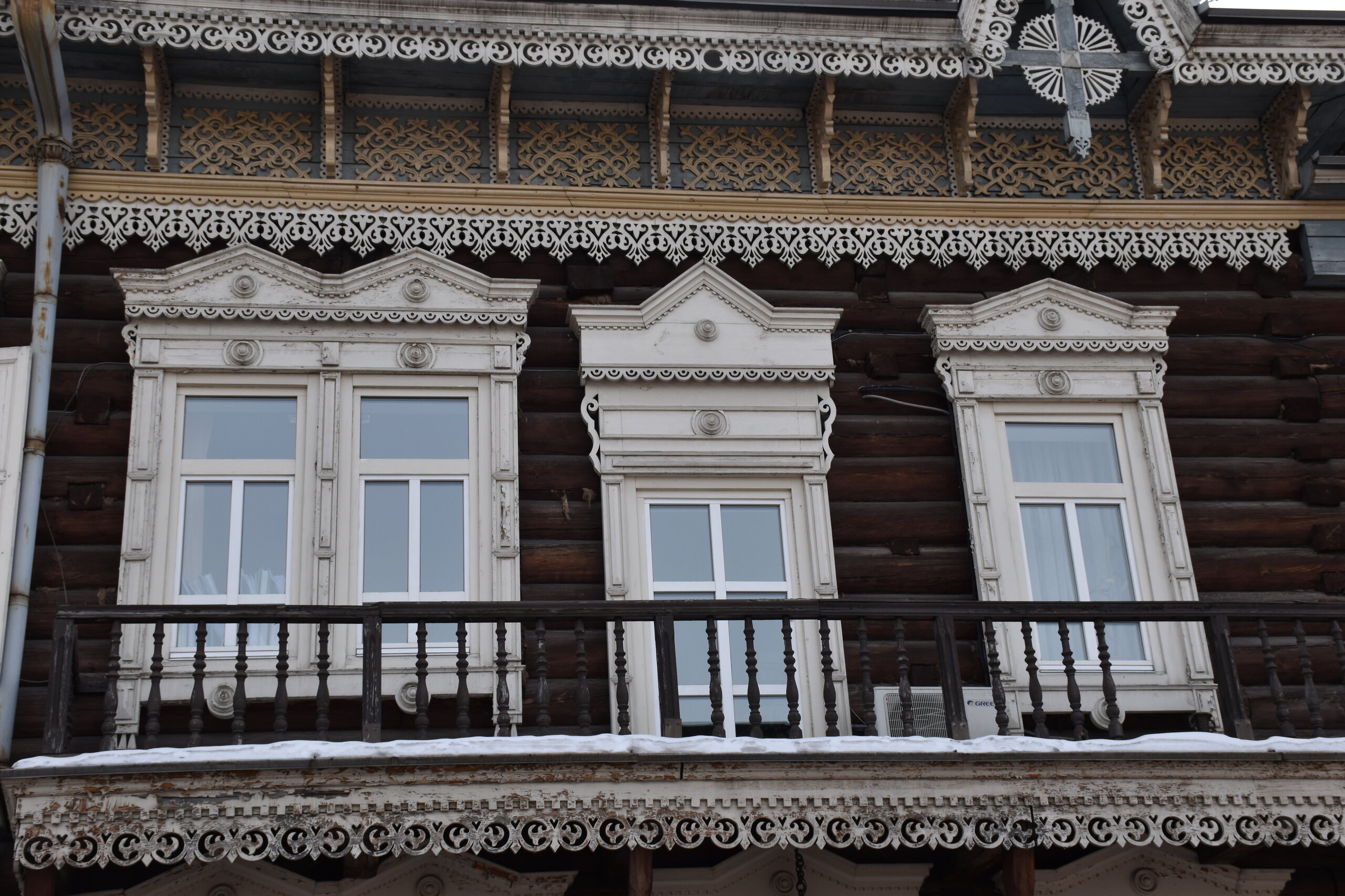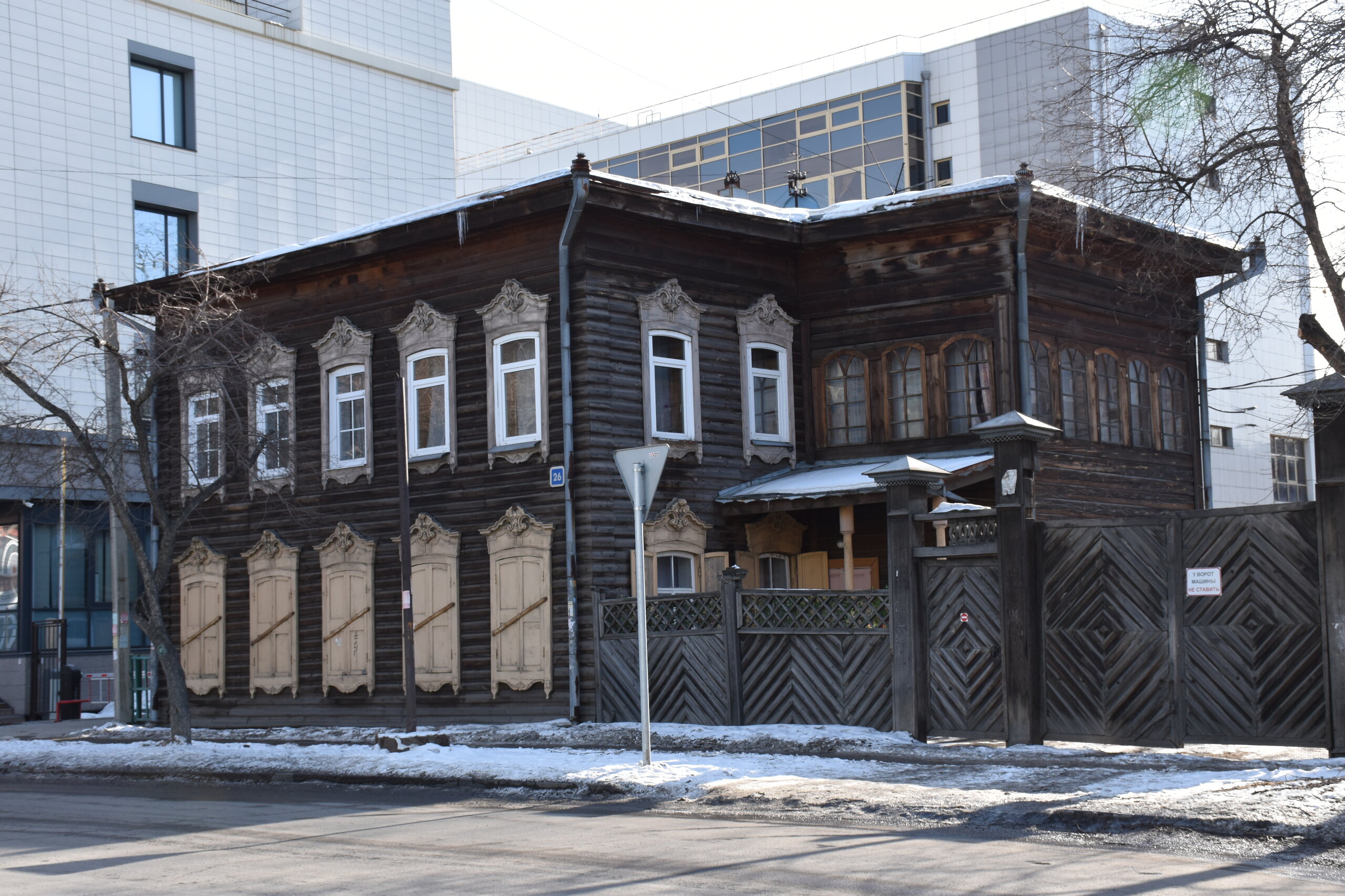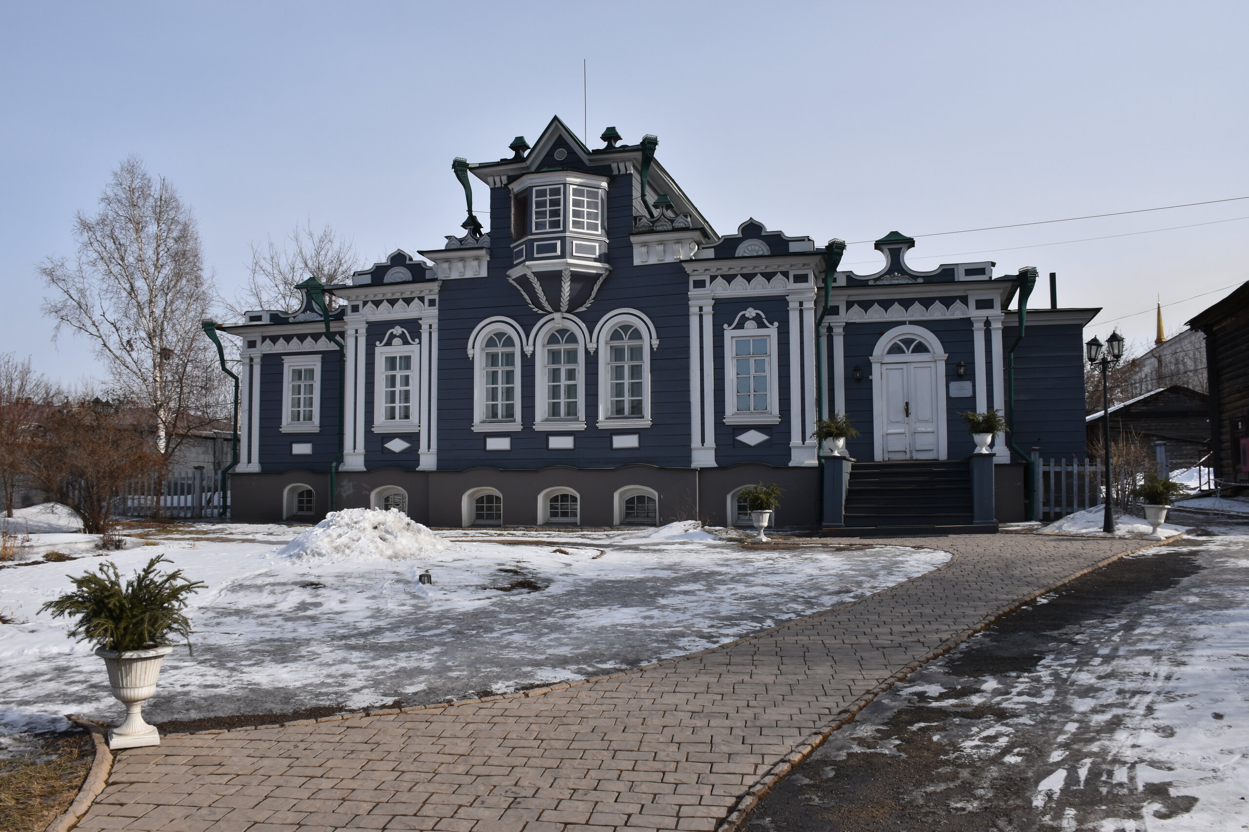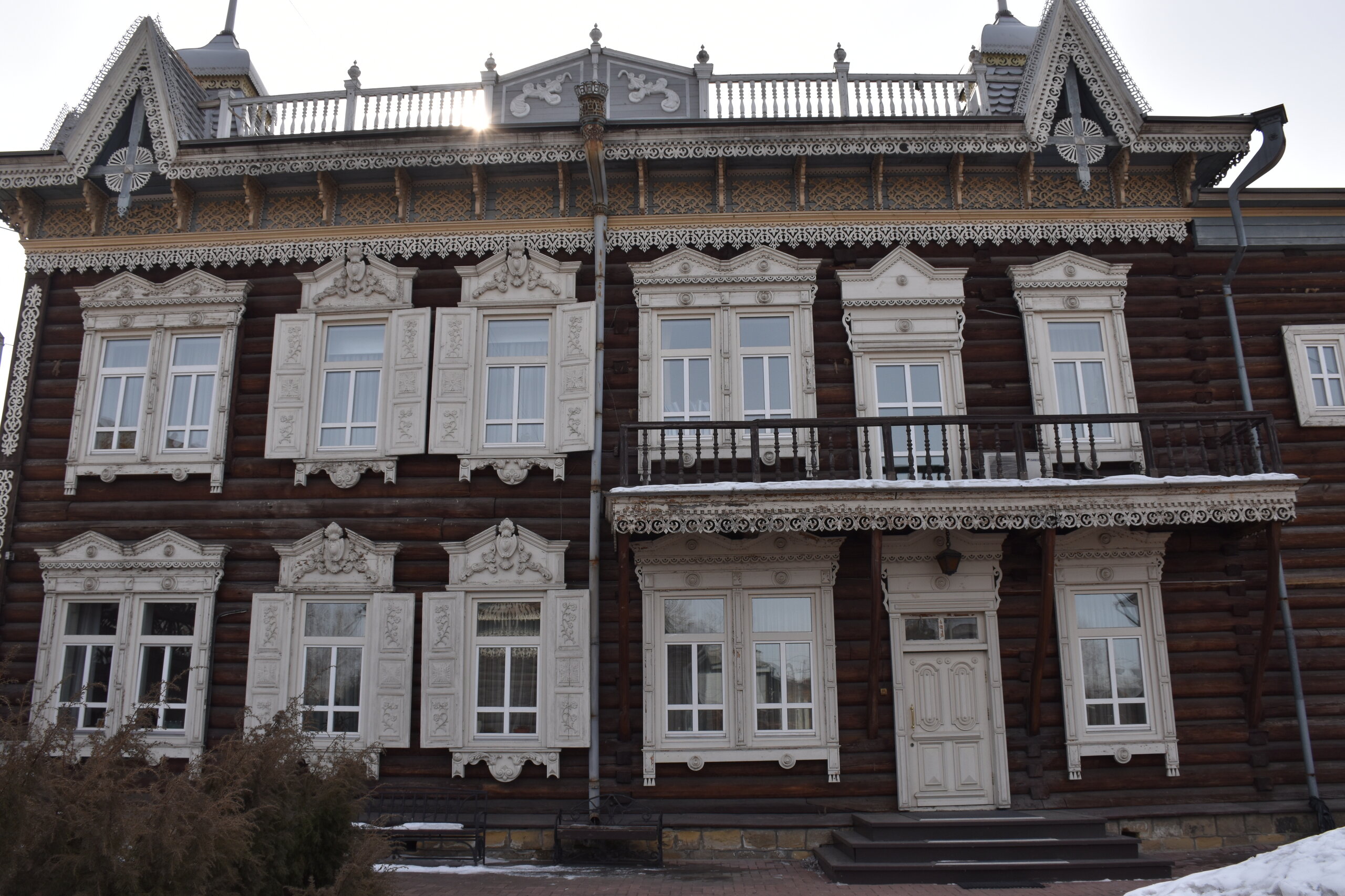 Модерн и деревянное зодчество Иркутска Многие представляют главный город Восточной Сибири современным, многоэтажным, с офисными зданиями и торговыми центрами. Однако в первую очередь Иркутск – город деревянного зодчества и модерна. Центр Иркутска решили фактически законсервировать, по возможности оставив таким, каким он был в начале прошлого века, а все современное строительство вынести на окраины. Потому в Иркутске сохранилось так много деревянных домов – буквально целые улицы кое-где заметно ушедших в землю домов, с резными наличниками и палисадниками. А вдоль магистральных улиц и площадей выстроились великолепные каменные дома в стиле модерн – свидетельства процветания местного купечества, разбогатевшего на торговле пушниной, золотом, китайском чаем. Конечно, не обошлось и без «вставных зубов» — зачастую между старинными домами небрежно вклинивается образец современной архитектуры. Встречаются улицы, по одной стороне которых тянется ряд деревянных домов, а по другой – многоэтажки. И эта дисгармония на первых порах раздражала («а ты поживи в таком деревянном доме» - отвечают местные). Но по мере того, как вы будете изучать город и привыкать к нему, эти раздражающие детали будут уходить на второй план. Зато невозможно не восхищаться затейливыми купеческими домами, кружевными наличниками изб, не слишком древними, но красивыми церквями. Моя первая и самая дальняя точка от центра - музей-усадьба В. П. Сукачева. Художественный музей Сукачева представляет собой комплекс старинных особняков и прилегающий к ним парк. Усадьба общественного деятеля и благотворителя В. П. Сукачева – это настоящий памятник иркутского зодчества. В комплекс зданий входит картинная галерея с зимним садом, дом, где проживала прислуга, конюшня, гостевой домик, беседка и пейзажный парк. В главном доме разместилась экспозиция, благодаря которой можно больше узнать о быте семьи Сукачева. Здесь представлены предметы обихода, принадлежавшие членам семьи, а также предметы тех времен – антикварная посуда, мебель, картины. В остальных знаниях часто проводятся временные выставки.