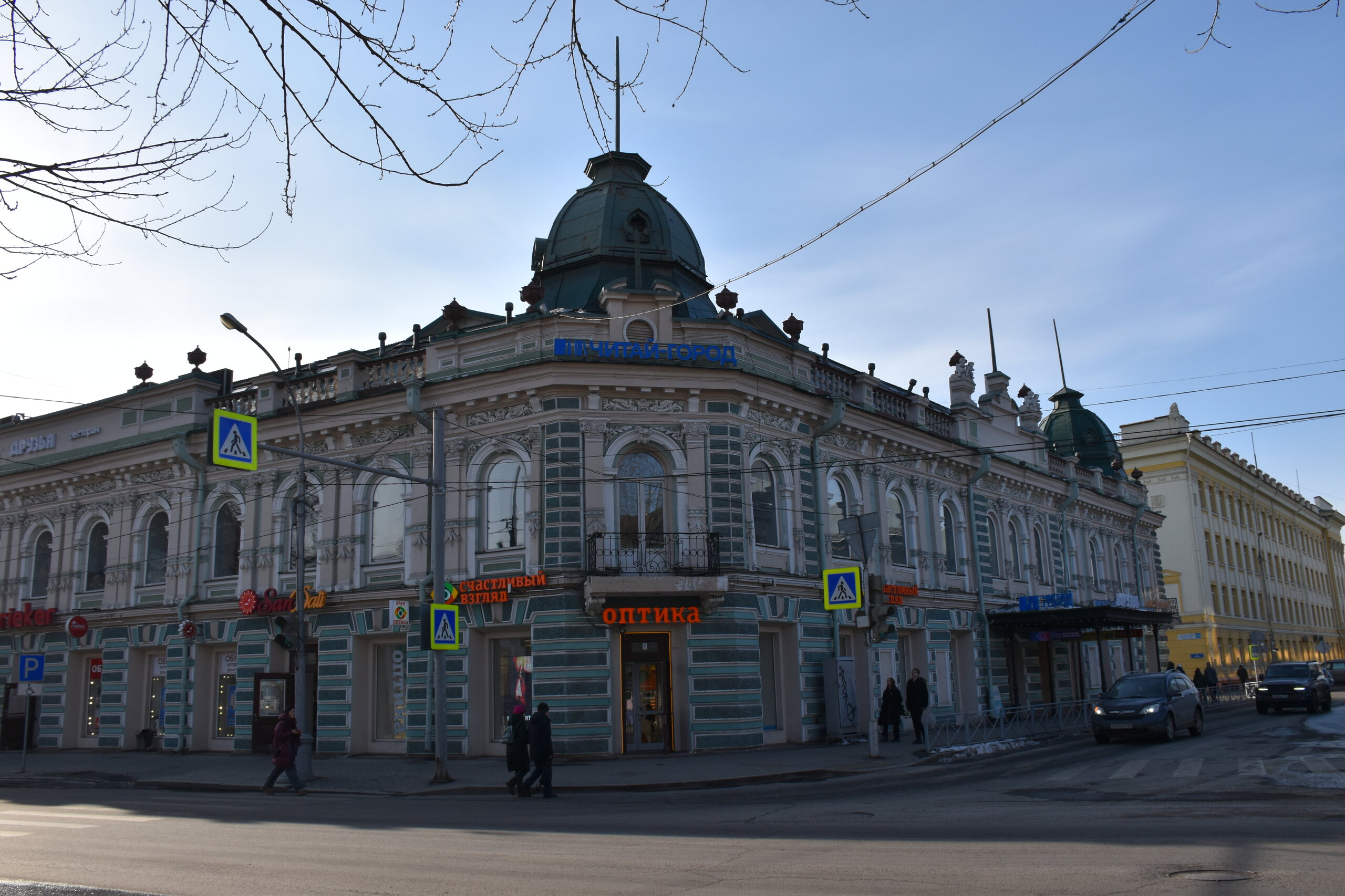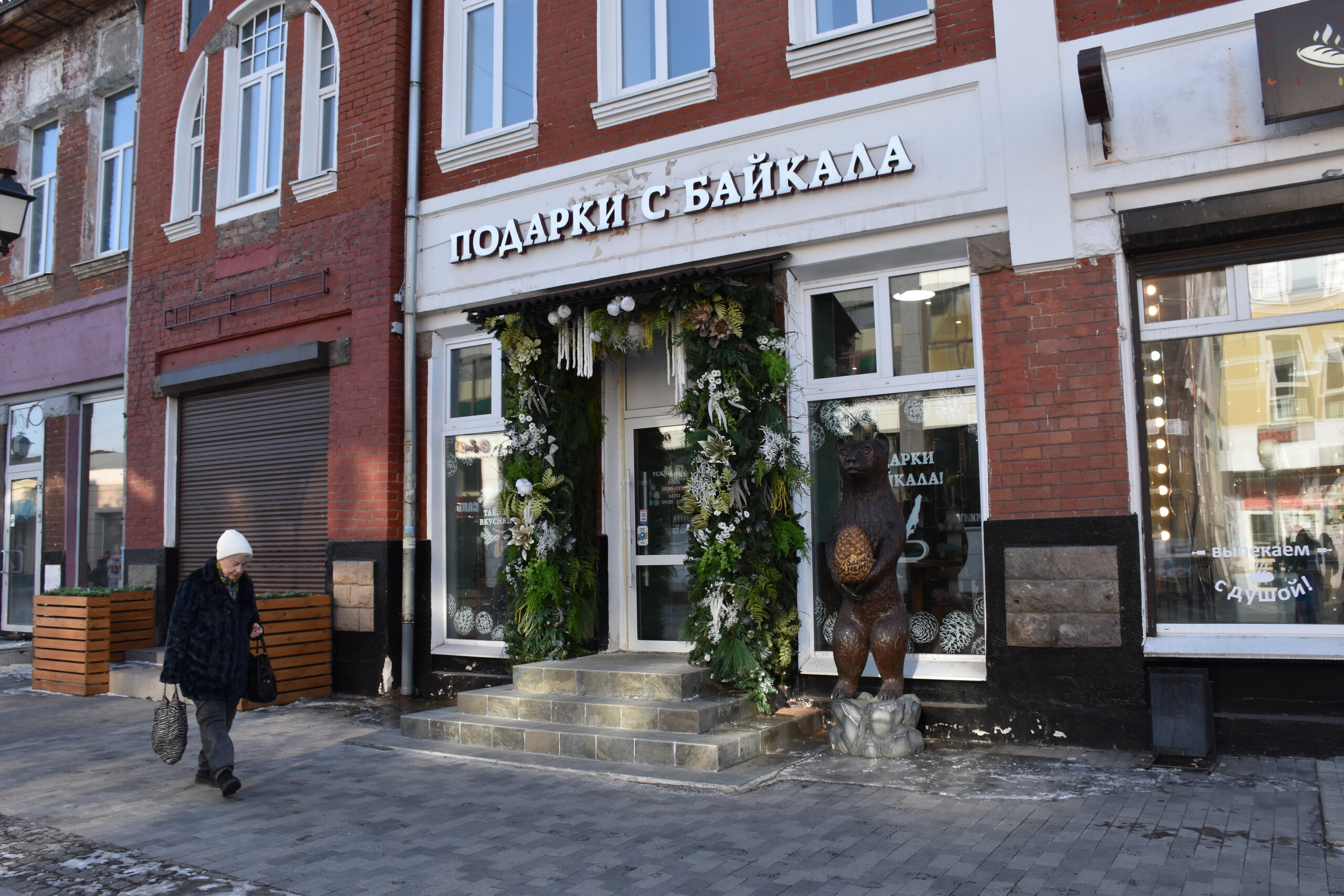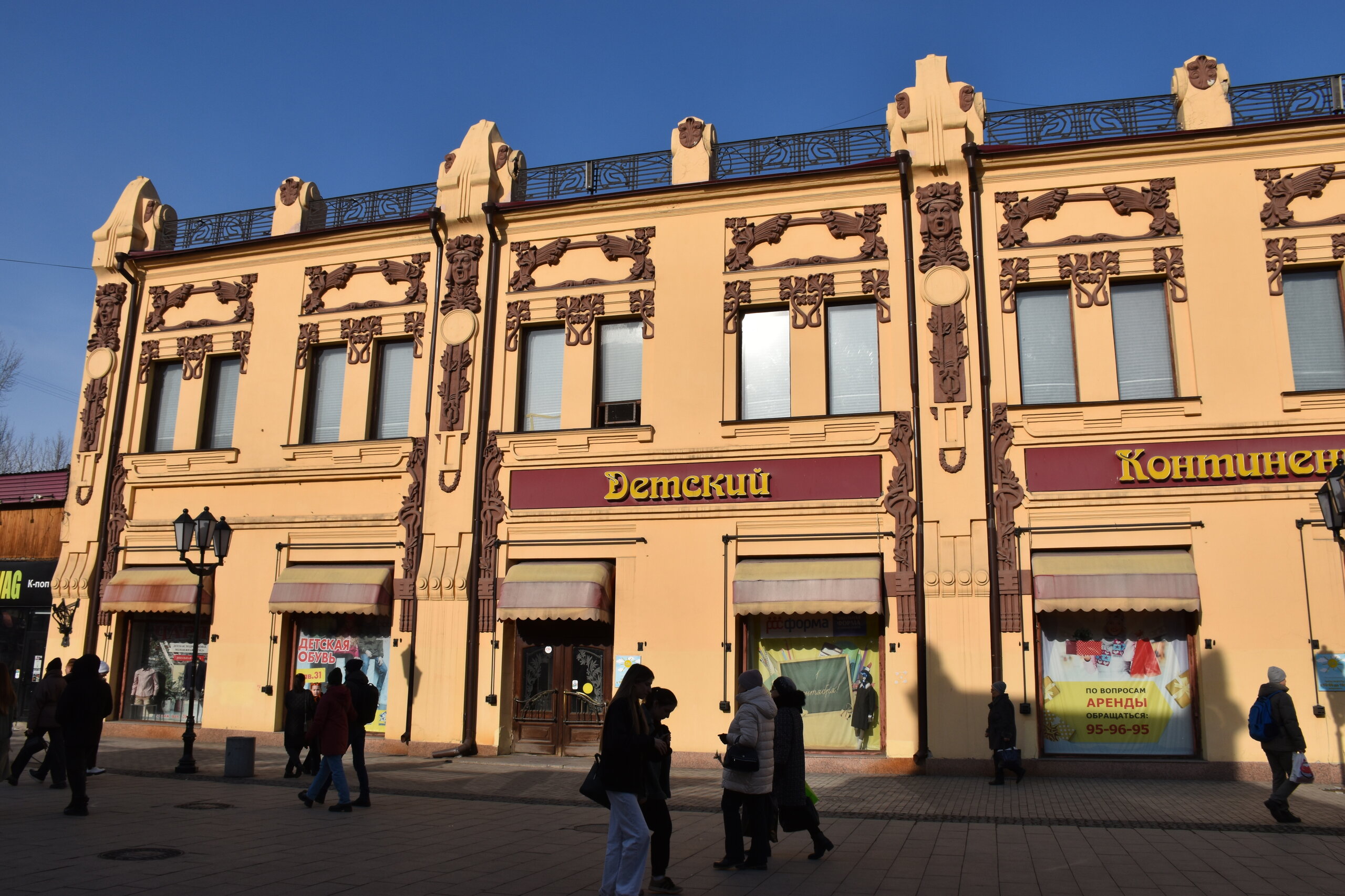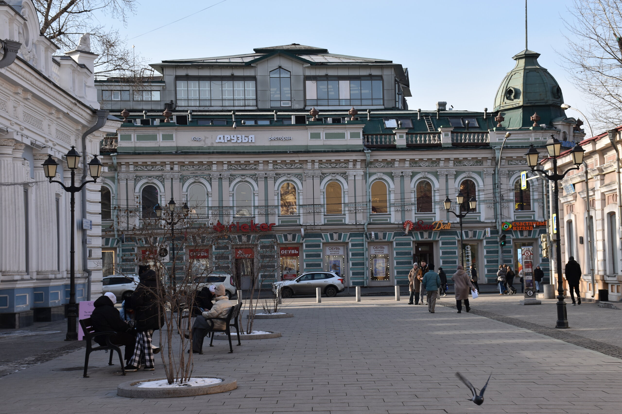 Возвращаюсь обратно на К.Маркса. Сворачиваю на ул.Урицкого. Это главная пешеходная улица Иркутска, вдоль которой расположились магазины, кафе, рестораны, а во дворах — современные бары. Ведет от улицы Карла Маркса к Центральному рынку, где можно прикупить знаменитые конфеты «Грильяж» с кедровыми орешками или рыбу в подарок. В 18 веке она соединяла два городских базара: Мелочной и Хлебный — на их месте сейчас Цирк и Центральный рынок. Улица всегда была торговой: именно здесь уже позднее, в конце 19 века, располагались магазины купцов-иркутян, а в 1906 года даже продавали автомобили. Один из ярких памятников архитектуры — бело-голубая усадьба Аксенова-Тышко, где сейчас вы обнаружите с десяток магазинов. Главный архитектурный памятник — дом купца Родионова (Урицкого,3). Памятник «Туристу» работы скульптора Игоря Ставского, 2011 год. Усадьба Никитина на пересечении улиц Карла Маркса и Литвинова украшена пышным декором в начале XX века. Два этажа здания в стиле неоренессанс занимала гостиница «Гранд-Отель». На первом этаже были магазины швейцарских часов, книг, кафе и бильярдная. После революции отель национализировали, а внутри проводили партийные съезды. Теперь первые этажи снова занимают магазины.