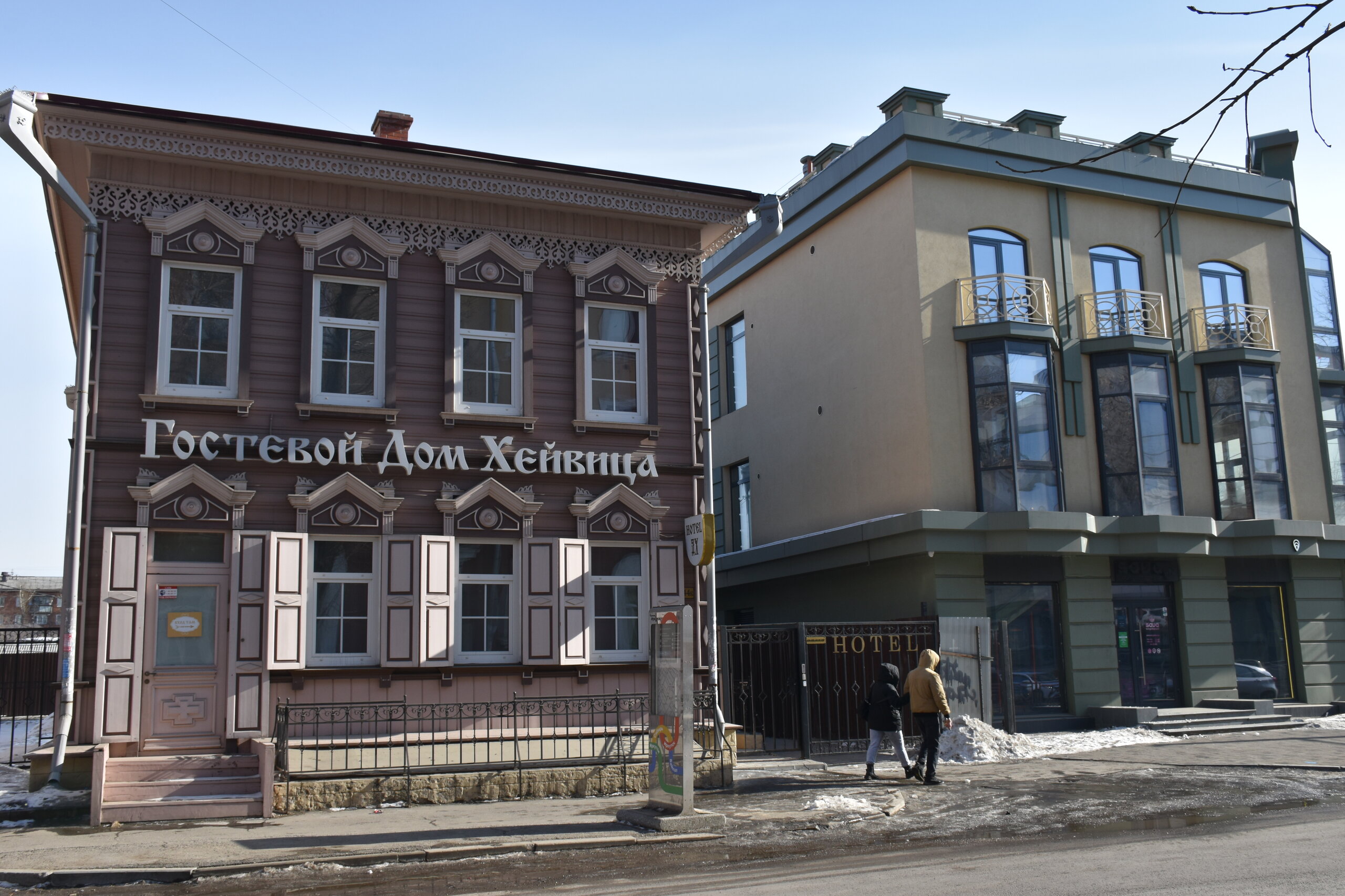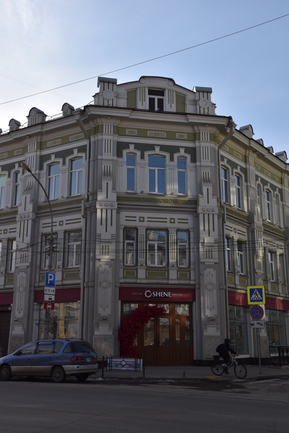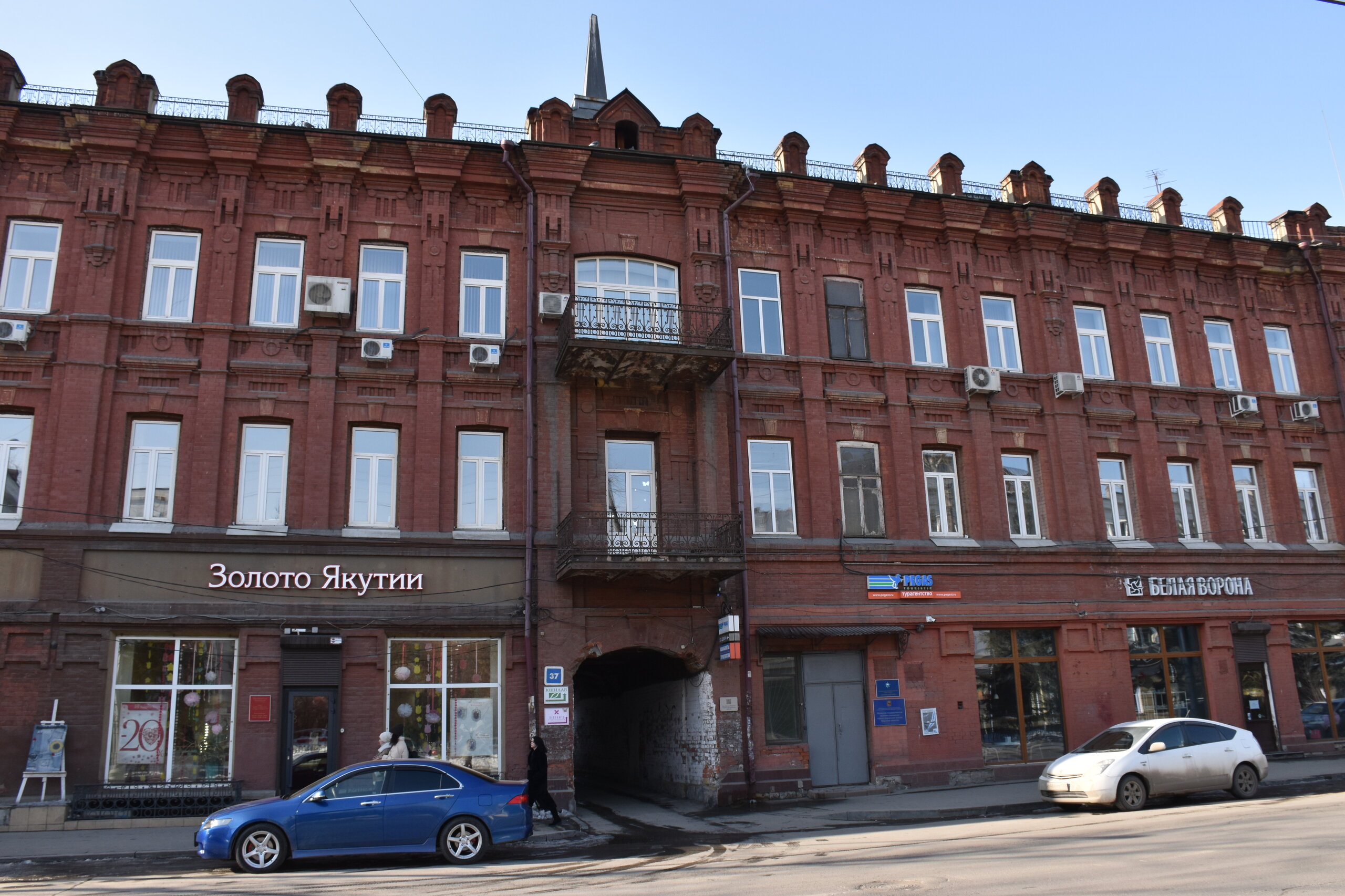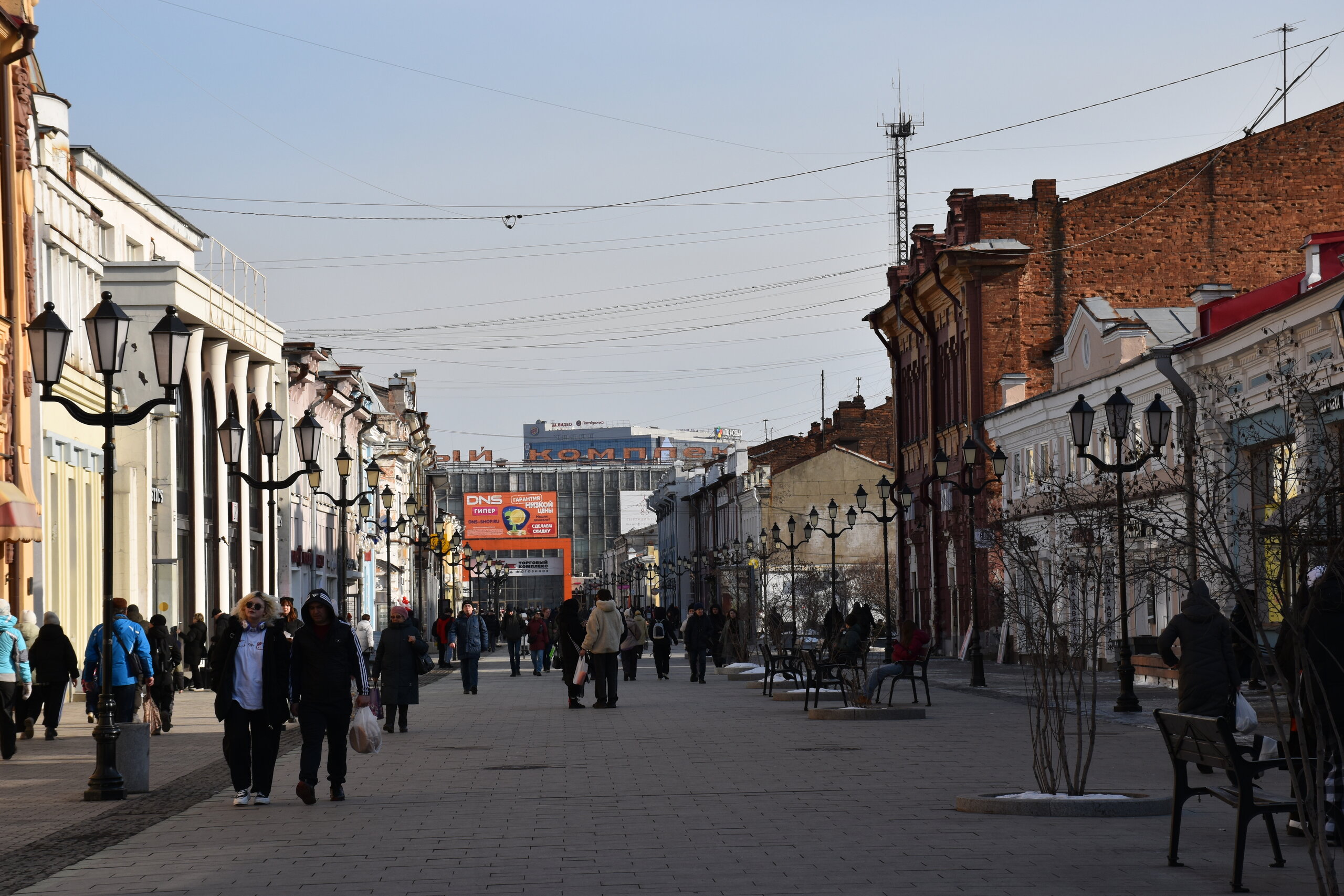 Возвращаюсь обратно на К.Маркса. Сворачиваю на ул.Урицкого. Это главная пешеходная улица Иркутска, вдоль которой расположились магазины, кафе, рестораны, а во дворах — современные бары. Ведет от улицы Карла Маркса к Центральному рынку, где можно прикупить знаменитые конфеты «Грильяж» с кедровыми орешками или рыбу в подарок. В 18 веке она соединяла два городских базара: Мелочной и Хлебный — на их месте сейчас Цирк и Центральный рынок. Улица всегда была торговой: именно здесь уже позднее, в конце 19 века, располагались магазины купцов-иркутян, а в 1906 года даже продавали автомобили. Один из ярких памятников архитектуры — бело-голубая усадьба Аксенова-Тышко, где сейчас вы обнаружите с десяток магазинов. Главный архитектурный памятник — дом купца Родионова (Урицкого,3). Памятник «Туристу» работы скульптора Игоря Ставского, 2011 год. Усадьба Никитина на пересечении улиц Карла Маркса и Литвинова украшена пышным декором в начале XX века. Два этажа здания в стиле неоренессанс занимала гостиница «Гранд-Отель». На первом этаже были магазины швейцарских часов, книг, кафе и бильярдная. После революции отель национализировали, а внутри проводили партийные съезды. Теперь первые этажи снова занимают магазины.