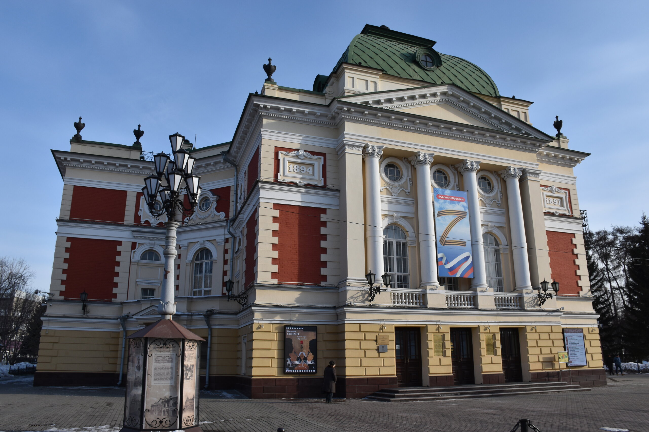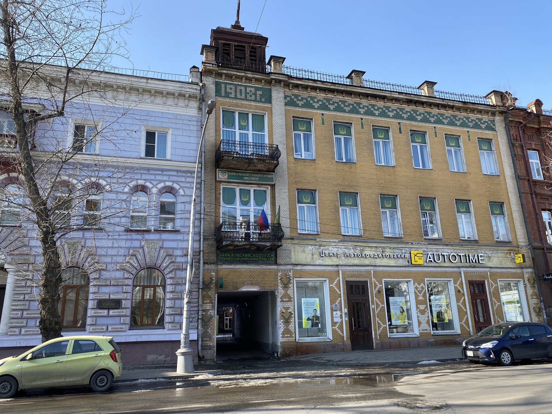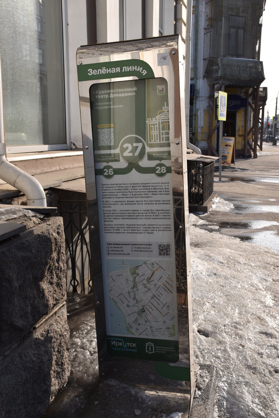 Здание в псевдорусском стиле с затейливыми башенками на кровле, увенчанными металлическими флюгерами, занимает сейчас Иркутский областной краеведческий музей. А построено оно было в 1899–1903 годах для размещения книжного магазина сибирских просветителей П. И. Макушина и В. М. Посохина. На втором этаже были жилые помещения, а в дворовой части здания — типография с переплетными мастерскими. На углу улицы Сухэ-Батора построен в 1910–1912 по проекту архитектора Н. И. Бойкова как доходный дом фон Люде. Сейчас это деловой центр «Ангарский». Маршрут "Зеленая линия" хорошо промаркирован. Все здания на перекрестке с улицы Ленина — памятники архитектуры. Вот один из корпусов Байкальского государственного университета, за ним скрываются еще несколько. Здание построено в конце XIX века для Иркутского высшего начального Александро-Мариинского училища, получившего название в честь 25-летия супружеской жизни императора Александра III и его супруги Марии Федоровны. В 1930 году здание передали Сибирскому финансово-экономическому институту, предшественнику Байкальского университета. Тогда же его надстроили еще двумя этажами и изменили фасады. Русско-азиатский банк - ул. Ленина, 38 – угол с К.Маркса. Его построили в стиле модерн в 1910–1911 годах. Фасад здания украшали балконы с металлическими решетками и высокие полуколонны, завершающиеся скульптурами-символами самодержавия. Сейчас это простая поликлиника, но внутри есть на что посмотреть: мраморная лестница на второй этаж, лепнина на потолке. Драматический театр имени Н.П. Охлопкова – ул. Карла Маркса, 14. Любителям театрального искусства обязательно следует посетить старейший российский драмтеатр – театр имени Охлопкова, учрежденный в 1850 году. Его история началась с небольшой группы странствующих артистов, которые решили осесть в Иркутске, а действующий губернатор поспособствовал тому, чтобы у группы появилось собственное здание для представлений. Это было деревянное сооружение на подмостках, в котором был дан первый спектакль «Русский человек добро помнит». С этого и началось развитие театральной деятельности в Иркутске. В конце XIX столетия актеры переехали в величественное каменное здание, которое было построено специально для этого. В 70-е годы XX века театру дали имя известного режиссера Охлопкова. Сегодня, благодаря реставрациям, театр не утратил свой величественный вид. Внешне здание сохранило исторический архитектурный стиль, но внутреннее оснащение театра довольно современное – качественная звуковая и световая аппаратура, компьютерное и механическое управление создают широкие возможности для постановок. В сквере у театра стоит памятник Александру Вампилову, первые спектакли по его пьесам были поставлены именно в Иркутской драме.