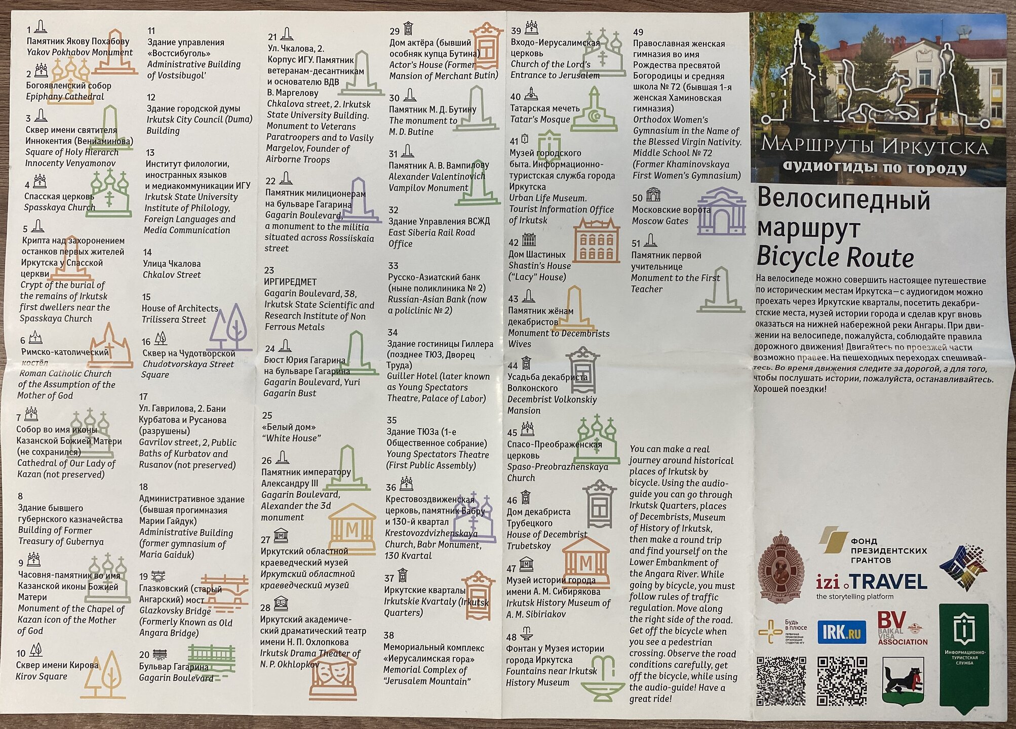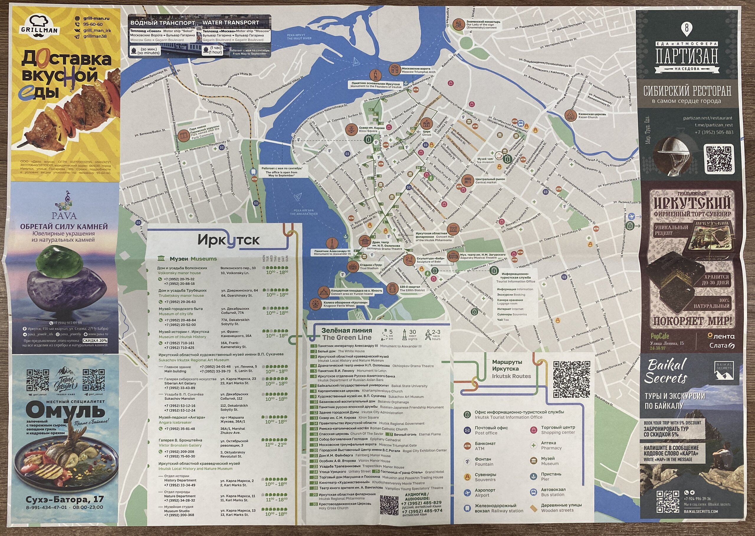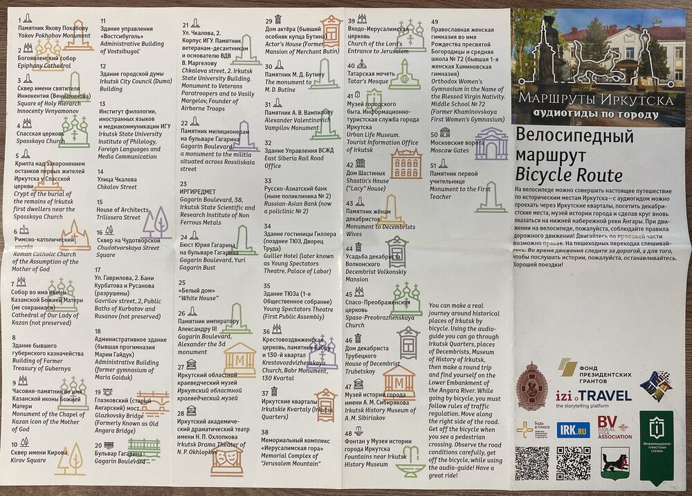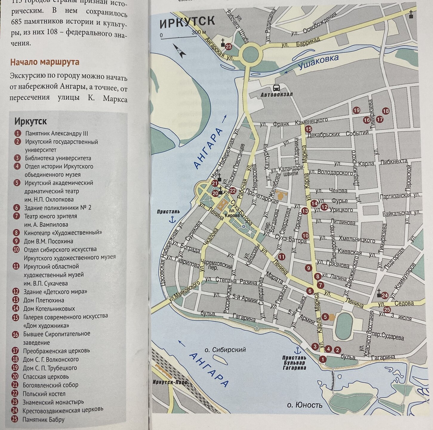 Иркутск Иркутск — один из самых колоритных городов Сибири. Он был основан в XVII веке в устье реки Иркут как место для зимовья. Острог быстро превратился в полноценный населенный пункт: Иркутск находился на пересечении путей, связывающих Россию с Дальним Востоком, Монголией, Китаем. Иркутск включен в список городов с культурно-историческим наследием, здесь более 600 важных памятников архитектуры, истории и культуры. В разные времена город именовали «Сибирский Париж» и «Сибирские Афины». Чехов, восхищаясь архитектурой города и уровнем культурного развития местного населения, сравнивал Иркутск с Европой: «Иркутск лучше Екатеринбурга и Томска. Совсем Европа». Сейчас Иркутск чаще всего посещают в рамках поездки на Байкал — на 1–2 дня. Иркутск находится в 70 км от озера Байкал. Этот город достаточно большой: здесь проживает 600 000 человек. Расположен на берегу реки Ангара. В 1800 годах на территории Иркутска обнаружили золото, что помогло городу быстро расти в экономическом плане. Сегодня город представляет собой оживленный мегаполис, в котором сохранилась очаровательная атмосфера старого города. Иркутск, до революции бывший многонациональным и многоконфессиональным городом, заслуженно называют городом-музеем под открытым небом. В исторической части сохранилась застройка XVIII века в необычном архитектурном стиле — сибирское барокко. Красивые деревянные дома с ручными вырезками примыкают к старым купеческим домам, великолепные виллы стоят рядом с красочными церквями. Иркутск за 1 день — это, прежде всего, долгие пешие прогулки по городу. В Иркутске очень хороший инфоцентр. На сайте https://visitirkutsk.info/ советую изучить маршруты по городу и отправиться в увлекательную прогулку по своим интересам. Инфоцент предлагает пешеходные следующие маршруты по Иркутску https://visitirkutsk.info/open-irk/routes: - Зеленая линия: маршрут проходит по основным достопримечательностям в историческом центре города. Маршрут охватывает 30 объектов, среди них — церкви, музеи, памятники, театры, площади, а также различные архитектурные достопримечательности. Возле каждого объекта находится информационный стенд с кратким описанием достопримечательности. Протяжённость: 5,5 км. Время: ~ 2-3 часа. - Деревянный Иркутск: от 18 века до 2000-х годов. Приглашаем вас исследовать основные орнаменты оформления наличников, побывать в атмосферных дворах и узнать, как жили здесь раньше, а также сделать красивые фотографии деревянного наследия города. Протяжённость: 2–3 км. Время: 1,5–2 часа - Архитектурный Иркутск: гулять по улицам Иркутска и любоваться его разнообразной архитектурой — особое удовольствие. Мы подумали, почему бы не совместить приятное с полезным, и приглашаем вас познакомиться с Архитектурным маршрутом. Вы увидите все разнообразие мировых стилей в градостроительстве — от классицизма и барокко до готики и конструктивизма, узнаете, как менялся облик города с 18 века по настоящее время. Протяжённость: 11,7 км. Время: 3–3,5 часа. - Иркутск купеческий: маршрут позволит познакомиться с купечеством, сословием, которое снискало Иркутску славу богатейшего и самого просвещенного города Сибири, а также узнать о самых ярких представителях купеческих династий Трапезниковых, Мыльниковых, Базановых, Сибиряковых (и многих других) и понять, чем жили предприниматели прошлого. Вы прогуляетесь по глав