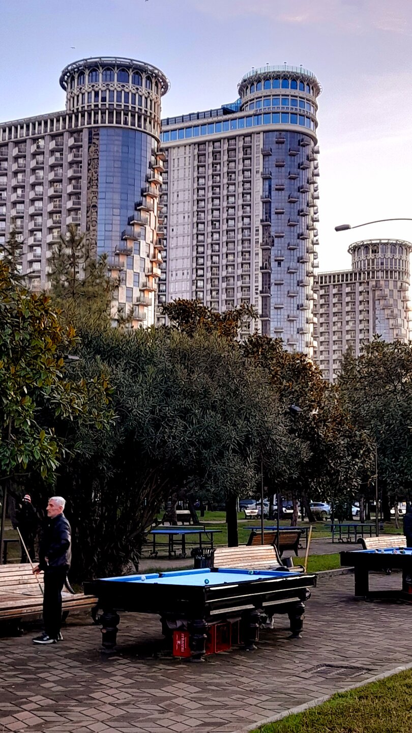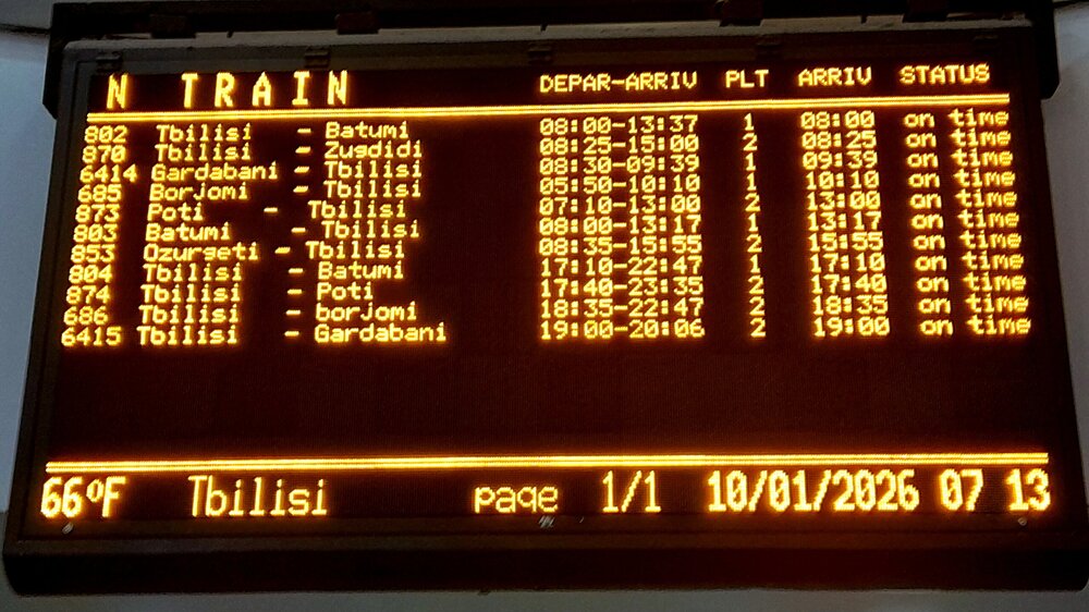ТБИЛИСИ - БАТУМИ. 10 января. Сегодня мне предстоит переезд из Тбилиси в Батуми, откуда я должен в 22 часа вылететь в Сочи. Решил до железнодорожного вокзала добраться на метро. Ведь у меня есть транспортная карта, которую мне всучили при подъеме канатной дорогой на Нарикалу. Правда на ней нет денег. В 7 часов утра кассирша в метро на станции Площадь Свободы на своём рабочем месте. Отдаю ей свою карту и 1 лари за одну поездку на метро. Без проблем, зачисляет. Прохожу турникет и спускаюсь. Через 3 остановки я выхожу. В вокзале заинтересовало расписание поездов. В интернете много устаревших данных, а здесь самая правильная версия (кроме вечерних поездов из Батуми и Зугдиди). На посадке - проверка билетов и документов. До Батуми ехать 5,5 часов. Для скоростного поезда 343 км между городами -это много. Почему так, я понял, когда от Хашури до аэропорта Кутаиси поезд шёл со скоростью около 30 км/час. Точной причины этого не знаю, возможно тоннели или перепад высот. Как провести время в Батуми, ведь до вылета у меня 8 часов ? Где оставить багаж? Наверно, в аэропорту. А как до него добраться? Транспортной батумской карты у меня нет. Но тут меня, наверно выручат пассажиры, заплатят за меня картой, а я отдам им наличку. И вот уже показалось Черное море. До Батуми осталось ехать минут 40. И тут у меня завибрировал телефон. Открываю сообщения. Читаю: вылет рейса WZ568 в Сочи 10.01.2026 изменён на 14.05 11.01.2026 Приносим свои извинения. Несколько минут сидел в шоке. В очередной раз Рэд Вингс (а до этого Азимут) меня "кидают". Я же так не успею вернуться домой и выйти вовремя на работу. К тому же надо отменять Ласточку из аэропорта Сочи и микроавтобус из Ростова-на-Дону. По приезду в Батуми, задержался в вокзале в надежде забронировать отель. Сумел зайти на вай-фай и нашёл в "Островке" свободное место в отеле Марани, где я уже провёл по прибытию три дня. Затем сел в подошедший автобус (хорошо, что открыты не только двери у водителя), узнал, доеду ли до Чавчавадзе и попросил пассажиров заплатить за меня картой, собираясь отдать 1 лари (точно стоимость проезда не знаю, где-то всего 0,3 лари). По прибытию в отель, встретил знакомого мне администратора. Выяснилось, что я не подтвердил бронирование на "Островке" (уже второй раз, в Краснодаре было тоже самое). Стоимость моего номера с 80 лари на агрегаторе упала до 70 лари у администратора отеля. Отлично, надо так почаще делать, отели дешевле выйдут. Заселяюсь в отель и пытаюсь отменить свои билеты из Сочи и Ростова. Автобус отменил, а вот РЖД отказалось отменять билет от запроса из заграницы! Проверил это со смартфона администратора отеля - тот же результат. Пришлось попросить сделать это сына (написав несколько возможных паролей, точный - не помнил). Ну а теперь можно покориться судьбе и ... наконец-то досмотреть в Батуми район "небоскрёбов". Только я вышел на прогулку из отеля, завибрировал смартфон. Читаю: вылет рейса WZ568 в Сочи изменён на 03.15 11.01.2026. Приносим свои извинения. То есть вылет состоится раньше на 11 часов, ближайшей ночью. Спрашивается, зачем я тогда бронировал отель, если в полночь надо выезжать в аэропорт. Про отсутствие билетов из Сочи до дома уже молчу, как-нибудь доберусь. А пока у меня есть вечер на прогулку по Батуми...