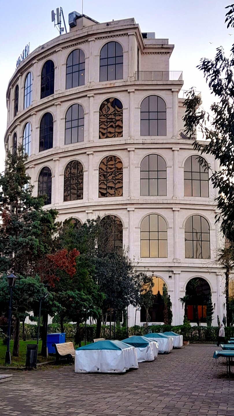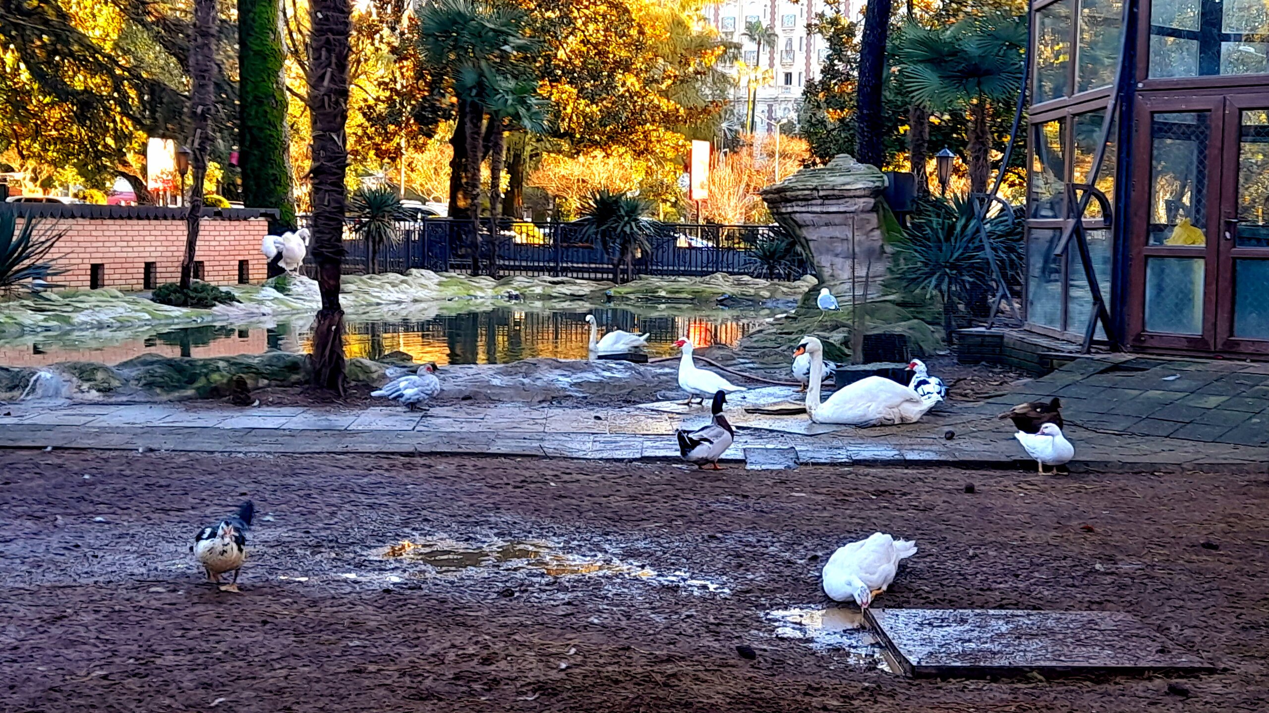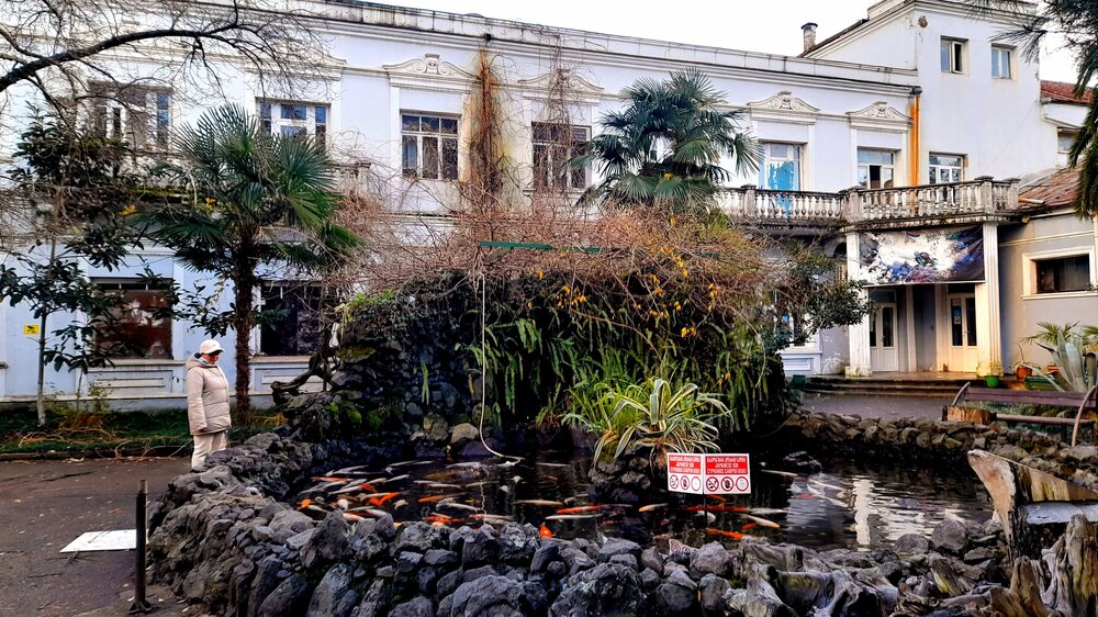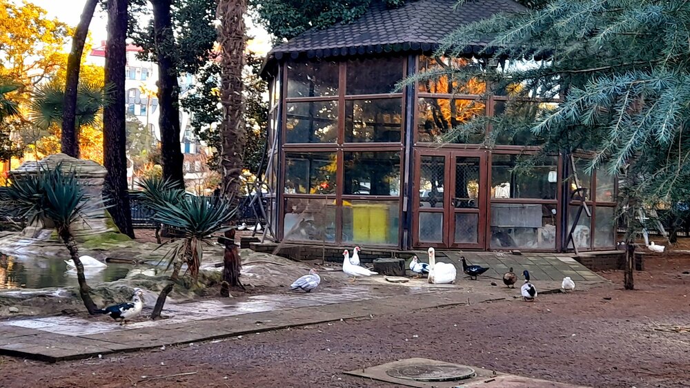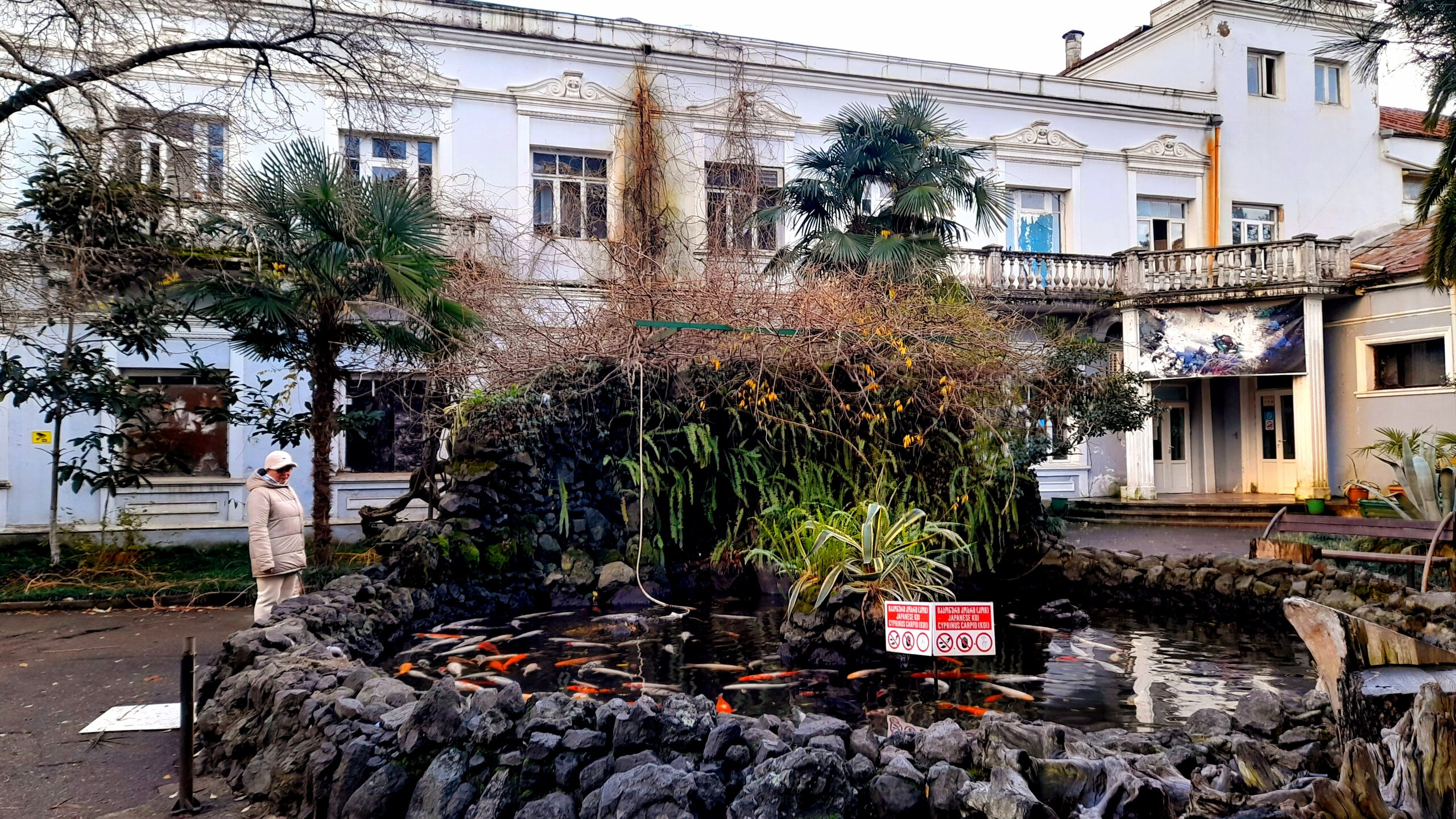 БАТУМИ. (продолжение). 10 января. Углубляюсь в Бульвар. Отличное место для отдыха. Летний театр - уникальное деревянное здание, построенное в 1949 году. Это, правда, точная копия сгоревшего в 90-х годах здания. Птичий зооуголок. Немного ухожу от моря и попадаю в парк "6 мая", расположенный на озере Нуригель. Еще одно тихое место для отдыха, водных прогулок в тёплое время года. Теперь уже высотки отелей Хилтон и Мариотт отменя справа. Выхожу из парка на здание дельфинария. Кроме дельфинов тут можно посмотреть морских котиков. Можно и самому поплавать с дельфинами, только дороговато будет. Еще один морской объект рядом - аквариум. Правда здание уже давно требует реконструкции. А перед ним бассейн с огромными рыбинами. Как же им здесь тесно. А за аквариумом находится Батумская морская академия (или мореходное училище). Вот я и вышел на город футуристичных архитектурных проектов, то ли на Манхэттен, то ли в Дубай.