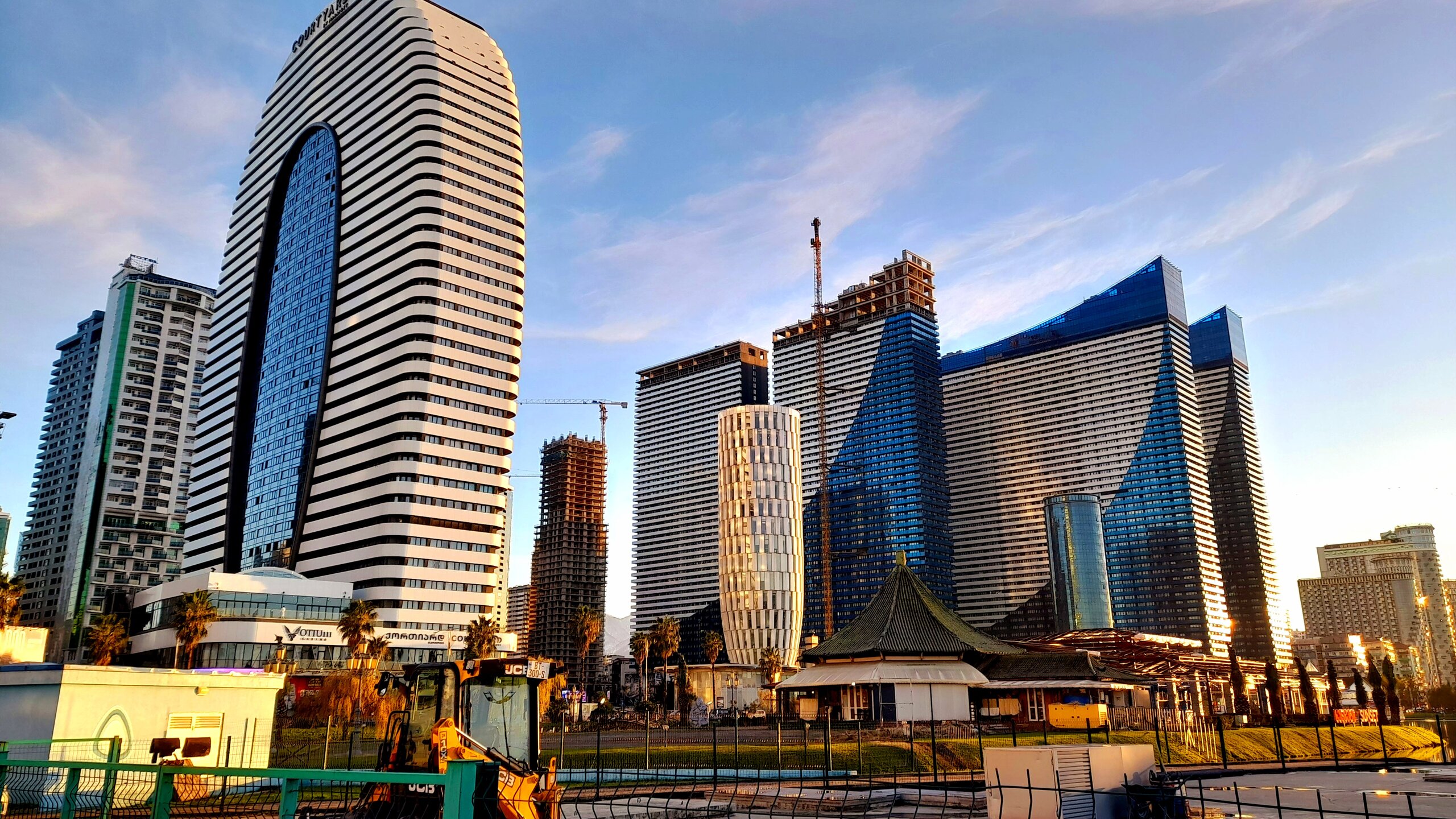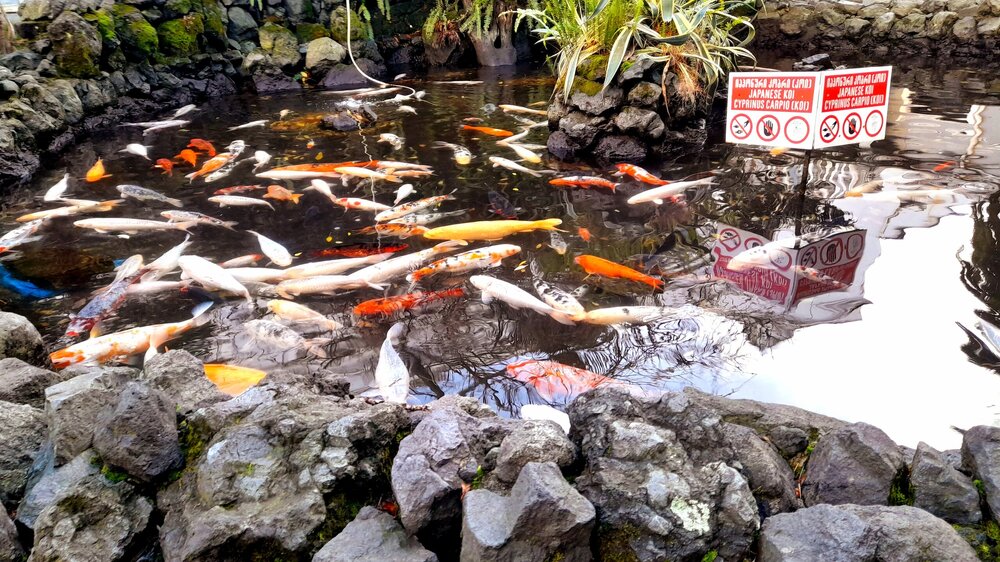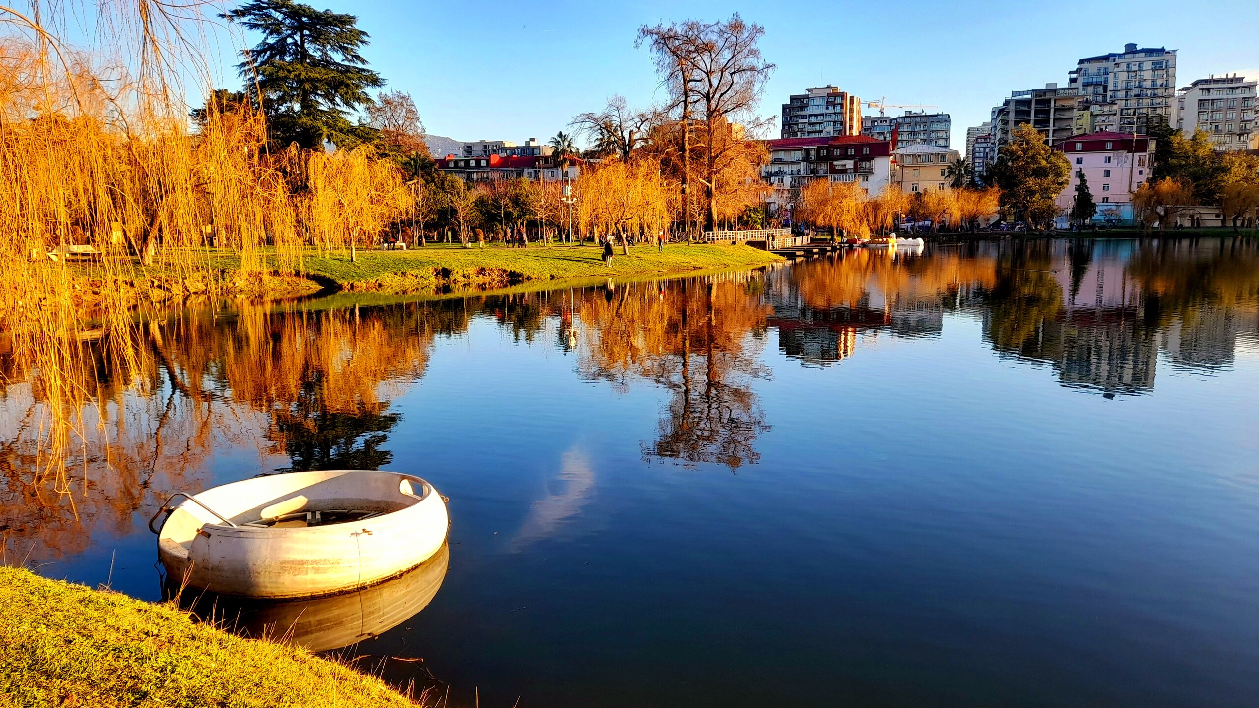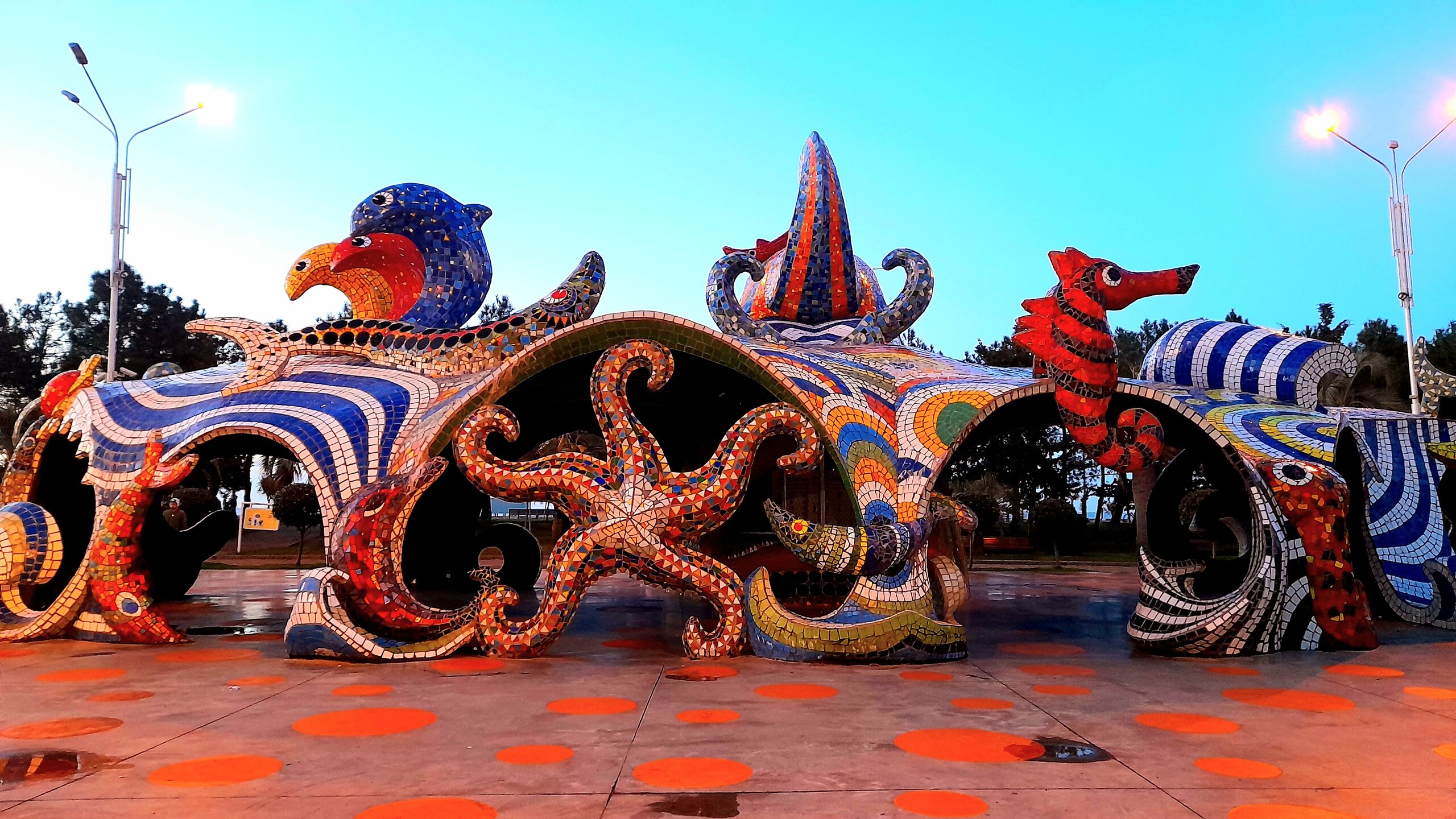 БАТУМИ. (продолжение). 10 января. Углубляюсь в Бульвар. Отличное место для отдыха. Летний театр - уникальное деревянное здание, построенное в 1949 году. Это, правда, точная копия сгоревшего в 90-х годах здания. Птичий зооуголок. Немного ухожу от моря и попадаю в парк "6 мая", расположенный на озере Нуригель. Еще одно тихое место для отдыха, водных прогулок в тёплое время года. Теперь уже высотки отелей Хилтон и Мариотт отменя справа. Выхожу из парка на здание дельфинария. Кроме дельфинов тут можно посмотреть морских котиков. Можно и самому поплавать с дельфинами, только дороговато будет. Еще один морской объект рядом - аквариум. Правда здание уже давно требует реконструкции. А перед ним бассейн с огромными рыбинами. Как же им здесь тесно. А за аквариумом находится Батумская морская академия (или мореходное училище). Вот я и вышел на город футуристичных архитектурных проектов, то ли на Манхэттен, то ли в Дубай.
