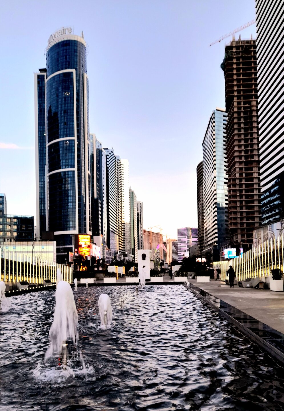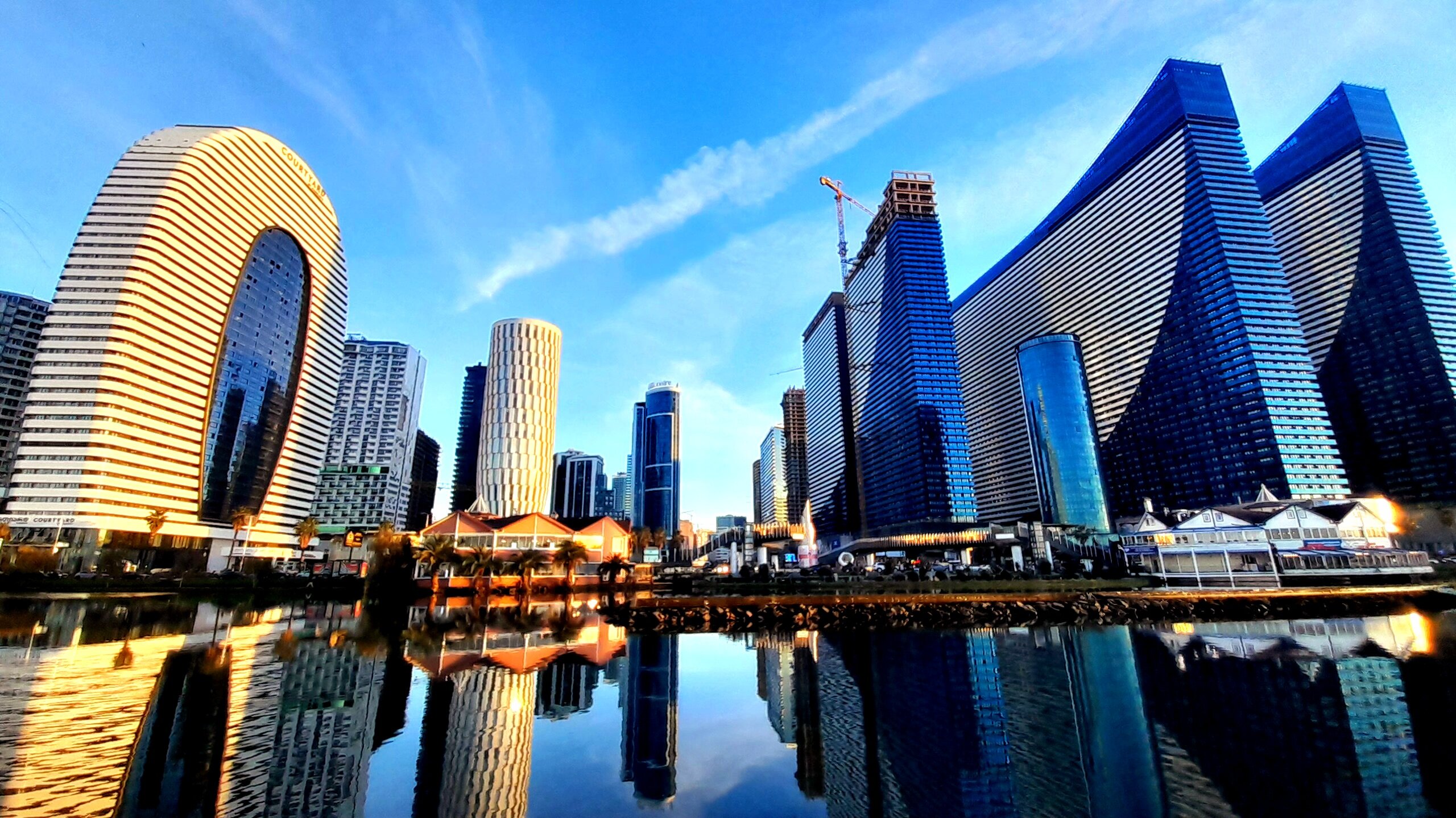БАТУМСКИЕ НЕБОСКРЁБЫ. 10 января. Это так называемый Новый Батуми, сколько уже построено, а сколько ещё строится. А перед ними озеро Ардагани, с маленькими островками и ведущими к ним мостиками. Ещё здесь есть танцующие светомузыкальные фонтаны, с наступлением темноты устраивающие яркие представления. Вот в этом (справа) апарт-отеле (этажей в 50) я планировал заселиться вечером 31 декабря. Может это и к лучшему, что не удалось, отсюда до центра города 30-40 минут ходьбы и наверно бурная ночная жизнь. Нет, это не Венеция, а "всего лишь" Дом юстиции в Батуми. Ну вот, наконец-то и в другую сторону, на море посмотрел. Тут люди слушают прибой, рассматривают камешки, встречают закат солнца. " Застройка у озера Ардагани напоминает Лас-Вегас в миниатюре. Здесь и "голландский" домик с ветряной мельницей, "итальянская"башня, "колизей", "древнегреческий храм", перевёрнутый дом-ресторан. Ну а теперь можно и обратно поворачивать, по вечернему Батуми погулять.