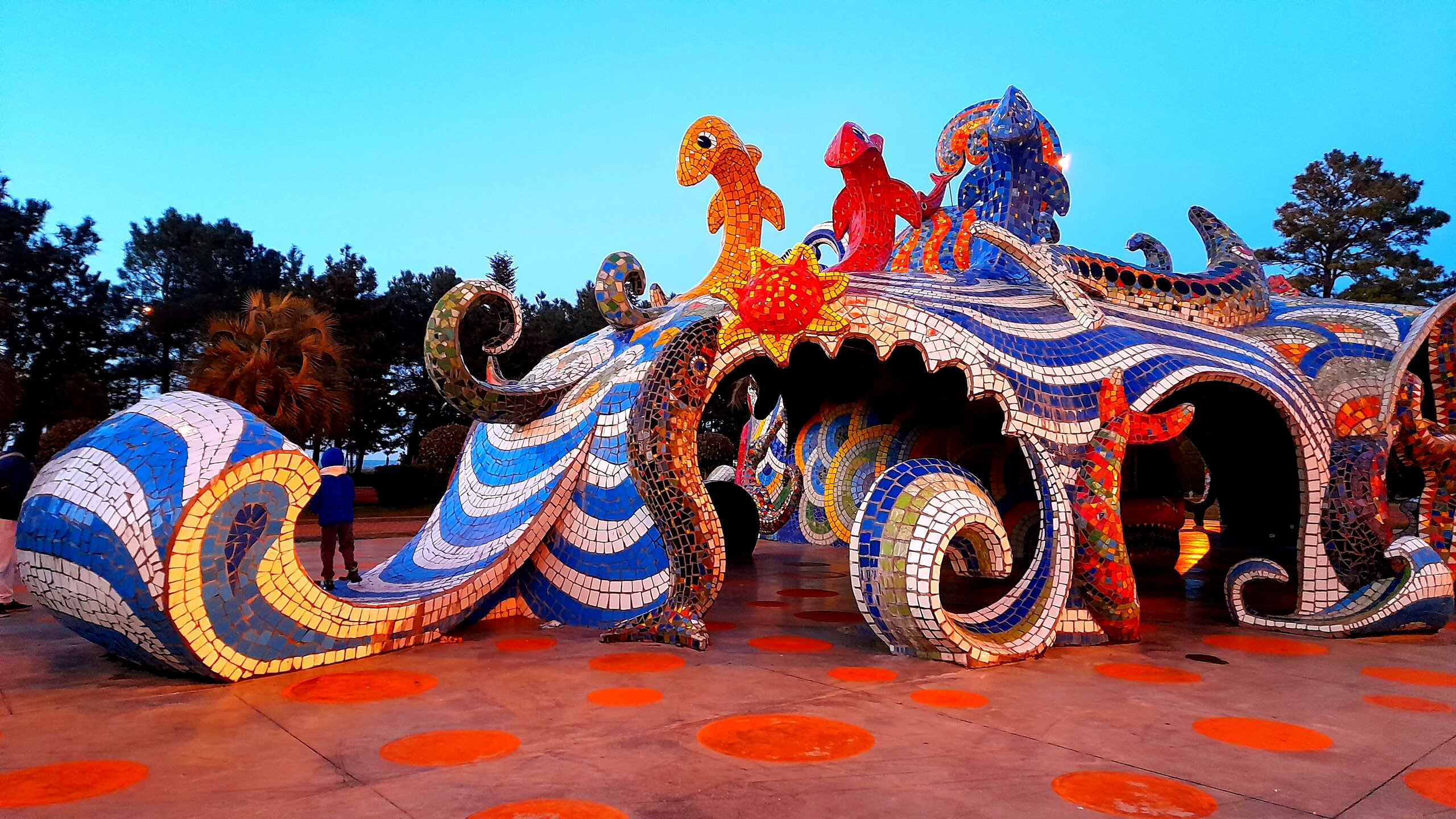 ВЕЧЕРНИЙ БАТУМИ. 10 января. Снова оказываюсь на Бульваре и подошёл к мозаичному кафе "Фантазия" (в стиле Гауди) или Осьминог, как в фильме "Любовь и голуби", на фоне которого Раиса Захаровна и Василий "обрели друг друга". А это что за такое красивое здание? Батумский университет, оказывается. Прохожу мимо японского садика. Ярко светится Колоннада на Бульваре. И площадь Европы - в яркой подсветке. А это площадь Пьяцца (простите за тавтологию). Красиво. Только есть большая разница с 1 и 2 января - нет людей. Все туристы, наверно, уже улетели домой. Один я задерживаюсь с вылетом. Прихожу в отель, договариваюсь с администратором сразу после полуночи вызвать такси в аэропорт. Зажужжал смартфон. Открываю сообщение. Вылет рейса WZ568 в Сочи 10.01.2026 изменен на 11.50 11.01.2026 Приносим свои извинения. Ну и черт с вами, хоть нормально посплю сегодня. И через полчаса снова сообщение. Вылет рейса WZ568 10.01.2026 в Сочи изменен на рейс WZ578 11.50. Приносим свои извинения. Казалось бы одно и то же, какая разница, какой номер рейса. Ложусь спать,чтобы в 9 часов утра вызвать такси в аэропорт Батуми. На ночь в смартфоне включаю режим "не беспокоить". Поставил будильник на 8 часов утра. Утром заглядываю на всякий случай в сообщения. А там их даже три. Нет, самолёт не улетел без меня. Но все они на одну тему: Уважаемый пассажир, информируем об изменении аэропорта вылета. В связи с неблагоприятными метеоусловиями а/п Батуми, аэропорт вылета рейса WZ-578 11.01.2026 изменен на а/п Кутаиси. Время вылета 11.50. Отправка будет осуществляться автобусами из а/п Батуми в 10.00 (время местное). Приносим свои извинения. Какие 11.50, какой Кутаиси, если до него только два часа на автобусе ехать. Далее было всё по плану, в Батуми стоял штиль, но именно в аэропорту был сильный ветер, нас действительно отвезли в аэропорт Кутаиси. Приехали мы уже после 12 часов. На табло у стоек регистрации написано, что регистрация на рейс WZ-578 завершена. Потом всё же нас стали регистрировать на двух стойках (информации о продлении регистрации не было). Похоже, авиакомпании надо было скрыть все эти задержки с вылетом, чтобы не столкнуться с финансовыми исками пассажиров. В 13.40 мы вылетели, чтобы в 13.15 приземлиться в Сочи (между городами час разницы по времени). Паспортный контроль и получение багажа прошли быстро. Так, что я успевал на электричку в 14.02 из аэропорта Сочи до Туапсе. Наконец-то зашёл на сайт РЖД посмотреть, чем же мне добираться до дома. Билеты - по 9-10 тысяч рублей. Для интереса посмотрел их же из Туапсе. Оказалось где-то на 600 рублей дешевле. Поеду-ка я в Туапсе, спонтанно принял решение за 10 минут до отправления электрички, тем более надо было успокоиться, посмотреть город, в котором раньше не был. У меня на это было более трёх часов. А в Сочи я уже весь центр исходил, никаких новых впечатлений. Только не учёл я, что в Туапсе к этому времени стемнело, пошёл мелкий дождик, да и рассмотреть там в темноте было что-либо трудно. Так что главы про Туапсе здесь не будет (хотя и там у меня есть фотки) и на этом моё новогоднее путешествие по Грузии буду считать завершенным. P.S. Только вот что-то захотелось туда вернуться в более тёплое время, особенно в её западную часть и досмотреть то, что не удалось увидеть сейчас.