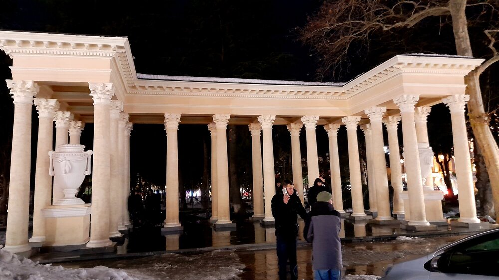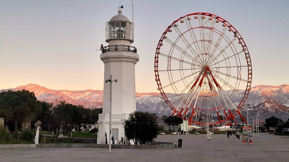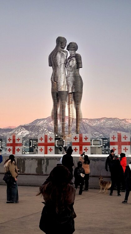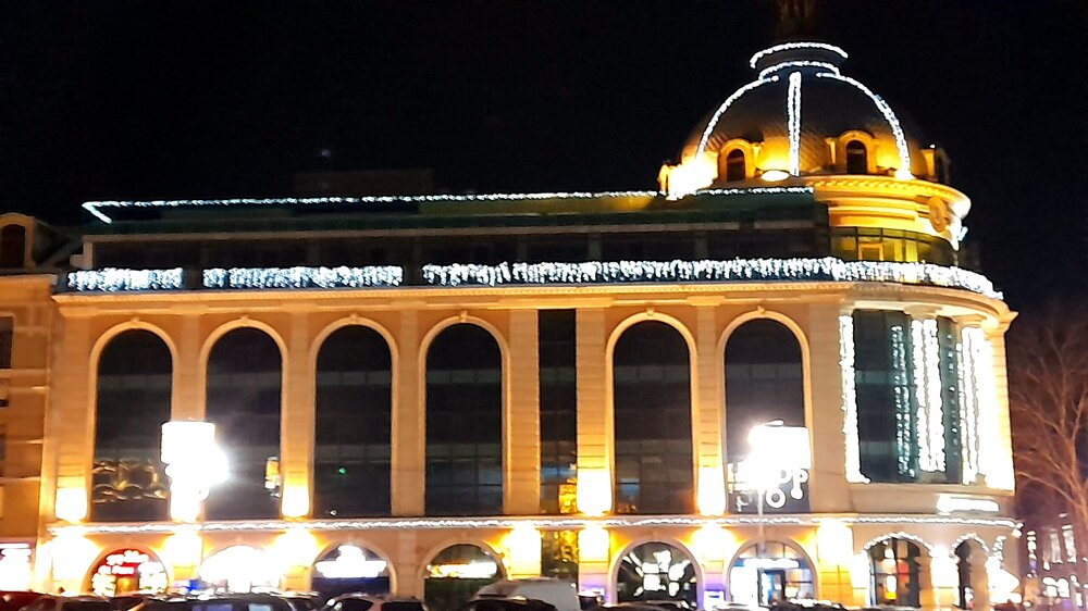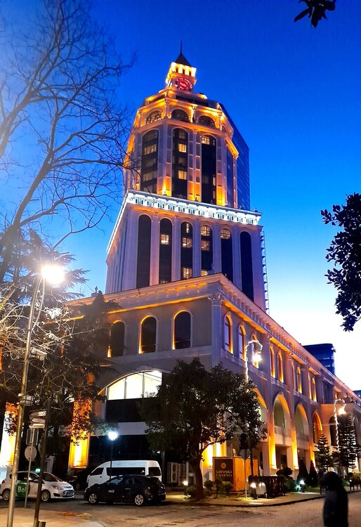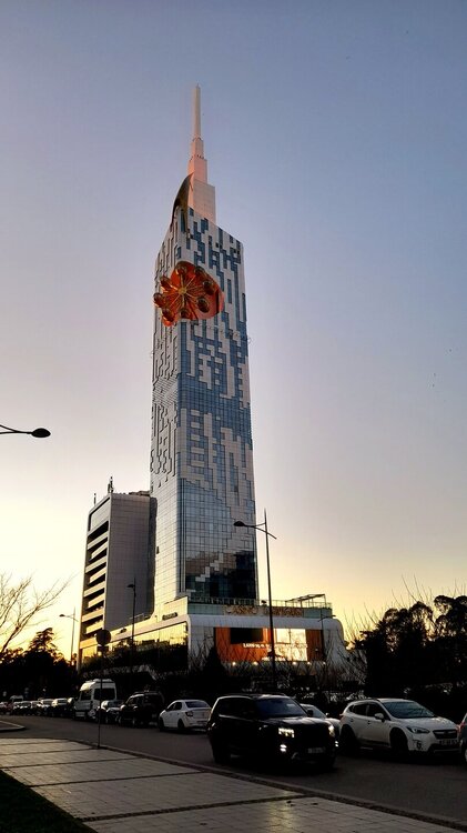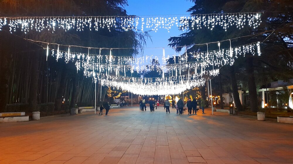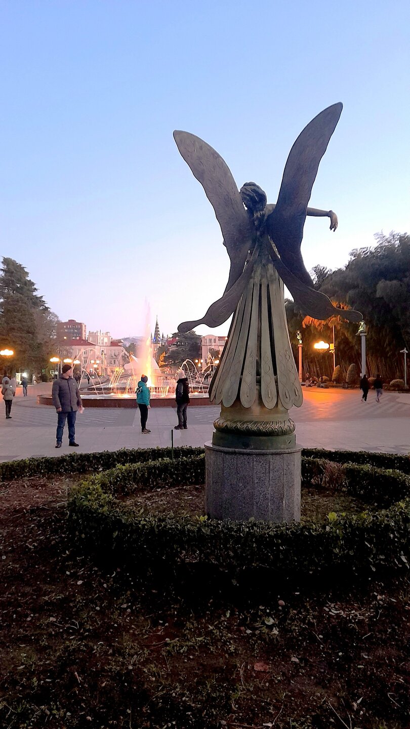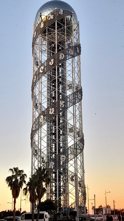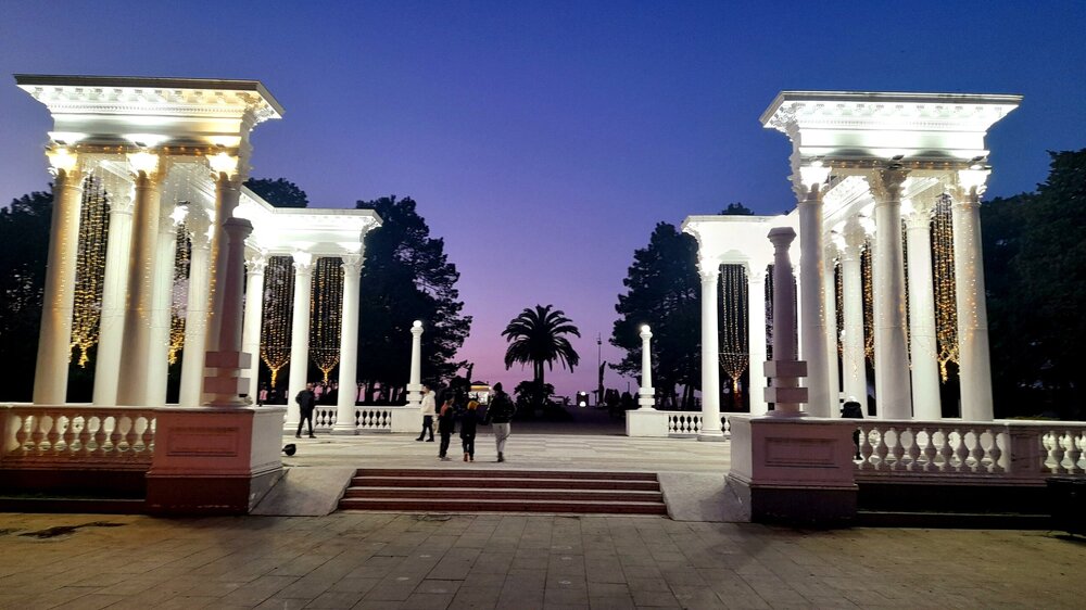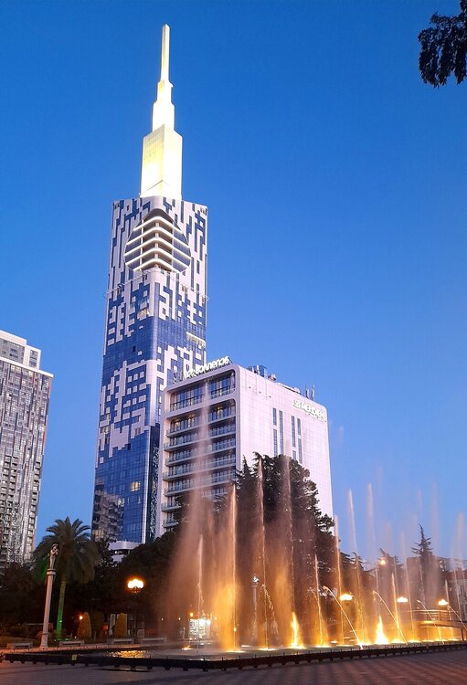 ВЕЧЕРНЯЯ ПРОГУЛКА ПО БАТУМИ. (продолжение) 2 января. Направляюсь на набережную Батуми или Батумский бульвар. Поражают высоченные отели, как этот Radisson Или эта батумская башня Le Meridien Batumi с казино Empire. Самое высокое здание в центре Батуми. На одном из верхних этажей в него встроено колесо обозрения ! Вечером шпиль этого здания меняет цвет подсветки, очень красиво. К тому же оно хорошо видно практически из любого места центра Батуми. А Ну а теперь подхожу к Алфавитной башне, маяку, колесу обозрения, которые я вчера прошёл с наступлением темноты под аккомпанемент дождя. Ну и к скульптурам Али и Нино подошёл. Далее выхожу на Бульвар, зелёный участок между морем высотными застройками, наподобие показанных выше. Начинает темнеть, и я углубляюсь в парковую зону Бульвара. На главной площади Бульвара - скульптура "Танцующая фея" и светомузыкальные фонтаны. А вот и видеофрагмент работы светомузыкальных фонтанов. 20260102_181338.mp4 Подхожу к торжественной колоннаде. Одна из достопримечательностей Бульвара - уникальное деревянное здание Летнего театра. В парке есть шахматный клуб, теннисный корт и спортивные площадки, но их лучше смотреть при дневном свете. А сейчас любуюсь красотой парка в свете тысяч лампочек подсветки. Дохожу до Шератон отеля с очередным казино. Возвращаюсь на площадь Европы, спустя немногим более часа. В ярких огнях площадь заиграла новыми красками, количество её посетителей кратно увеличилось. Пора и отдохнуть. Возвращаюсь в отель, по пути уже знакомый мне кафедральный собор. За день пройдено 31376 шагов (около 22 км). Насыщенный событиями день. Завтра - снова выездная экскурсия (на этот раз - групповая).