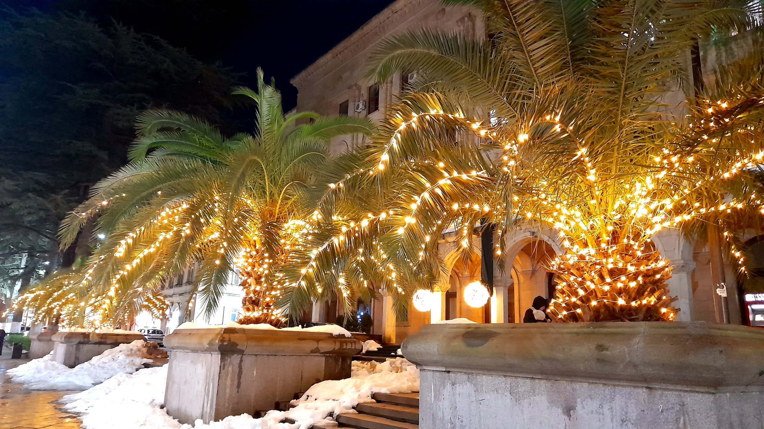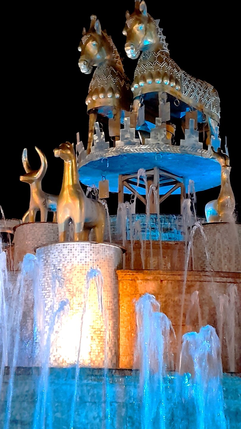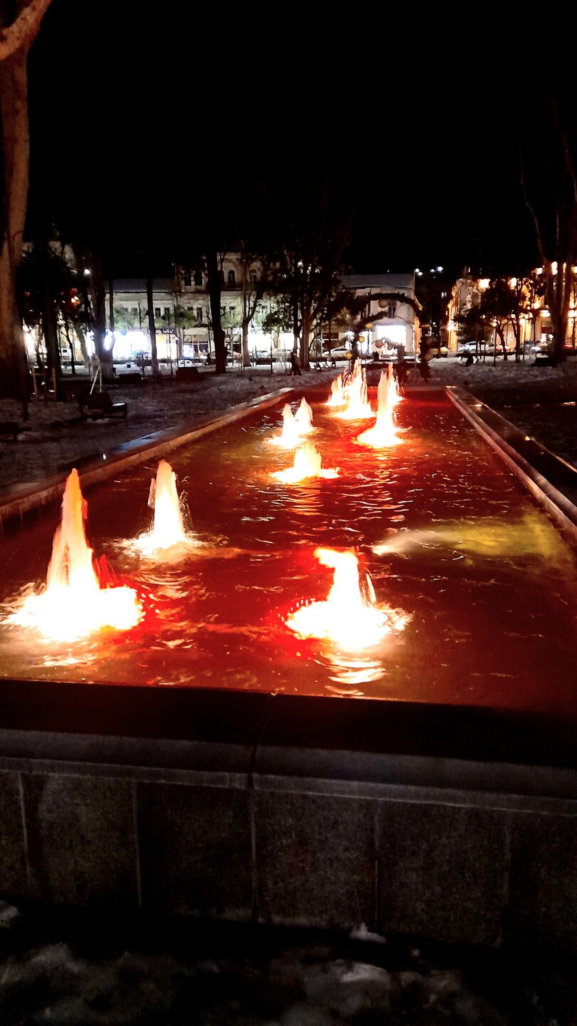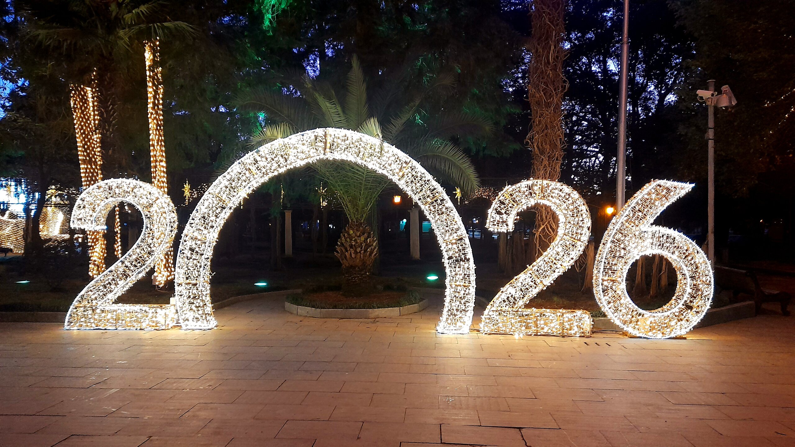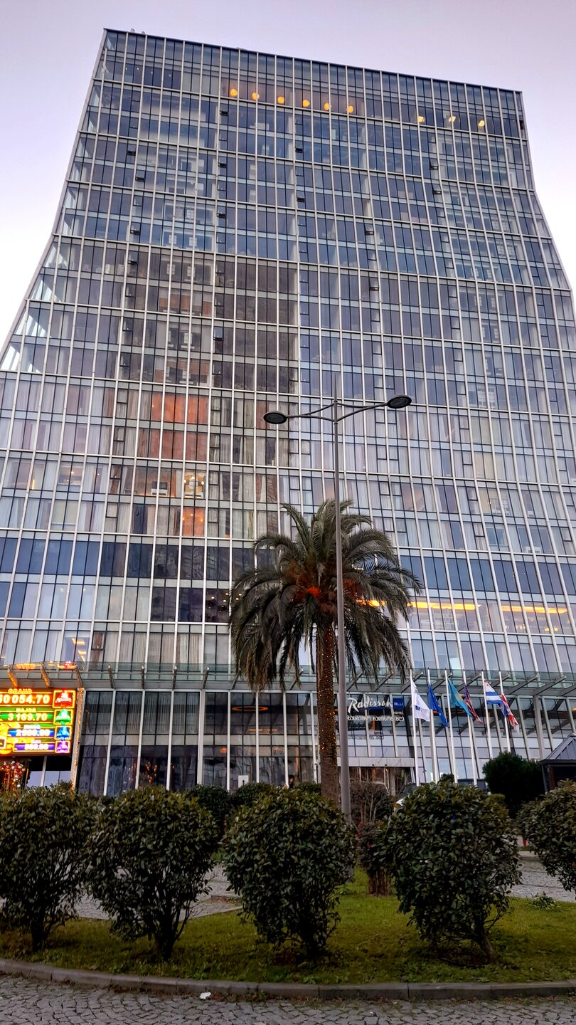 ВЕЧЕРНЯЯ ПРОГУЛКА ПО БАТУМИ. (продолжение) 2 января. Направляюсь на набережную Батуми или Батумский бульвар. Поражают высоченные отели, как этот Radisson Или эта батумская башня Le Meridien Batumi с казино Empire. Самое высокое здание в центре Батуми. На одном из верхних этажей в него встроено колесо обозрения ! Вечером шпиль этого здания меняет цвет подсветки, очень красиво. К тому же оно хорошо видно практически из любого места центра Батуми. А Ну а теперь подхожу к Алфавитной башне, маяку, колесу обозрения, которые я вчера прошёл с наступлением темноты под аккомпанемент дождя. Ну и к скульптурам Али и Нино подошёл. Далее выхожу на Бульвар, зелёный участок между морем высотными застройками, наподобие показанных выше. Начинает темнеть, и я углубляюсь в парковую зону Бульвара. На главной площади Бульвара - скульптура "Танцующая фея" и светомузыкальные фонтаны. А вот и видеофрагмент работы светомузыкальных фонтанов. 20260102_181338.mp4 Подхожу к торжественной колоннаде. Одна из достопримечательностей Бульвара - уникальное деревянное здание Летнего театра. В парке есть шахматный клуб, теннисный корт и спортивные площадки, но их лучше смотреть при дневном свете. А сейчас любуюсь красотой парка в свете тысяч лампочек подсветки. Дохожу до Шератон отеля с очередным казино. Возвращаюсь на площадь Европы, спустя немногим более часа. В ярких огнях площадь заиграла новыми красками, количество её посетителей кратно увеличилось. Пора и отдохнуть. Возвращаюсь в отель, по пути уже знакомый мне кафедральный собор. За день пройдено 31376 шагов (около 22 км). Насыщенный событиями день. Завтра - снова выездная экскурсия (на этот раз - групповая).