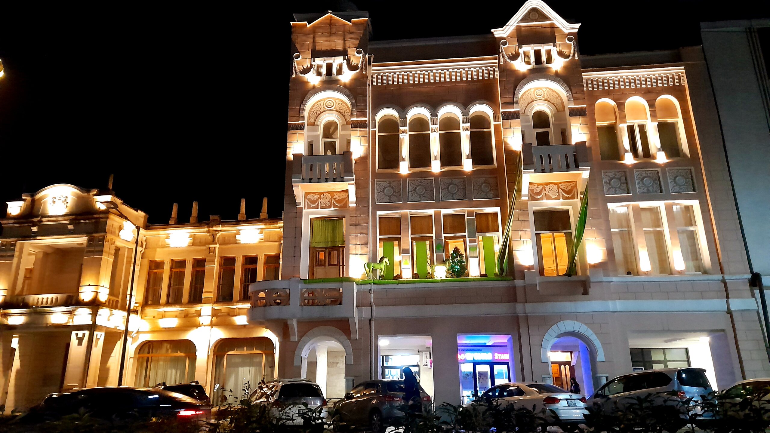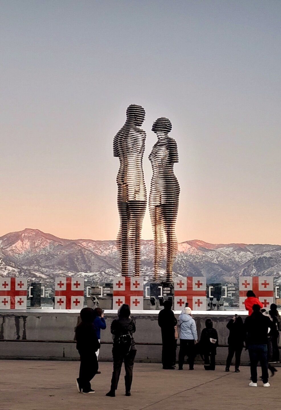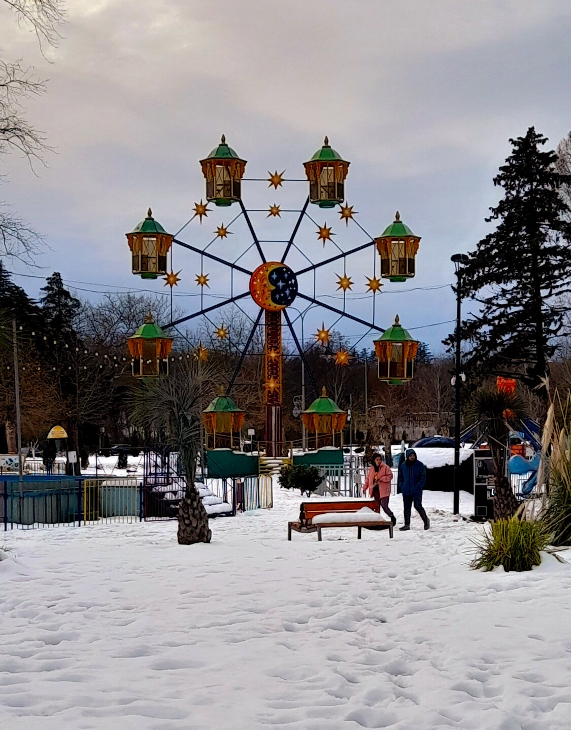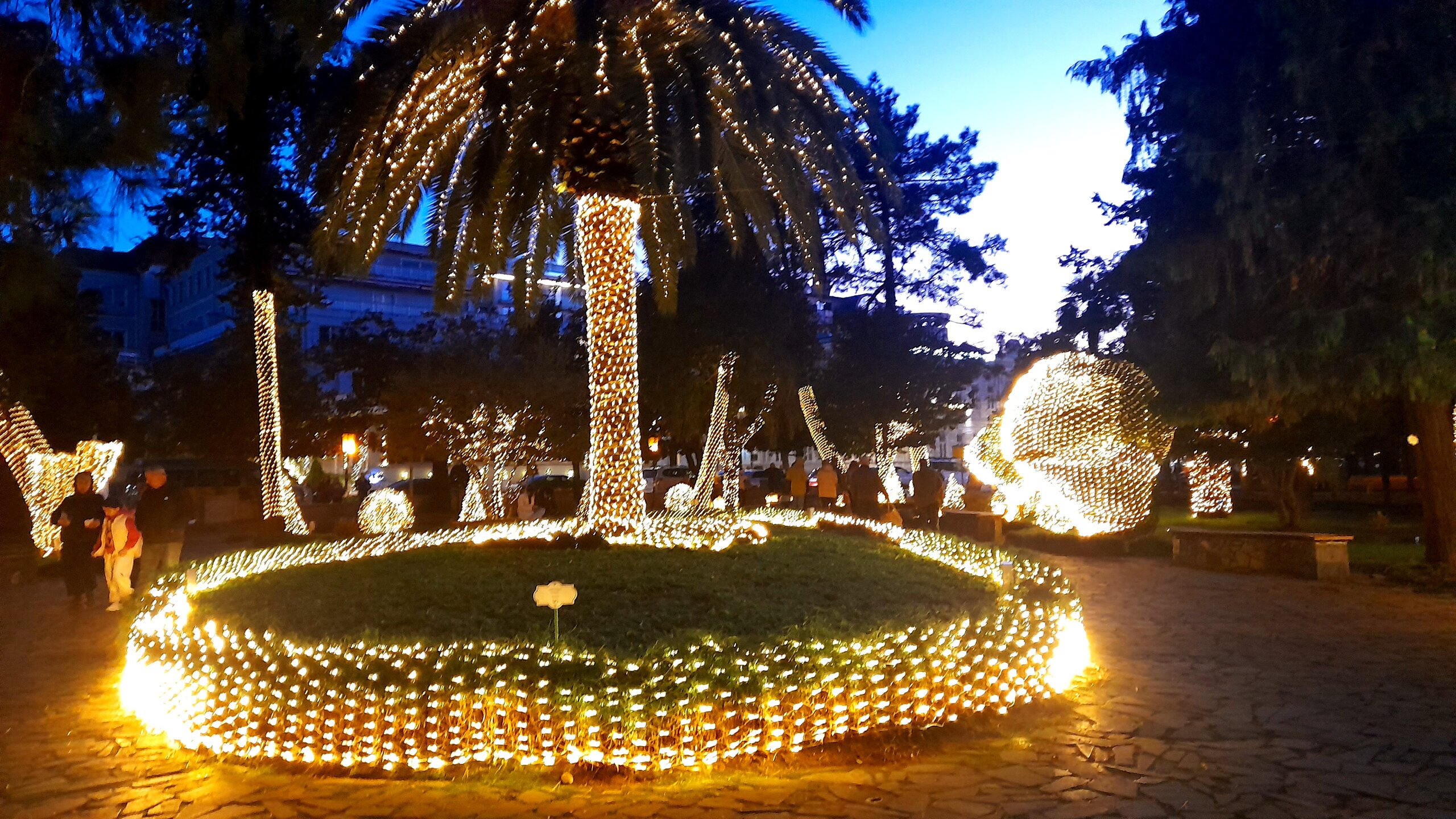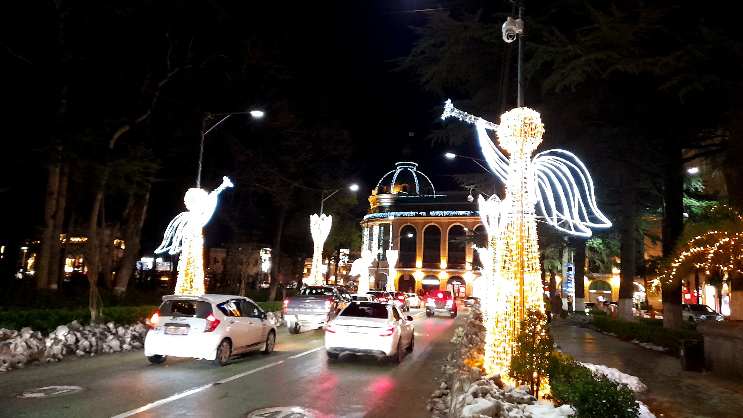 ВЕЧЕРНЯЯ ПРОГУЛКА ПО БАТУМИ. (продолжение) 2 января. Направляюсь на набережную Батуми или Батумский бульвар. Поражают высоченные отели, как этот Radisson Или эта батумская башня Le Meridien Batumi с казино Empire. Самое высокое здание в центре Батуми. На одном из верхних этажей в него встроено колесо обозрения ! Вечером шпиль этого здания меняет цвет подсветки, очень красиво. К тому же оно хорошо видно практически из любого места центра Батуми. А Ну а теперь подхожу к Алфавитной башне, маяку, колесу обозрения, которые я вчера прошёл с наступлением темноты под аккомпанемент дождя. Ну и к скульптурам Али и Нино подошёл. Далее выхожу на Бульвар, зелёный участок между морем высотными застройками, наподобие показанных выше. Начинает темнеть, и я углубляюсь в парковую зону Бульвара. На главной площади Бульвара - скульптура "Танцующая фея" и светомузыкальные фонтаны. А вот и видеофрагмент работы светомузыкальных фонтанов. 20260102_181338.mp4 Подхожу к торжественной колоннаде. Одна из достопримечательностей Бульвара - уникальное деревянное здание Летнего театра. В парке есть шахматный клуб, теннисный корт и спортивные площадки, но их лучше смотреть при дневном свете. А сейчас любуюсь красотой парка в свете тысяч лампочек подсветки. Дохожу до Шератон отеля с очередным казино. Возвращаюсь на площадь Европы, спустя немногим более часа. В ярких огнях площадь заиграла новыми красками, количество её посетителей кратно увеличилось. Пора и отдохнуть. Возвращаюсь в отель, по пути уже знакомый мне кафедральный собор. За день пройдено 31376 шагов (около 22 км). Насыщенный событиями день. Завтра - снова выездная экскурсия (на этот раз - групповая).