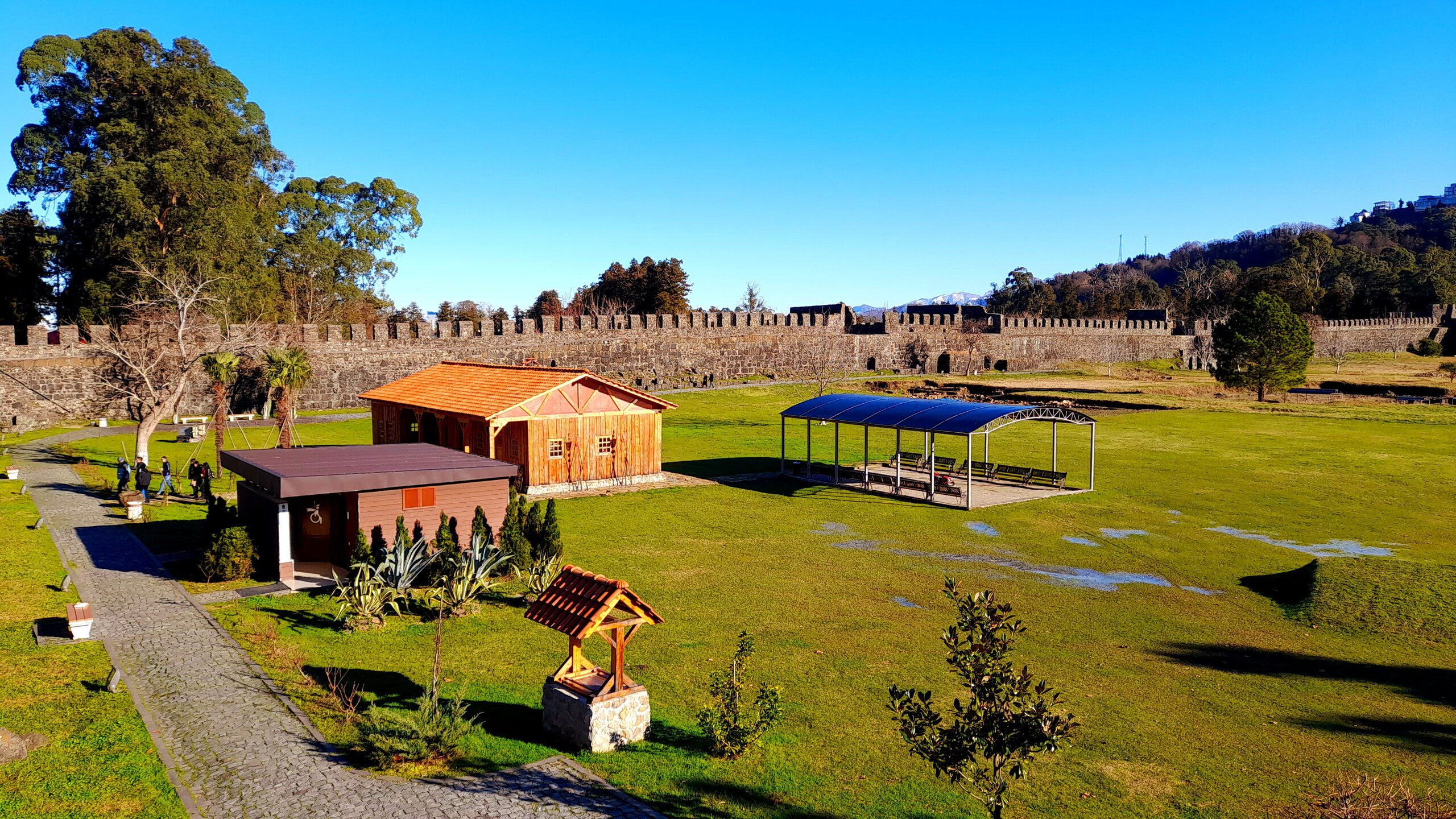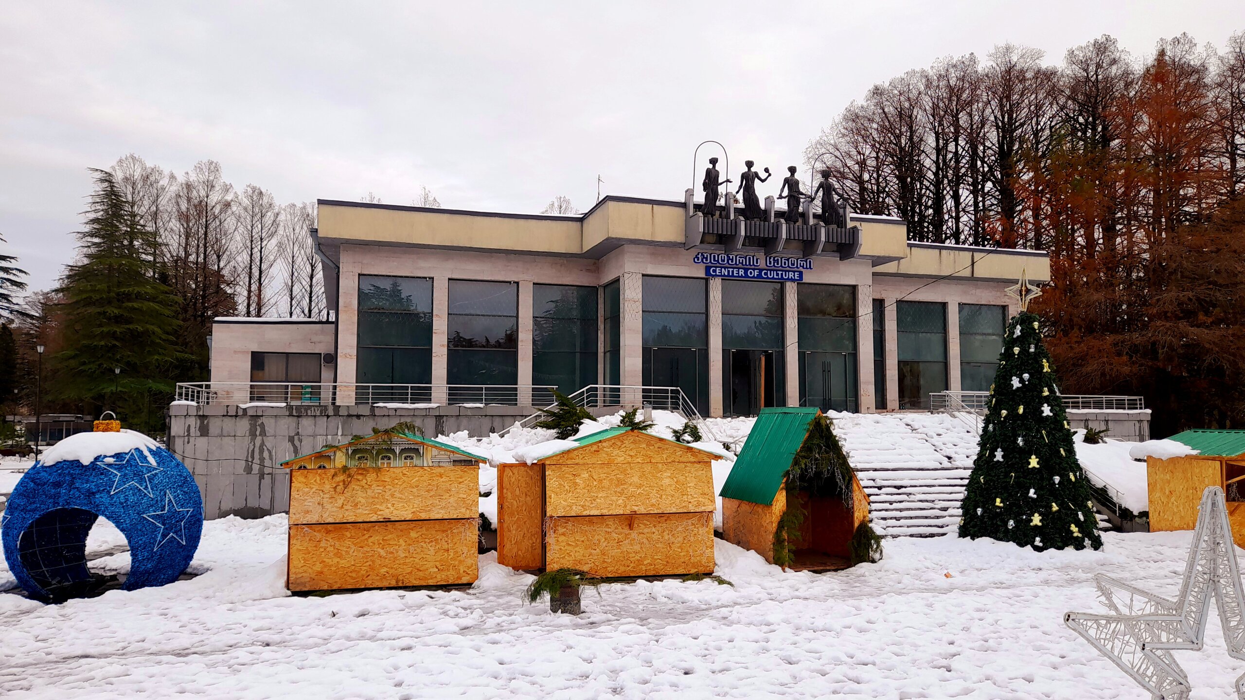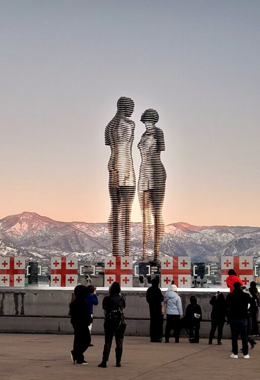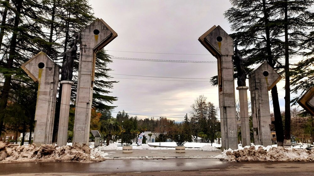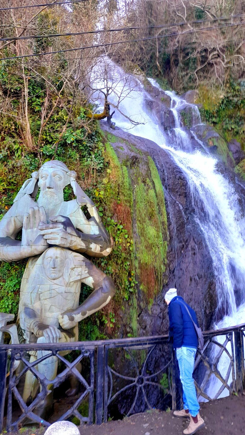 ШЕКВЕТИЛИ. ПАРК МУЗЫКАНТОВ. 2 января. Подъезжаем к Парку грузинских миниатюр. Ради посещения этого парка я и затеял сегодняшнюю автомобильную экскурсию. В неё - уменьшенные копии 58 главных архитектурных памятников страны. Я ранее уже был в аналогичных парках (швейцарских, голландских и других) миниатюр и мне они очень понравились. На автомобильную стоянку нас не пускают - парк закрыт ! Как сказали охранники - у кассира сегодня выходной ! В Грузии, оказывается 1 и 2 января считаются Новогодними праздниками, я читал про это, но не ожидал такого подвоха. Во всех источниках пишется про ежедневную (без выходных) работу парков. Через 5 км останавливаемся у Парка Музыкантов. Он ничем не огорожен, вход бесплатный, круглосуточный. Вот уж не ожидал получить огромное удовольствие от посещения этого парка. В парке более 50 скульптур легендарных исполнителей, над каждым размещён динамик, из которого льётся музыка или песня этого исполнителя. Причем можно, остановившись, прослушать несколько разных его произведений. Мой любимый Элтон Джон. Задержался послушать. 20260102_140023.mp4 Иду дальше. Останавливаюсь послушать и этих исполнителей. Послушаем Уитни Хьюстон 20260102_131533.mp4 И Элвиса Пресли послушаем тоже. 20260102_131654.mp4 Ну и как не остановиться около Битлов! 20260102_132328.mp4 Различные пеньки идут в дело, из них создают сказочные фигуры в парке. Не забыты и выдающиеся композиторы прошлого: Моцарт, Бах, Бетховен В Парке Музыкантов представлено более 10 скульптур грузинских исполнителей. Большинство из них не известны мне, поэтому их пропускаю. Парк завершается Black Sea Arena - концертным залом. Интересны в парке и различные фигуры, созданные из деревьев и скворечники (никогда не видел столько на одном дереве). Выхожу из парка в удивлении и восхищении увиденным. Остаётся посмотреть дендропарк (с плавающими в пруду фламинго). И вновь закрыто! Даже бесплатный парк закрыт! Но поскольку он охраняется и имеет конкретные часы работы, закрывается. Праздник и всё тут! Из всего неудавшегося надо искать хоть какую-то пользу. А польза в том, что у меня появилось дополнительное время по приезду в Батуми на осмотр города и подъем на канатной дороге. Билет на автобус я тоже купил, меня привезли на автовокзал, а потом мы попрощались неподалеку от канатной дороги Арго.