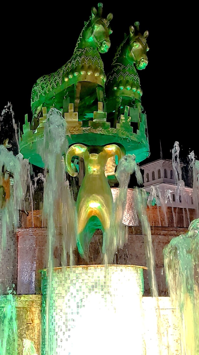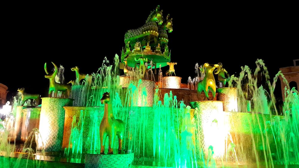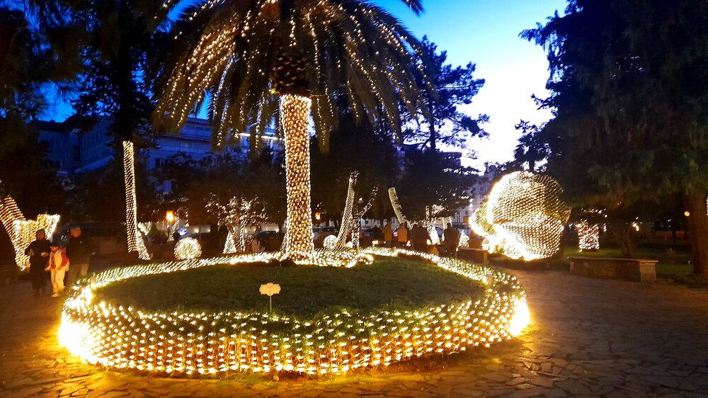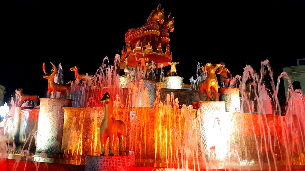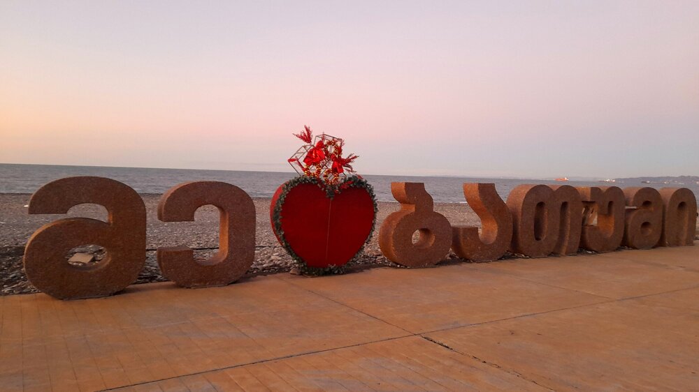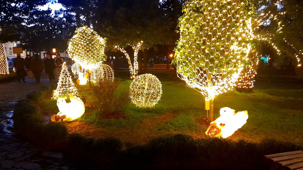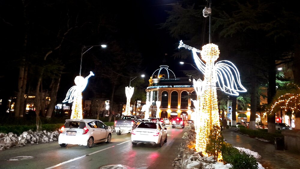 ВЕЧЕРНЯЯ ПРОГУЛКА ПО БАТУМИ. 2 января. Вчера из-за дождя моя вечерняя прогулка завершилась досрочно. Сегодня появилась возможность продолжить ознакомление с достопримечательностями города. Начну с греческой церкви Святого Николая, мимо которой я вчера прошёл при выходе с площади Пьяцца. Её красно-полосатый облик привлекает внимание. Построена она была понтийскими греками, которых в XIX веке в Батуми было очень много. Далее направляюсь на площадь Европы, место притяжения как туристов, так и местного населения. Сегодня - продолжение празднования Нового Года, на площади много семей с детьми. При входе на площадь - памятник М. Абашидзе, политическому деятелю, в честь него названа улица, фонтан и интересные здания. Башня с астрономическими часами и золочёными скульптурами показывает фазы Луны, положение солнца, зодиакальный календарь. Настоящее инженерное чудо. В центре площади Европы возвышается статуя Медеи с золотым руном. По легенде, именно в Колхиде, западной Грузии, аргонавты во главе с Ясоном нашли священное руно, а Медея, дочь царя Эета, помогла завладеть им. Очень красивы и другие строения на площади Европы. Ну и конечно, на радость детишкам - новогодняя ёлка. Перехожу на соседнюю площадь с памятником Нептуну. Точно такой же стоит в Болонье, только батумский ещё и в золоте. На этой площади расположен Батумский драматический театр имени И. Чавчавадзе. А что это там за звери у лестниц? Похожи на львов, только в китайском стиле. а с обратной стороны театра - скульптура и самого И. Чавчавадзе. Ну а теперь пора направиться на набережную Батуми...