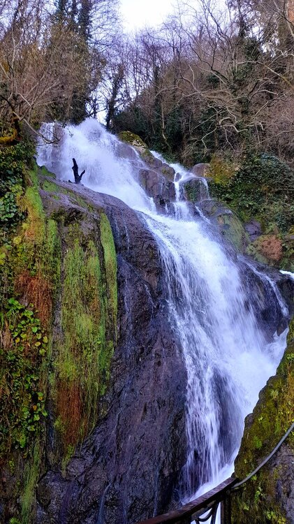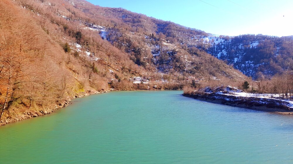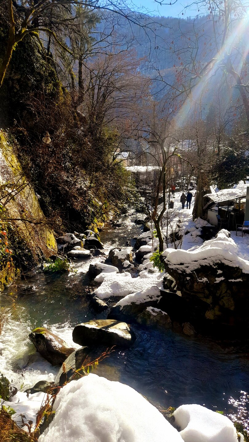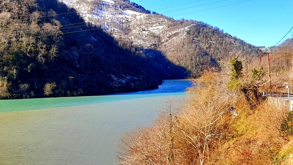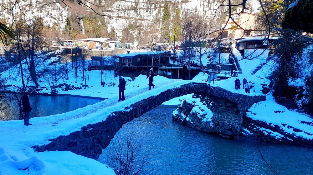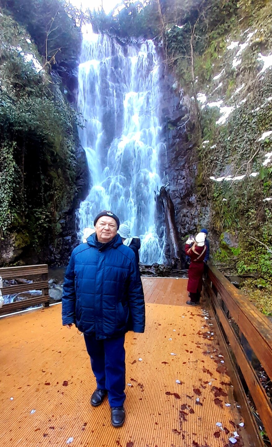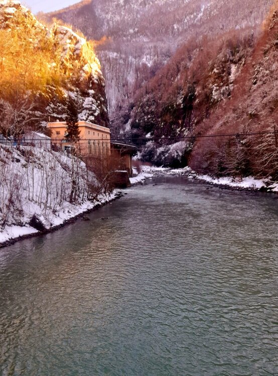 ГОРНАЯ АДЖАРИЯ. часть 2-я. 3 января. Поднимаемся в горы вдоль русла реки Чорох. Делаем остановку на месте впадения в неё реки Аджарисцкали. Виден водораздел мутных вод Аджарисцкали и бирюзовых вод Чороха. Поднимаемся ещё выше и останавливаемся у самого популярного у туристов, 30-метрового водопада Махунцети. Какой красавец! К водопаду оборудована тропа, вокруг которой ведётся оживлённая торговля мёдом, чурчхелой и вареньем. Я кроме традиционного магнитика приобрёл стаканчик жареных каштанов и глинтвейна. А всего в 500 метрах от водопада расположен старинный каменный мост, соединяющий берега Аджарисцкали. Как и всё древнее и таинственное, в Грузии называют именем царицы Тамары. Вот и арочный мост в Махунцети назван её именем. Его длина 29 метров, высота 6 метров. Я прошёлся по нему в обе стороны. Подробнее об этом старинном сооружении IX-X века можно почитать на демонстрационном стенде А вы обратили внимание на снег? Именно он стал преградой к подъему в национальный парк Мачахела, а также к грузинскому застолью в горах. А я дождя боялся! Продолжаем наше путешествие по Горной Аджарии и направляемся к ещё одному водопаду Мирвети. Надо по мостику перейти реку Чорох, пройтись по деревне около километра, и уже за поворотом показался ещё один аджарский красавец! Ну а грузинское застолье у нас всё же состоялось. Наш гид (и водитель минивэна) Давит договорился о проведения застолья в горном селе в грузинской семье своей родственницы. Столы ломились от аджарских и грузинских национальных блюд (сациви, хинкали, хачапури по-аджарски) , вина, чачи. Сколько было сказано тёплых, душевных тостов! А напоследок, уже с наступлением темноты, он нас завёз в заброшенный мандариновый сад и дал нам 15 минут на его "разграбление". Я даже домой привёз эти мандарины, очень вкусные.