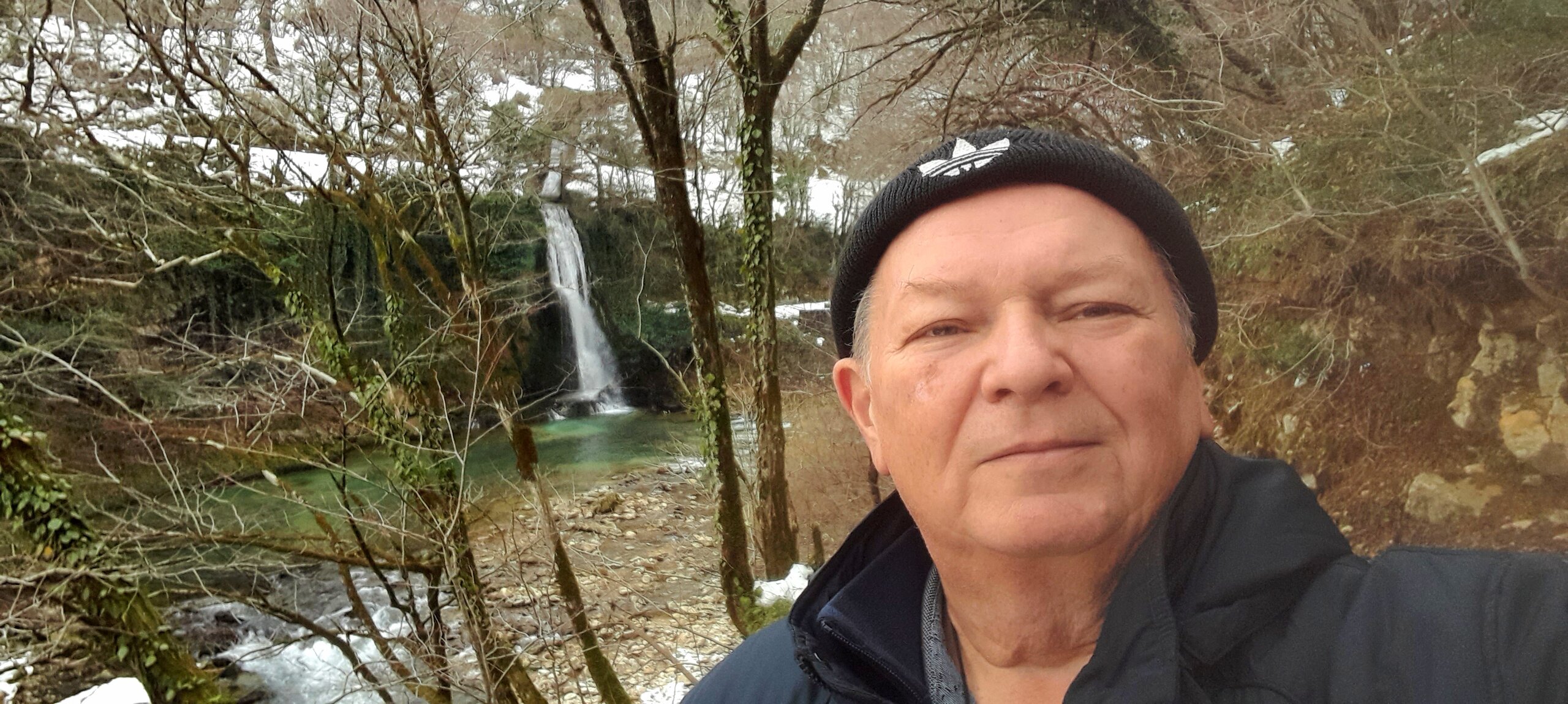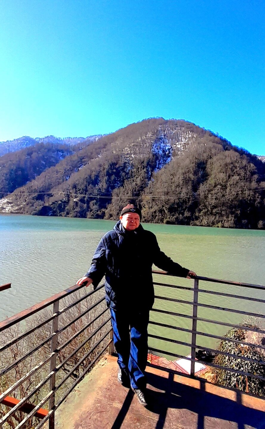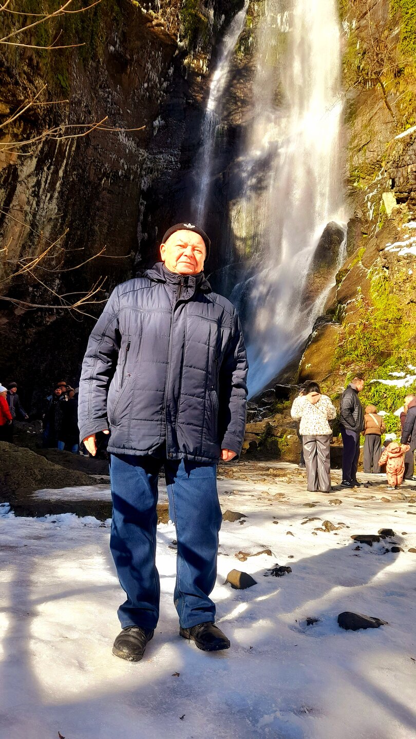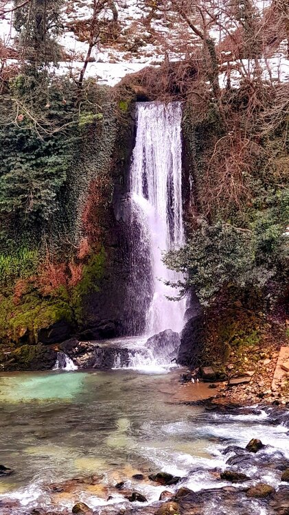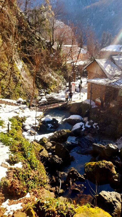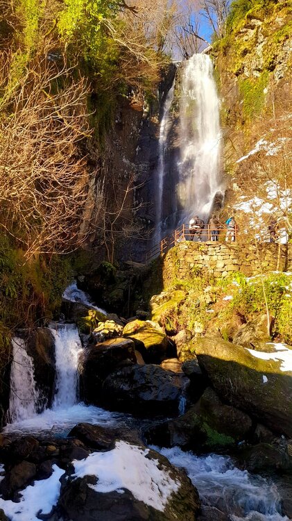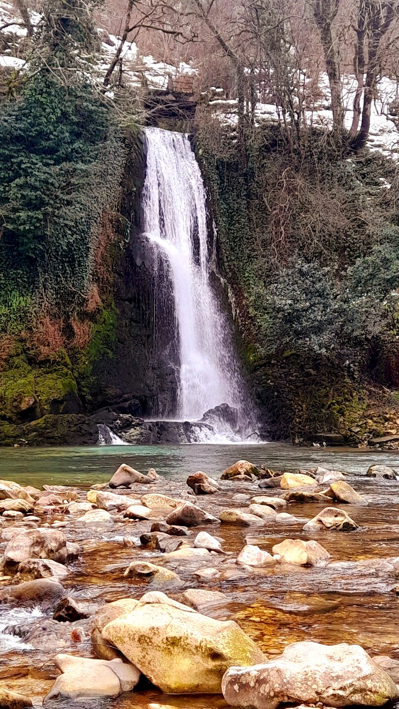 ГОРНАЯ АДЖАРИЯ. часть 2-я. 3 января. Поднимаемся в горы вдоль русла реки Чорох. Делаем остановку на месте впадения в неё реки Аджарисцкали. Виден водораздел мутных вод Аджарисцкали и бирюзовых вод Чороха. Поднимаемся ещё выше и останавливаемся у самого популярного у туристов, 30-метрового водопада Махунцети. Какой красавец! К водопаду оборудована тропа, вокруг которой ведётся оживлённая торговля мёдом, чурчхелой и вареньем. Я кроме традиционного магнитика приобрёл стаканчик жареных каштанов и глинтвейна. А всего в 500 метрах от водопада расположен старинный каменный мост, соединяющий берега Аджарисцкали. Как и всё древнее и таинственное, в Грузии называют именем царицы Тамары. Вот и арочный мост в Махунцети назван её именем. Его длина 29 метров, высота 6 метров. Я прошёлся по нему в обе стороны. Подробнее об этом старинном сооружении IX-X века можно почитать на демонстрационном стенде А вы обратили внимание на снег? Именно он стал преградой к подъему в национальный парк Мачахела, а также к грузинскому застолью в горах. А я дождя боялся! Продолжаем наше путешествие по Горной Аджарии и направляемся к ещё одному водопаду Мирвети. Надо по мостику перейти реку Чорох, пройтись по деревне около километра, и уже за поворотом показался ещё один аджарский красавец! Ну а грузинское застолье у нас всё же состоялось. Наш гид (и водитель минивэна) Давит договорился о проведения застолья в горном селе в грузинской семье своей родственницы. Столы ломились от аджарских и грузинских национальных блюд (сациви, хинкали, хачапури по-аджарски) , вина, чачи. Сколько было сказано тёплых, душевных тостов! А напоследок, уже с наступлением темноты, он нас завёз в заброшенный мандариновый сад и дал нам 15 минут на его "разграбление". Я даже домой привёз эти мандарины, очень вкусные.