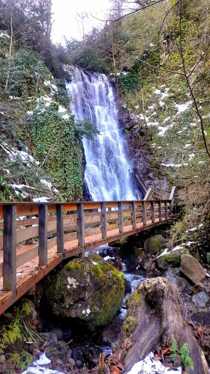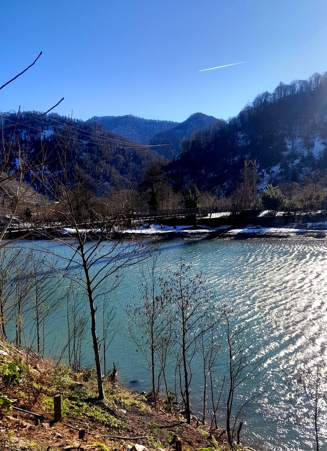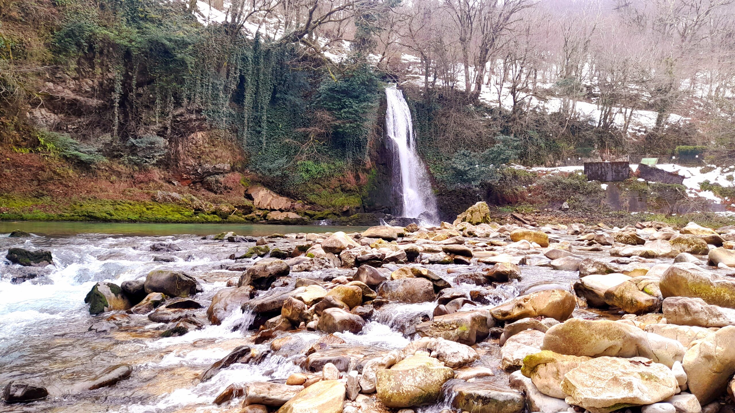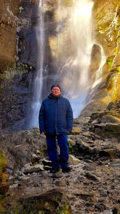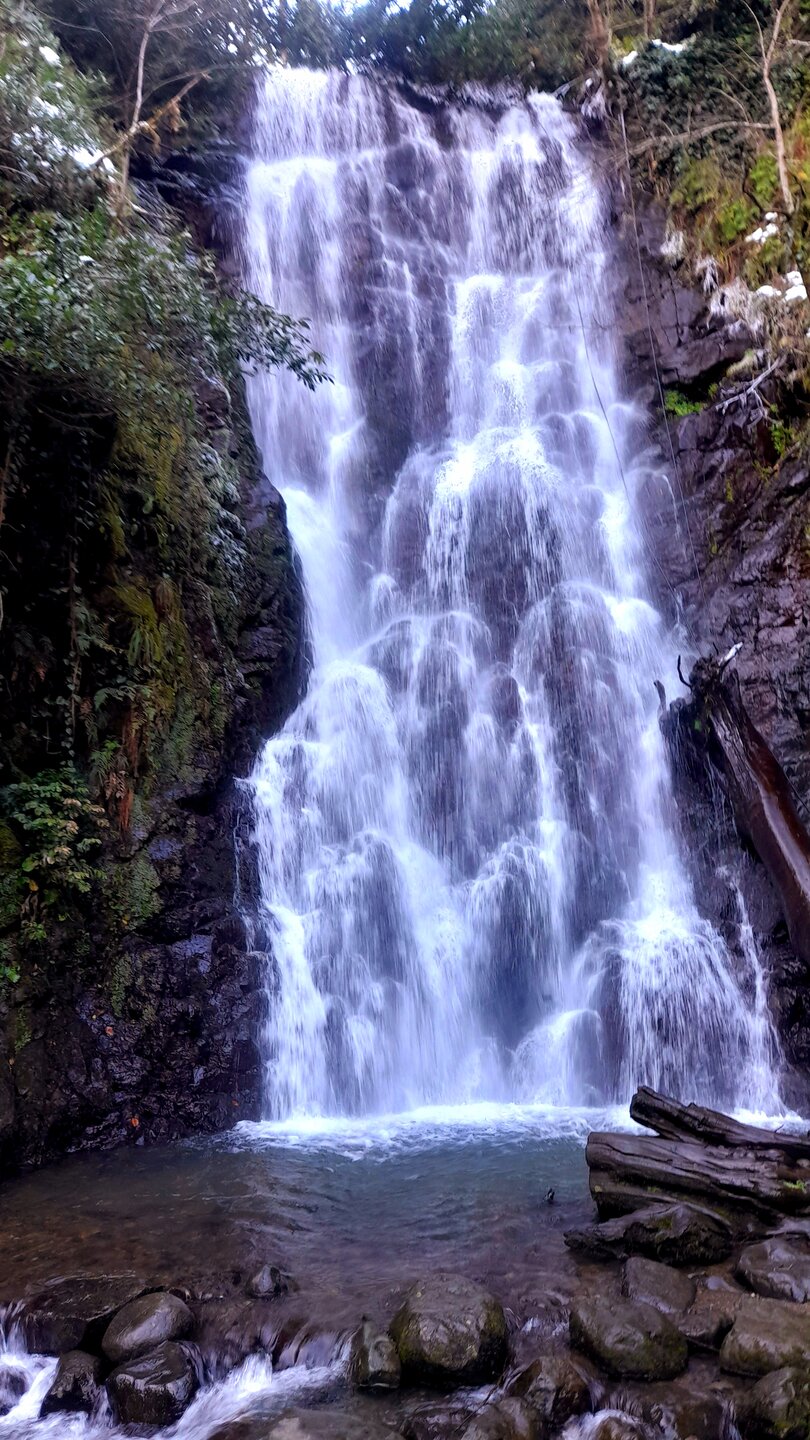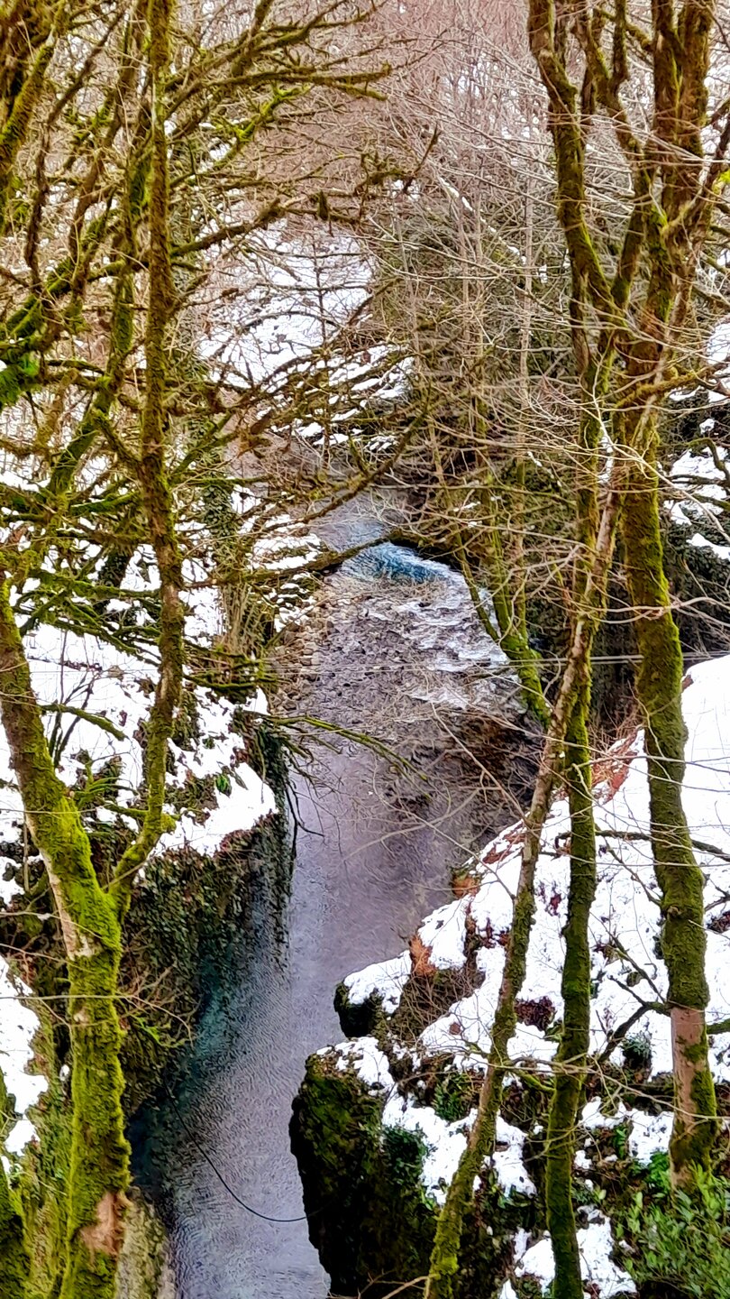 ГОРНАЯ АДЖАРИЯ. часть 2-я. 3 января. Поднимаемся в горы вдоль русла реки Чорох. Делаем остановку на месте впадения в неё реки Аджарисцкали. Виден водораздел мутных вод Аджарисцкали и бирюзовых вод Чороха. Поднимаемся ещё выше и останавливаемся у самого популярного у туристов, 30-метрового водопада Махунцети. Какой красавец! К водопаду оборудована тропа, вокруг которой ведётся оживлённая торговля мёдом, чурчхелой и вареньем. Я кроме традиционного магнитика приобрёл стаканчик жареных каштанов и глинтвейна. А всего в 500 метрах от водопада расположен старинный каменный мост, соединяющий берега Аджарисцкали. Как и всё древнее и таинственное, в Грузии называют именем царицы Тамары. Вот и арочный мост в Махунцети назван её именем. Его длина 29 метров, высота 6 метров. Я прошёлся по нему в обе стороны. Подробнее об этом старинном сооружении IX-X века можно почитать на демонстрационном стенде А вы обратили внимание на снег? Именно он стал преградой к подъему в национальный парк Мачахела, а также к грузинскому застолью в горах. А я дождя боялся! Продолжаем наше путешествие по Горной Аджарии и направляемся к ещё одному водопаду Мирвети. Надо по мостику перейти реку Чорох, пройтись по деревне около километра, и уже за поворотом показался ещё один аджарский красавец! Ну а грузинское застолье у нас всё же состоялось. Наш гид (и водитель минивэна) Давит договорился о проведения застолья в горном селе в грузинской семье своей родственницы. Столы ломились от аджарских и грузинских национальных блюд (сациви, хинкали, хачапури по-аджарски) , вина, чачи. Сколько было сказано тёплых, душевных тостов! А напоследок, уже с наступлением темноты, он нас завёз в заброшенный мандариновый сад и дал нам 15 минут на его "разграбление". Я даже домой привёз эти мандарины, очень вкусные.