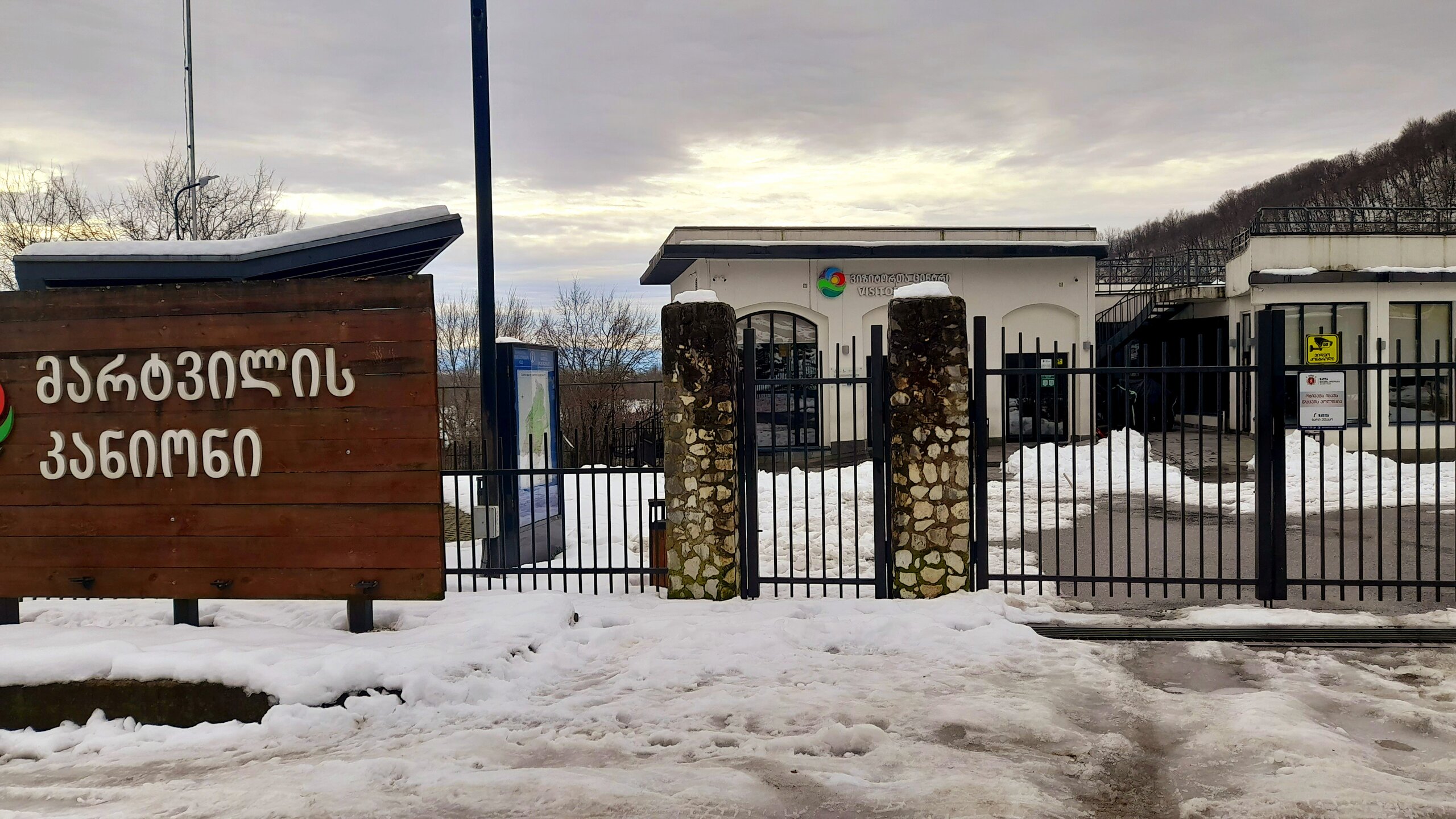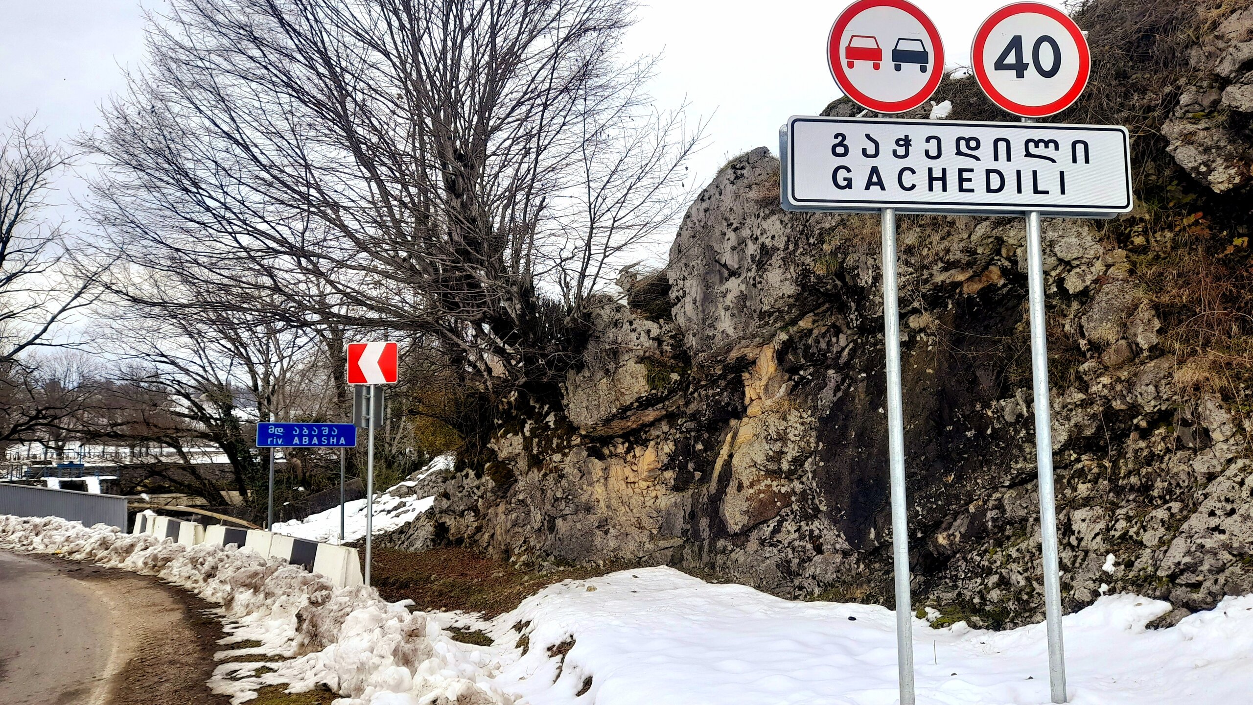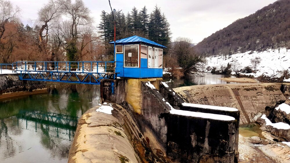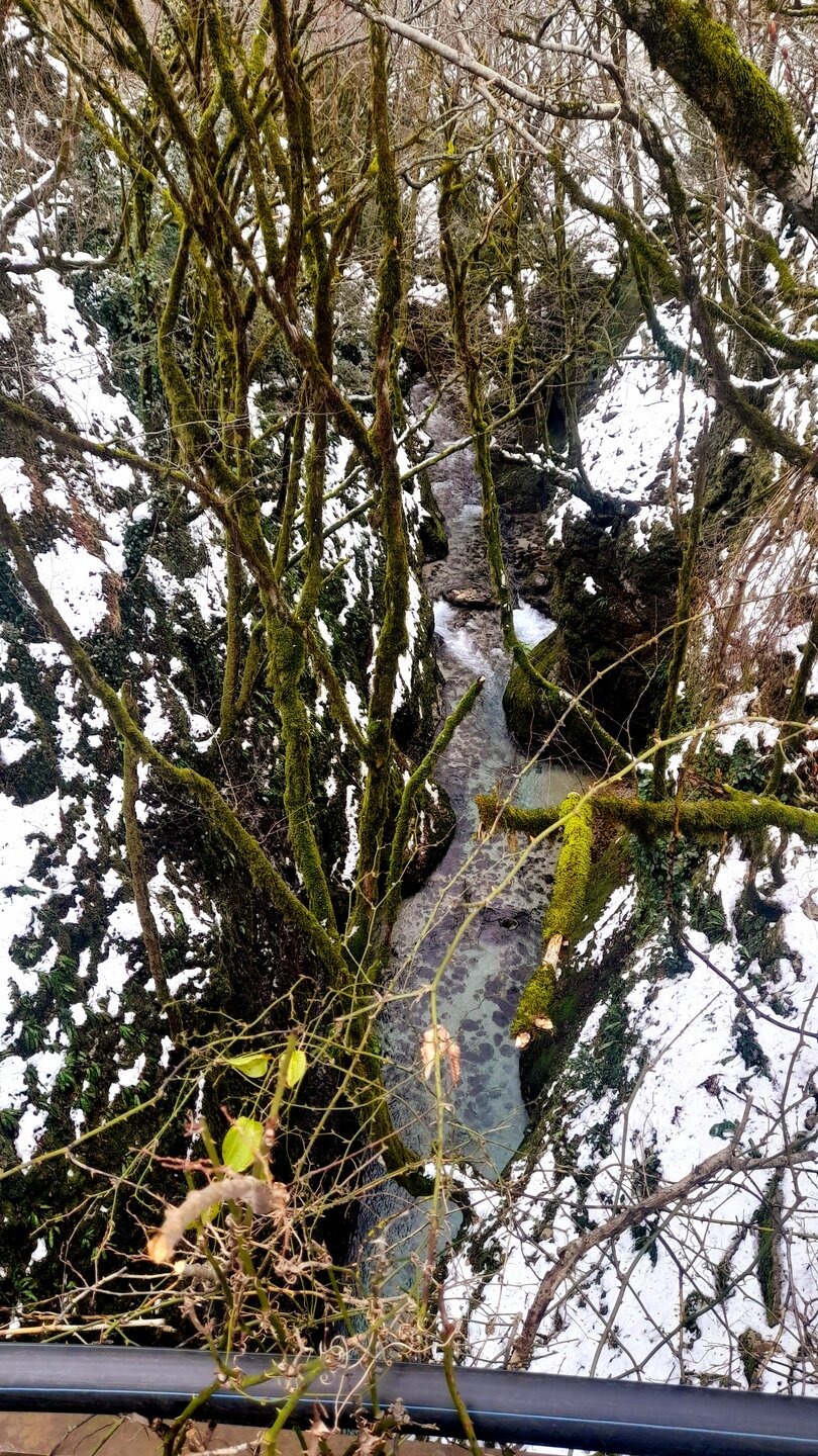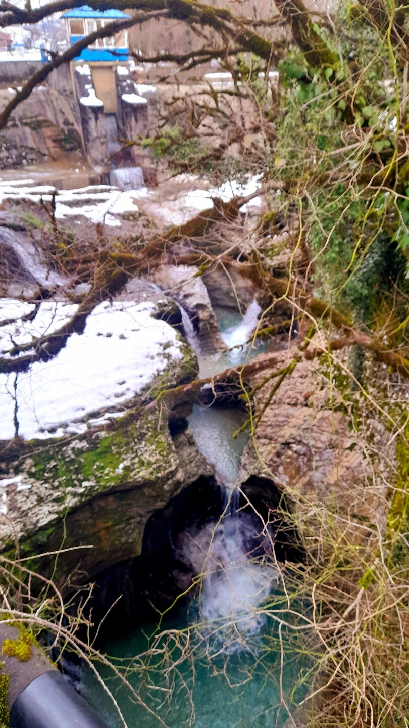 МАРТВИЛЬСКИЙ КАНЬОН. 4 января. Сегодня утром я переезжаю в Кутаиси. Администратор отеля вызвал мне такси до автовокзала, которое обошлось мне немногим более 4 лари. В 9 часов утра автобус компании METRO везёт меня с автовокзала Батуми в международный аэропорт Кутаиси. Там у меня уже забронирован автомобиль, который встретит меня через 2 часа. Пересадка с автобуса в автомобиль заняла считанные минуты. В моей программе посещение Мартвильского каньона, каньона Окаце, водопада Кинчха, пещеры Прометей, города Цхалтубо и уже в Кутаиси храм Баграта и заселение в отель. Дорога до Мартвильского каньона в 40 км проходила через ряд деревень, с солидными двухэтажными домами с верандами. По дороге мне водитель сообщил, что к каньону Окаце и водопаду Кинчха проехать не получится. Накануне здесь выпало рекордное количество снега и дорога туда закрыта. Мои планы начинают рушиться. Подъехали ко входу Мартвильского каньона для покупки билетов и посещения. Но что это? Закрыто, сегодня - выходной ! Откроют только завтра. Не было слов выразить моё разочарование. Новый год у грузин продолжается уже 4 дня вместо двух официальных. Тут из припаркованного рядом автомобиля выходит молодой человек и предлагает мне поездку по окрестностям Мартвили с осмотром четырёх локаций: двух каньонов и двух водопадов. Время осмотра неограниченно. И показывает мне плакат с цветными картинами этих мест. Цена -150 лари. Желая любой ценой посмотреть Мартвильский каньон, я даже сначала не сообразил, что это довольно приличные деньги. Но отступать уже было поздно. Едем. Минут 15 в пути и останавливаемся на мосту у каньона Балда, что на той же реке Абаша, что и Мартвильский каньон. Здесь же обозначен круговой туристический маршрут с посещением нескольких водопадов на реках Абаша и Тоба. По длине он километров 10-12, правда перепад высот до 300 метров. Но сейчас, по сугробам его не пройти. Поднимаюсь к монастырю Балда. Но и он сегодня закрыт. . Возвращаемся назад и останавливаемся на окраине села Гачедили. Здесь на реке Абаша стоит небольшая плотина и несколько водопадиков. Следующим был водопад Огуеши. Спускаюсь вниз к реке. Поднимаюсь на подвесной мостик, откуда можно посмотреть это место с другого ракурса. Ну и завершает наш маршрут Мартвильский каньон метров на 200-300 выше по реке от закрытого сегодня к посещению. Вариантов спуститься в сам каньон не видно. Возвращаюсь к месту, где я оставил ожидать меня своего водителя с машиной и мы едем дальше.