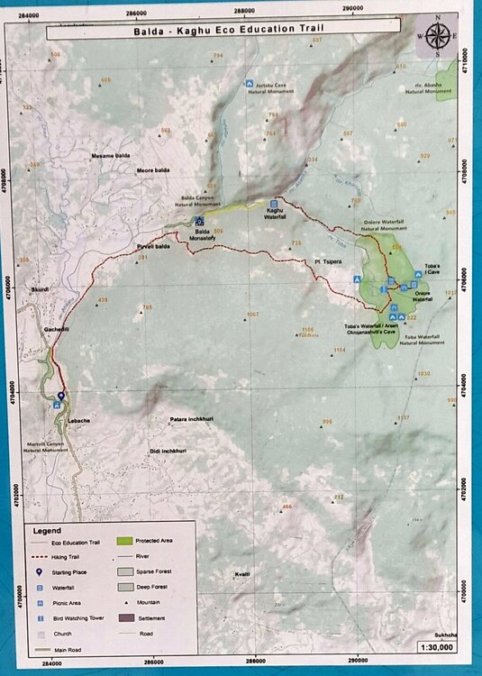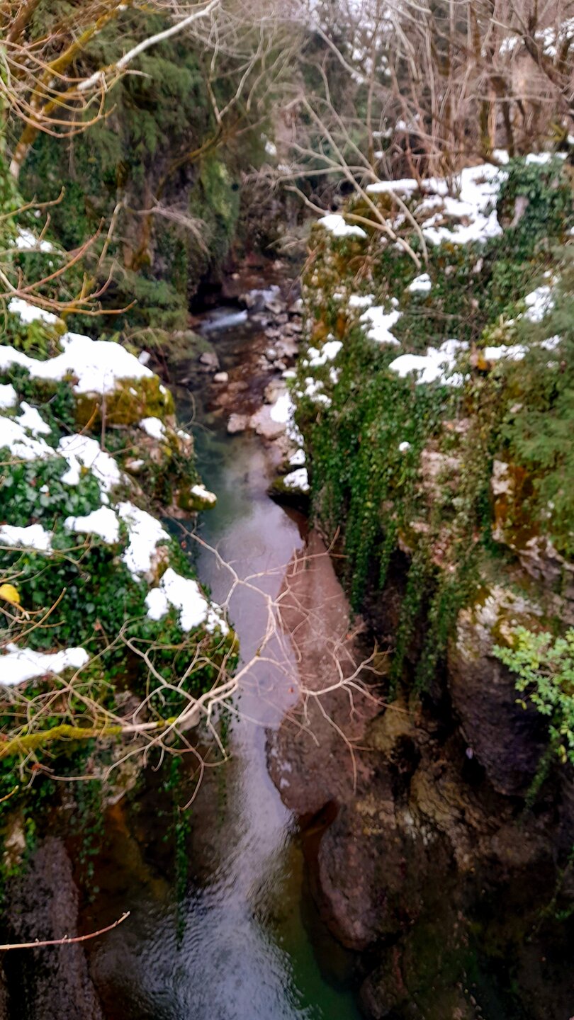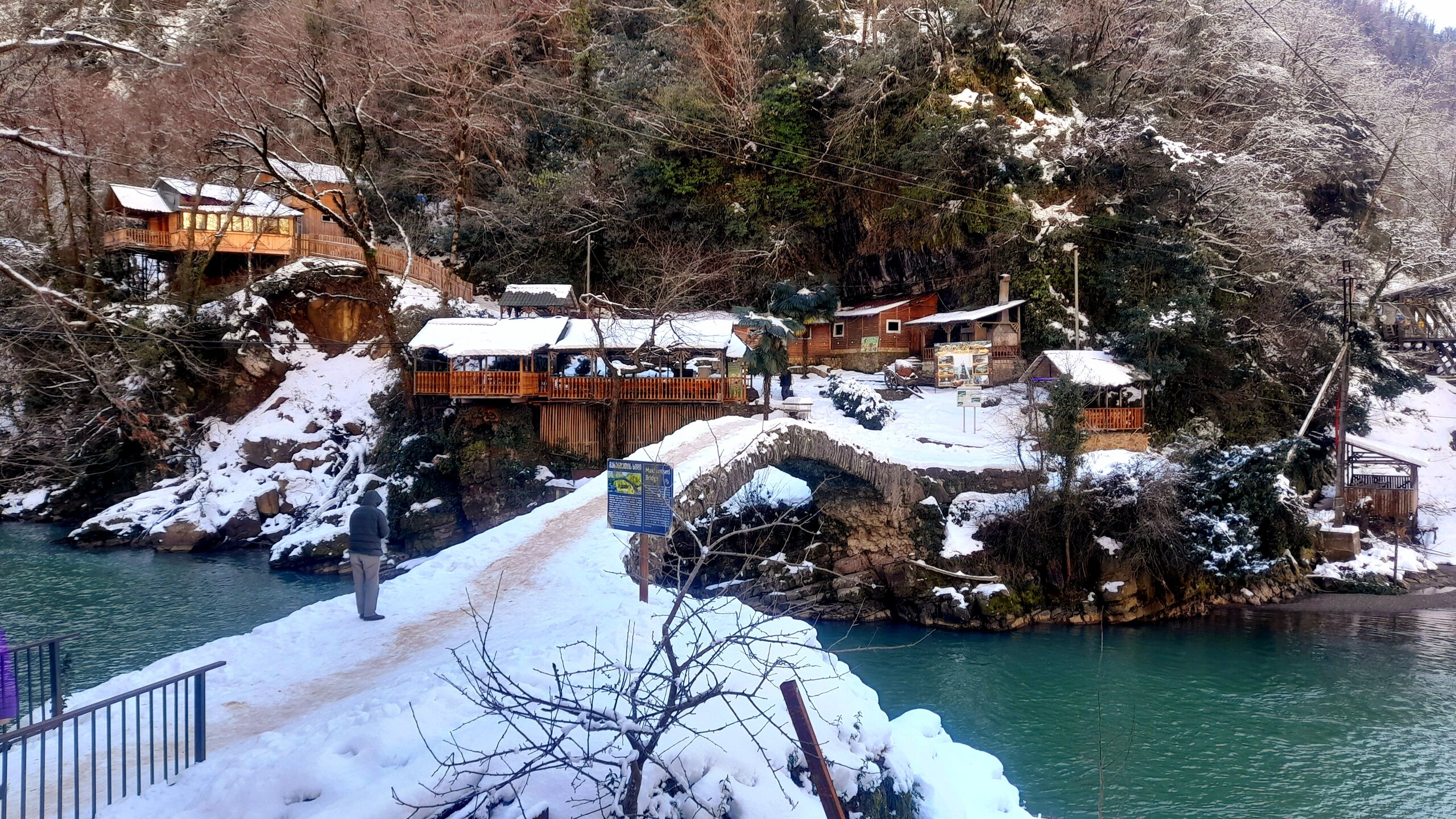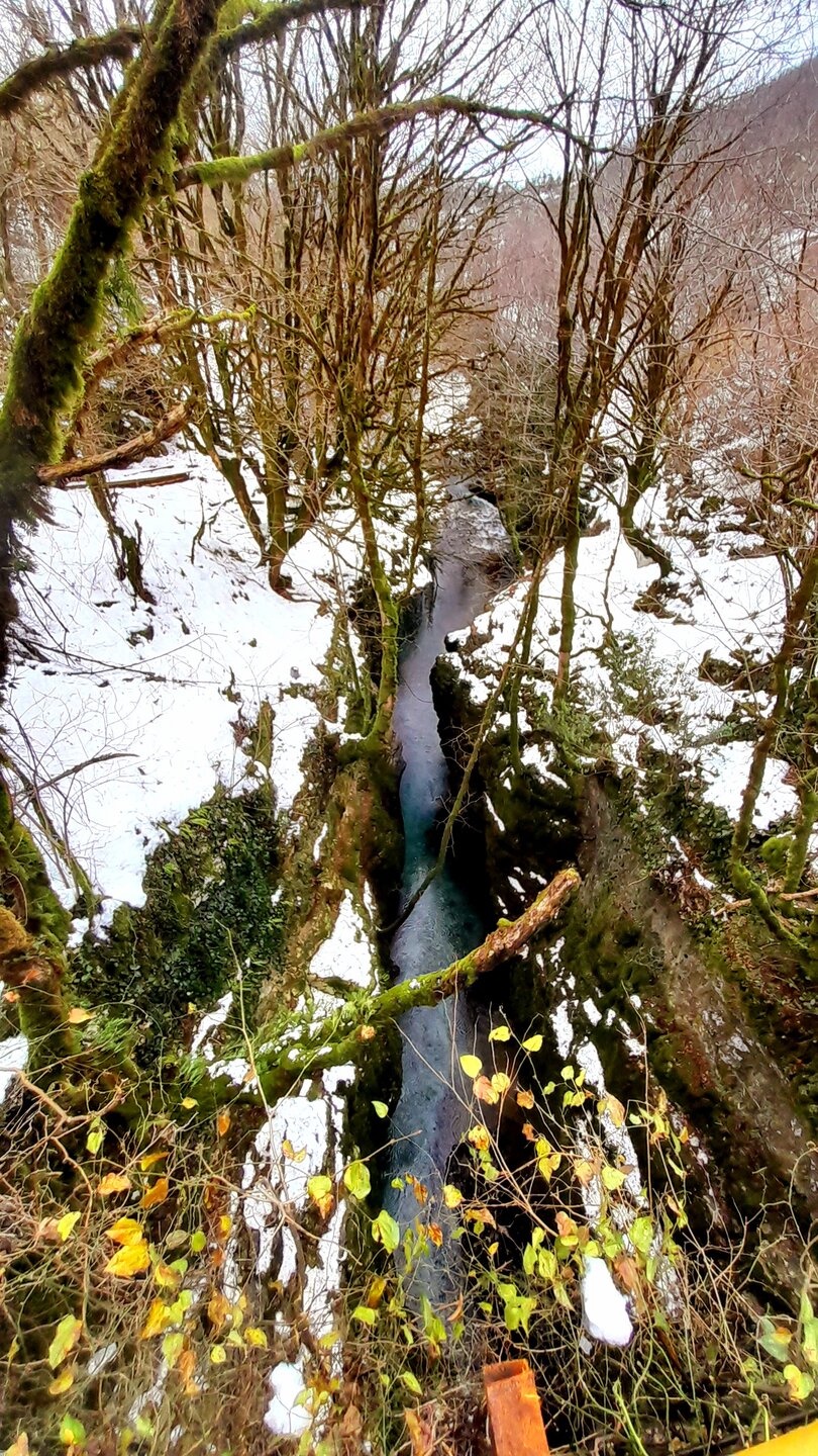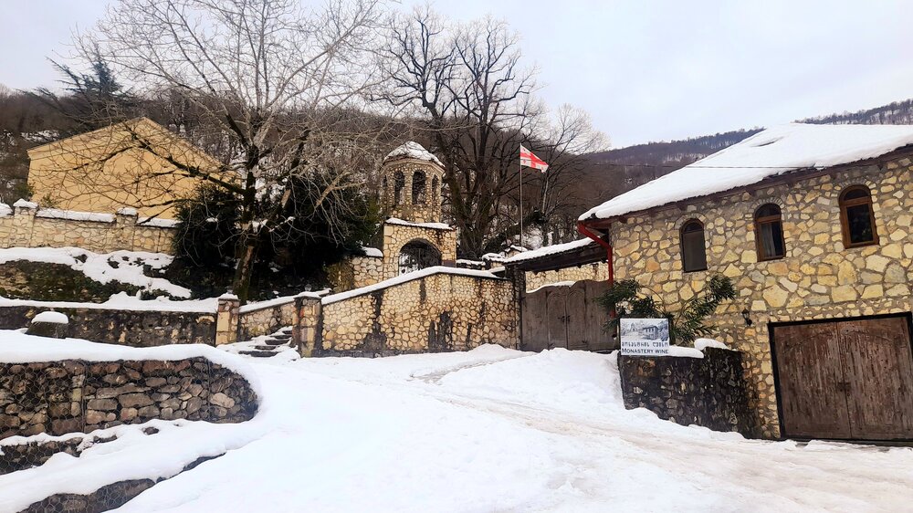МАРТВИЛЬСКИЙ КАНЬОН. 4 января. Сегодня утром я переезжаю в Кутаиси. Администратор отеля вызвал мне такси до автовокзала, которое обошлось мне немногим более 4 лари. В 9 часов утра автобус компании METRO везёт меня с автовокзала Батуми в международный аэропорт Кутаиси. Там у меня уже забронирован автомобиль, который встретит меня через 2 часа. Пересадка с автобуса в автомобиль заняла считанные минуты. В моей программе посещение Мартвильского каньона, каньона Окаце, водопада Кинчха, пещеры Прометей, города Цхалтубо и уже в Кутаиси храм Баграта и заселение в отель. Дорога до Мартвильского каньона в 40 км проходила через ряд деревень, с солидными двухэтажными домами с верандами. По дороге мне водитель сообщил, что к каньону Окаце и водопаду Кинчха проехать не получится. Накануне здесь выпало рекордное количество снега и дорога туда закрыта. Мои планы начинают рушиться. Подъехали ко входу Мартвильского каньона для покупки билетов и посещения. Но что это? Закрыто, сегодня - выходной ! Откроют только завтра. Не было слов выразить моё разочарование. Новый год у грузин продолжается уже 4 дня вместо двух официальных. Тут из припаркованного рядом автомобиля выходит молодой человек и предлагает мне поездку по окрестностям Мартвили с осмотром четырёх локаций: двух каньонов и двух водопадов. Время осмотра неограниченно. И показывает мне плакат с цветными картинами этих мест. Цена -150 лари. Желая любой ценой посмотреть Мартвильский каньон, я даже сначала не сообразил, что это довольно приличные деньги. Но отступать уже было поздно. Едем. Минут 15 в пути и останавливаемся на мосту у каньона Балда, что на той же реке Абаша, что и Мартвильский каньон. Здесь же обозначен круговой туристический маршрут с посещением нескольких водопадов на реках Абаша и Тоба. По длине он километров 10-12, правда перепад высот до 300 метров. Но сейчас, по сугробам его не пройти. Поднимаюсь к монастырю Балда. Но и он сегодня закрыт. . Возвращаемся назад и останавливаемся на окраине села Гачедили. Здесь на реке Абаша стоит небольшая плотина и несколько водопадиков. Следующим был водопад Огуеши. Спускаюсь вниз к реке. Поднимаюсь на подвесной мостик, откуда можно посмотреть это место с другого ракурса. Ну и завершает наш маршрут Мартвильский каньон метров на 200-300 выше по реке от закрытого сегодня к посещению. Вариантов спуститься в сам каньон не видно. Возвращаюсь к месту, где я оставил ожидать меня своего водителя с машиной и мы едем дальше.