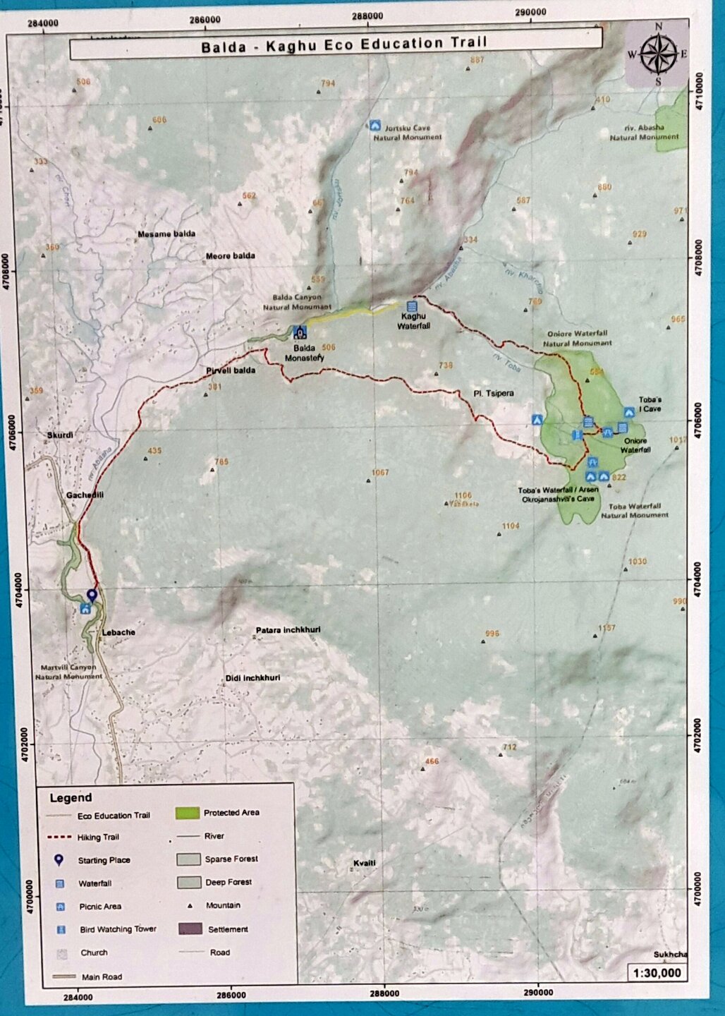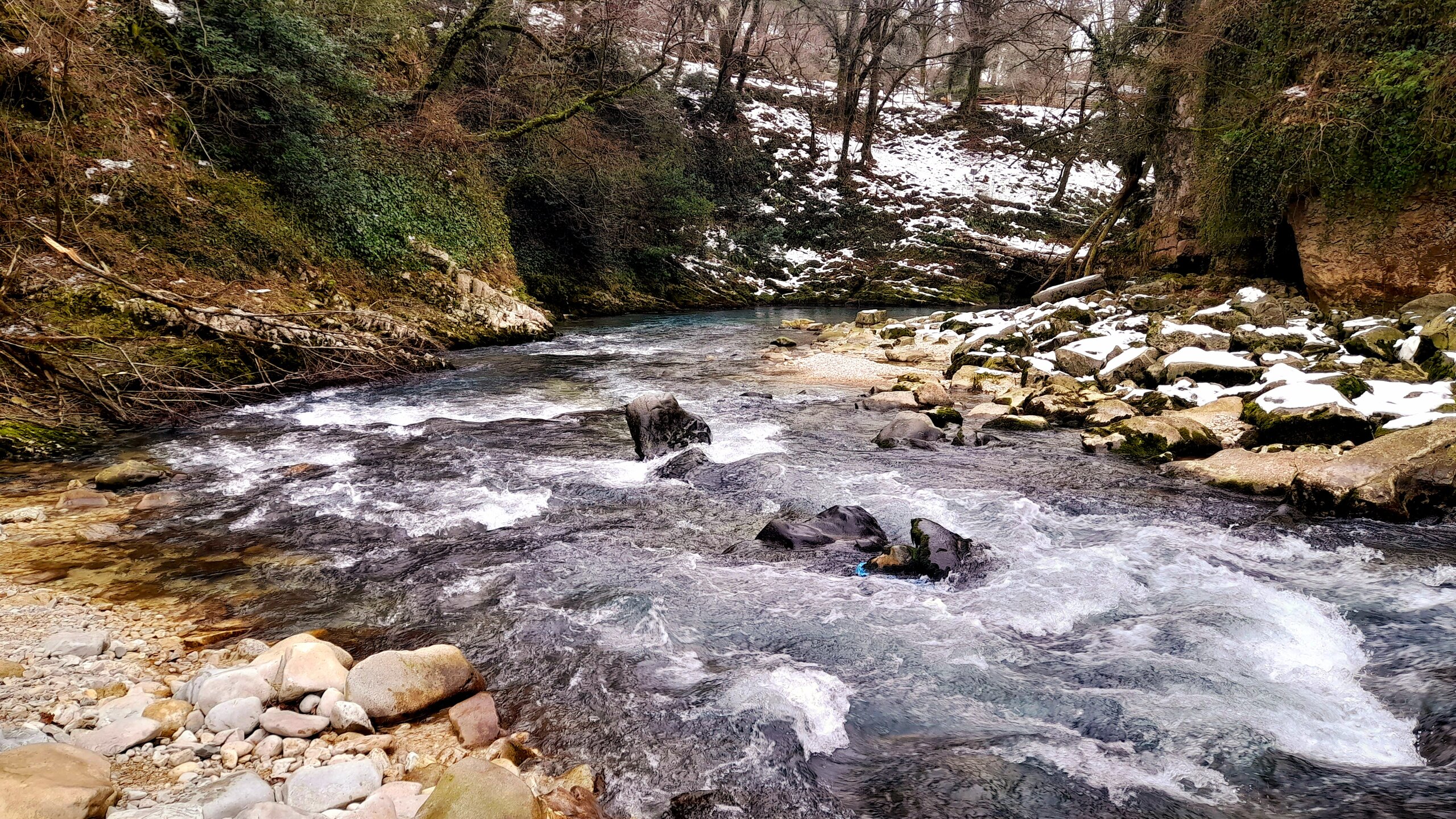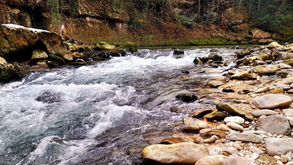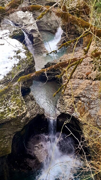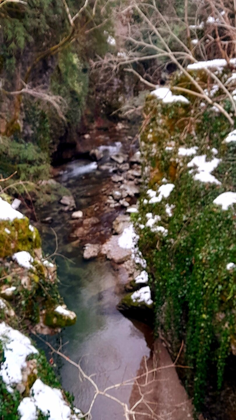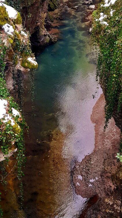 МАРТВИЛЬСКИЙ КАНЬОН. 4 января. Сегодня утром я переезжаю в Кутаиси. Администратор отеля вызвал мне такси до автовокзала, которое обошлось мне немногим более 4 лари. В 9 часов утра автобус компании METRO везёт меня с автовокзала Батуми в международный аэропорт Кутаиси. Там у меня уже забронирован автомобиль, который встретит меня через 2 часа. Пересадка с автобуса в автомобиль заняла считанные минуты. В моей программе посещение Мартвильского каньона, каньона Окаце, водопада Кинчха, пещеры Прометей, города Цхалтубо и уже в Кутаиси храм Баграта и заселение в отель. Дорога до Мартвильского каньона в 40 км проходила через ряд деревень, с солидными двухэтажными домами с верандами. По дороге мне водитель сообщил, что к каньону Окаце и водопаду Кинчха проехать не получится. Накануне здесь выпало рекордное количество снега и дорога туда закрыта. Мои планы начинают рушиться. Подъехали ко входу Мартвильского каньона для покупки билетов и посещения. Но что это? Закрыто, сегодня - выходной ! Откроют только завтра. Не было слов выразить моё разочарование. Новый год у грузин продолжается уже 4 дня вместо двух официальных. Тут из припаркованного рядом автомобиля выходит молодой человек и предлагает мне поездку по окрестностям Мартвили с осмотром четырёх локаций: двух каньонов и двух водопадов. Время осмотра неограниченно. И показывает мне плакат с цветными картинами этих мест. Цена -150 лари. Желая любой ценой посмотреть Мартвильский каньон, я даже сначала не сообразил, что это довольно приличные деньги. Но отступать уже было поздно. Едем. Минут 15 в пути и останавливаемся на мосту у каньона Балда, что на той же реке Абаша, что и Мартвильский каньон. Здесь же обозначен круговой туристический маршрут с посещением нескольких водопадов на реках Абаша и Тоба. По длине он километров 10-12, правда перепад высот до 300 метров. Но сейчас, по сугробам его не пройти. Поднимаюсь к монастырю Балда. Но и он сегодня закрыт. . Возвращаемся назад и останавливаемся на окраине села Гачедили. Здесь на реке Абаша стоит небольшая плотина и несколько водопадиков. Следующим был водопад Огуеши. Спускаюсь вниз к реке. Поднимаюсь на подвесной мостик, откуда можно посмотреть это место с другого ракурса. Ну и завершает наш маршрут Мартвильский каньон метров на 200-300 выше по реке от закрытого сегодня к посещению. Вариантов спуститься в сам каньон не видно. Возвращаюсь к месту, где я оставил ожидать меня своего водителя с машиной и мы едем дальше.