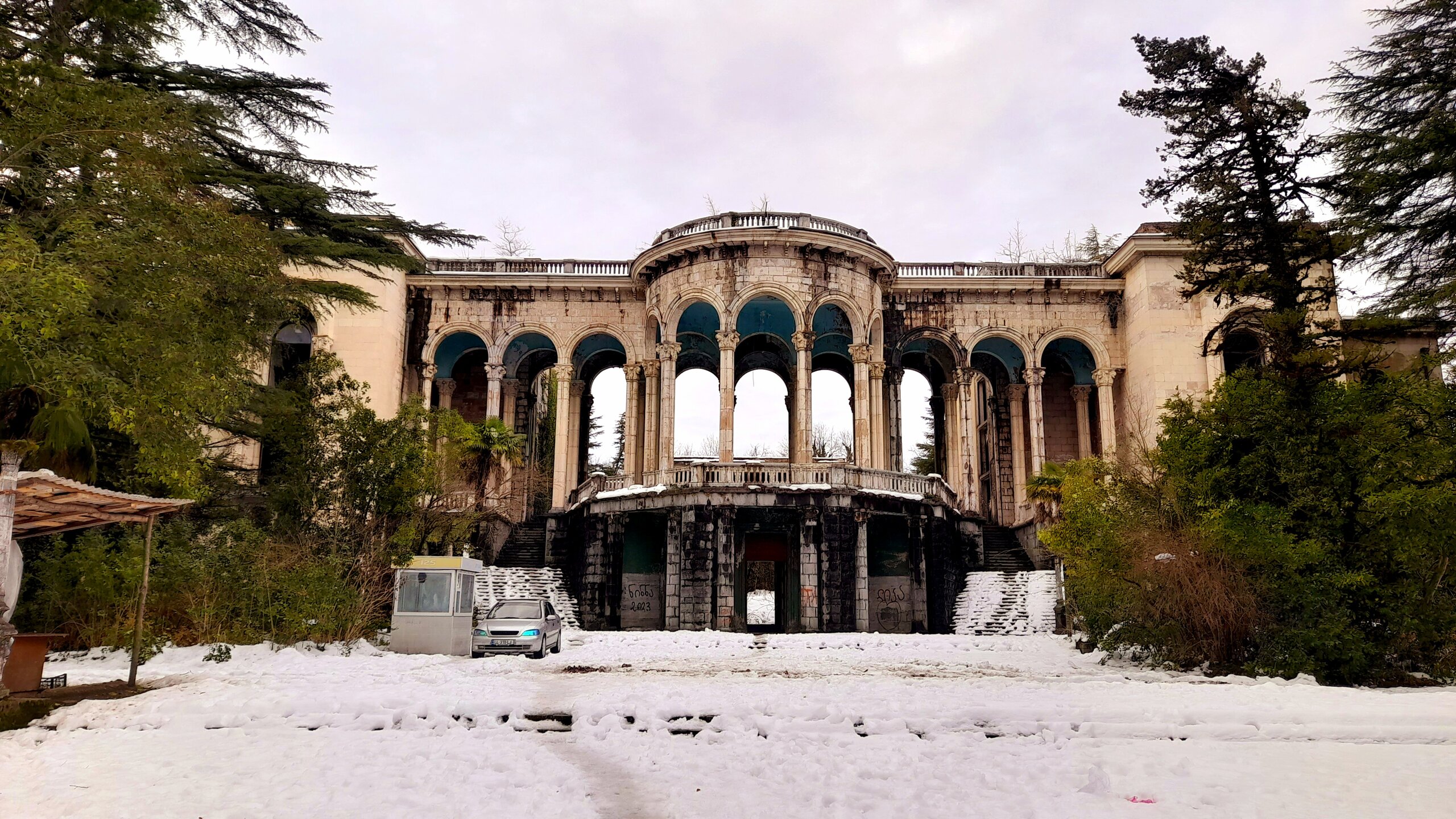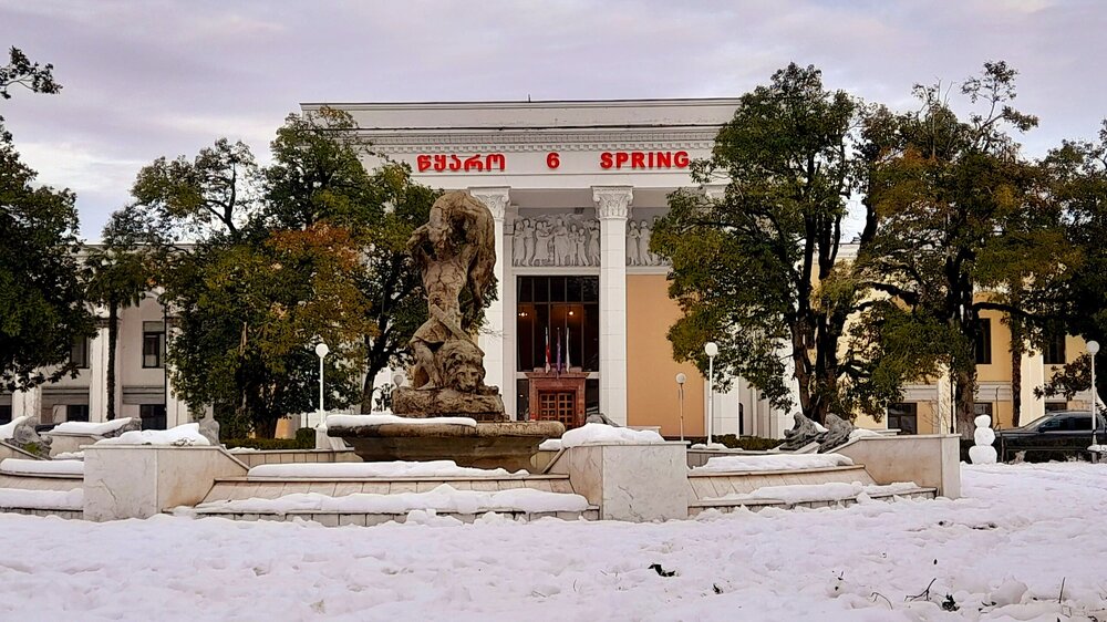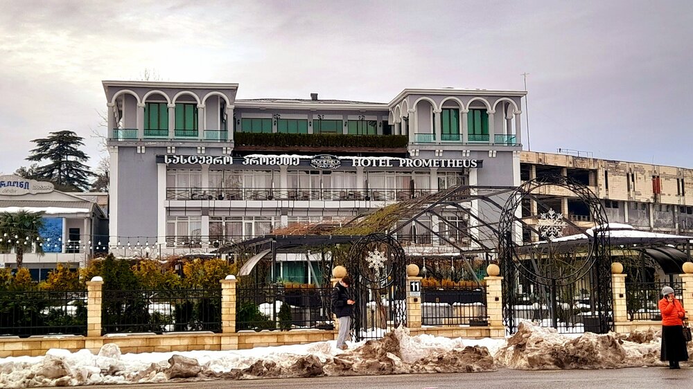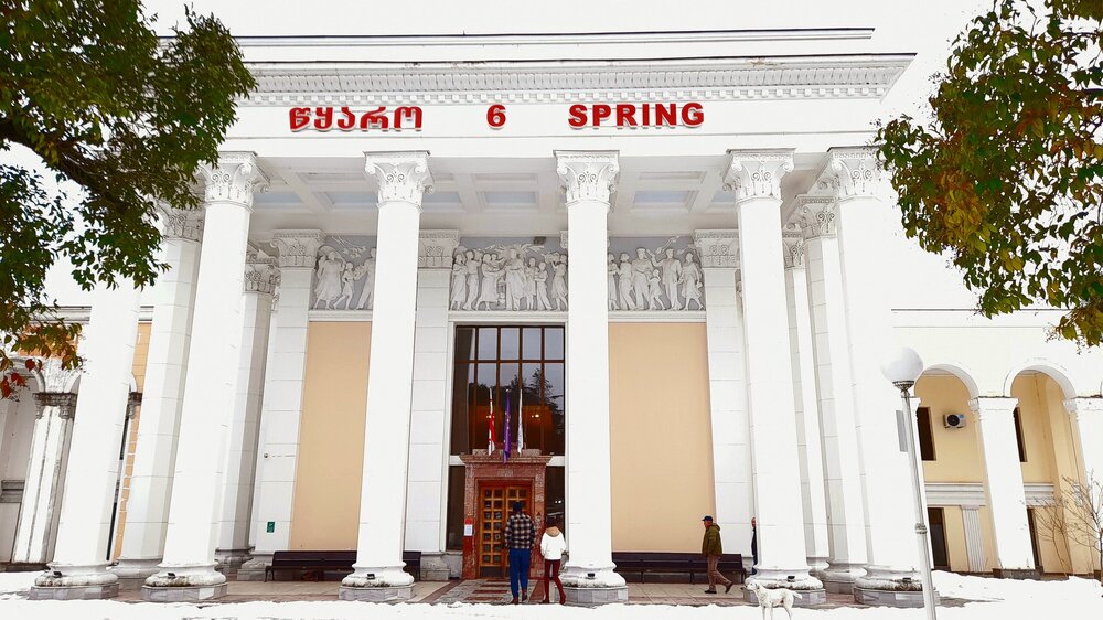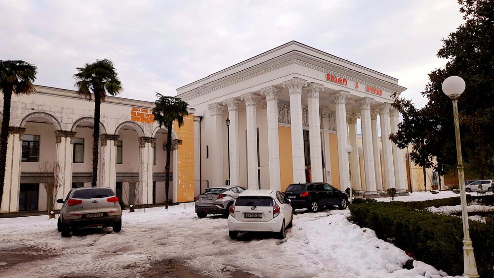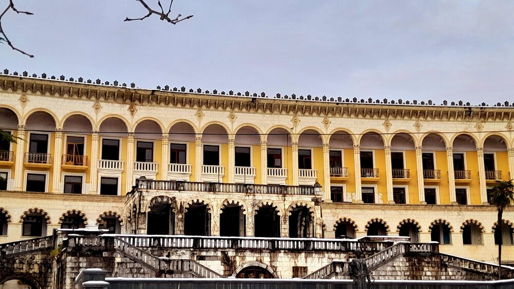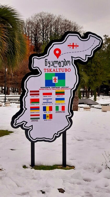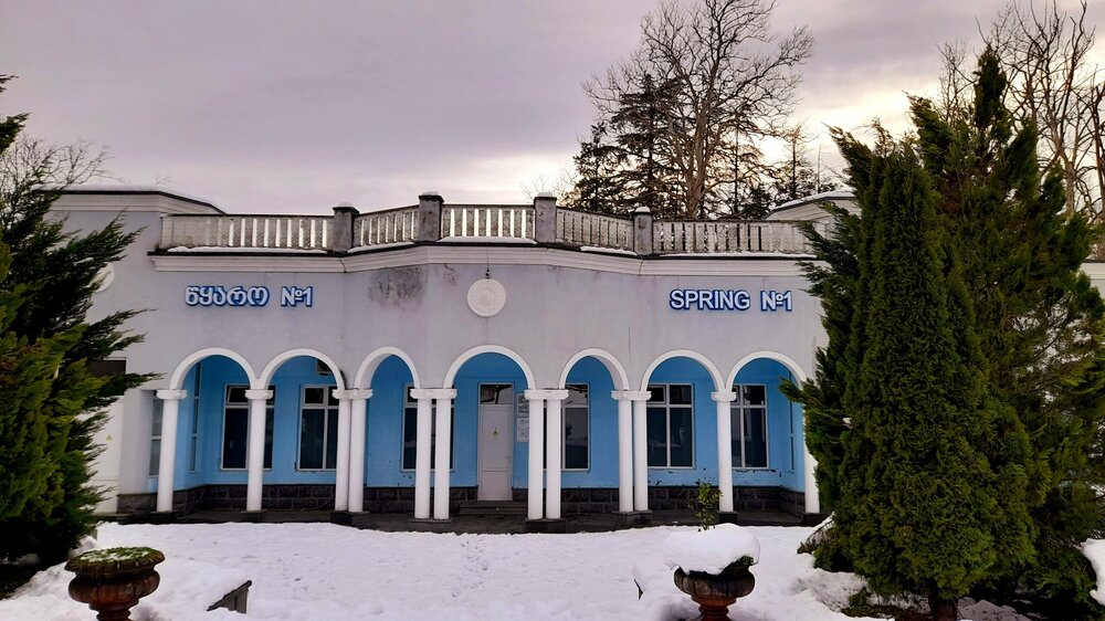 ЦХАЛТУБО. ПРОГУЛКА ПО ГОРОДУ. 4 января. Подъехали к заброшенному санаторию Центросоюза. Я поднялся в него, осмотрел несколько залов, мраморные колонны, внутренние строения. Но оставаться здесь далее было жутковато. Меня сопровождали несколько местных собак. Они в Грузии - везде, но большинство - чипированные. Для контраста следующим объектом стал Центральный парк Цхалтубо и Источник №6 (сталинский источник). Именно сюда приезжал Сталин. Вон на барельефе изображен Сталин в окружении народа. Далеко пройти не дано, рядом внутри уже находятся радоновые ванны. Прогуляться по парку не получилось. Везде сугробы снега, дорожки не чищены - продолжается празднование Нового года. Прошёл вдоль дороги до центрального входа. Уже при выезде из города остановились у южного входа в парк Ещё пара заброшек. Санаторий Железнодорожник. и санаторий Шахтёр, который, похоже, решили восстановить. Ну а теперь посмотрим новые отели в восстанавливаемом городе. Выезжаем в Кутаиси...