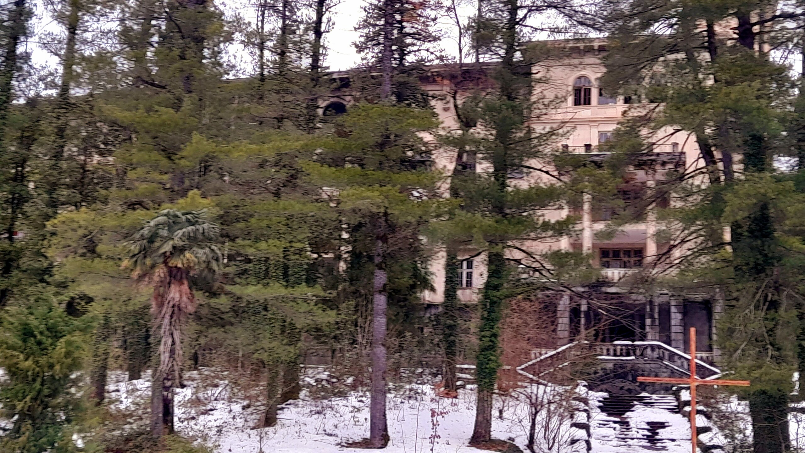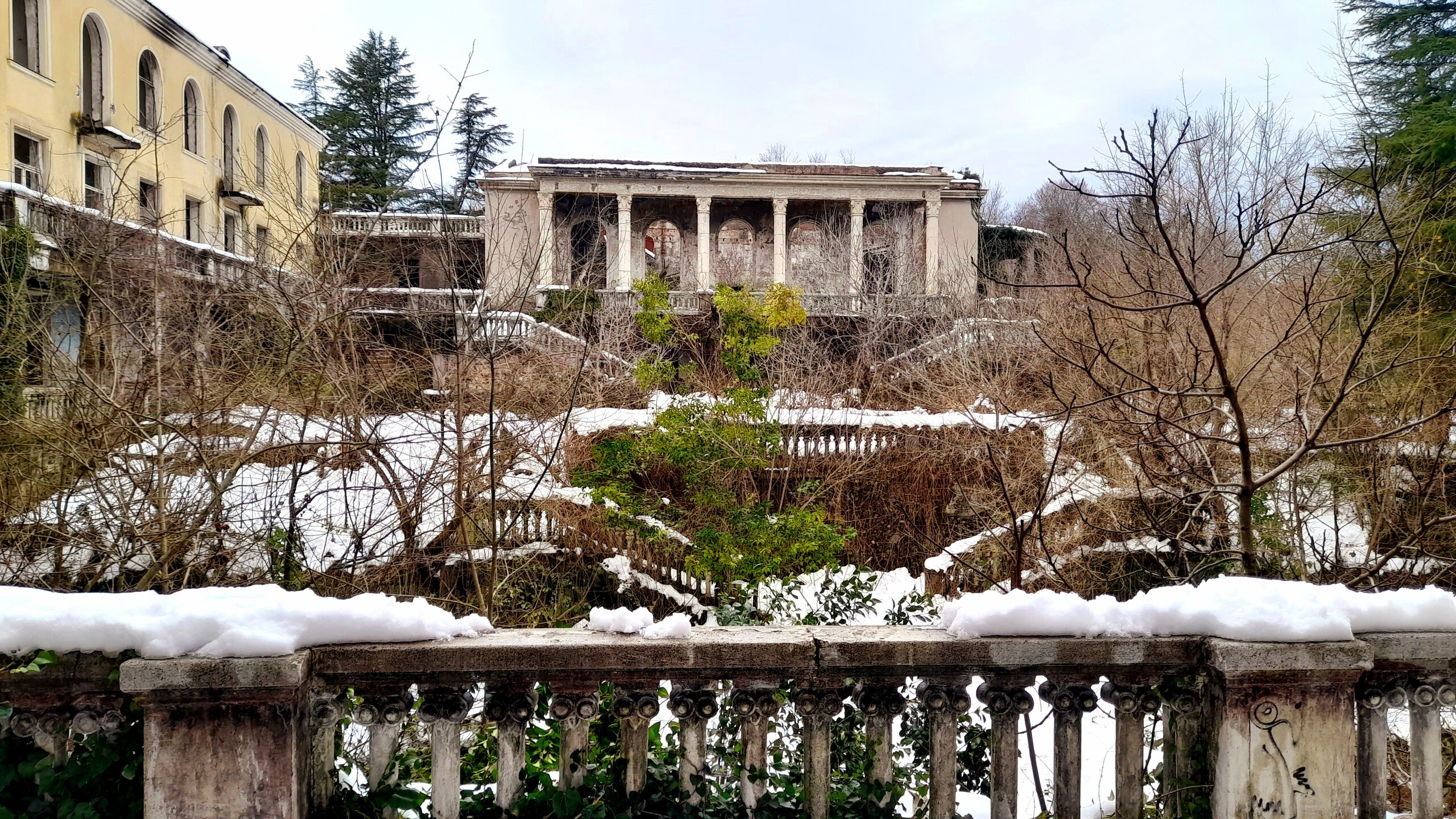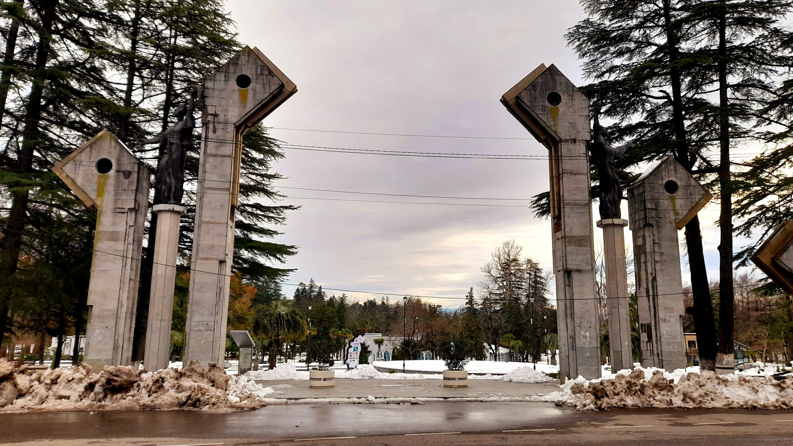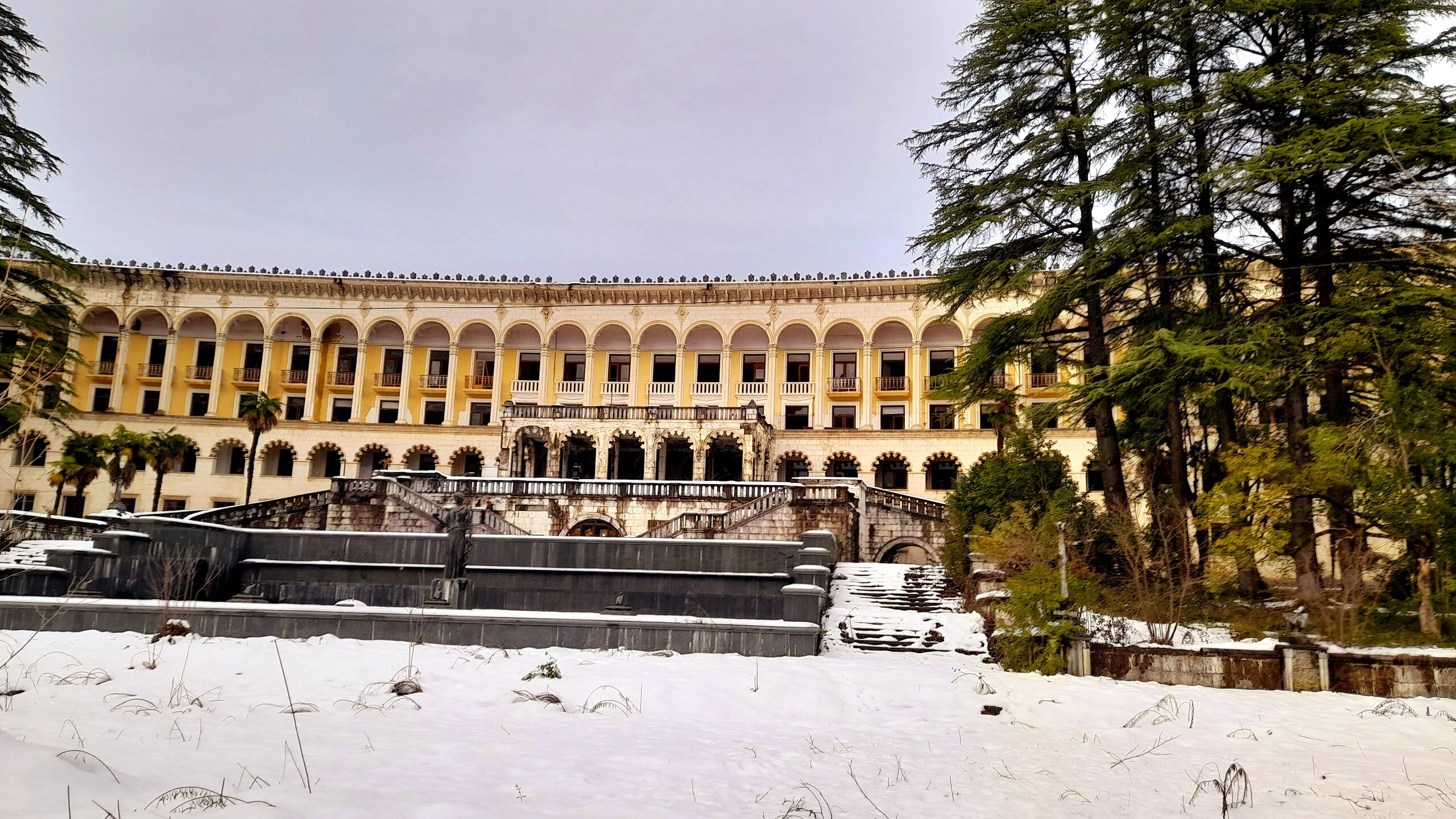 ЦХАЛТУБО. ПРОГУЛКА ПО ГОРОДУ. 4 января. Подъехали к заброшенному санаторию Центросоюза. Я поднялся в него, осмотрел несколько залов, мраморные колонны, внутренние строения. Но оставаться здесь далее было жутковато. Меня сопровождали несколько местных собак. Они в Грузии - везде, но большинство - чипированные. Для контраста следующим объектом стал Центральный парк Цхалтубо и Источник №6 (сталинский источник). Именно сюда приезжал Сталин. Вон на барельефе изображен Сталин в окружении народа. Далеко пройти не дано, рядом внутри уже находятся радоновые ванны. Прогуляться по парку не получилось. Везде сугробы снега, дорожки не чищены - продолжается празднование Нового года. Прошёл вдоль дороги до центрального входа. Уже при выезде из города остановились у южного входа в парк Ещё пара заброшек. Санаторий Железнодорожник. и санаторий Шахтёр, который, похоже, решили восстановить. Ну а теперь посмотрим новые отели в восстанавливаемом городе. Выезжаем в Кутаиси...