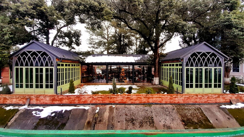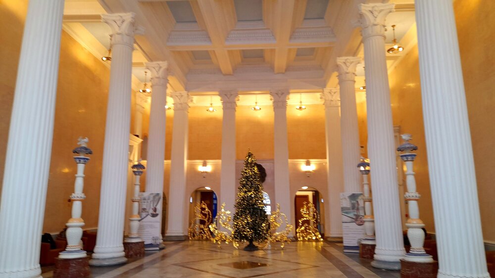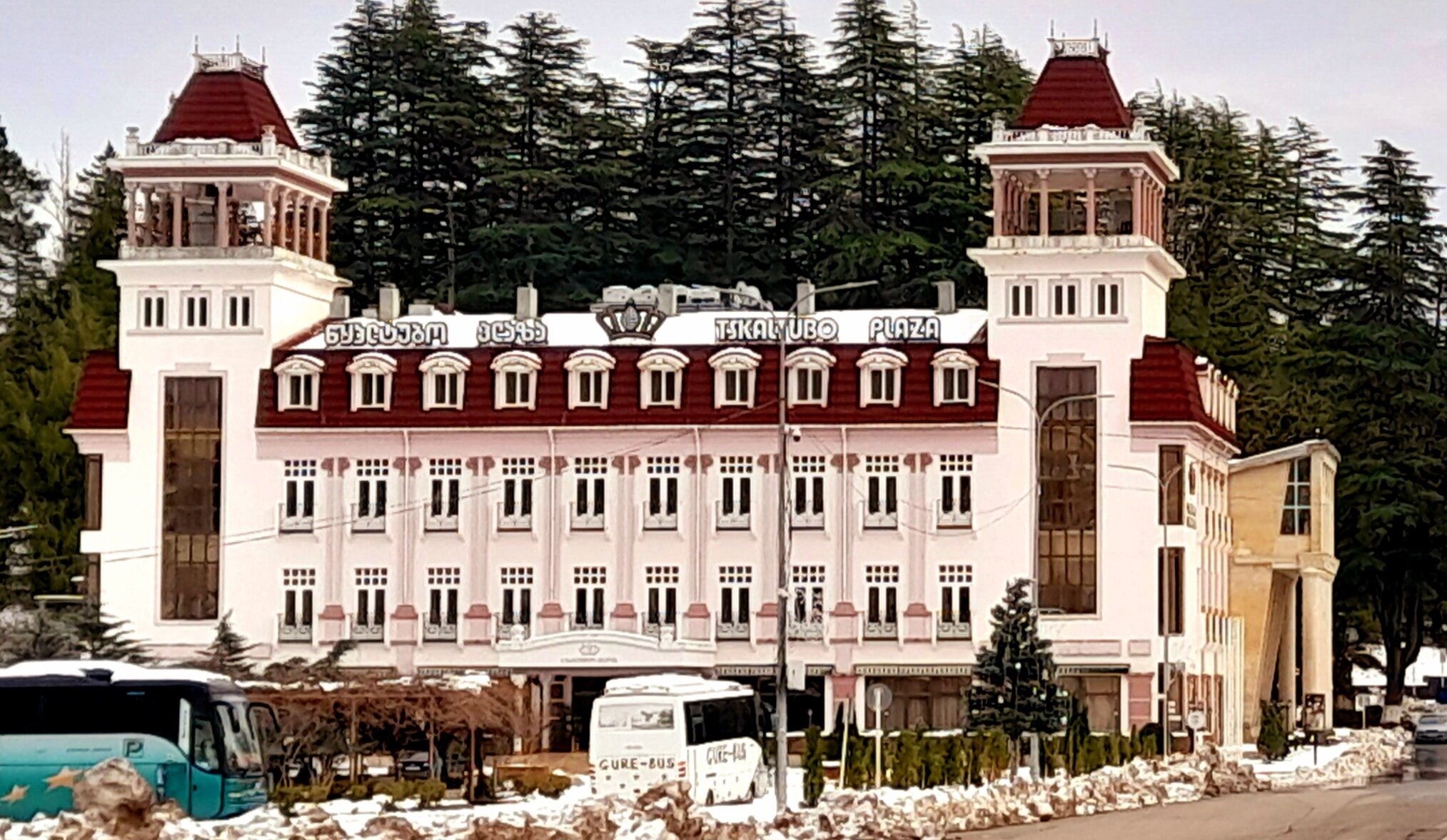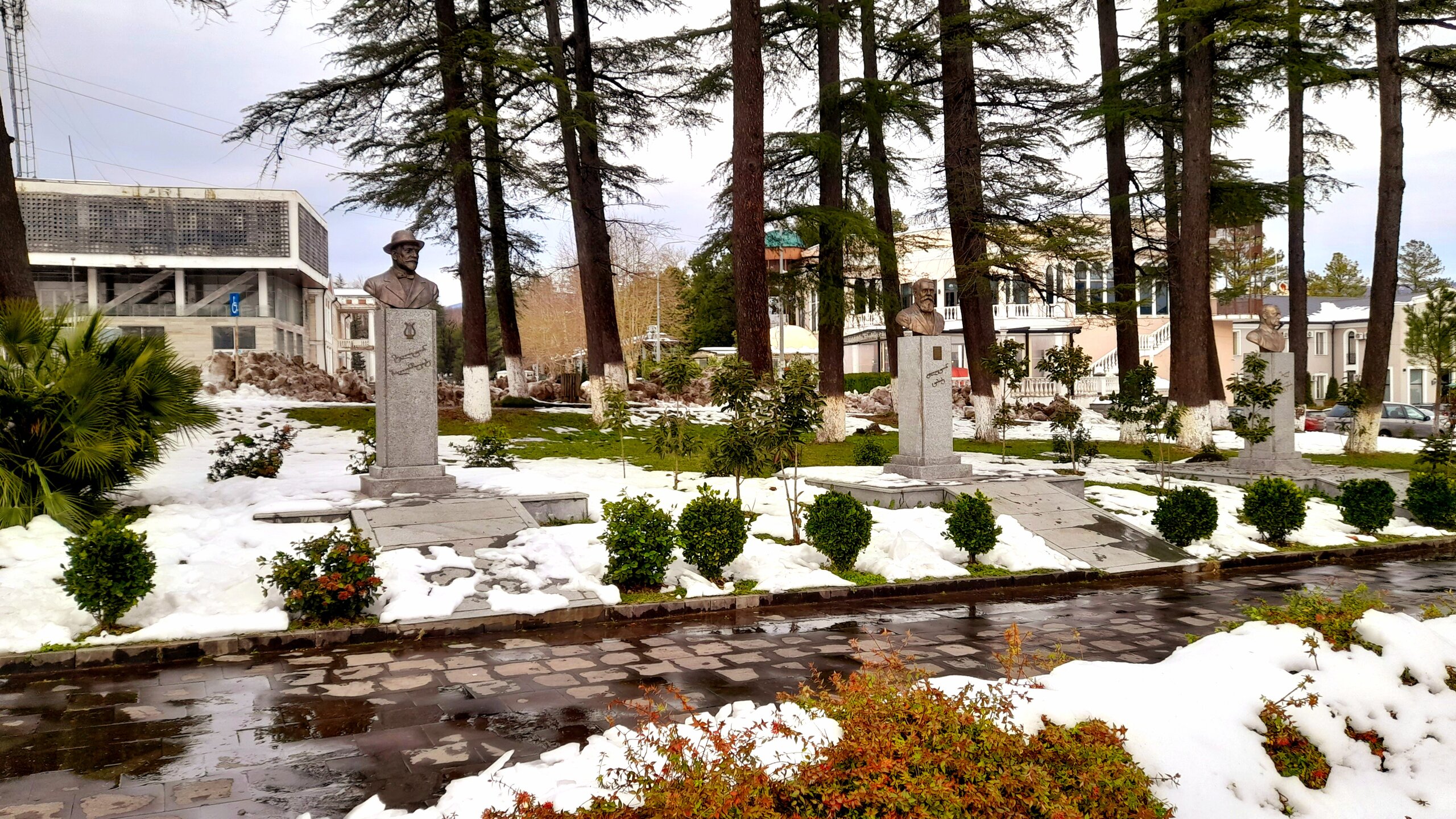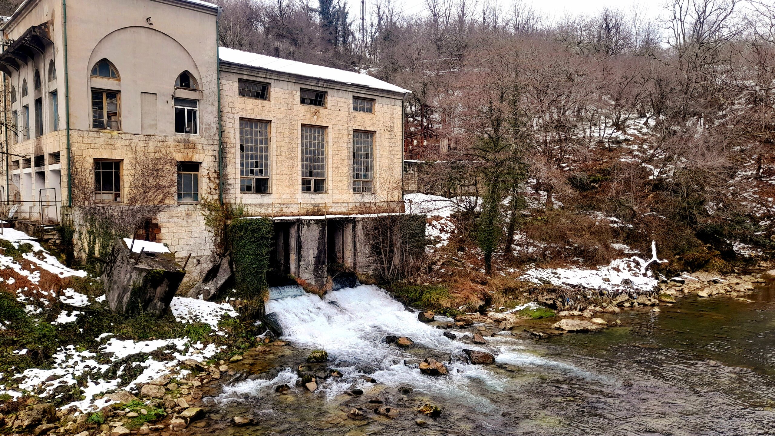 ЦХАЛТУБО. ПРОГУЛКА ПО ГОРОДУ. 4 января. Подъехали к заброшенному санаторию Центросоюза. Я поднялся в него, осмотрел несколько залов, мраморные колонны, внутренние строения. Но оставаться здесь далее было жутковато. Меня сопровождали несколько местных собак. Они в Грузии - везде, но большинство - чипированные. Для контраста следующим объектом стал Центральный парк Цхалтубо и Источник №6 (сталинский источник). Именно сюда приезжал Сталин. Вон на барельефе изображен Сталин в окружении народа. Далеко пройти не дано, рядом внутри уже находятся радоновые ванны. Прогуляться по парку не получилось. Везде сугробы снега, дорожки не чищены - продолжается празднование Нового года. Прошёл вдоль дороги до центрального входа. Уже при выезде из города остановились у южного входа в парк Ещё пара заброшек. Санаторий Железнодорожник. и санаторий Шахтёр, который, похоже, решили восстановить. Ну а теперь посмотрим новые отели в восстанавливаемом городе. Выезжаем в Кутаиси...
