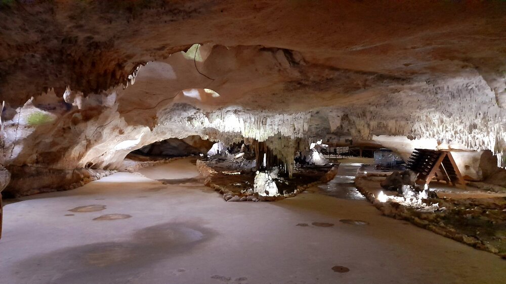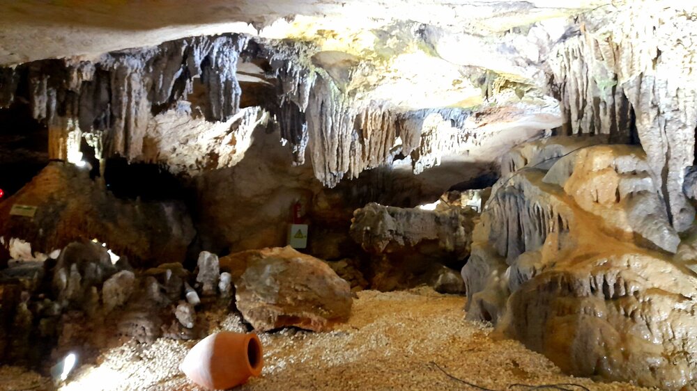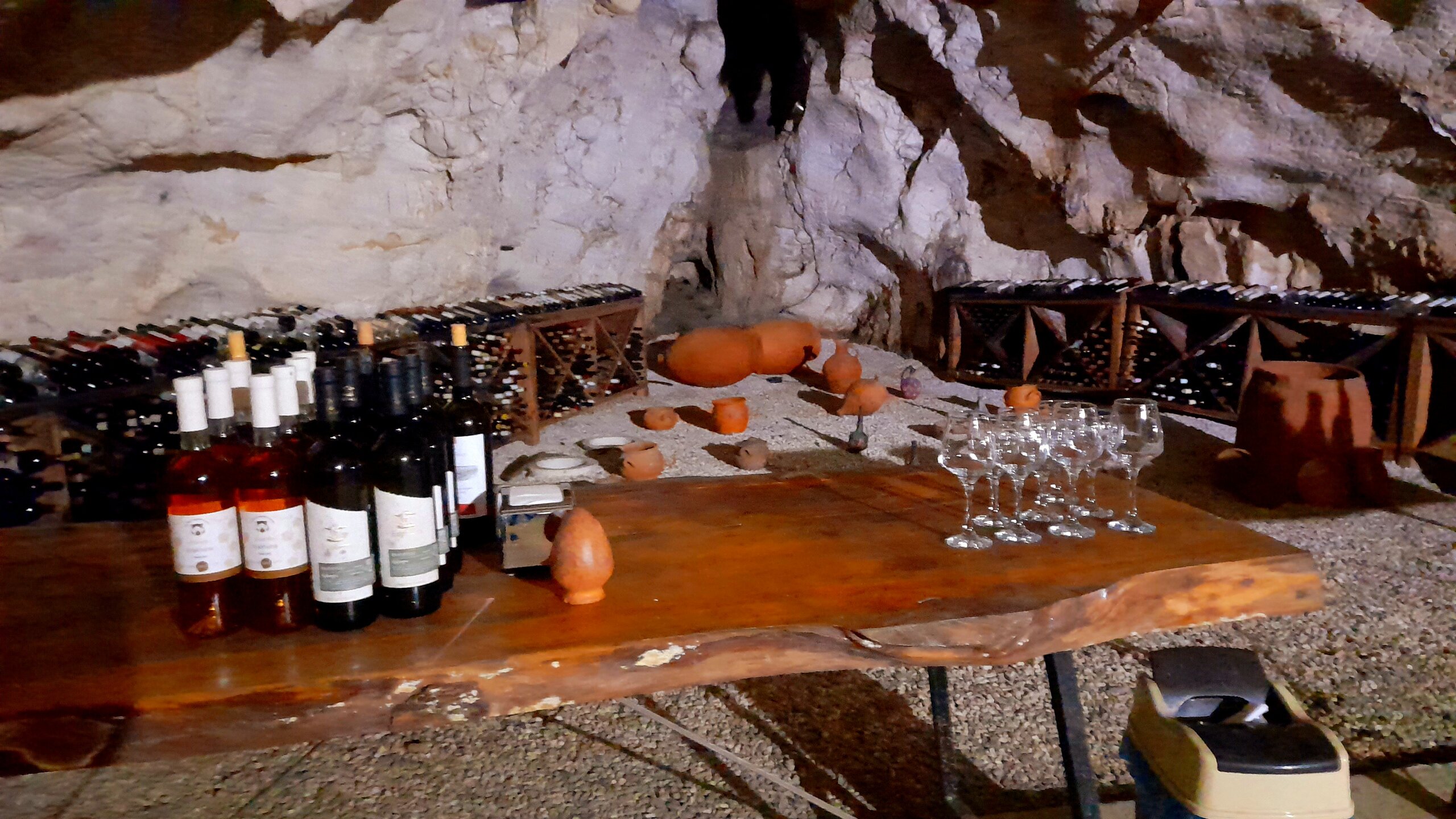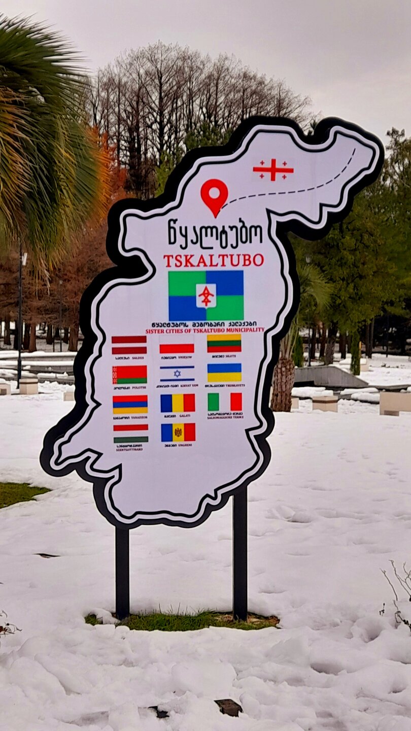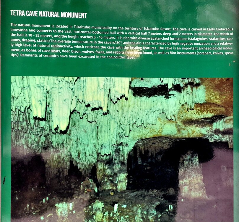 ЦХАЛТУБО. ПЕЩЕРА ТЕТРА. 4 января. Этот город в советское время был известным бальнеологическим курортом, ходил прямой поезд Москва- Цхалтубо. Здесь поправляла своё здоровье радоновыми ваннами советская элита. Побывал здесь в 1931 году и Сталин, после посещения которого курорт стал развиваться. Но распался Советский Союз, после грузино-абхазской войны 1992-93 гг сюда поселили беженцев из Абхазии. Сейчас многие санатории заброшены, Цхалтубо стали называть городом-призраком. Но постепенно восстанавливается инфраструктура, открываются спа-отели, по-прежнему действуют источники и лечебные ванны. Всё это я увидел. Но прежде, чем осматривать город, надо подкрепиться. Остановились около ресторана в центре города. После обеда поехали к пещерам Прометей. Та же история - пещеры сегодня закрыты! Водитель предложил провезти меня к другой пещере - Тетра (белая) в черте города. Она поменьше и не так известна, но хоть что-то посмотреть. Пещера Тетра одна из самых красивых и древних пещер Грузии. Пещера Тетра — это то место, где очень здорово придумали как использовать пространство. Благодаря постоянно одинаковой температуре в пещерах здесь идеальные условия для производства, выдержки и хранения вина в естественной среде. Кроме того, пещера Тетра предлагает дегустации, выдержанного именно здесь местного вина. Ну где ещё, кроме Грузии могли такое придумать? Но я сегодня не был настроен на дегустации из-за срыва сегодняшних планов. Природная радиация, высокий фон ионизации и чистота воздуха в пещере создают лучшие условия для лечения астмы, сердечно-сосудистых заболеваний, гипертонии, пневмонии и невроза. В Тетра проводятся оздоровительные спелеологические сеансы. Можно удобно расположится на лежаках и оздоравливаться. Возвращаемся в Цхалтубо.