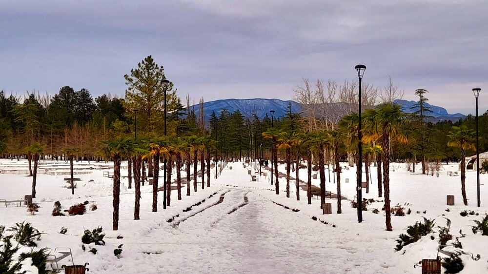 БАТУМСКИЙ БОТАНИЧЕСКИЙ САД. 2 января. Сегодняшний день я планировал посетить парковые зоны к северу от Батуми. Это - Батумский ботанический сад (в 9 км от города), банановую рощу близ Цихисдзири, крепость Петра, в поселке Шекветили -парк грузинских миниатюр, парк музыкантов, дендропарк (в 45 км от Батуми). Чтобы всё это посмотреть воспользовался вполне приемлемыми по ценам услугами русскоговорящих водителей иномарок от агрегатора gotrip.ge . Стоимость поездки фиксированная независимо от времени простоя водителя, пока я смотрю достопримечательности. В 9 часов утра у отеля меня поджидала заказанная машина. Маршрут составил так, чтобы завершить свою программу дальней от Батуми точкой, а уже возвращаться назад можно и в темноте. По дороге в Ботанический сад остановился на железнодорожного вокзала, чтобы купить билет на поезд до аэропорта Кутаиси на 4 января, где у меня была заказана для дальнейшего путешествия ещё одна машина. В кассе билетов на этот утренний поезд не оказалось (раскупили всё до 7 января). Предложили билет на местную электричку, но она отправлялась в 10.50 и терять полдня мне не хотелось. Удалось приобрести только обратный билет из Тбилиси в Батуми на 10 января. Мы уже отъехали от вокзала, когда водитель сказал, что там рядом отправляются в Кутаиси автобусы и на обратном пути купим в кассах билеты. Но я настоял, чтобы он развернулся к этим кассам сейчас - мне так было спокойнее. Автобусные кассы были закрыты, более того, висело объявление на грузинском и английском языках, что автобусные кассы переехали на Гоголя 11. Я согласился заехать по этому адресу на обратном пути. К ботаническому саду подъехали в 9.40, он был закрыт. Но производящий уборку прилегающей территории дворник сказал, что в 10 часов он откроется. И действительно открылся. Оплатил 20 лари за вход. Батумский ботанический сад раскинулся на более чем 100 гектарах, только в длину на 5 км. А сколько ещё локаций в ширину. Основан он был в 1912 году академиком Андреем Красновым. В саду можно встретить растения из Австралии и Гималаев. Идею пройти весь парк пешком и выйти с другой стороны сада в Чакви я отверг. У меня не было с собой оплаченной интернет или телефонной связи, где бы я искал водителя. Поэтому я пообещал часа через полтора-два вернуться. Дорога сразу же пошла под уклоном вверх. Открылся вид на неспокойное море и вдали на центральную часть Батуми. Красивые краски клёна. Одна из смотровых площадок на море, железную дорогу, показавшуюся после тоннеля, вдали еле видны белые шапки Кавказского хребта. Довольно обширная зона цитрусовых. Встретилась группа туристов, некоторые из них несли охапками мандарины. Интересно, вкусные? Поднимаюсь всё выше. А в этом особняке находится администрация сада, но сегодня здесь никого нет. Магнолия отцветает, но на некоторых деревьях ещё много ярко красных цветов. А сколько их уже опало. Наверно самая высокая точка ботанического сада, появился снег. Где-то внизу журчала вода и к ней вели ступеньки с табличкой "Этнографический уголок". И действительно, в беседке под стеклом находилась мини - этнографическая деревня А неподалеку от неё беседка с картинками цветущих в ботаническом саду растений, в том числе эндемиков. Пора возвращаться назад. Вышка для зиплайна, одно из развлечений в саду в тёплое время года. На этот раз белая камелия. На этом осмотр 