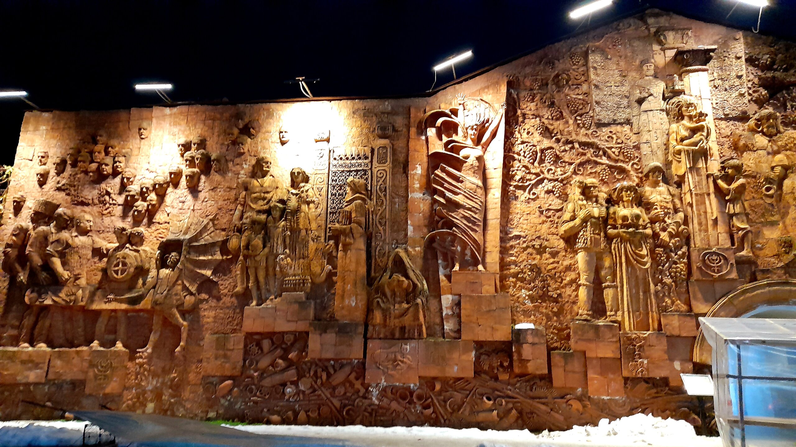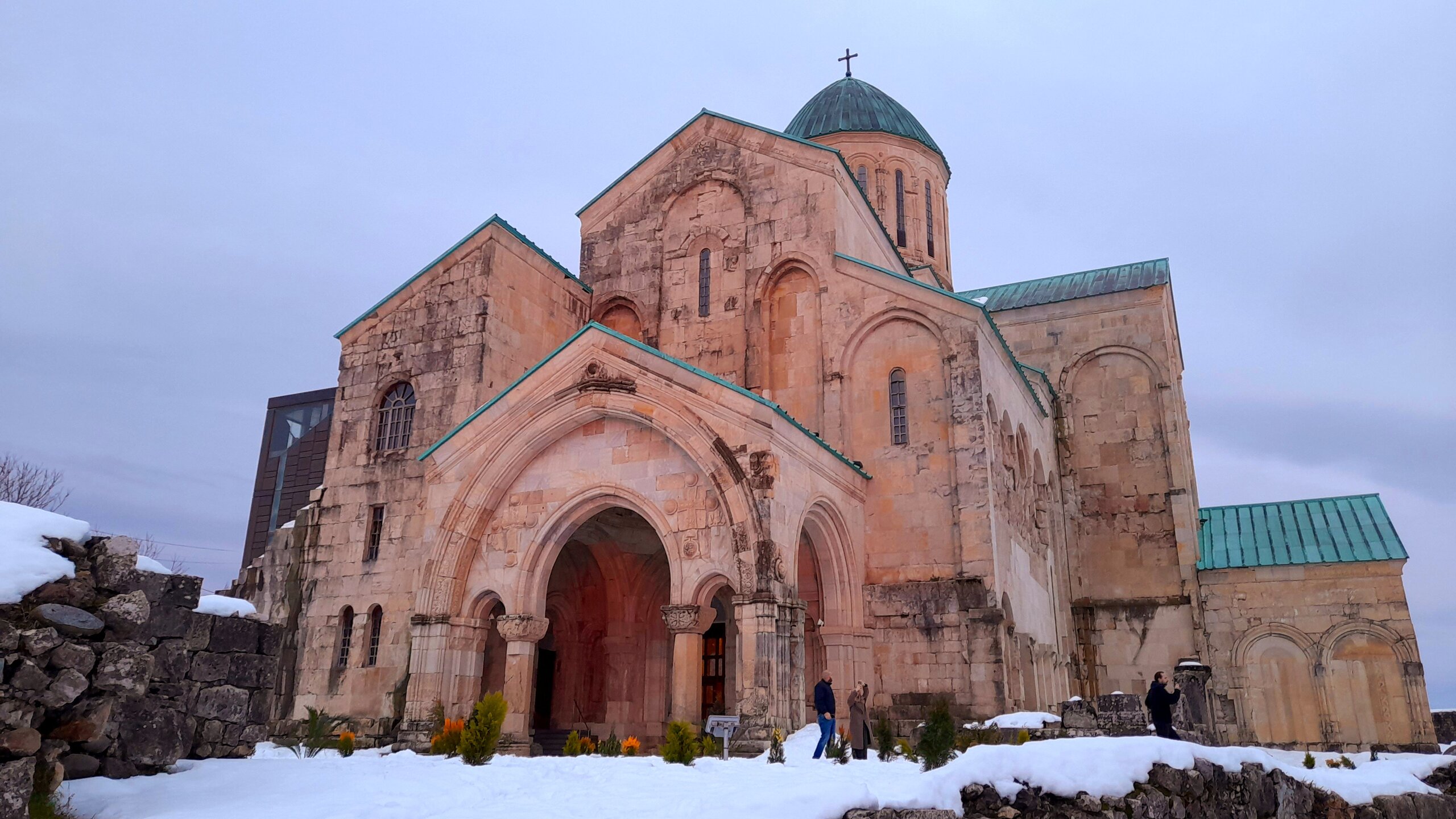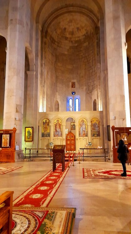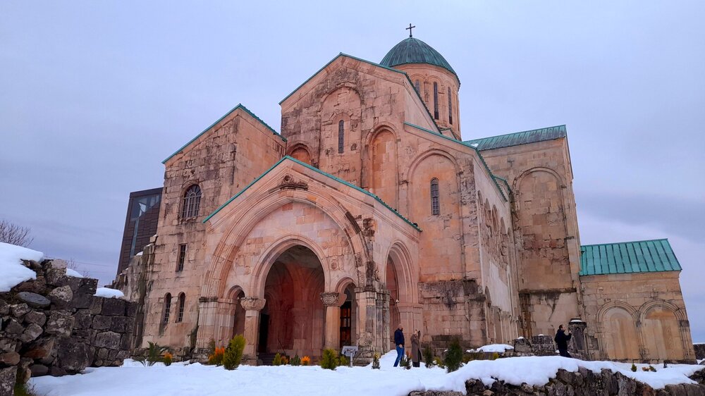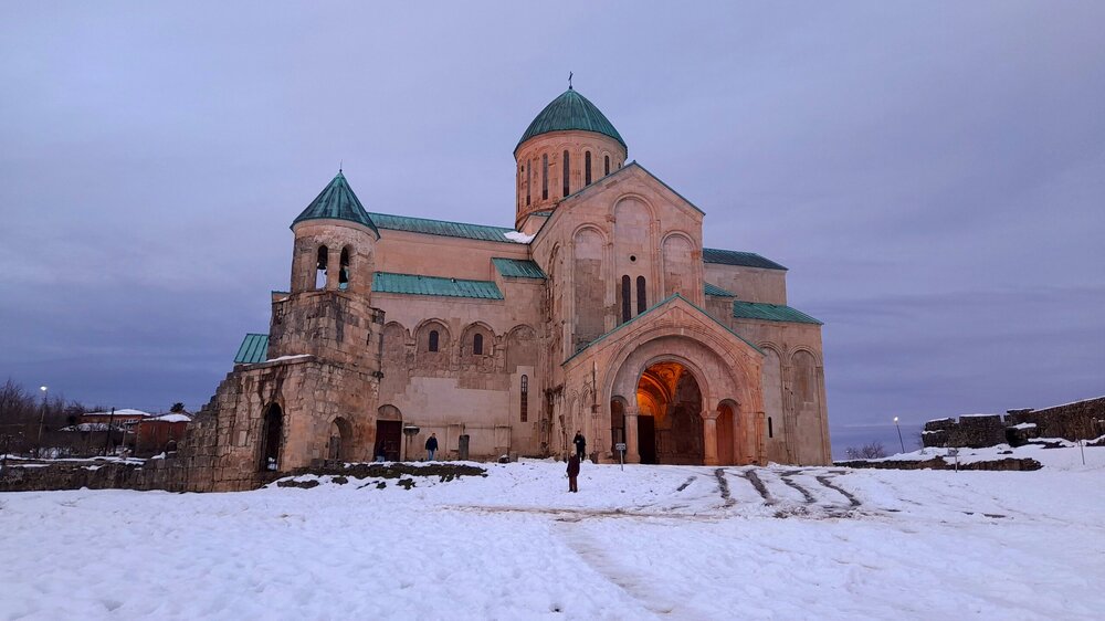 КУТАИСИ. ХРАМ БАГРАТА. 4 января. Въезжаем в Кутаиси и перед заселением в отель, поднимаюсь на холм Укимериони, где расположен величественный по размерам (35 х 43 м) храм Баграта в виде креста с тремя апсидами. Возведённый ещё в 1003 году при царе Баграте III, простоял более 6 веков. В 1089 году здесь был коронован Давид Строитель. В конце XVII века Кутаиси был взят турками. Устроив в храме оружейный склад, они его погубили - взорвался порох и снёс купол храма и часть стен. В 1770 году Кутаиси осадили русские войска и также нанесли урон храму. Кое-какая реставрация началась в 1952 году, в 1974 году он был внесён в списки ЮНЕСКО. И только в XXI веке, в 2012 году завершилась его реконструкция. Но пристроенный к храму стеклянный лифт и черные стальные колонны внутри испортили восприятие храма Баграта, как древнее сооружение. ЮНЕСКО вывел его из списка Всемирного наследия. С 2001 года храм вернули церкви и его официальное название - собор Успения Пресвятой Богородицы. С вершины холма Укимериони открывается великолепный вид на весь город Кутаиси. Зашёл посмотреть внутрь храма. Отель у меня в центре города, ещё есть время выйти на вечернюю прогулку по Кутаиси...