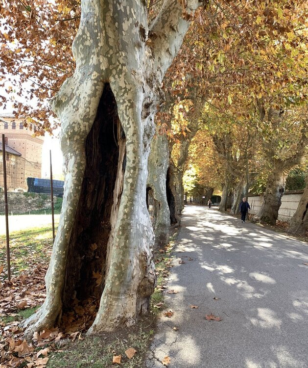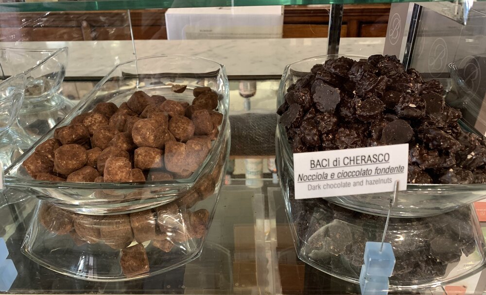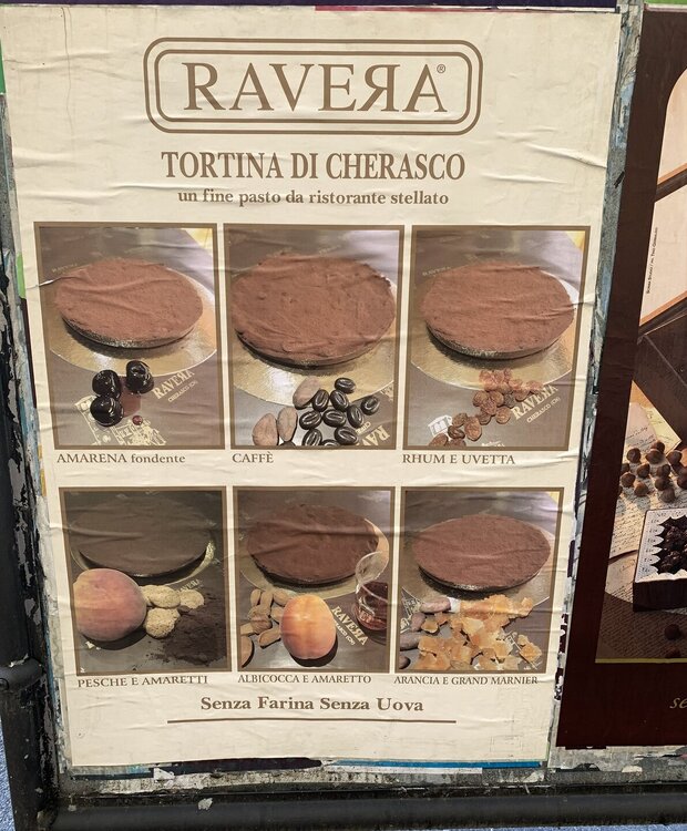 Кераско (продолжение). Санктуарий Мадонна делла Грацие. Святилище было построено на старинной фреске с изображением Богоматери с Младенцем, написанной на колонне XIII века, которая позже была расширена и преобразована в часовню. Всего в нескольких шагах от центра Кераско проходит небольшой прогулочный маршрут Sentiero del bacio. Очень приятное место для отдыха и созерцания окружающих пейзажей. Прогулялась и я по ней. Тропа выводит к средневековому замку. Он был построен в XIV веке Лукино Висконти, правителем Милана и частично реконструирован в начале XX века. Сейчас замок в частной собственности. Параллельно замку идет платановая аллея, которой более двухсот лет. Говорят, что высадить деревья распорядился сам император Наполеон, захвативший город после ожесточенных боев, длившихся целые сутки. Глядя на платаны, верится в их почтенный возраст. Может кто знает, что это за вершина? Pasticceria Barbero - одна из старейших кондитерских в Кераско, где можно найти Baci di Cherasco, конфеты из орехов и шоколада. Я их видела и на ярмарке в Альбе, но купить решила здесь. Нуга с орехами тоже очень вкусная. Гуляя по городу увидела еще один специалитет, жаль, что только на рекламном щите. «Tortina di Cherasco» — это изысканное шоколадное лакомство из города Кераско представляющее собой тонкое печенье с темным шоколадом, изюмом и ромом. Текстура тонкая, хрустящая снаружи, с мягкой начинкой. Мне кажется, что больше похоже на пирог Позже я их увидела в продаже в Турине. Но из-за размера и цены покупать не стала. В одиночку я бы его все равно не съела, а для дома сладких сувениров уже было достаточно. А еще Кераско – город улиток. В сентябре здесь проводится Фестиваль улиток. Но и вне Фестиваля этот продукт можно найти в меню местных ресторанов. И я не могла уехать, не попробовав их. В понедельник был открыт один-единственный ресторан на главной улице. Справедливости ради, французские улитки мне понравились больше. И ореховый торт мне здесь не понравился. У меня вкуснее получилось:)) И ещё я здесь убедилась, как тесен мир, и как Вселенная иногда преподносит сюрпризы. В ресторане я встретила и познакомилась с известным в кругу самостоятельных путешественников владельцем одного сайта. Интересно ещё то, что я знала, что он поедет осенью в эти края, но не знала в какие даты. И тогда в голове мелькнула мысль, а вдруг мы пересечёмся где-то. Пересеклись:) Получилось в точности, как и со знакомством с Олей из Абакана. Промелькнувшая в голове мысль, вдруг воплощается в реальную встречу.
