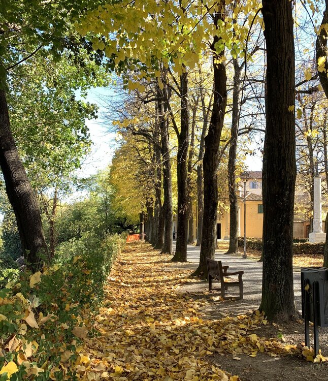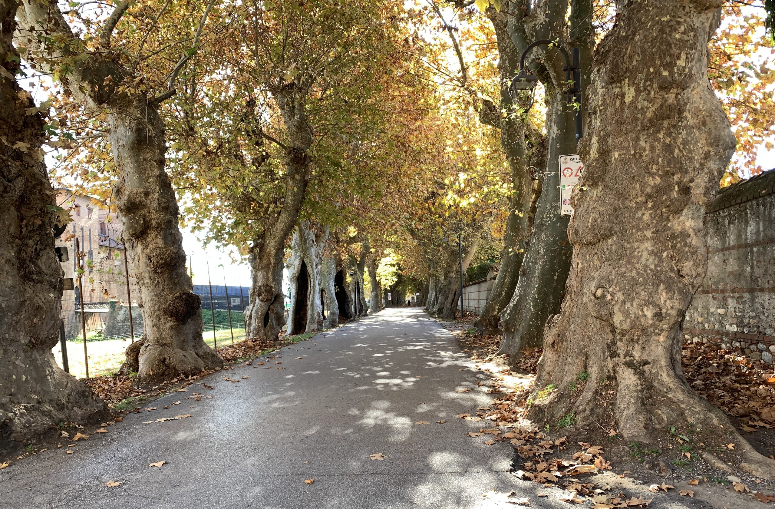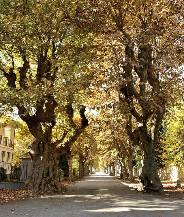 Следующее утро началось не только с кофе, но и с сожаления. Глядя на низкие облака, висящие на склонах окружающих озеро гор, поняла, что моей прогулке по склону горы Монторфано вдоль озера Мергоццо не суждено сбыться. Вербания. Но печаль моя была недолгой, в округе еще много чего интересного. Решила ехать в соседнюю Вербанию, на которую поглядывала, но из-за «планов громадьё», она никак не вписывалась в эту поездку. Автобусы до Вербании ходят каждые 20 минут, и остановка всего в пяти минутах от отеля. Правда, чем там заниматься в дождь, я не представляла, потому что ехала без какой-либо подготовки. Но в Вербании есть Вилла Таранто. А вот фотографий, как выглядит территория виллы поздней осенью и которые бы меня впечатлили, я не нашла, поэтому тогда решила, что мне пока туда не надо. Но Вселенная решила иначе, и, забегая вперед, скажу, что очень правильно решила. Пока ехала в автобусе, начался довольно сильный дождь и, проезжая мимо горы Монторфано, увидела, что она сплошь затянута облаками. Значит, не судьба мне там погулять в этот раз. Вместе с озером Мергоццо и горой Монторфано "отвалилась" и Вогонья, входящая в список самых красивых деревень Италии. Теперь вот думаю, может снова вернуться в эти края... Вербания разместилась на берегу озера Маджоре, на северной оконечности залива Борромео, на треугольном мысе, и по данным природозащитной организации "Legambiente", по всем экологическим показателям является лучшим городом в Италии. Образовалась Вербания от слияния небольших городков Палланца и Интра и в настоящее время является главным городом провинции Вербано-Кузио-Оссола, и как большинсво итальянских городов имеет древнее происхождение и богатую историю. Из автобуса вышла на остановке Палланца, решила что исторический центр должен быть где-то здесь. На моё счастье дождь к этому времени закончился и больше не начинался, хотя и было пасмурно. Нырнув в одну из узких улочек, ведущих к озеру, выхожу на набережную. А здесь намечается какой-то праздник, устанавливаются столы и жарятся каштаны. Прямо напротив Вербании находится респектабельная Стреза. Гранд Отель виден на переднем плане. Думаю, многие гуляли мимо него. И у меня хорошие воспоминания об этих местах. Монументальное сооружение - Мавзолей Луиджи Кадорна - главнокомандующего Итальянской Королевской армией во время Первой Мировой войны. Родился он в Палланце, здесь и похоронен. Памятник павшим, открытый в 1923 году в присутствии принца Умберто Савойского, изображает молодую женщину с ребенком на руках, возлагающую цветы на место захоронения своего мужа, погибшего на войне. Я так и не нашла ходит ли какой-нибудь общественный транспорт в район Виллы Таранто, поэтому решила идти пешком вдоль озера. Дорога туда занимает примерно тридцать минут по улице с красивыми виллами, иногда открывается вид на озеро.