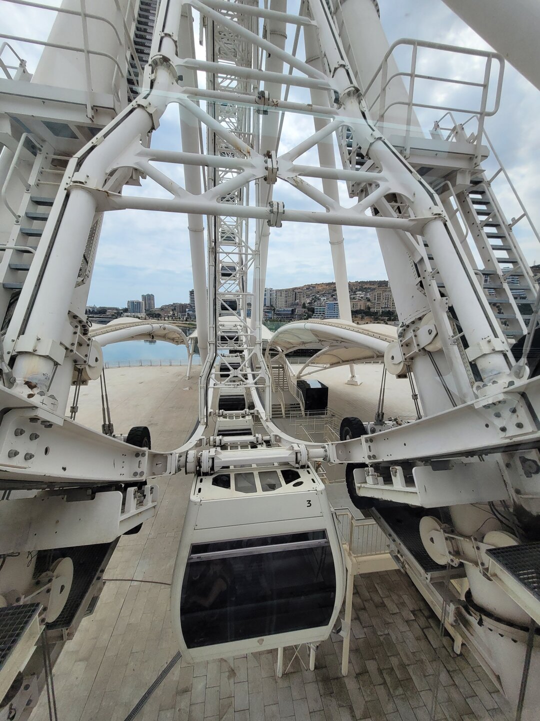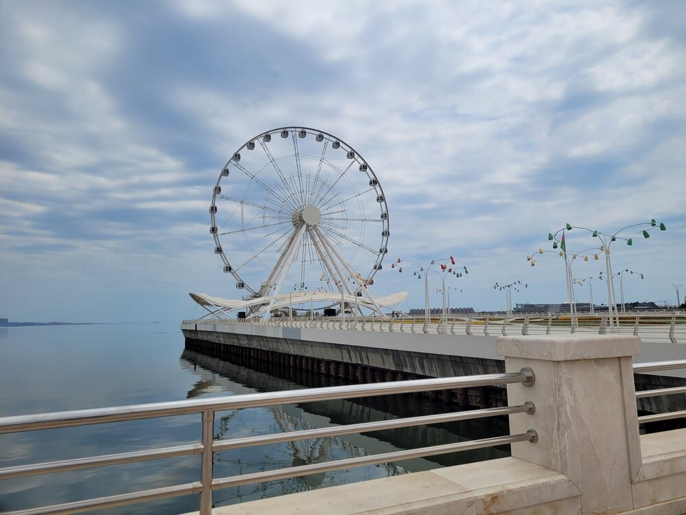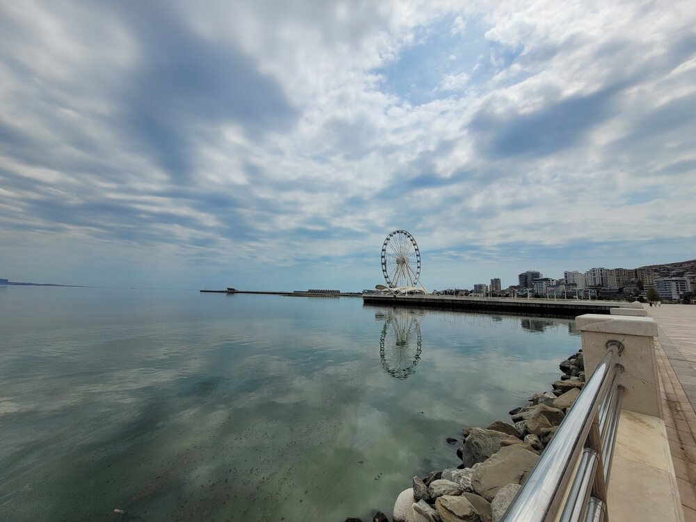 Гуляя по набережной, пройти колесо обозрения не получится, уж очень удачно оно расположено И именно колесо обозрения предлагает посетителям уникальную возможность насладиться захватывающими панорамными видами. С его высоты открывается великолепный обзор как на современный городской пейзаж Баку, так и на бескрайние морские просторы. Поездка на колесе обозрения позволяет оценить масштаб города и красоту его прибрежной линии. Но есть одно но... это блики. Увы, от них никуда не деться. Безусловно, будучи в Баку, на колесе обозрения прокатиться стоит. Даже если и не получится сфотографировать всё без бликов, зато с высоты птичьего полёта открывается великолепный вид на Баку и на Каспийское море