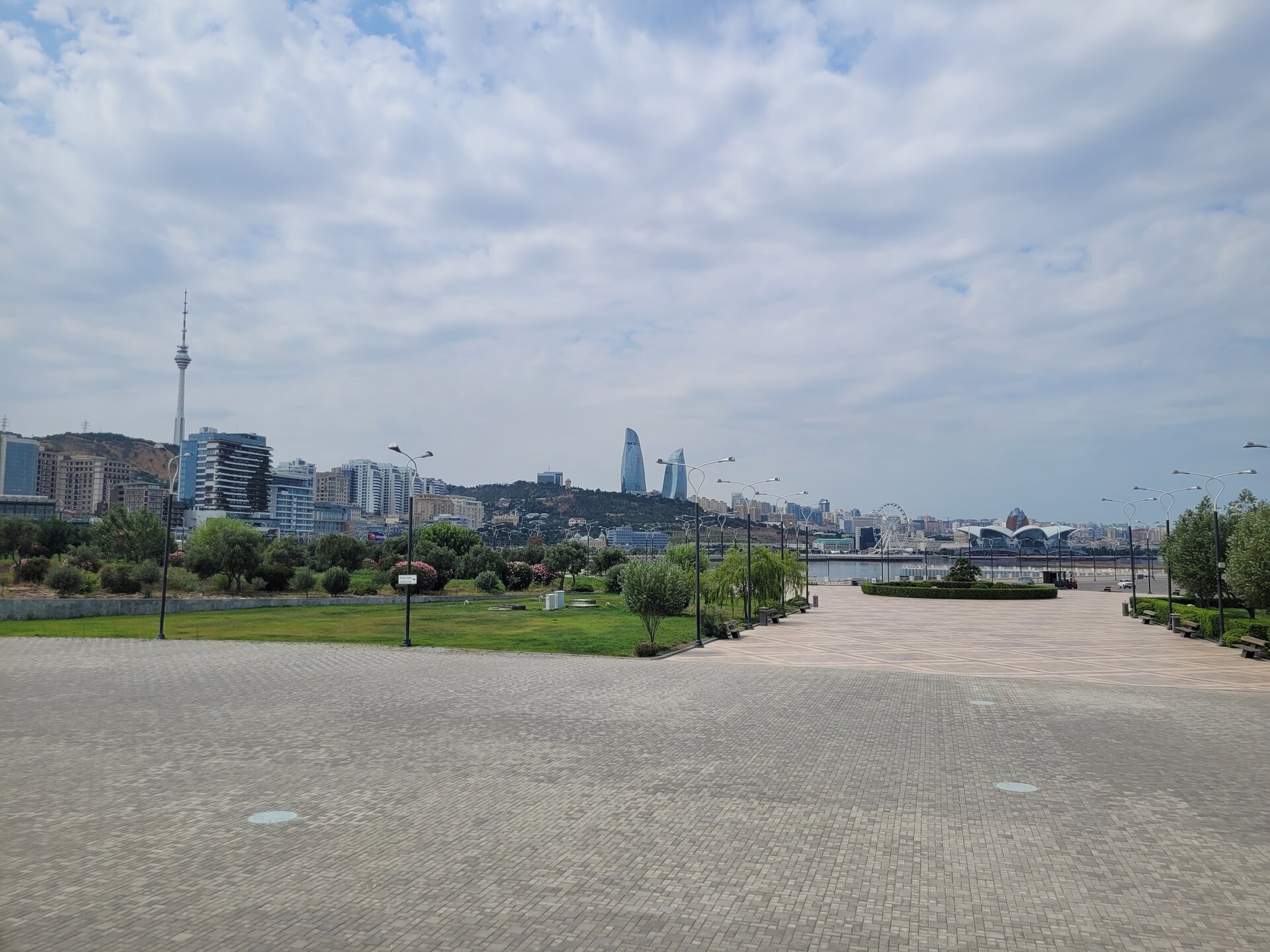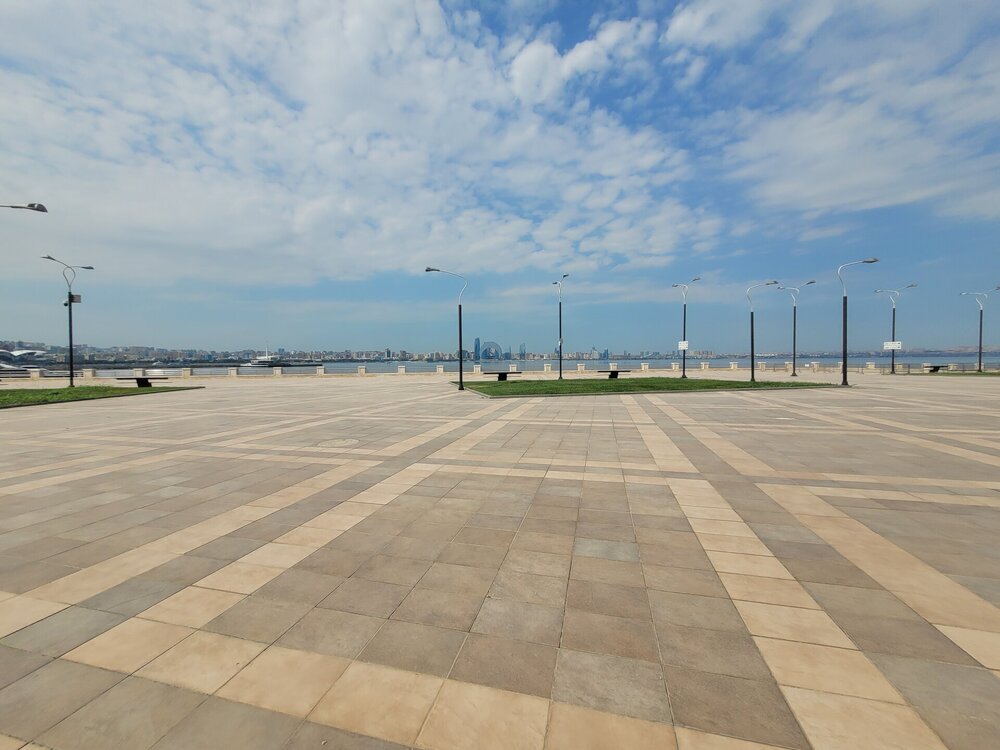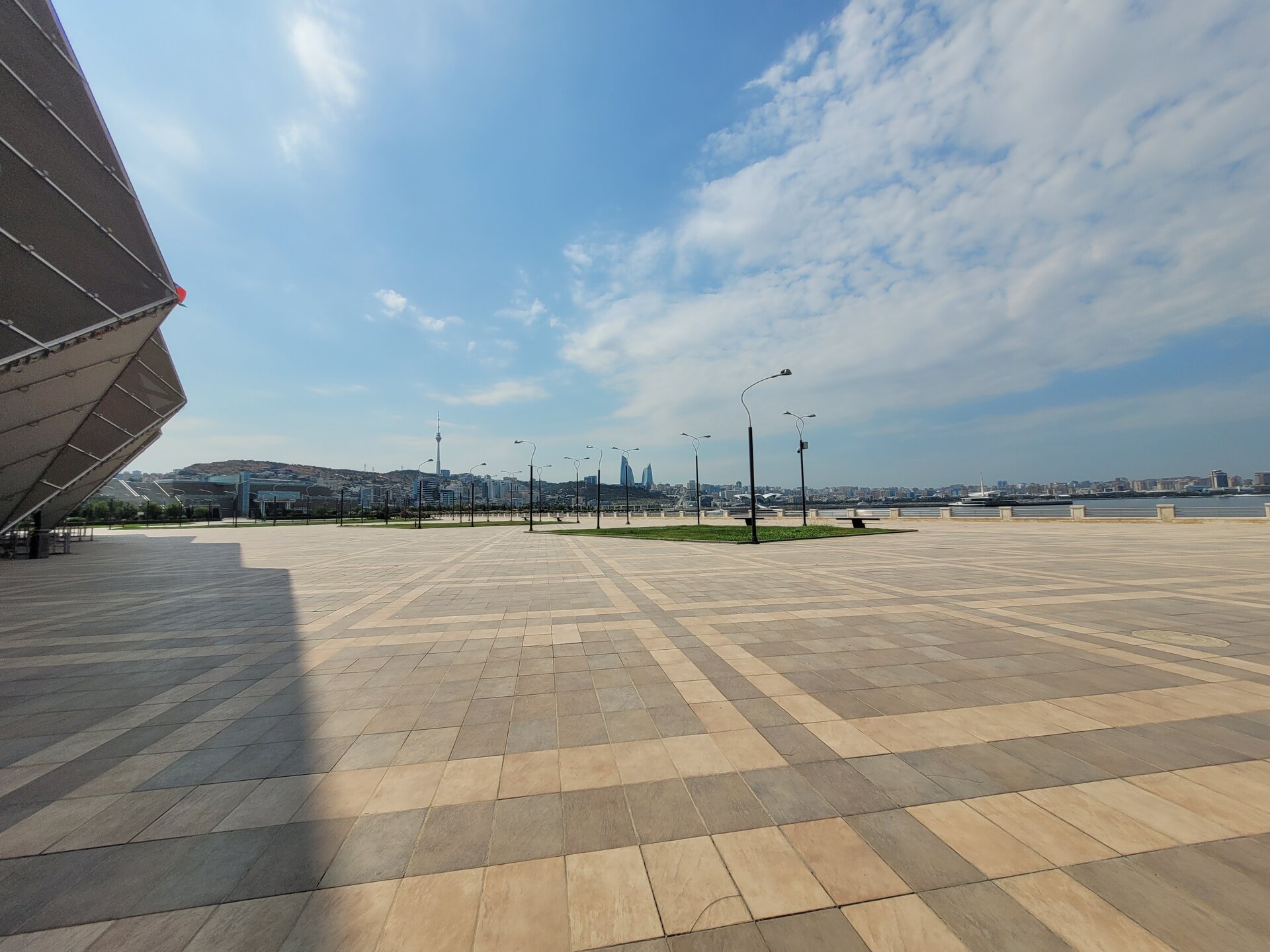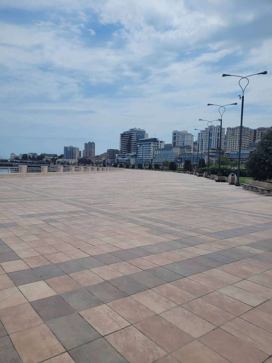 После колеса обозрения мы пошли дальше вдоль Каспийского моря, которое по сути оставляло желать лучшего и не просто так в пределах города запрещено купаться. Вряд ли найдутся такие отважные люди, которые захотят искупнуться в такой водичке. / Отсюда открывался впечатляющий вид на противоположный берег. Ещё раз повторюсь, именно около того здания, в виде полумесяца и можно посмотреть цветомузыкальный фонтан. И совсем недавно мы были практически там. Ну, идём дальше по Бакинскому бульвару, который часто часто называют «бриллиантовым ожерельем Баку». Это название как нельзя лучше отражает его красоту, особенно в вечернее время, когда включается подсветка. Бульвар играет важную роль в городской жизни, служа популярным местом для встреч, культурного досуга и просто приятного времяпрепровождения. Бакинский бульвар - это знаменитая набережная и одна из главных достопримечательностей Баку, столицы Азербайджана. Протянувшись на многие километры вдоль живописного побережья Каспийского моря, он по праву считается одним из самых красивых и ухоженных приморских парков не только в стране, но и во всем регионе. И сейчас о чём я жалею, что в один из вечеров мы в полной мере не прогулялись ещё раз по нему. А когда мы здесь гуляли днём, я честно сказать удивлялась, время вроде и не утреннее, но людей не было от слова совсем. Мы реально были одни. Ну, а наша цель - площадь Государственного флага, до которой нам было ещё идти и идти.