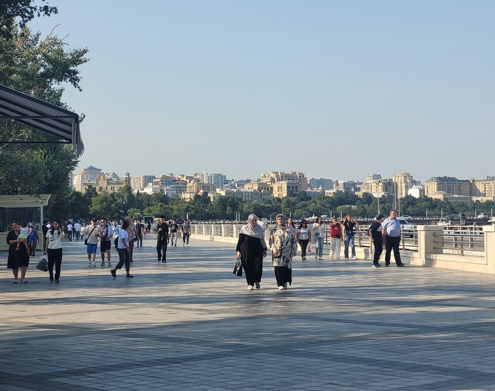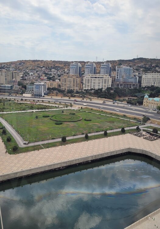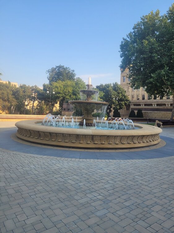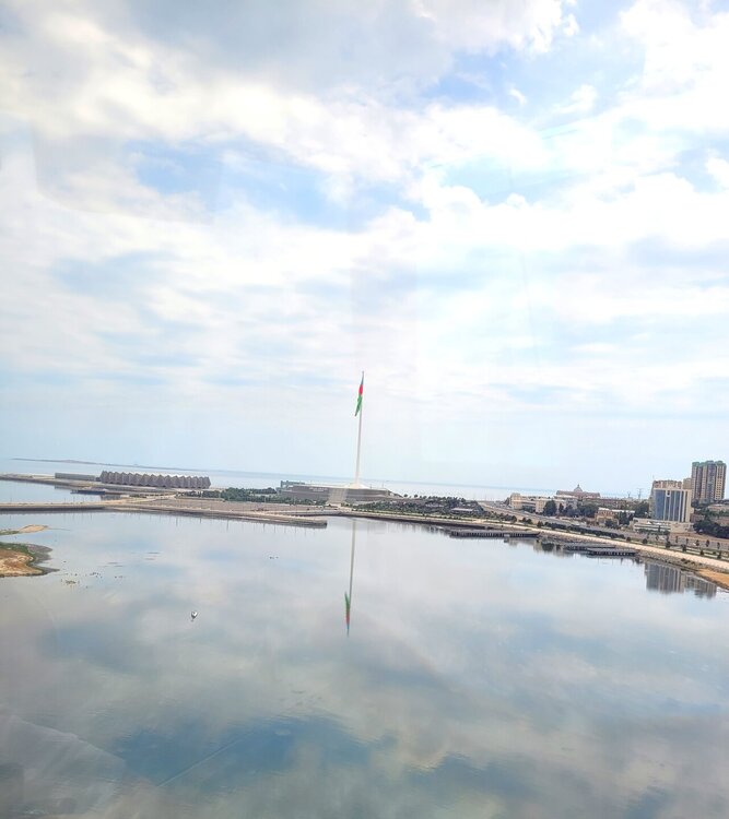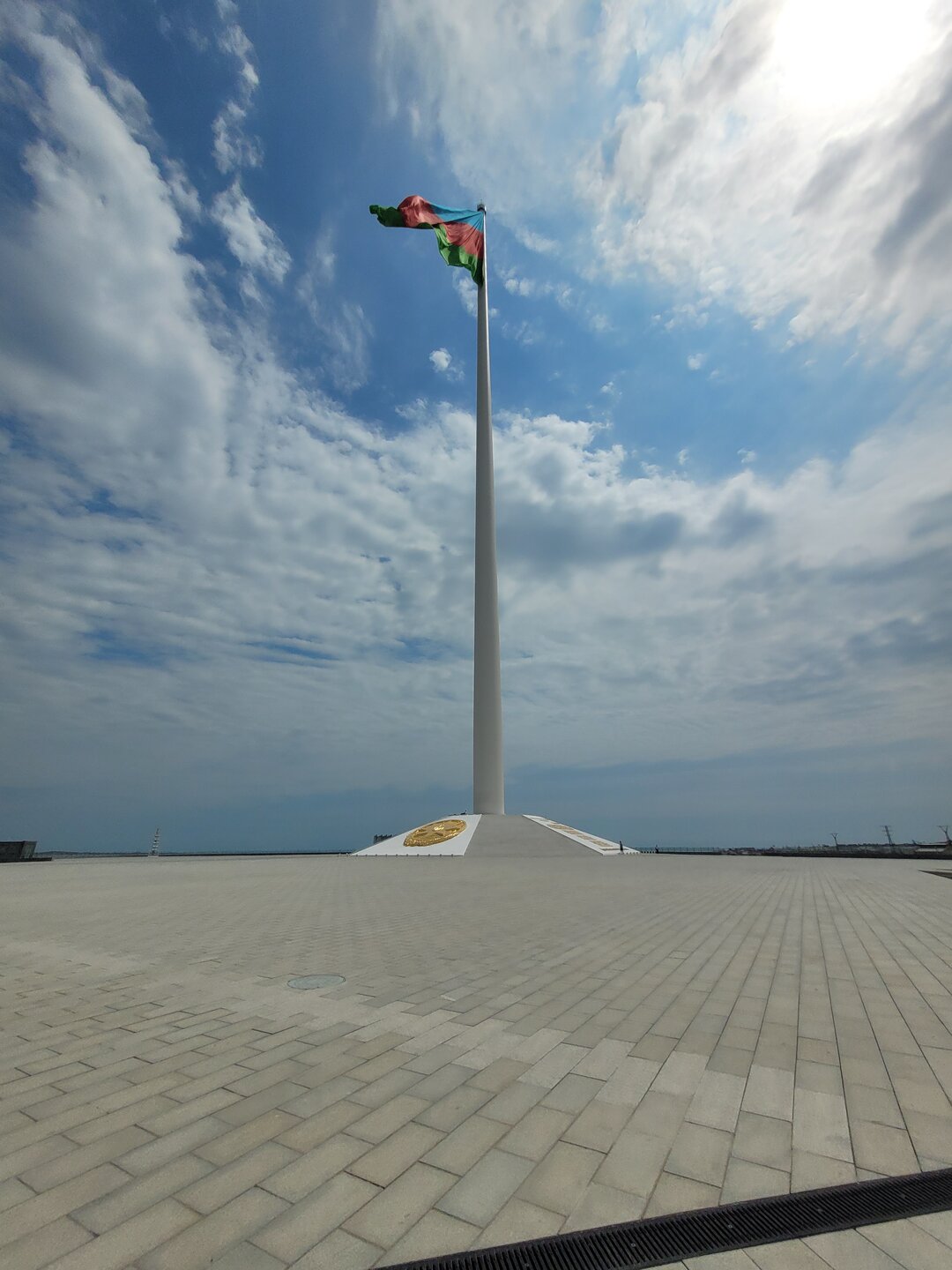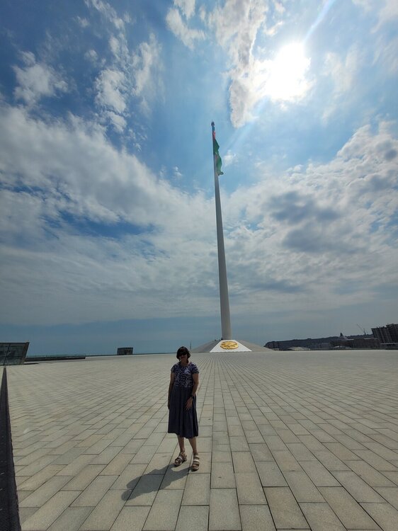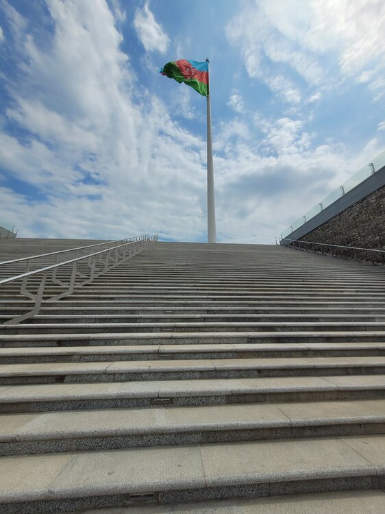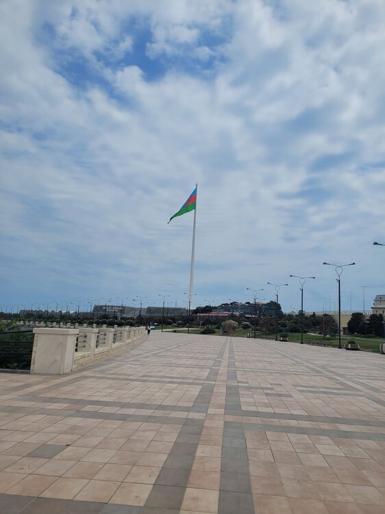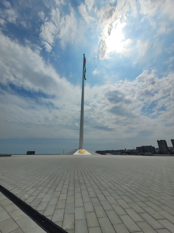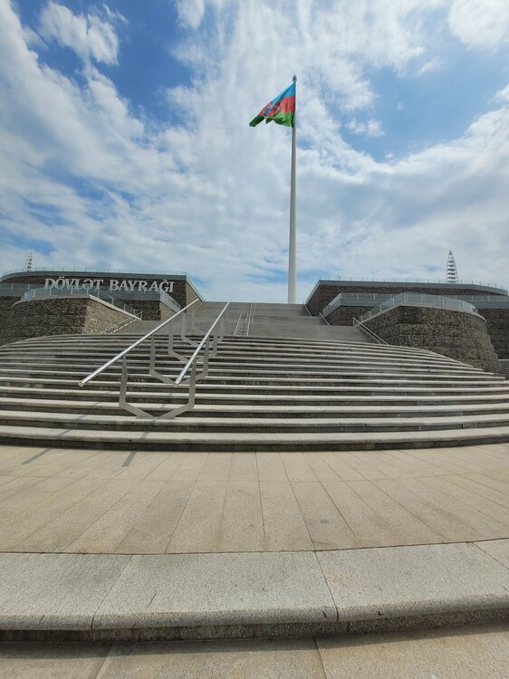20250726_141445.mp4 Как говорят, на этой площади расположен не просто огромный или большой флаг, а реально гигантский. Со стороны, вернее издалека, он не казался таким уж большим, флаг и флаг, но когда мы подошли почти вплотную к этой площади, вот тогда и стало понятно, насколько флагшток огромный, да и флаг был не меньше. Открытие площади состоялось 1 сентября 2010 года. До 2011 г. флагшток, который был установлен на площади, считался самым высоким в мире - 162 м и даже попал в Книгу рекордов Гиннесса. Но затем это достижение перебил Душанбе. В 2017 году Площадь Государственного флага и музей были закрыты на ремонт в связи с реставрационными работами. И лишь спустя 6 лет, в 2024 году вновь открыты. И с того дня, самый большой флаг в мире развевается на этой площади. Вес флага впечатляет - 350 килограмм, а высота флагштока - 191 метр, что тоже впечатляет. Но именно здесь, на этой площади, все стереотипы о том, что Баку - город сильный ветров, разрушился напрочь. Находясь на этой площади, рядом с таким мощным флагштоком и не менее величественным флагом, ну как было не сфотографироваться на их фоне. Но не тут то было. Я хотела, чтобы он прям развивался. Но нет, флаг просто упал и ему было всё-равно, чего хотела я. При чём, когда мы ещё только поднимались, флаг как порядочный развевался во все стороны, показывая нам, насколько он мощный. Но стоило нам подняться, флаг решил, что пока мы поднимались, разглядели его во всех ракурсах и он тут же сразу опустился. Честно сказать, я пыталась с ним как-то договориться, но увы, флаг никак не хотел больше развеваться. Я честно сказать ещё на что-то надеялась, но никакие уговоры на флаг не действовали. И да, место выбрано для площади не случайно, именно отсюда национальный флаг можно увидеть из разных точек столицы. На площади также создан Музей Государственного флага. Я сначала рассматривала его для посещения, но всё же отказалась этой идеи. Что могу сказать? Площадь очень красивая. Очень ухоженная набережная. Народ относится невероятно бережно и с любовью ко всему, что связано с их страной. И очень заметно, что правителям страны, также, не все-равно в каком состоянии находится их город.