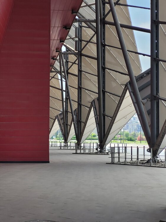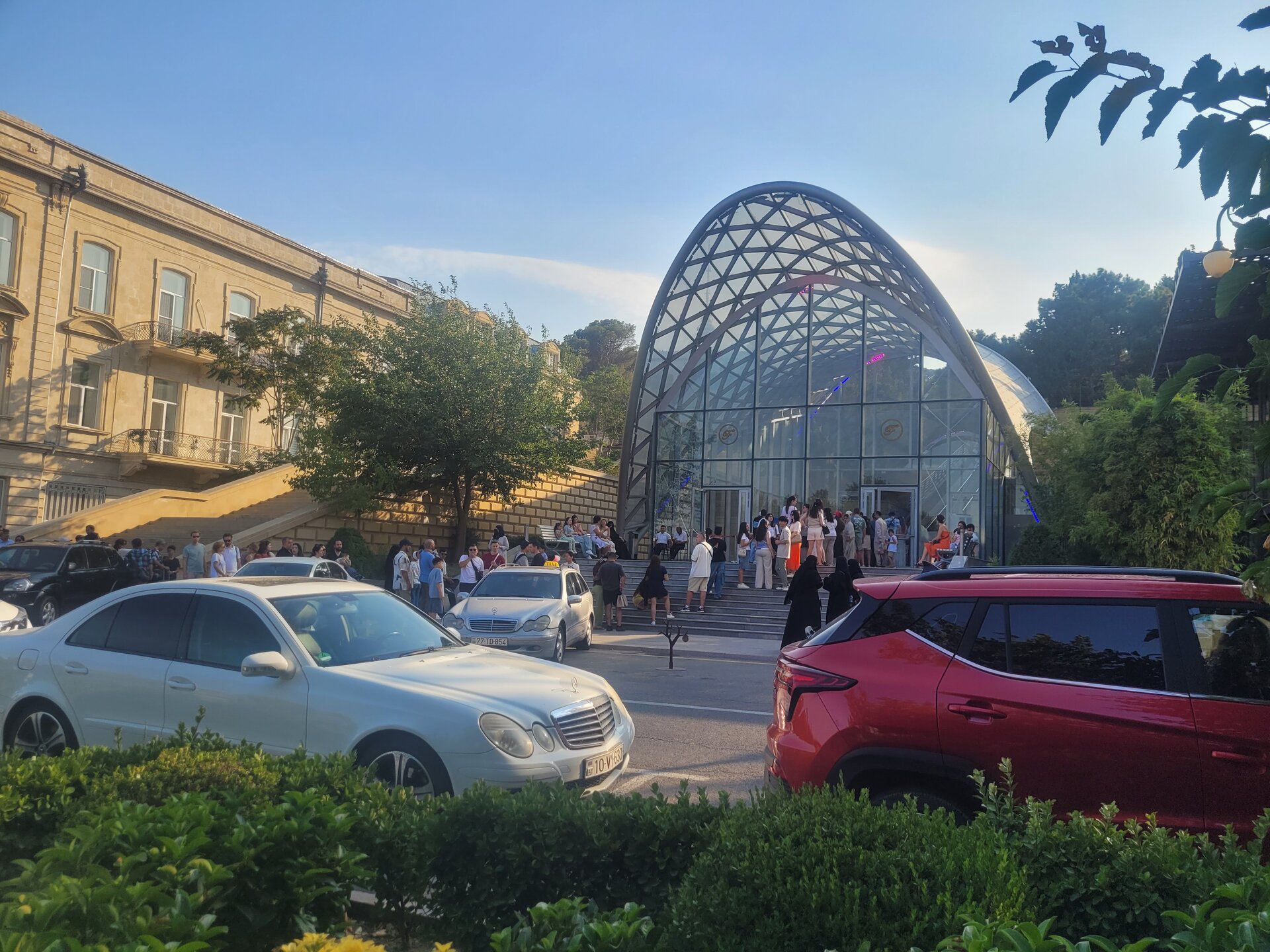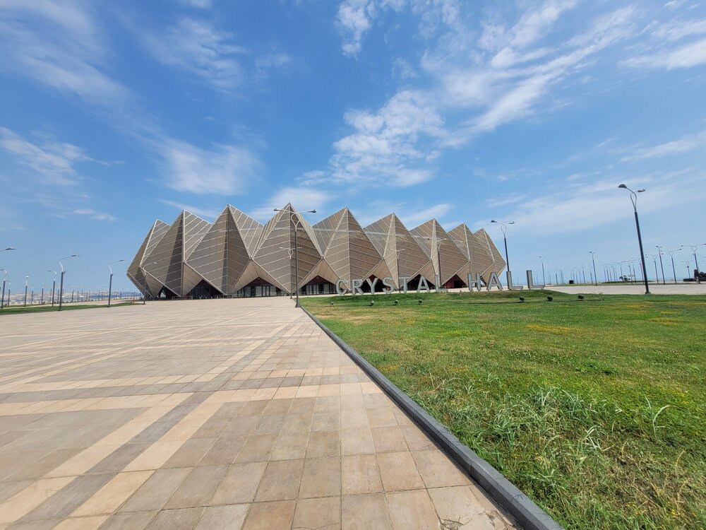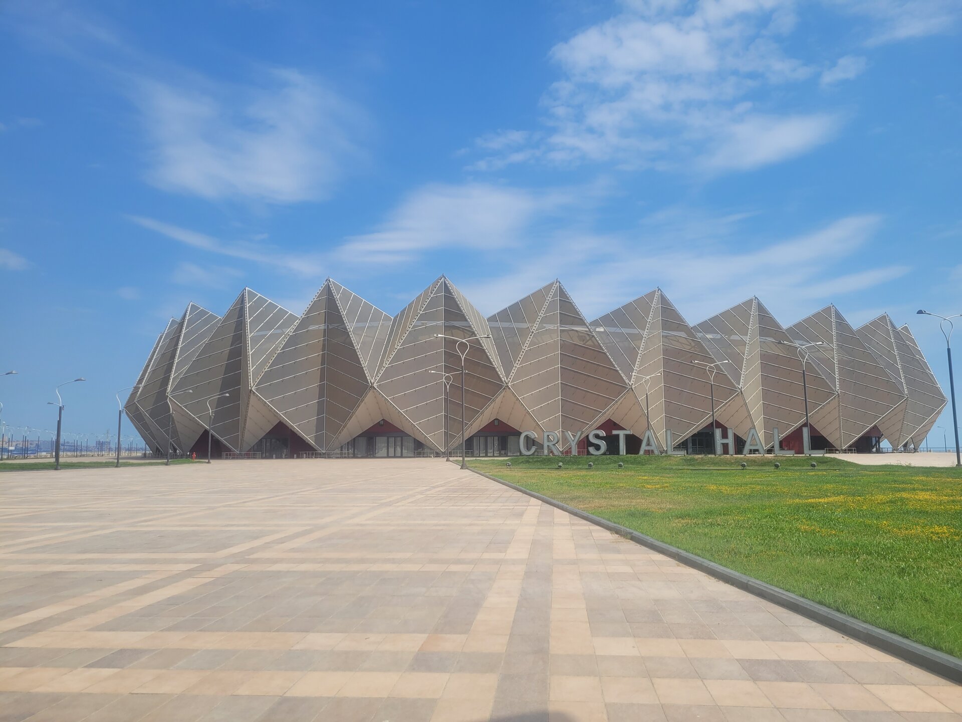 Как мы поняли, внизу расположен музей государственного флага. И что привлекло наше внимание, так это укрепление. Вот такая сетка была натянута вдоль всего периметра здания. Наверное, чтобы камушки не выпадали. Может желающие были поковыряться в стене, именно поэтому натянули сетку, чтобы такого желания не возникало. В общем, версий было несколько, возможно, с какой-то из них мы попали в точку. И вот он самый, ради чего мы проделали такой путь и как я писала ранее, дочу именно это здание и грело душу и давало силы, чтобы идти дальше. 20250726_145854.mp4 Строительство "Кристалл холла" было приурочено к международному песенному конкурсу «Евровидение — 2012». Когда 14 мая 2011 года дуэт Эльдара Гасымова и Нигяр Джамал принес Азербайджану победу на «Евровидении», встал вопрос, где именно в Баку проводить конкурс. Руководители страны приняли волевое решение построить новый концертный зал «с нуля». Менее чем за год на берегу Каспийского моря был возведен Бакинский Кристальный зал. Строительные работы завершились в апреле 2012 г. Сам конкурс проходил в Баку с 22 по 26 мая, который и стал первым концертом в истории "Кристалл холла". Конкурсанты из 42 стран боролись за звание лучшего исполнителя континента, а световое оформление Бакинского кристального зала сделало это соревнование незабываемым масштабным шоу. При выходе на сцену каждого участника внешние кристаллы арены окрашивались в цвета родного флага исполнителя. Между выступлениями на стенах демонстрировались видеоролики, которые рассказывали гостям о культурных, природных, архитектурных особенностях Азербайджана. После «Евровидения» площадка не пустует – в Баку теперь все чаще приезжают мировые звезды, и их выступления обычно проходят именно в Baku Crystal Hall. И уже 23 сентября 2012 года в "Кристалл холл" состоялся концерт Дженифер Лопес, вместе с которой в Баку прибыли 65 грузовиков, 5 самолетов и около 500 привлеченных сотрудников. В здании кристального зала могут разместиться почти 25 тысяч зрителей. Комплекс оснащен необходимым количеством входов-выходов, что позволяет беспроблемно принимать посетителей. Также в случае чрезвычайных происшествий, все зрители смогут покинуть здание менее, чем за 10 минут. Интересен и тот факт, что здание возводилось как временное. Предполагалось, что после нескольких мероприятий его разберут. Однако оно настолько вписалось в окружающее пространство, что его укрепили, модернизировали и переделали с тем, чтобы оно превратилось в постоянное строение и одну из видных современных достопримечательностей Баку. И мы решили, вернее я решила, а доча меня поддержала, обойти это здание по периметру. Мы понимали, что на это уйдёт немало времени, но раз мы уже здесь, почему бы и правда не обойти. Да и хорошо здесь как-то было, ни шума, ни суеты, в общем, один сплошной релакс. И сложно было представить, что совсем недавно мы были вон там, чуть ли не на противоположном берегу. Но мы как всегда были наивные. Здание нам обойти не получилось, мы сначала шли, ещё чуть-чуть прошли, не успели дойти до середины, как упёрлись в другое здание, которое вплотную примыкало к "Кристалл холлу". Да уж, незадача, пришлось возвращаться обратно. И отсюда были видны Пламенные башни, но две. Я конечно, не анализировала, одна и та же башня всё время прячется или они как-то меняются. Я решила, что одна. На площади Государ