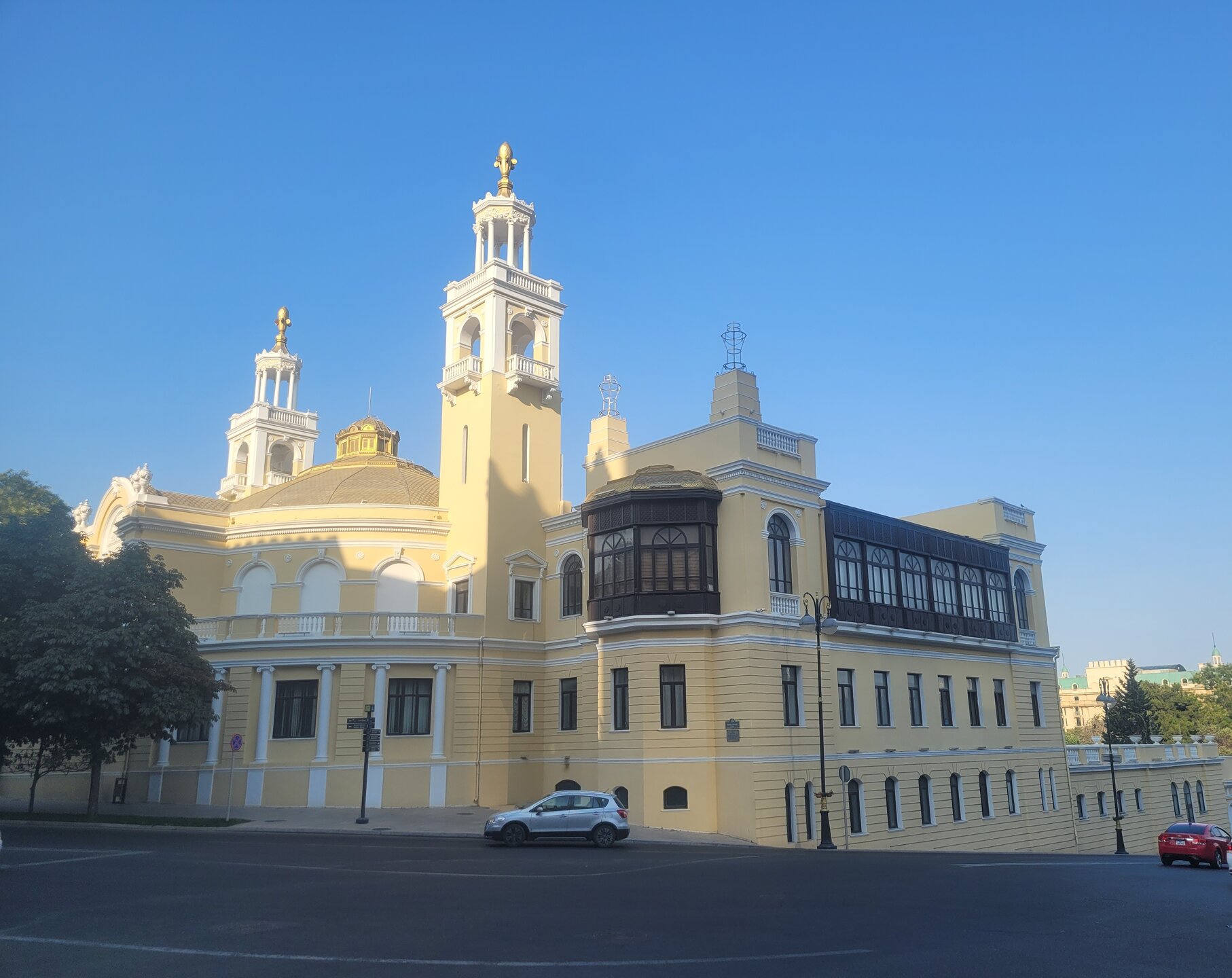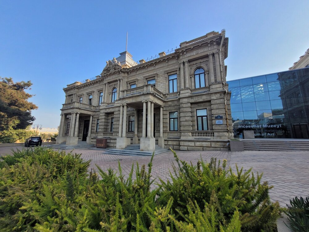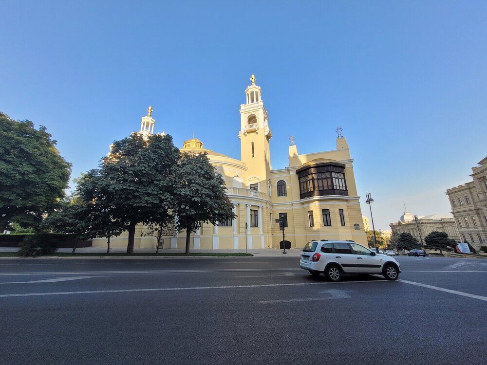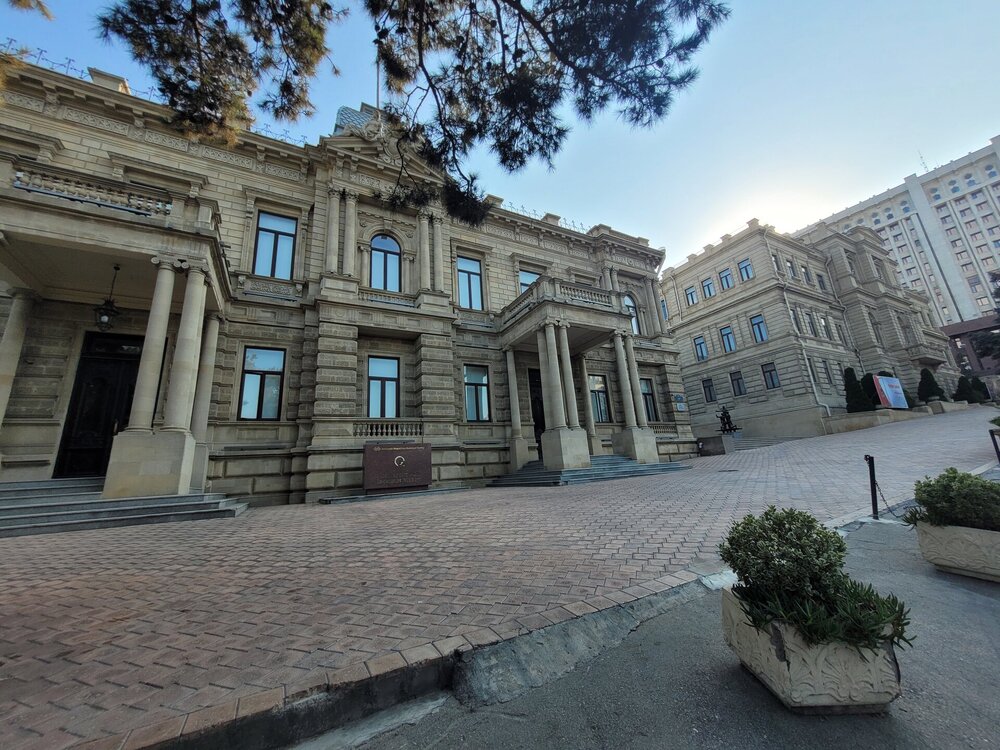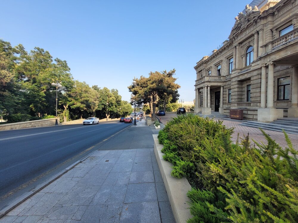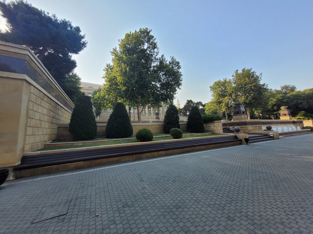 Обратно мы возвращались какими-то "огородами". Ну раз мы уже прошлись по набережной, то решили идти закоулками и переулками и после фуникулёра свернули на какую-то улочку. Прошли вот такое красивое здание. Я у дочи спросила, это что? И была очень удивлена, узнав, что это здание школы. Так и хотелось сказать, у них и школы - это произведение искусств. У меня даже слов не было. Это не школа, это какой-то дворец или музей. Так и хотелось сказать, а можно школы как-то попроще и поскромней строить? И вот он самый, Музейный парк, на который я изначально подумала, что это Губернаторский парк. Именно здесь, в один из дней, мы не смогли перейти дорогу. Посмотрели как это делают местные жители, но как они, делать не стали. Но теперь мы оказались по другую сторону. На противоположной стороне расположен Сад Филармонии и филармония имени М. Магомаева. Ну, а с этой стороны находится музей искусств, о котором выше я уже рассказывала. В Баку, что музеи, что школы......Так и хотелось сказать, а по моему они одинаковые.