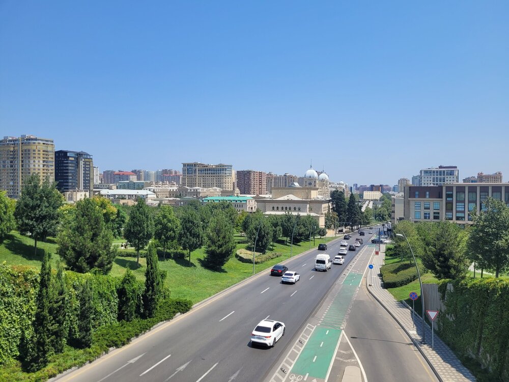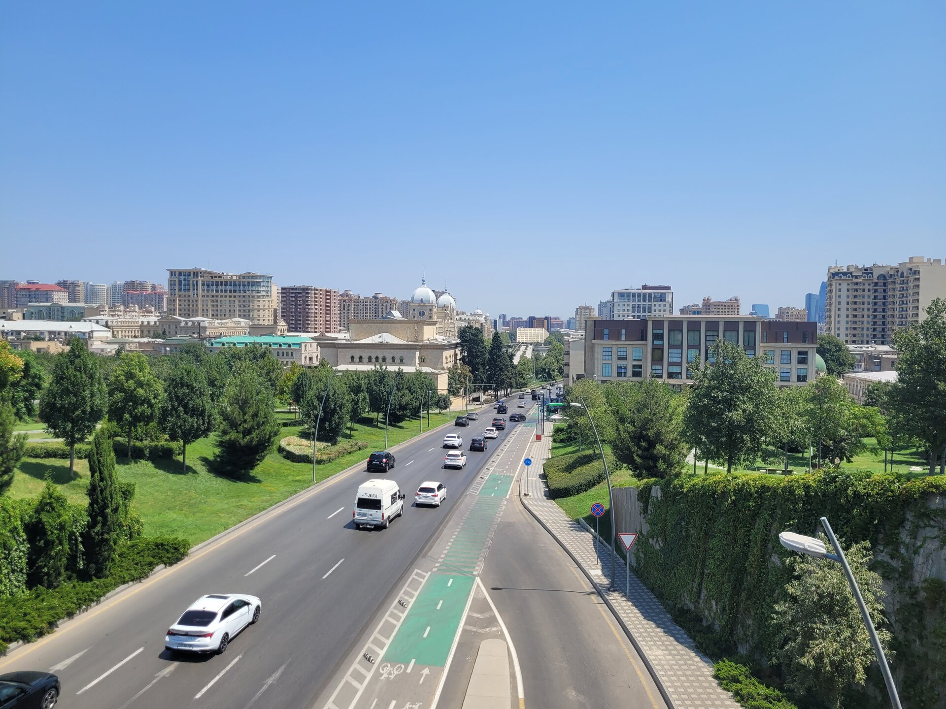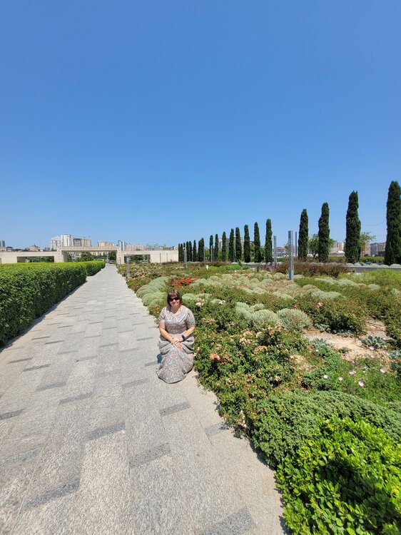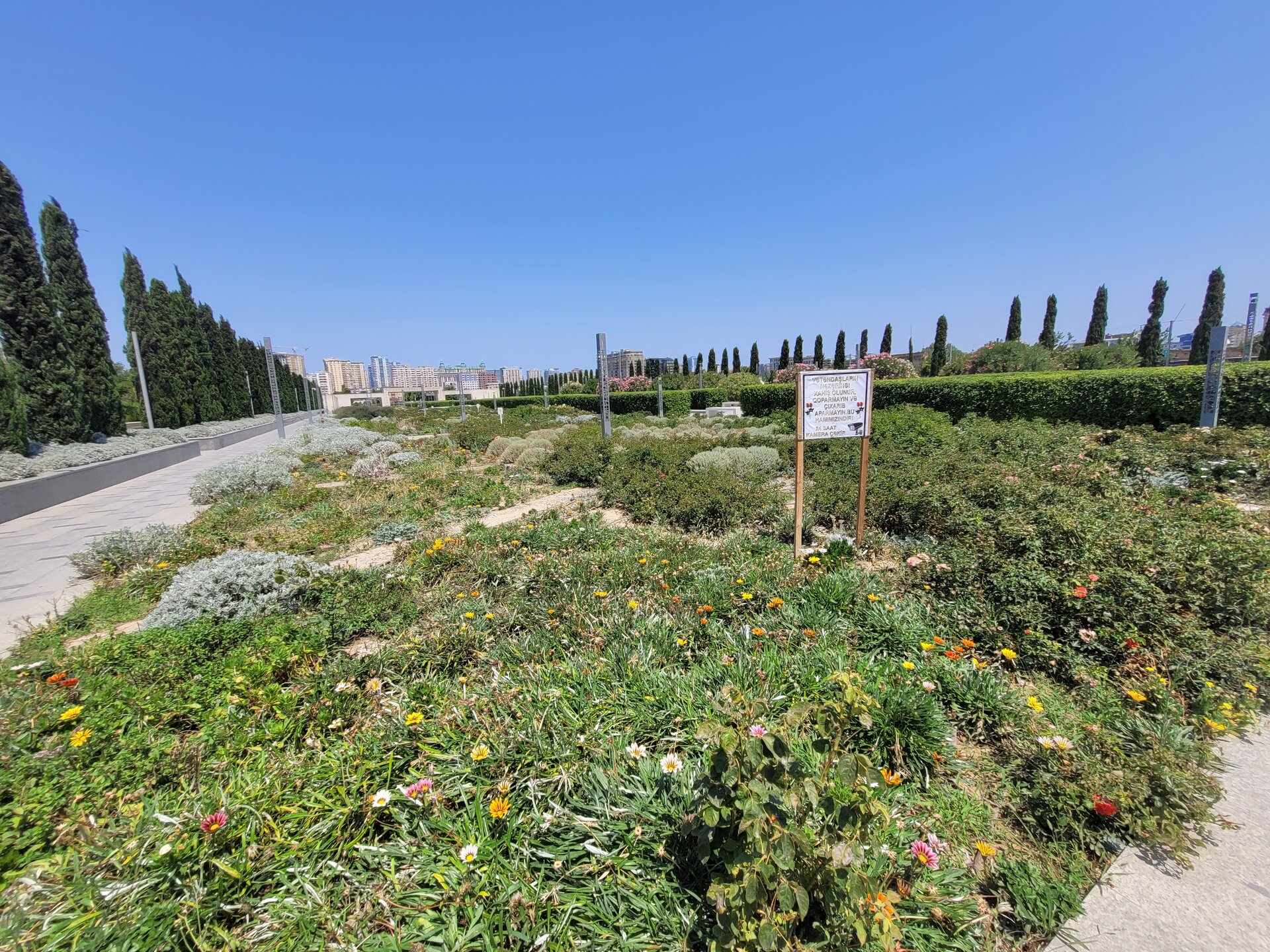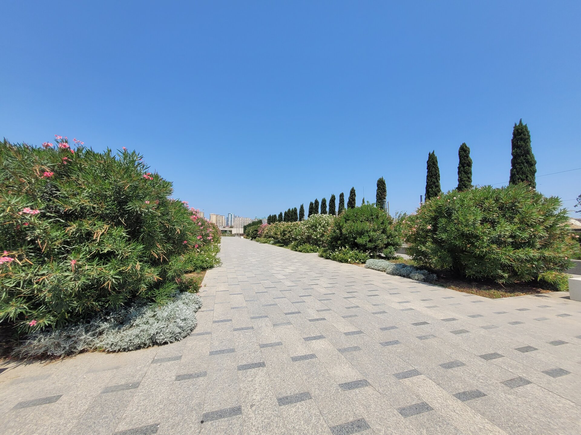 Насколько мы смогли понять, тут же рядом с мечетью расположен Центральный парк, так нам выдала карта. Но даже если это был и не он, то в любом случае, к мечети Тезепир примыкал какой-то парк. Красивый, ухоженный, много зелени и цветов, прекрасный оазис посреди современного города, интересны сделаны дорожки, мосты для пешеходов. Но в жару спрятаться тут будет негде, так как зелени много, но не деревьев. Их не так давно посадили, но вот когда деревья подрастут, тогда парк будет ещё прекрасней, но пока он только формируется. Но тем не менее, и сейчас по этому парку приятно прогуляться, ну очень красиво. И как можно судить по фотографиям, людей практически нет. И даже не верится, что когда-то на этом месте были старые дома. Центральный парк Баку — излюбленное место жителей и гостей города. Здесь есть все для приятного времени с близкими и для активного отдыха: площадка для катания на велосипедах и скейтах, беседки, спортивные площадки, детские качели, футбольное поле, территория и оборудование для игр в шахматы, нарды. В парке занятие себе найдут представители всех возрастных групп. И как я стала писать, это место обязательно к посещению, так вот, Центральный парк, впрочем как и всё остальное в Баку, не стало исключением. У меня сложилось впечатление, что в Баку стоит посетить всё. Хотя, когда я готовилась к поездке, не помню, чтобы Центральный парк стоял в достопримечательностях Баку. Мы просто вышли из мечети, раз и парк какой-то.