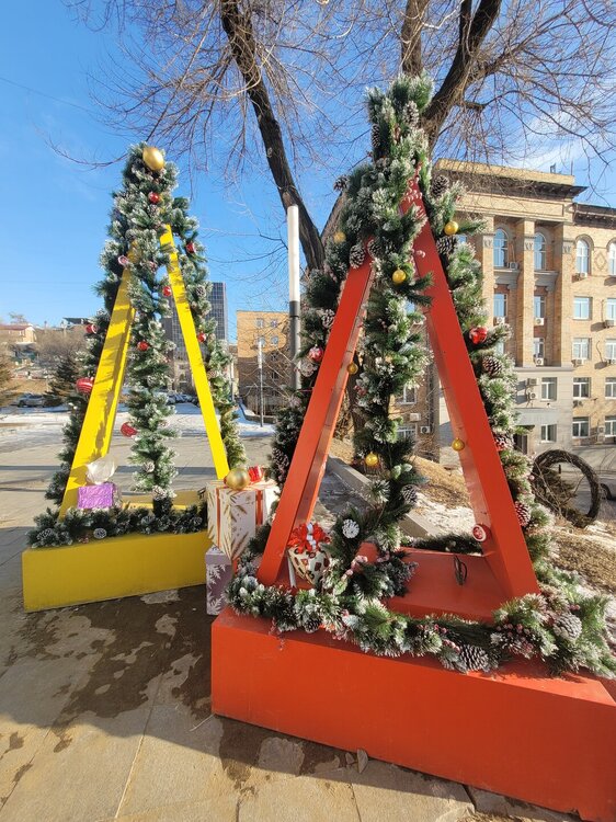 Честно сказать, именно около этих ёлочек мы застряли на какое-то время. Но они настолько оригинально оформлены, где-то игрушками, сделанные своими руками, где-то настоящими из магазина. Но каждая ёлочка - это произведение искусств. Многие останавливаются здесь, фотографируют, рассматривают, и как я уже выше написала, мы не стали исключением. Да чего скрывать, я этим ёлочкам устроила целую фотосессию. И такую красоту можно увидеть около Владивостокской крепости, прямо у её подножия.Video 20260104-01.mp4