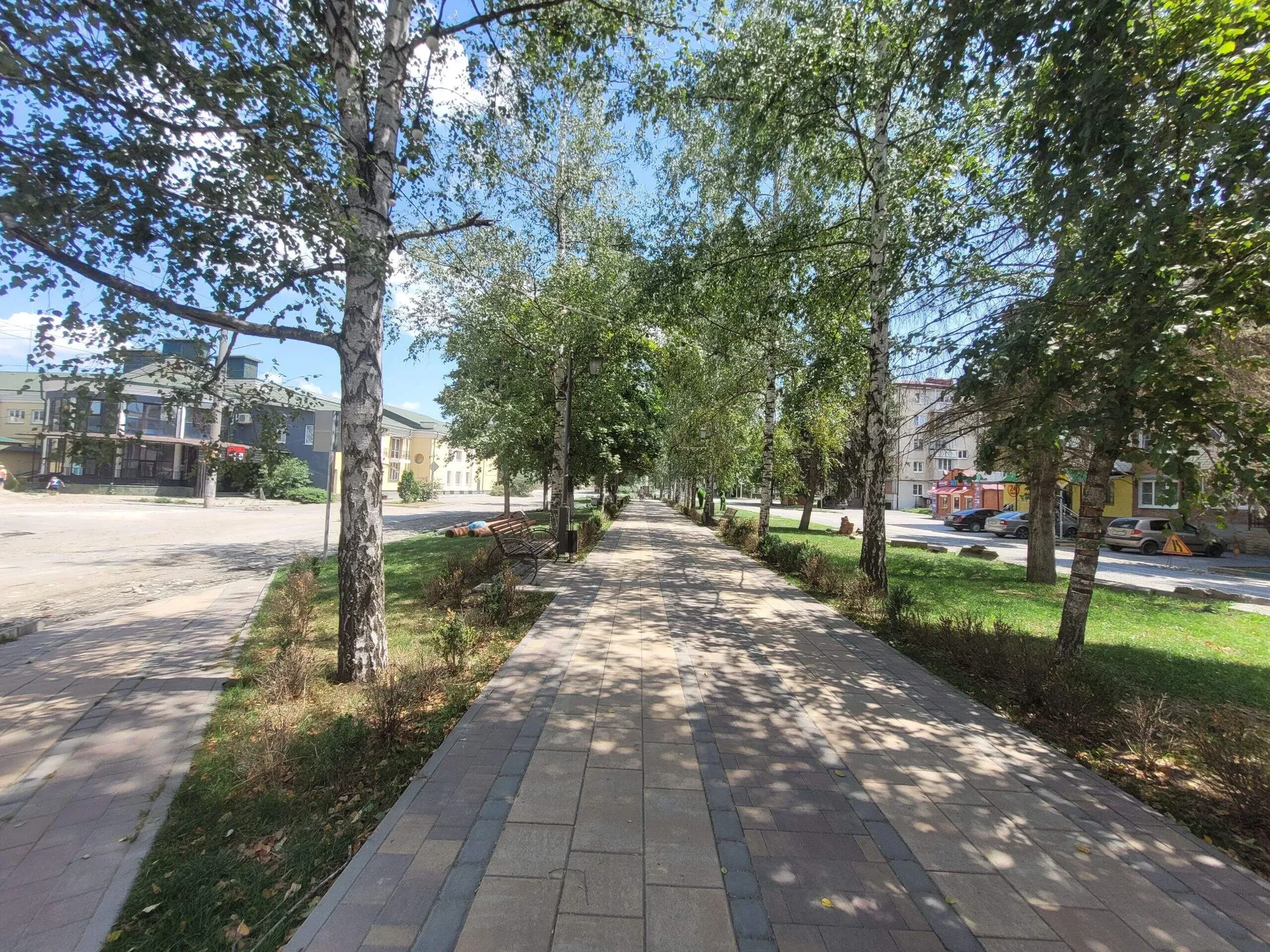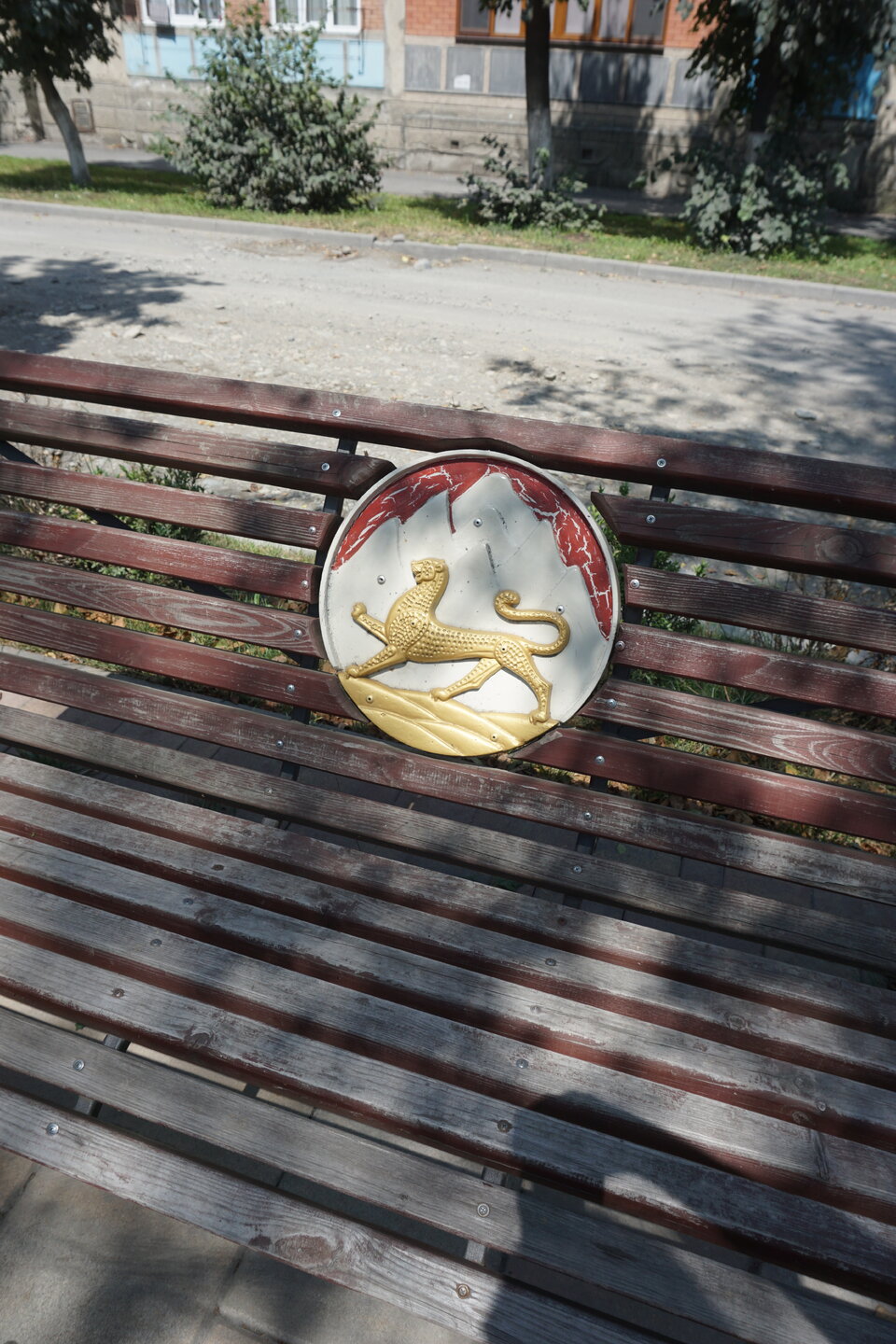 Немного покрутились здесь, в районе вокзала, разглядывая кое-какие здания. Чем дальше уходили от вокзала и привокзальной площади, тем зданий становилось всё меньше, а с ними и людей. Было и такое, что людей не было вообще. И это несмотря на то, что население города составляет чуть более 36 тысяч. Когда мы шли по Беслану, даже не верилось, что это второй город в Северной Осетии после Владикавказа, на мой взгляд, Беслан больше походил на деревню. И это несмотря на то, что у города, который был основан в середине 19 -го века, в 1847 году, есть своя история. И да, изначально Беслан назывался Бесланыкау в честь одного из местных влиятельных жителей, Беслана Тулатова. Вот так и шли, на улицах реально не было никого. Зато машины были, но хоть что-то. А где - то мне даже стало казаться, что мы попали в прошлое. Всё было настолько убитым и разбитым и не было дорог. Но тем не менее, несмотря на такую убитость, увидели на одной из скамеек герб Северной Осетии.