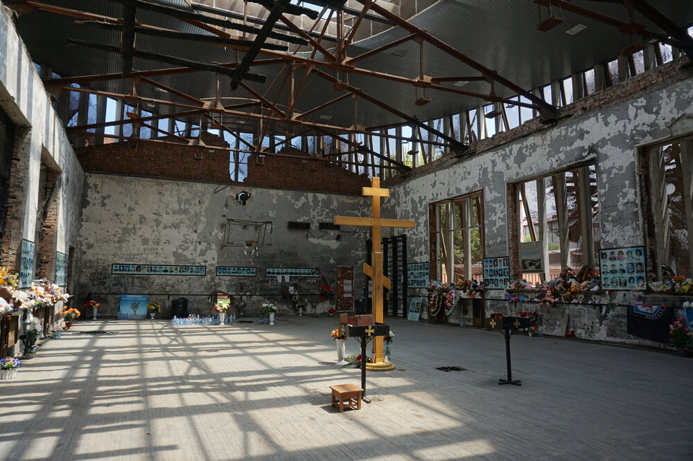 Находится в этом месте тяжело, несмотря на то, что прошло уже 19 лет. Думаю и спустя 25, 30 лет будет не легче, но тем не менее сюда приходят люди, чтобы почтить память погибшим. И теперь каждый новый учебный год в Северной Осетии начинается с траурных мероприятий. Здесь, в спортзале, где заложники провели двое с половиной суток, установлен православный крест. Посетители оставляют цветы, игрушки... открытые бутылки с водой, в которой так нуждались в те дни дни и взрослые и дети. Столько времени без воды в жару, это чудовищно. И сейчас, спустя столько лет можно увидеть пробоины в стенах, дыры на полу от взрывов, ничего это восстанавливать не стали, как был зал сразу после теракта, таким его можно увидеть и сейчас. А в баскетбольной сетке можно увидеть ангелочков. Они как ангелочки улетели на небо.