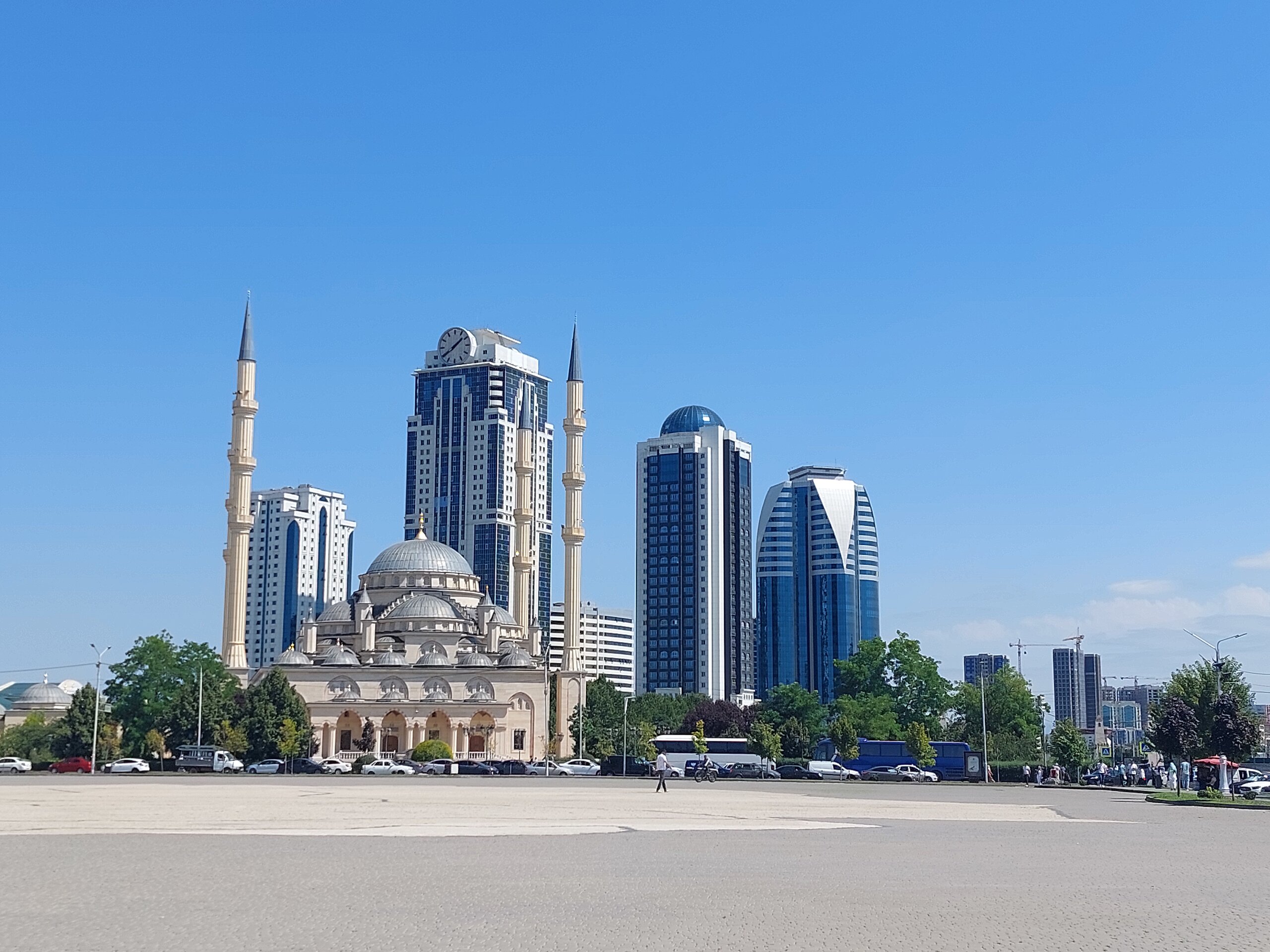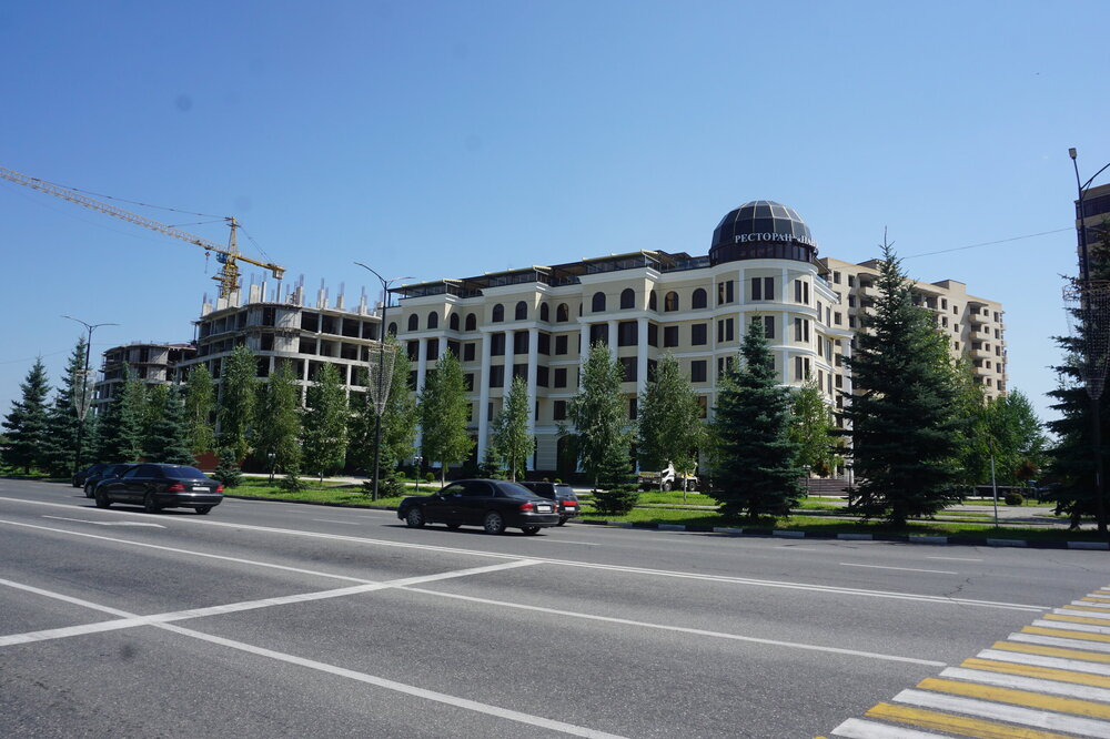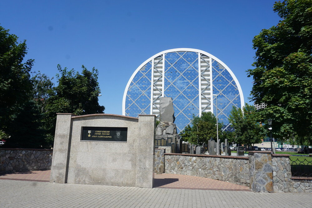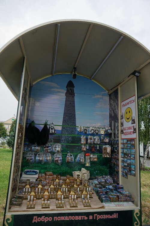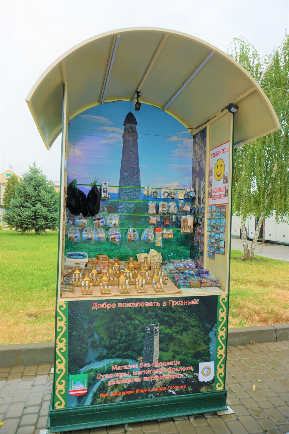 На мечети наша прогулка по Грозному не закончилась. Мне казалось, мы тут были не более трёх часов. Но судя по моему рассказу, такое ощущение, что мы тут были целый день. Но это, конечно, не так. Но пока пишу свой отзыв, понимаю, что хотелось прилететь в Грозный хотя бы на недельку, здесь есть что посмотреть и не только в городе, но и за его пределами. Знаю, что раньше был прямой рейс из Новосибирска, сейчас даже не знаю, есть ли. У нас то ставят какие-то новые направления, то убирают. Ну, а у нас оставалась ещё одна локация, это проспект Эсамбаева. В прошлый раз мы не успели по нему пройтись, так как поднимались на смотровую площадку, сейчас решили восполнить этот пробел. Но сначала мы прошлись по площади им. Ахмата Кадырова. Исторически на этом месте всегда была главная площадь. Только в разное время менялось название. В советское время площадь носила имя Ленина. После распада СССР была переименована в площадь Свободы. Сразу за центральной площадью имени Ахмата Кадырова расположен небольшой сквер Ахмата Кадырова. По первоначальной задумке памятник Ахмада Кадырова должен был возвышаться в центре над мраморными плитами, где выбиты имена погибших, при этом каждый район республики имеет свою плиту. Но мулла попросил убрать памятник и его заменили на бесформенную глыбу. Именно от этой площади и начинается главная пешеходная улица – проспект Эсамбаева. Исторически еще с царских времен эта улица считалась одной из главных. Однако из-за разрушительных войн от оригинальной архитектурной застройки мало что осталось. Нынешнее имя проспект получил в 2003 году в честь известного артиста балета и эстрады Махмуда Эсамбаева. А вот облик улицы сформировался совсем недавно после масштабной реконструкции в 2018 году. В целом на проспекте нечего смотреть. Просто ухоженная улица со всей необходимой инфраструктурой. Еще интересная особенность Грозного – это пиратские копии известных сетевых брендов. Практически все как раз расположены на проспекте Эсамбаева. Увидев данное заведение, я почему то сразу вспомнила KFC. Но это был, конечно, не он. А так очень даже похоже, но всё-таки что-то своё и за франшизу платить не надо. Ещё говорят, что весь город под видеоконтролем, поэтому в последнее время здесь такой низкий уровень преступности. Помню, когда в 2021 году на площади Кадырова мы увидели лоток с сувенирами, у нас по сути даже челюсть отвисла. В смысле? Просто лоток без продавца? Но это было именно так. Мы там даже что-то купили, оплатить можно было наличкой, денюжку надо было сбросить в дырочку сбоку, там же был написан номер карты, на который можно был сделать перевод. В общем, всё серьёзно. Мы тогда оплатили переводом, а потом я свой телефон тыкала в камеру, она сверху над башней, чтобы подтвердить покупку. Я даже не представляю как это выглядело с другой стороны камеры. Или даже как это выглядело, если кто-нибудь наблюдал за нами с улицы. Прикольно, наверное, было смотреть, как мы по очереди тыкали телефон в камеру, а я даже ещё что-то говорила, ну типа, вот посмотрите, всё оплачено. У меня даже в мыслях не было, что может там камера без звука, а может там вообще никого нет. Но у нас тоже всё серьёзно было. Без продавца, значит без продавца. Ну, вернусь к проспекту Эсамбаева, которому на мой взгляд не хватает каких-нибудь памятников, музеев, сувенирных магазинов, чтобы задерж