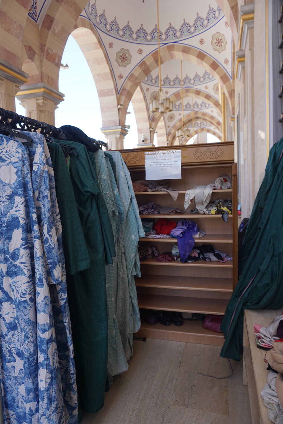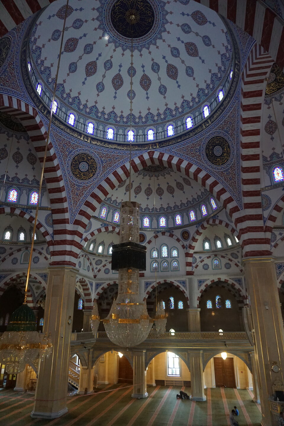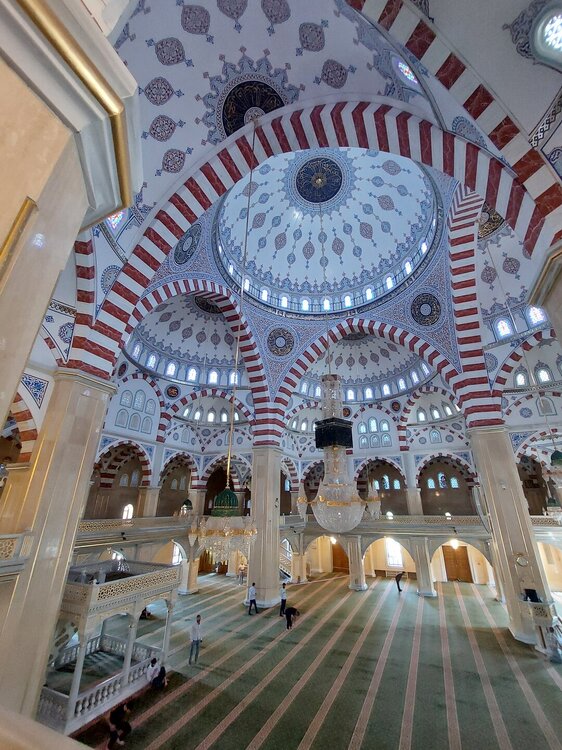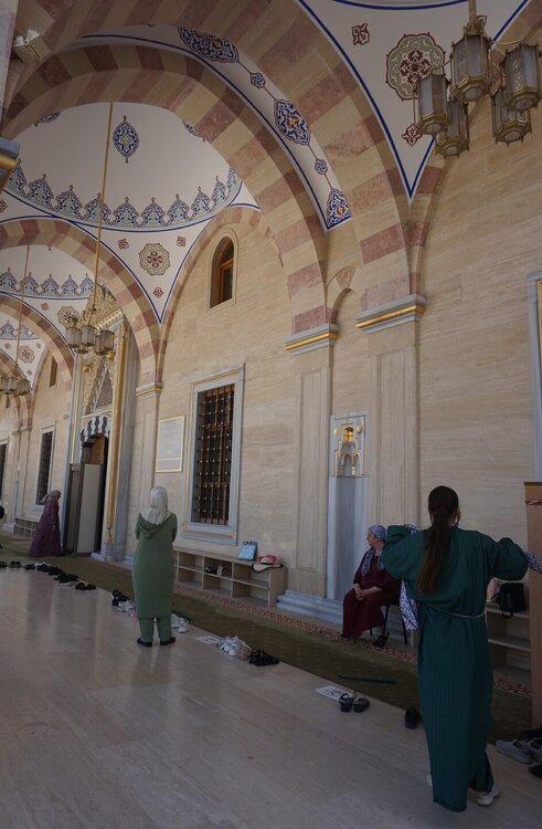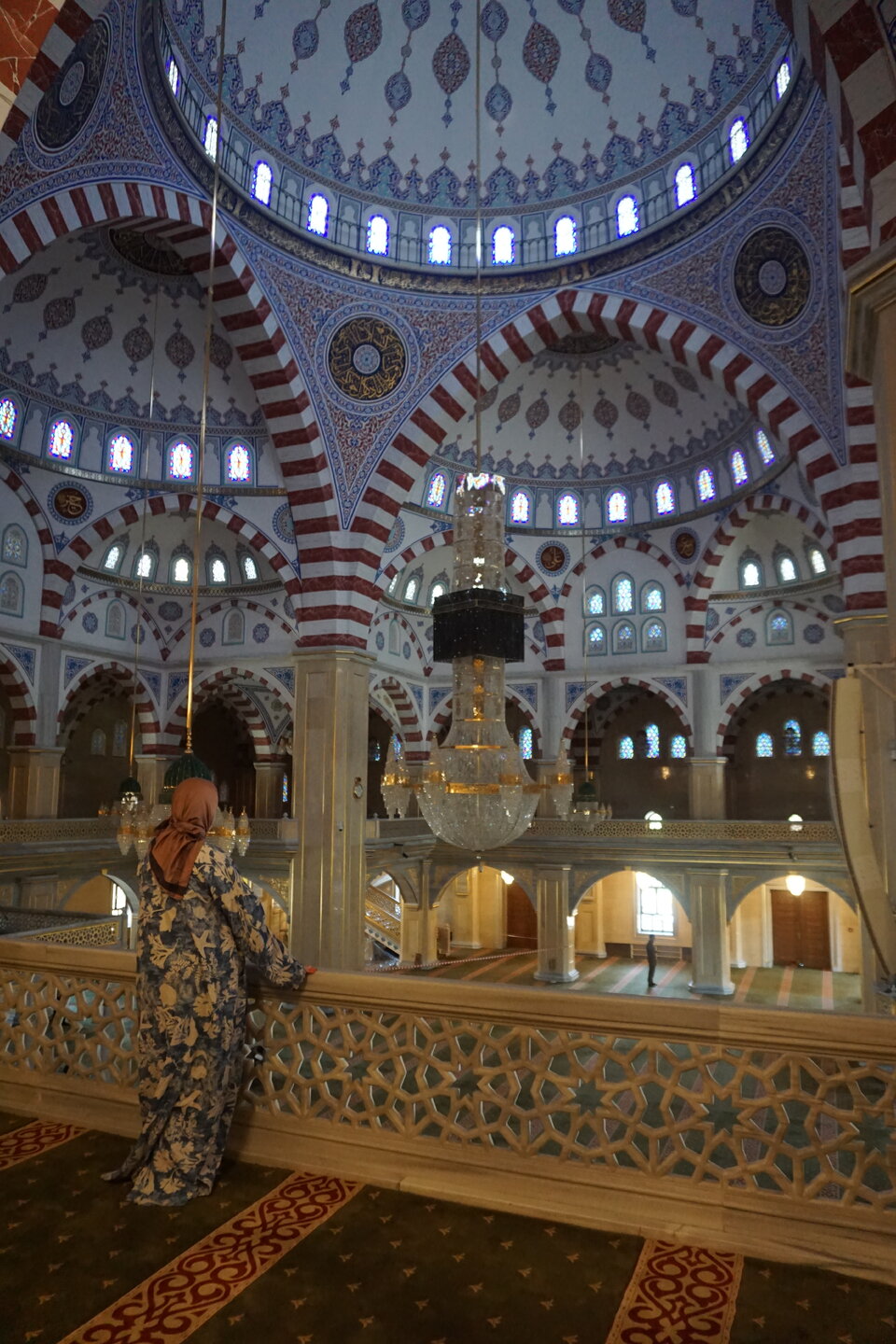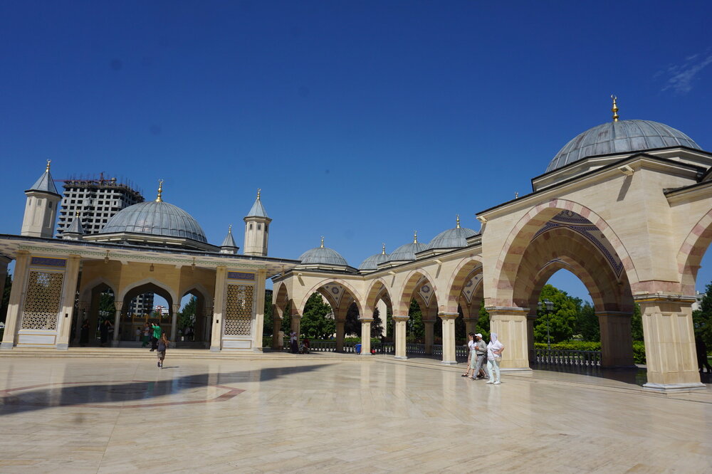 Несмотря на то, что в 2021 году, будучи в Грозном, в рамках обзорной экскурсии мы уже посещали мечеть, но в этот раз почему то тоже решили её посетить. Не скажу, что в первый раз было что-то не так, всё было так, возможно, были под таким впечатлением, что и в этот раз решили, что обязательно дойдём до мечети и посетим её. И как я уже выше писала, особо внимательные заметят сильное сходство мечети в Грозном, с Голубой мечетью в Стамбуле и будут правы. Мечеть строили турки, беря за основу проект стамбульской мечети. Я, конечно, не была в Стамбуле, но помню, как нам об этом рассказывали, и много об этом читала. Мне вообще нравится история. И под впечатлением от чтения, у меня появилась мысль посетить Тобольск. Возможно, когда-нибудь и воплощу свою мысль в жизнь. Ну, а для чеченцев, возведение мечети стало символом возрождения Грозного из руин. Хотя по первым планам мечеть более бюджетного проекта пытались построить еще в 1980-х, однако этого долгое время не удавалось сделать. Вторая попытка строительства мечети состоялась в 1997 году. Ахмат Кадыров, будучи муфтием Чечни, вел переговоры с властями турецкого города Конья о строительстве храма. Строительство началось, но из-за Чеченской войны проект был приостановлен. Когда Грозный был разрушен, власти вновь вернулись к идее возведения мечети, которая стала бы символом возрождения города. И только в 2006 году удалось возобновить долгожданное строительство. Мечеть была построена за рекордные два года, и в октябре 2008 года состоялось торжественное открытие. Все нюансы посещения мечети мы уже знали. Помню, когда были в первый раз, и женщина, дежурная по мечети нам помогала упаковываться, меня такой смех разбирал, я как могла сдерживала свою улыбку. Но женщина всё поняла и тоже улыбнулась в ответ, при этом сказав: "А вот попробуйте побыть на нашем месте". Как и в любой мечети, здесь необходимо разуться, если какие-то объёмные сумки, рюкзаки, с ними нельзя. Доча оставила свой рюкзак при входе, под охраной женщины- дежурной по мечети, так как ничего для хранения личных вещей в мечети нет. В этот раз, помня прошлое наше посещение, мы упаковывались сами. Гардеробная здесь есть, и что хорошо, она на улице. В общем, мы замотали себя по полной программе. Хотя когда были уже внутри, на второй этаж поднялись три девушки, именно там находится женская территория, так вот, девушки не были упакованы сверху до низу. Платки были лишь слегка накинуты. В общем, не поняла, строго тут, не строго тут. Мы упаковались по полной. В мечеть все заходят в одну дверь, а там уже расходятся, мальчики прямо, девочки направо и по лестнице вверх. Когда мы в первую поездку все оделись, а учитывая, что в группе в основном женщины, это была так интересно, когда мы поднимались толпой на второй этаж. Сразу вспомнила фильм "Белое солнце пустыни". Зульфия, Фатима, Гюльчатай, Зухра....Вот мы выглядели примерно так. В этой мечети мне нравится то, что первый этаж не огорожен, то есть девочки могут спокойно посмотреть, что делается внизу, чего не скажешь про мальчиков. Они на второй этаж никак не посмотрят и не поднимутся наверх, ну хоть где-то женщина впереди. Хотя, конечно, сюда приходят помолиться, побыть наедине с собой, а не подглядывать за кем-то. Во многих мечетях, в которых мы были, с балкона не очень то посмотришь на первый. Так как к балкону было приделано декоративное 
